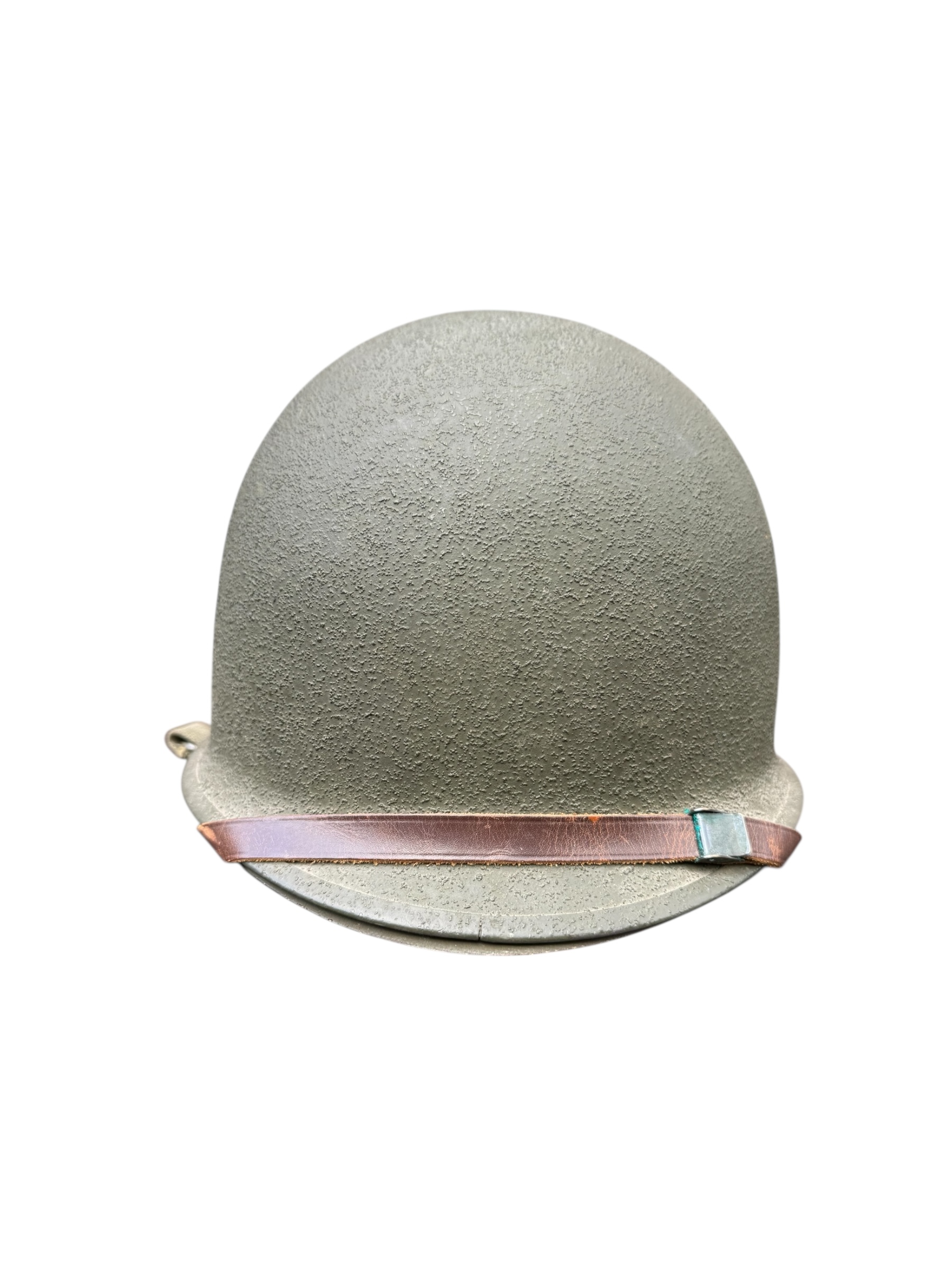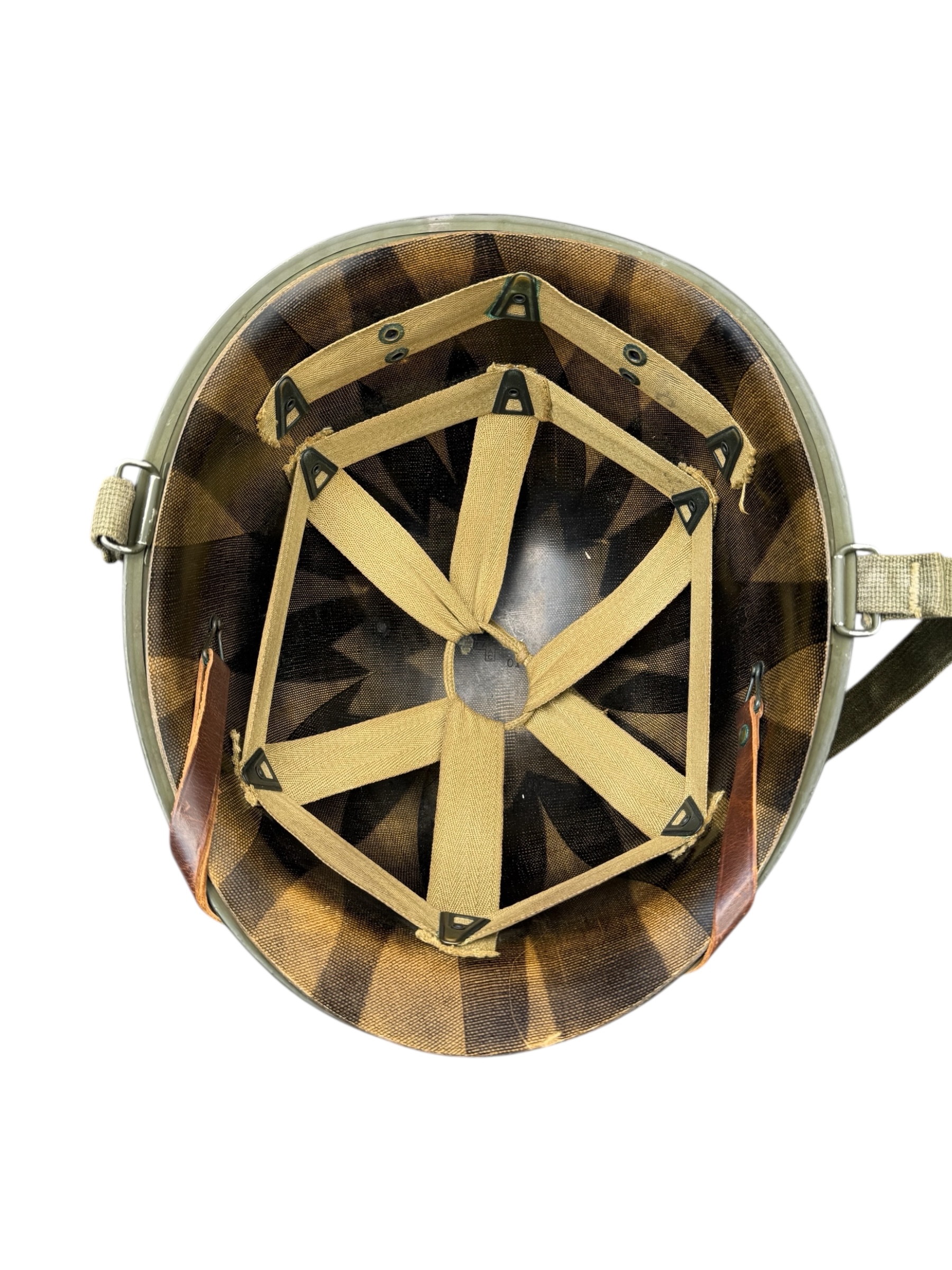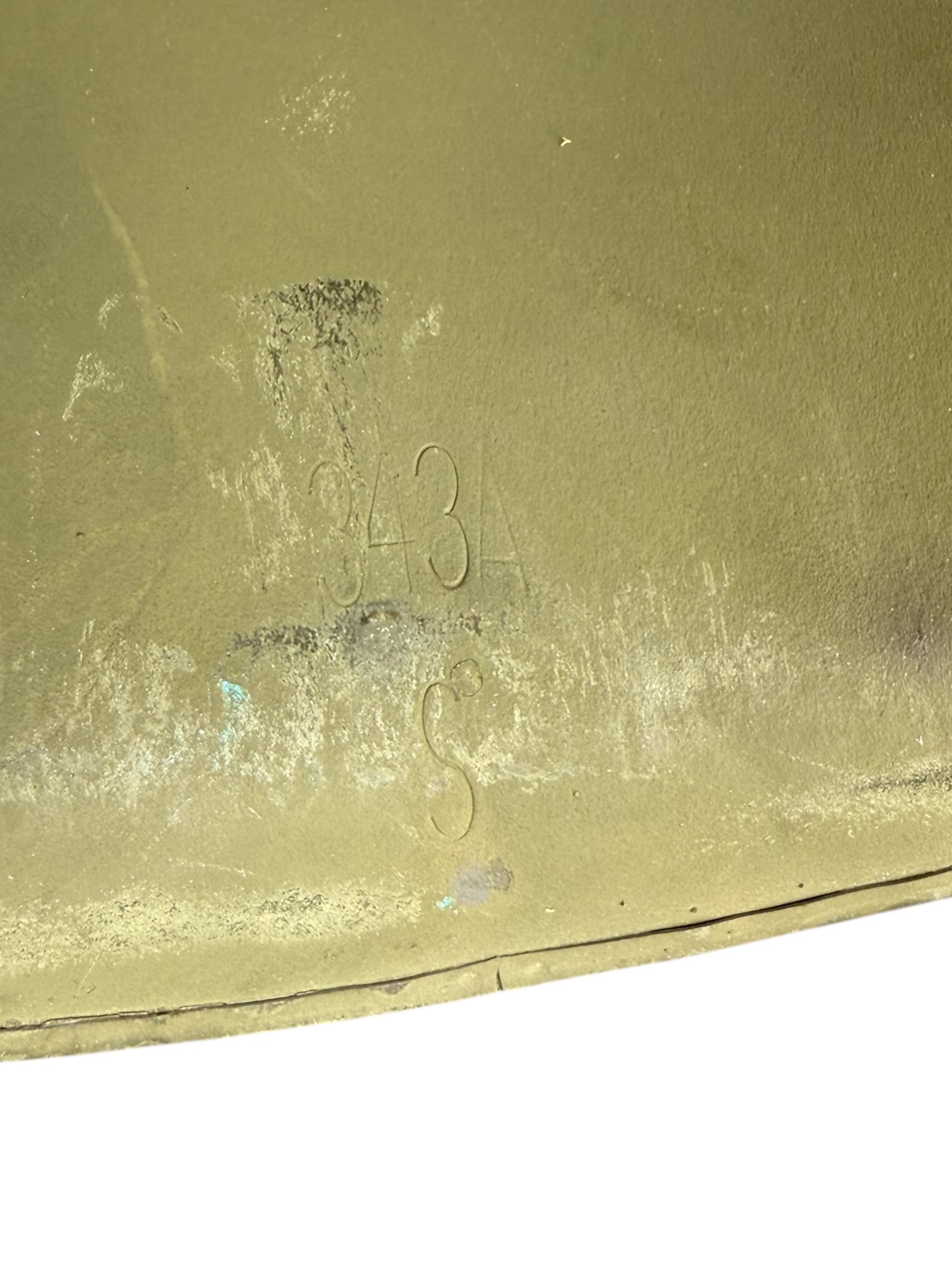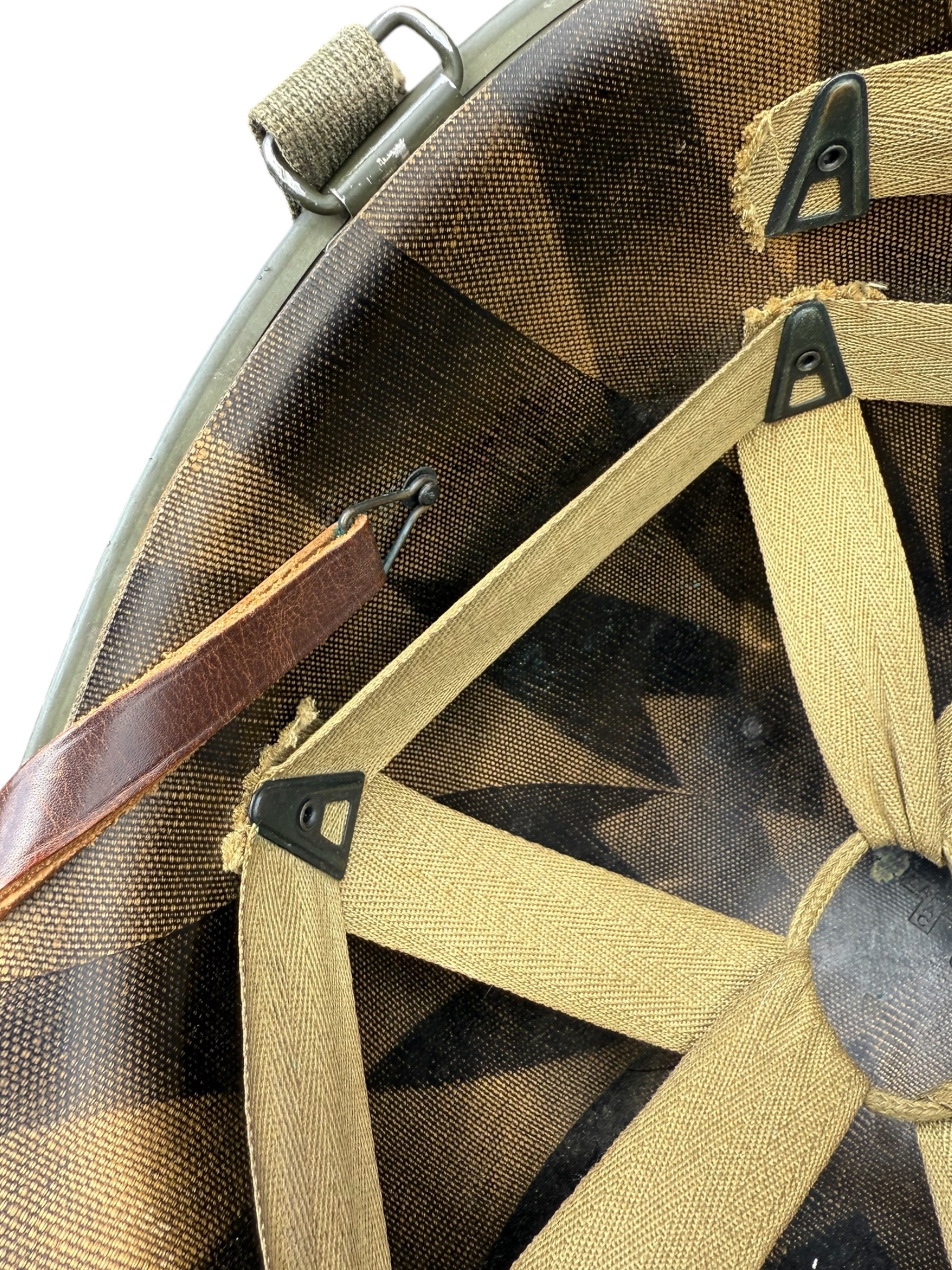 Amerikaanse WO2 Swivel Bale Front Seam helm. De schaal verkeert in near mint conditie en is geproduceerd door Schlueter, met Heatstamp-nummer 343A. Het binnenwerk ziet er nog zeer netjes uit en is vervaardigd door de minder vaak voorkomende producent Capac. De lederen kinband, die regelmatig ontbreekt, is nog aanwezig en het leer is nog vrij soepel.