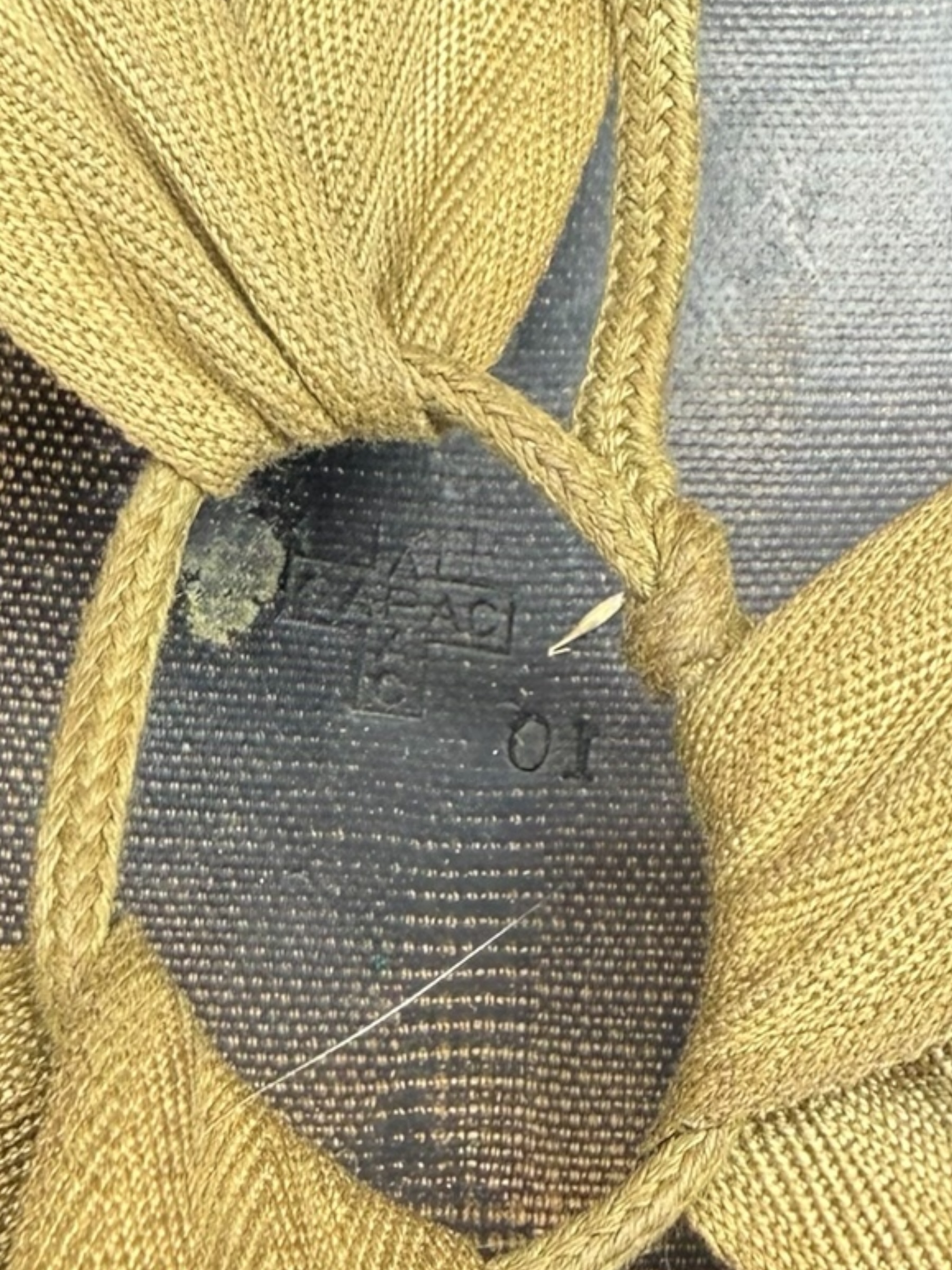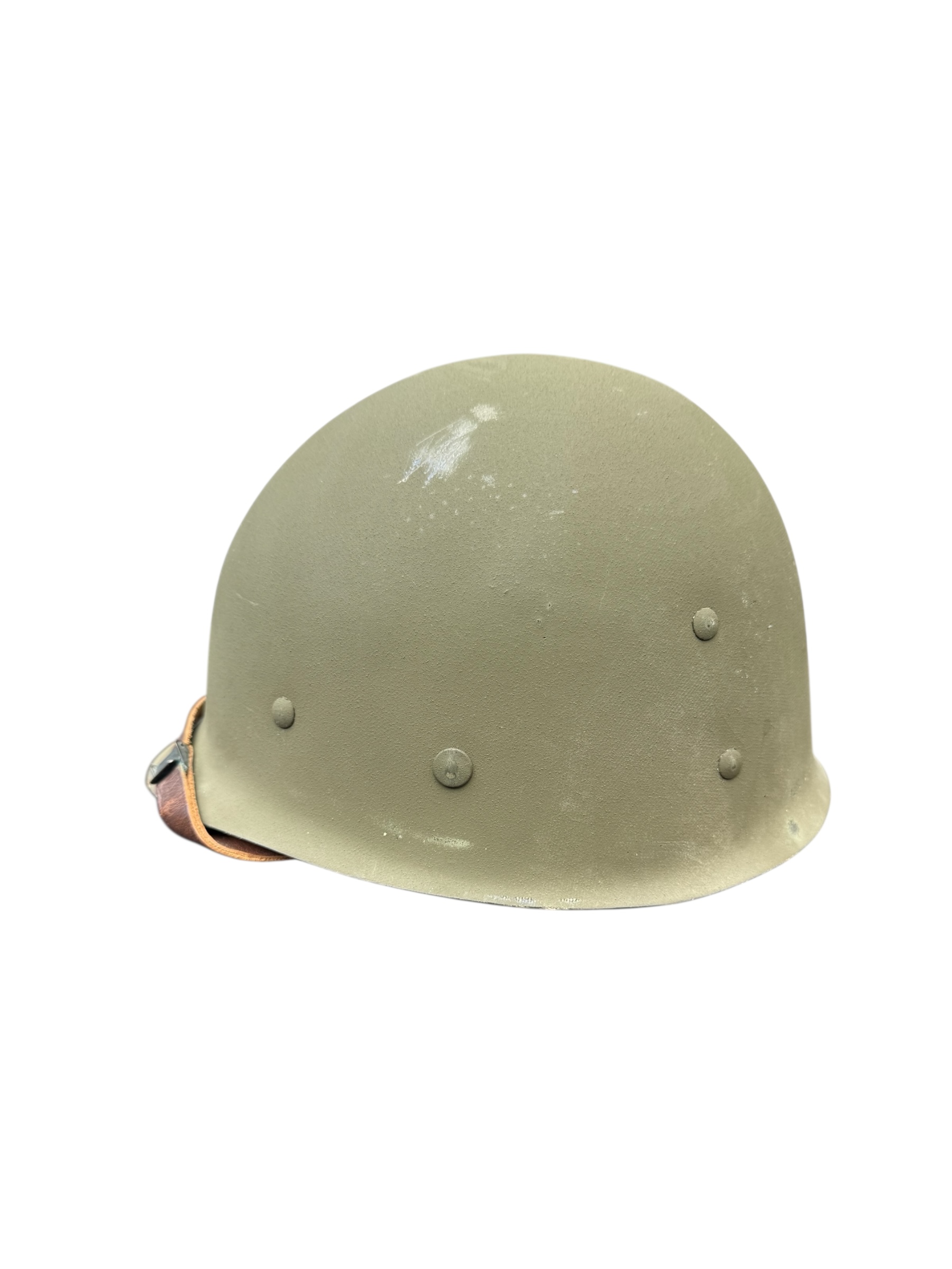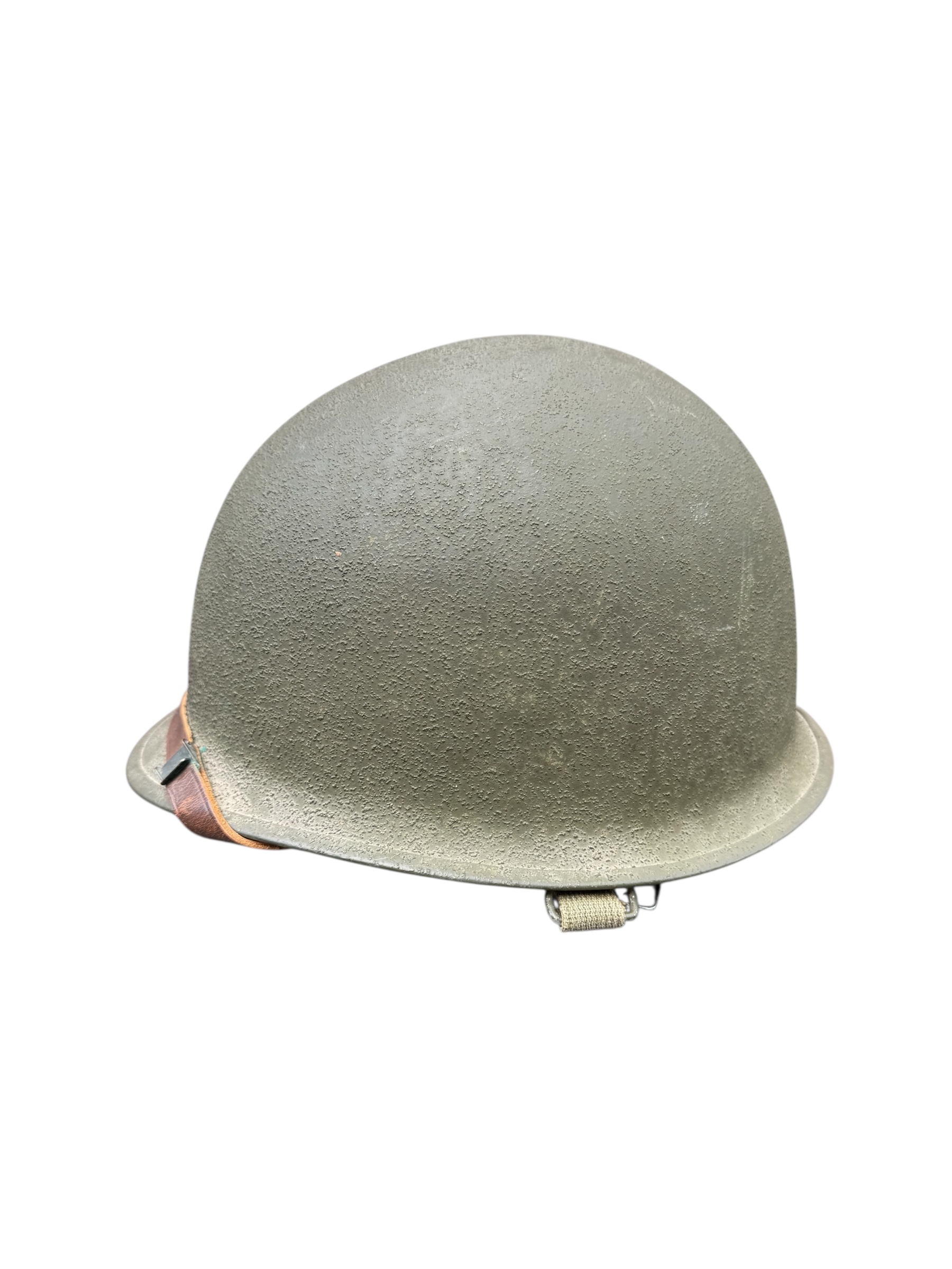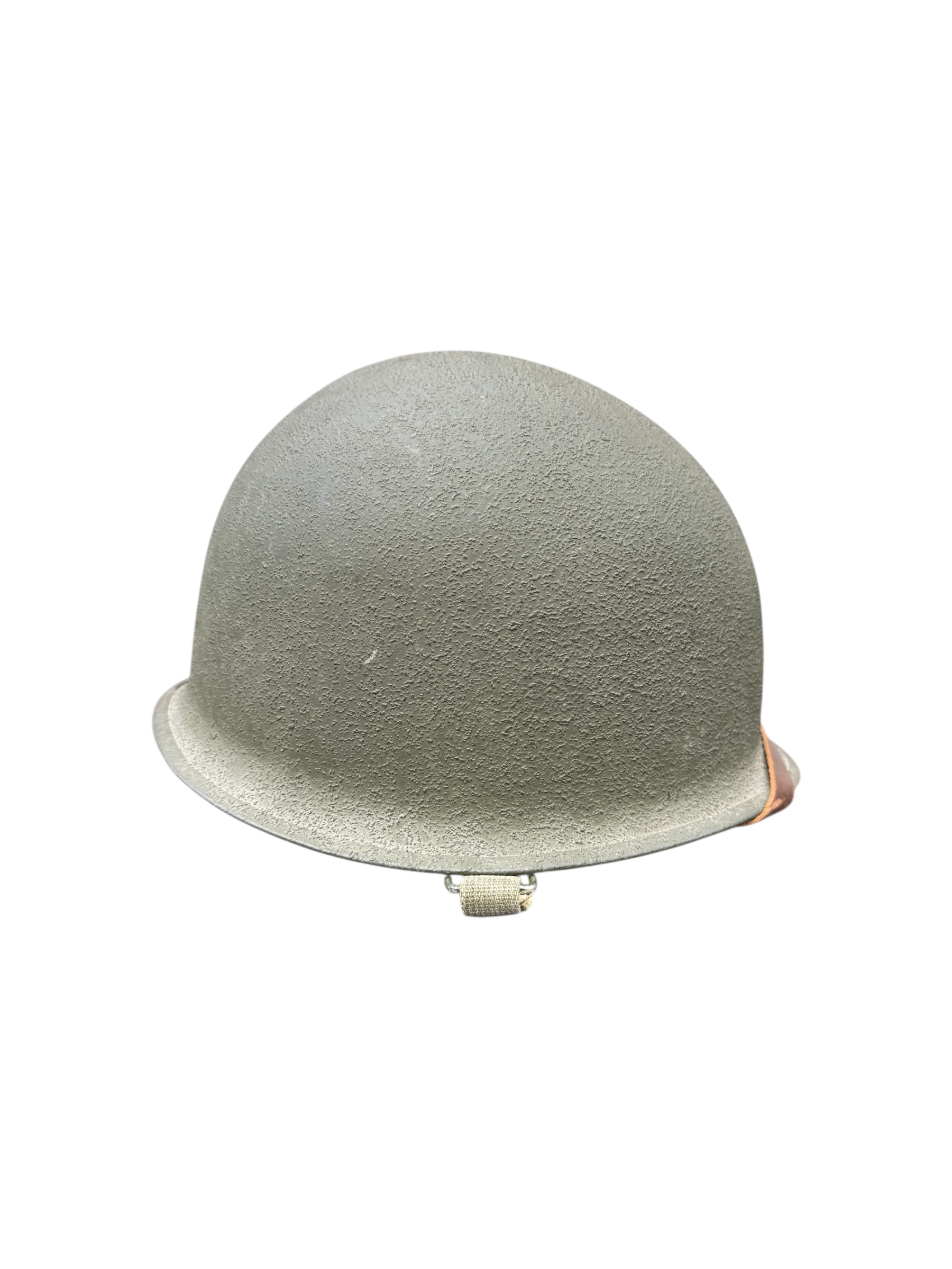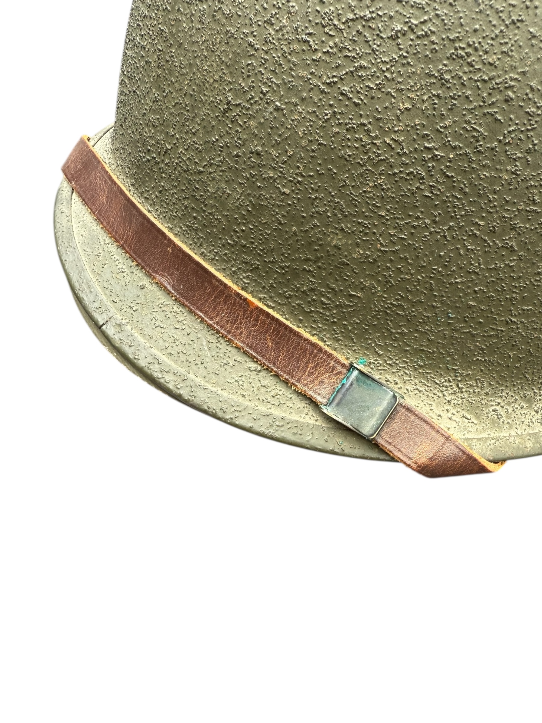 Amerikaanse WO2 Swivel Bale Front Seam helm. De schaal verkeert in near mint conditie en is geproduceerd door Schlueter, met Heatstamp-nummer 343A. Het binnenwerk ziet er nog zeer netjes uit en is vervaardigd door de minder vaak voorkomende producent Capac. De lederen kinband, die regelmatig ontbreekt, is nog aanwezig en het leer is nog vrij soepel.