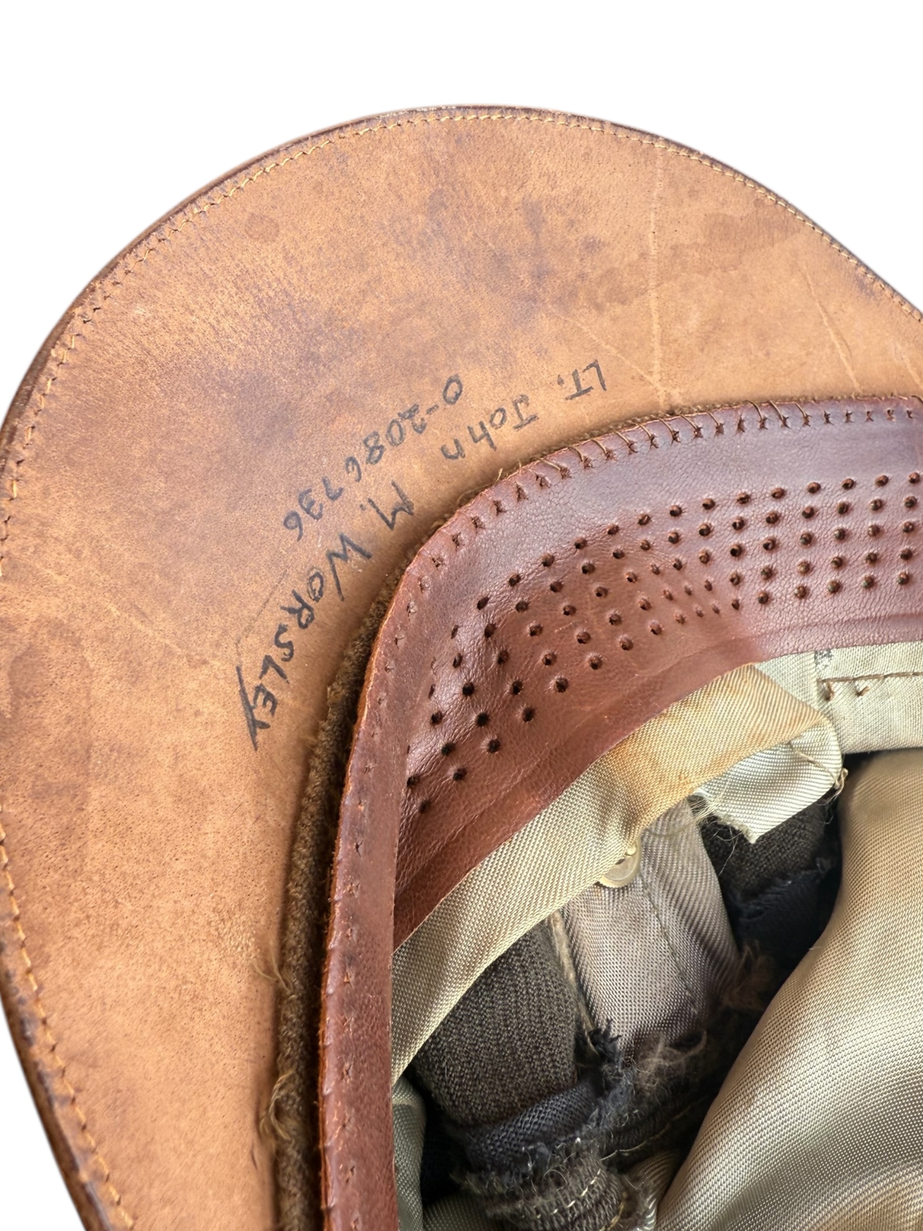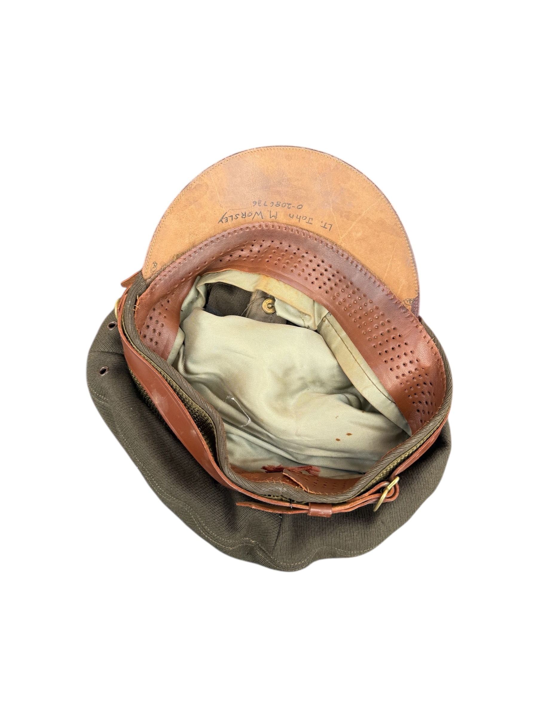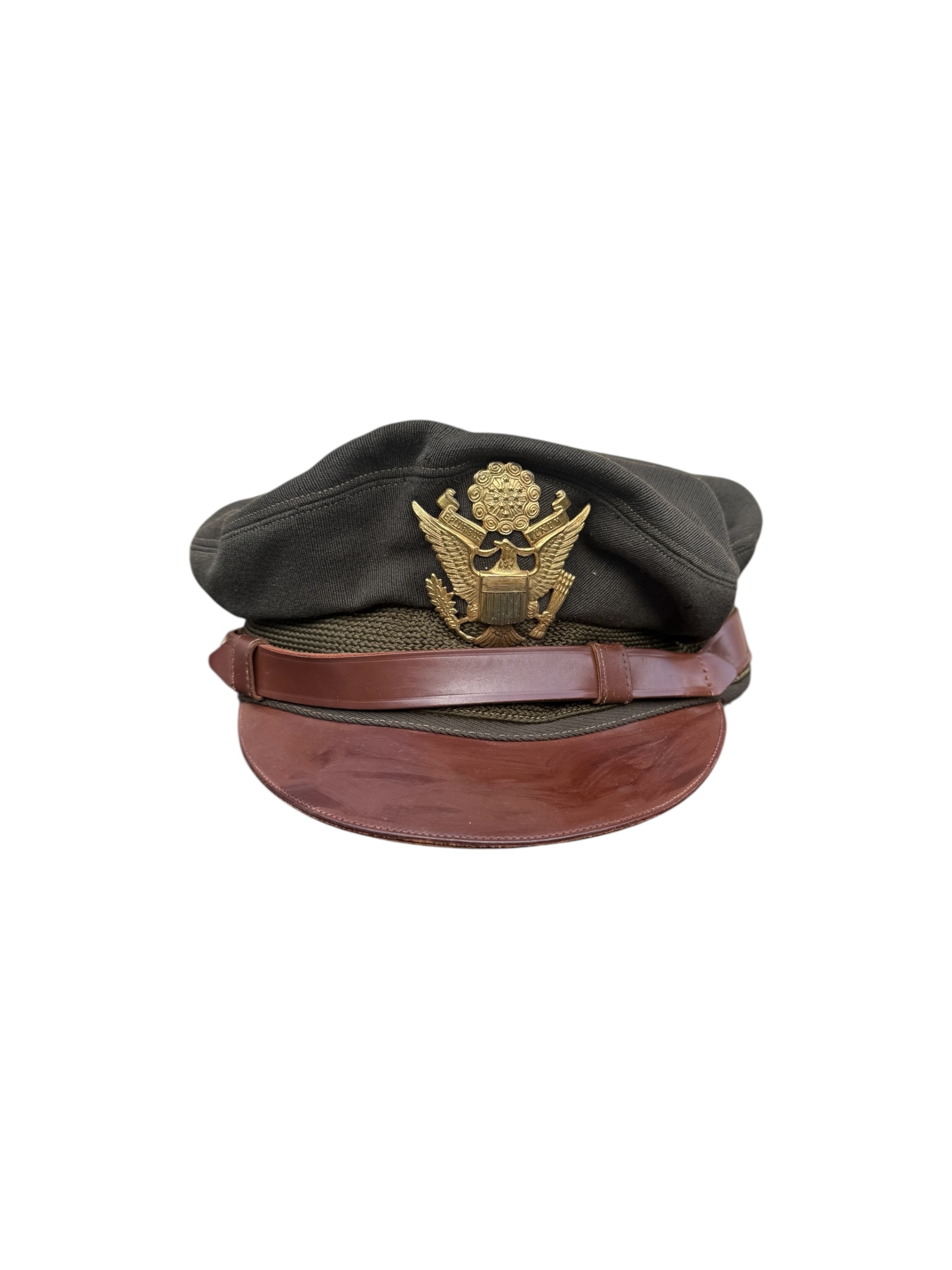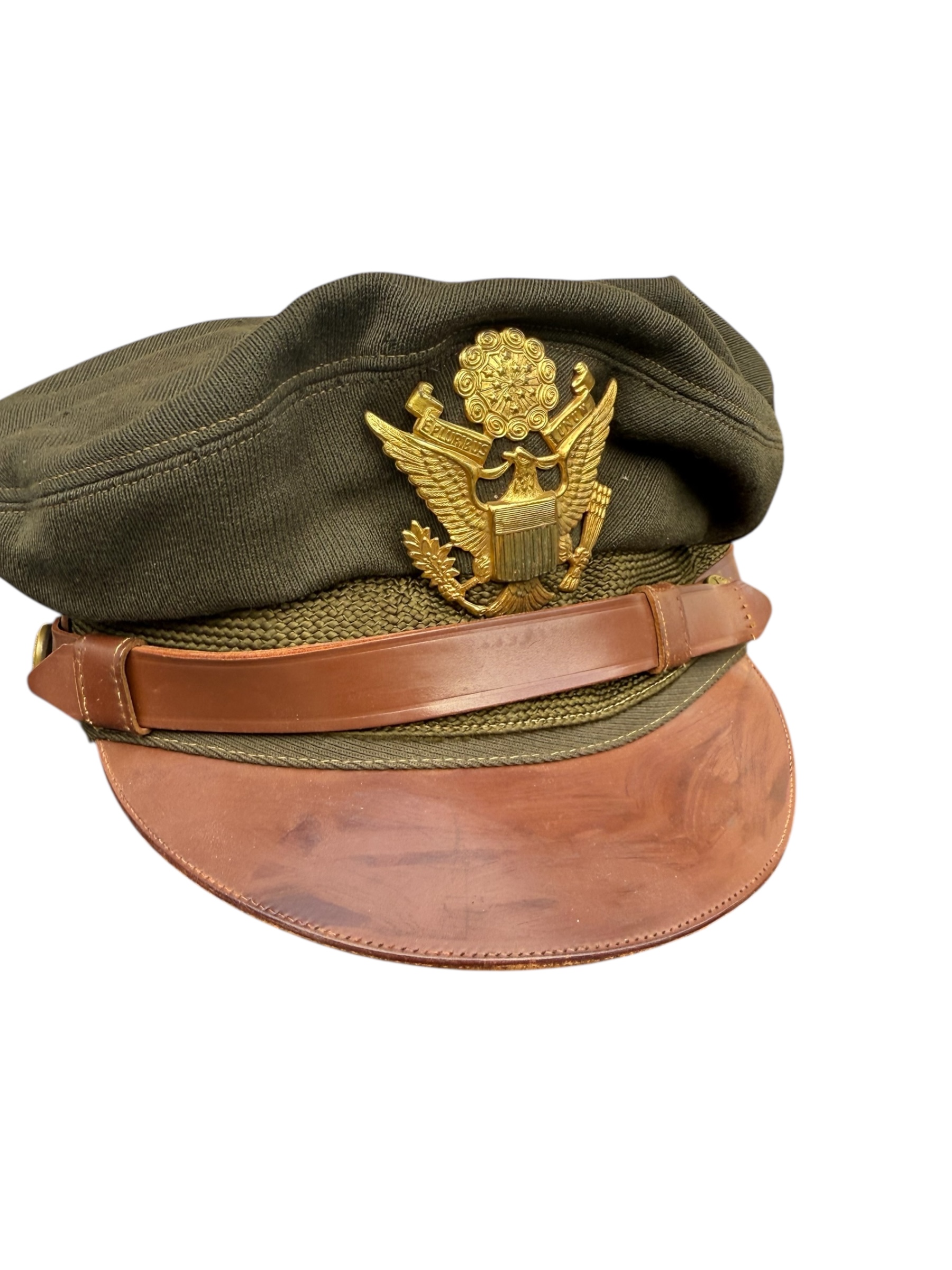 Amerikaanse WO2 USAAF Crusher pet in gedragen staat. Het exemplaar is ongeveer maat 6 3/4. Het leer is nog soepel en de vorm is vrij goed behouden. Op de pet is een naam en nummer terug te vinden; verder is hier nog geen onderzoek naar gedaan.