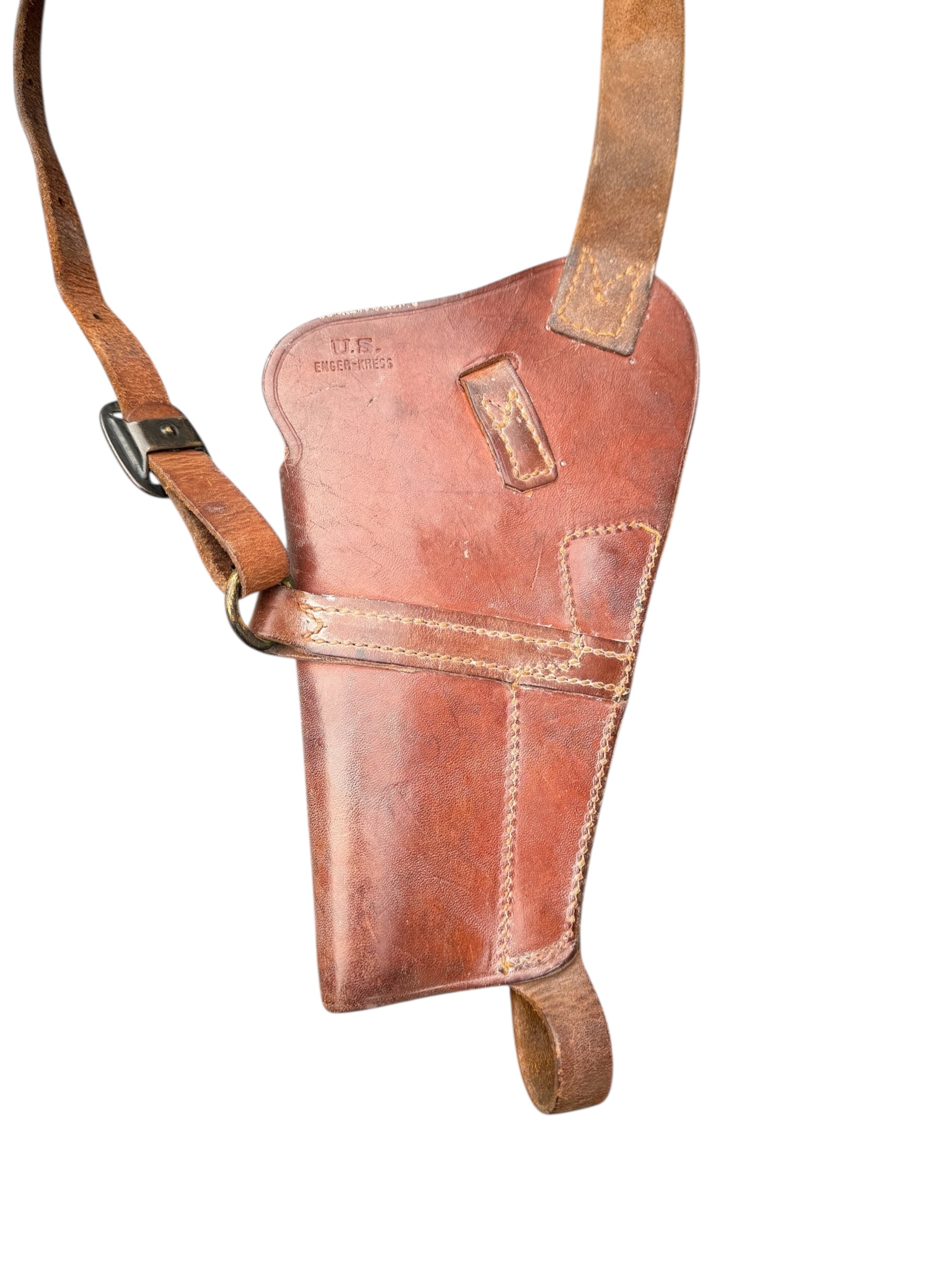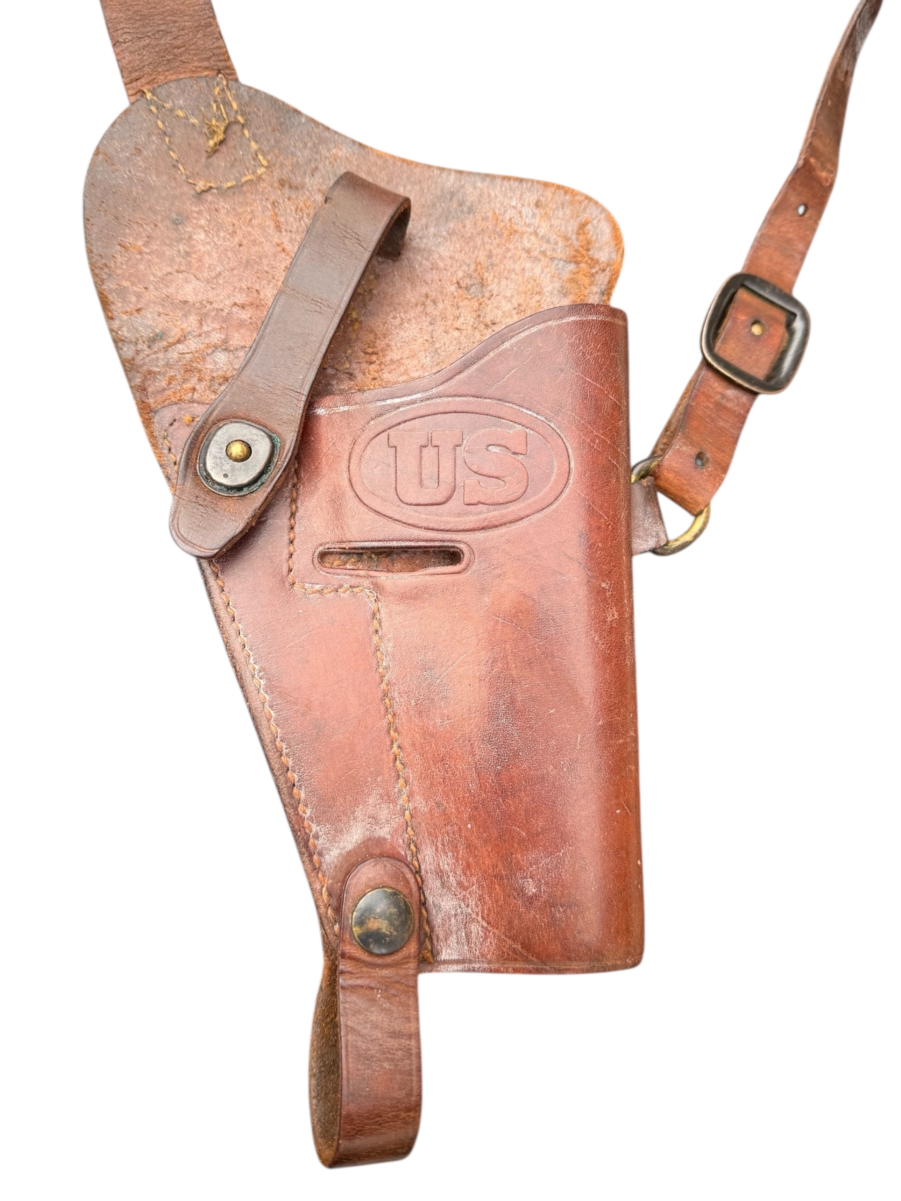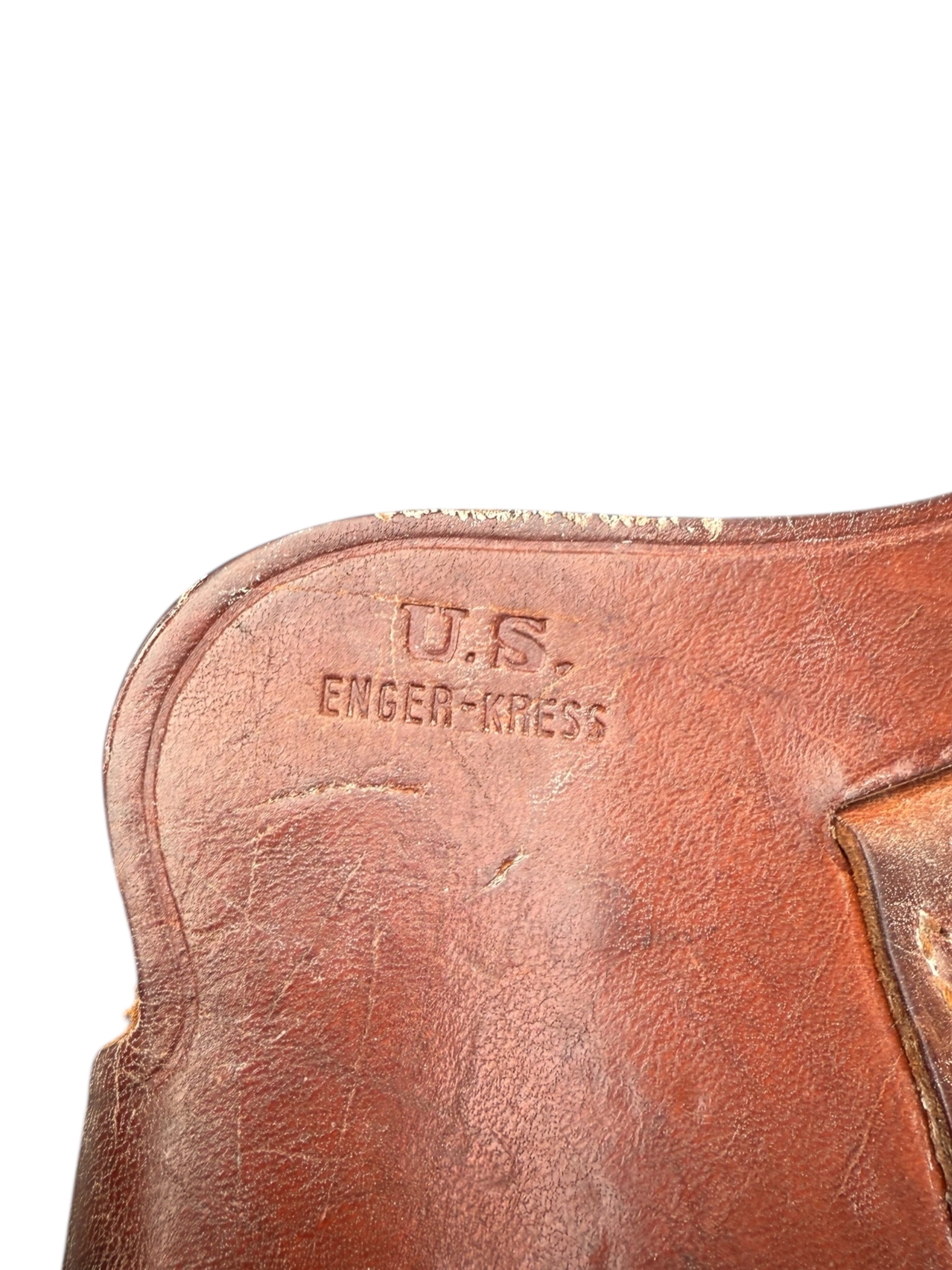 Amerikaans WO2 M3 tankholster in zeer nette staat. De U.S. markeringen en het producentkenmerk zijn nog duidelijk zichtbaar. De drukker werkt nog goed en het leder is nog vrij soepel voor zijn leeftijd.