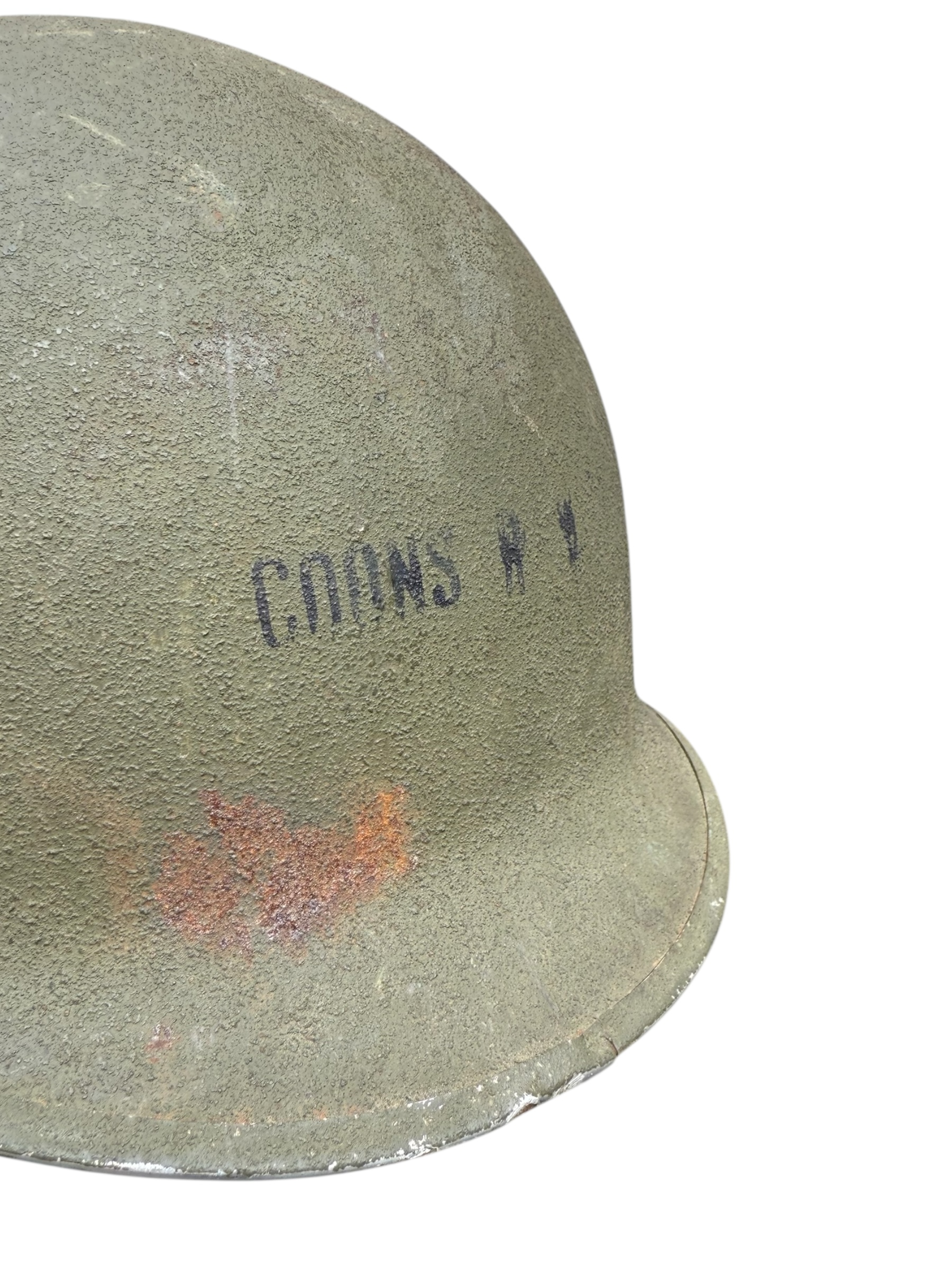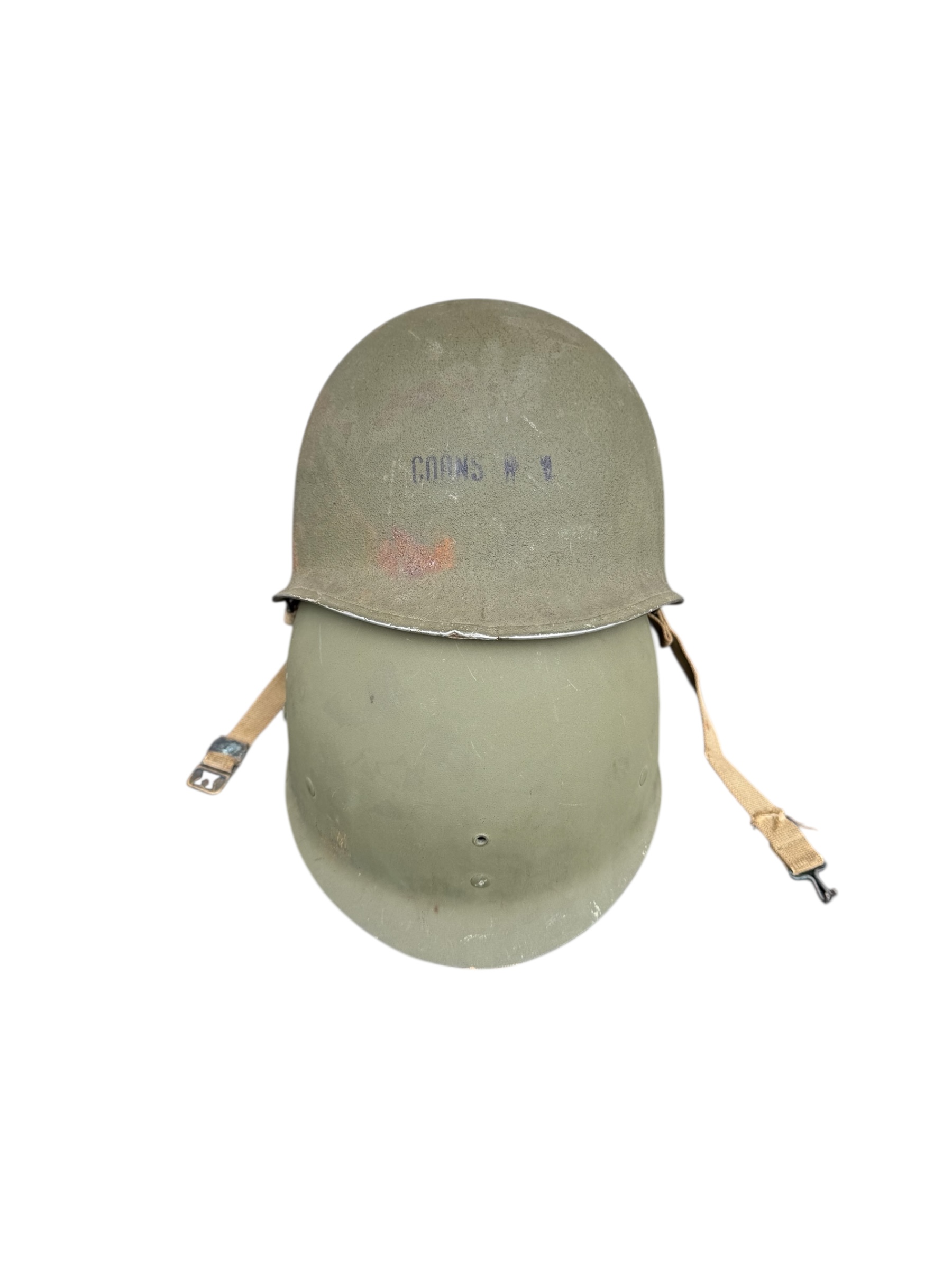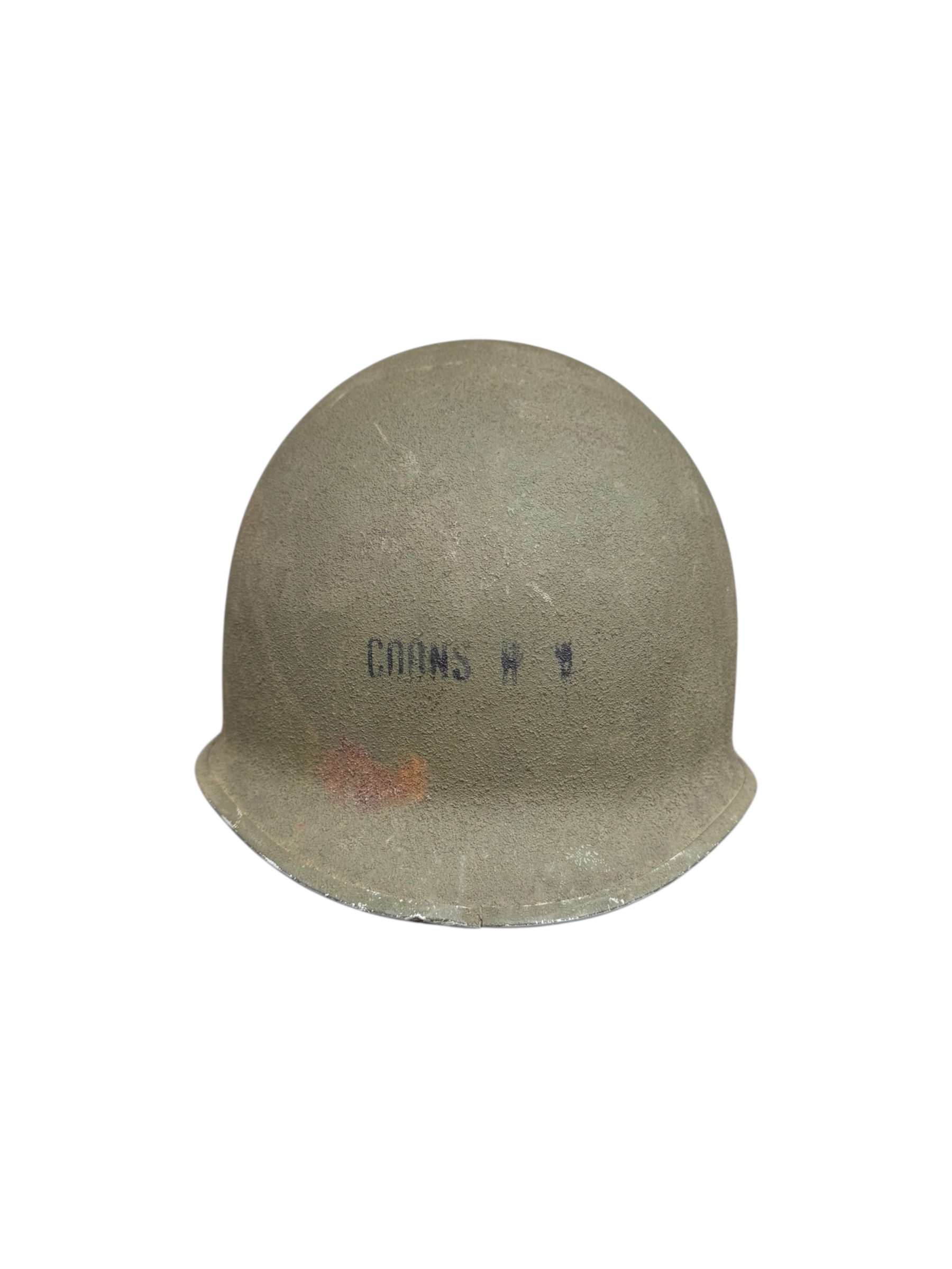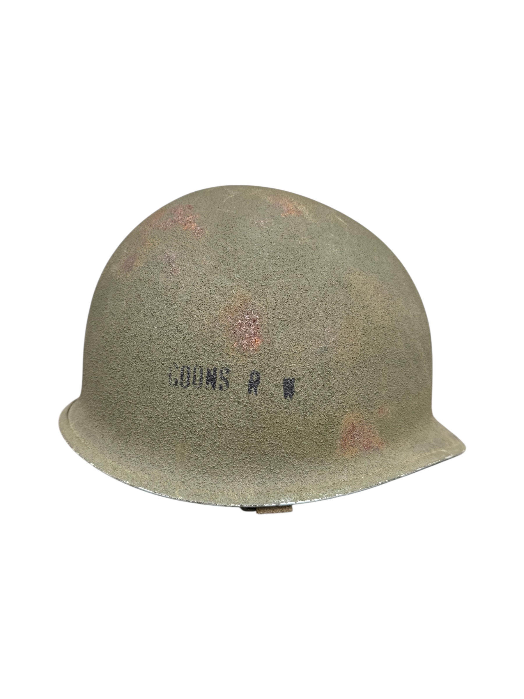 Amerikaanse WO2 M1 front seam fixed bale helm in nette staat. Het betreft een McCord schaal met een ruwe patina en de vroege Heatstamp 56F (1941/1942). De Westinghouse liner is nog in nette staat, maar de zweetband ontbreekt helaas. Een leuk detail is dat op meerdere plekken de naam Coons terug te vinden is. Hier is verder nog geen onderzoek naar gedaan.