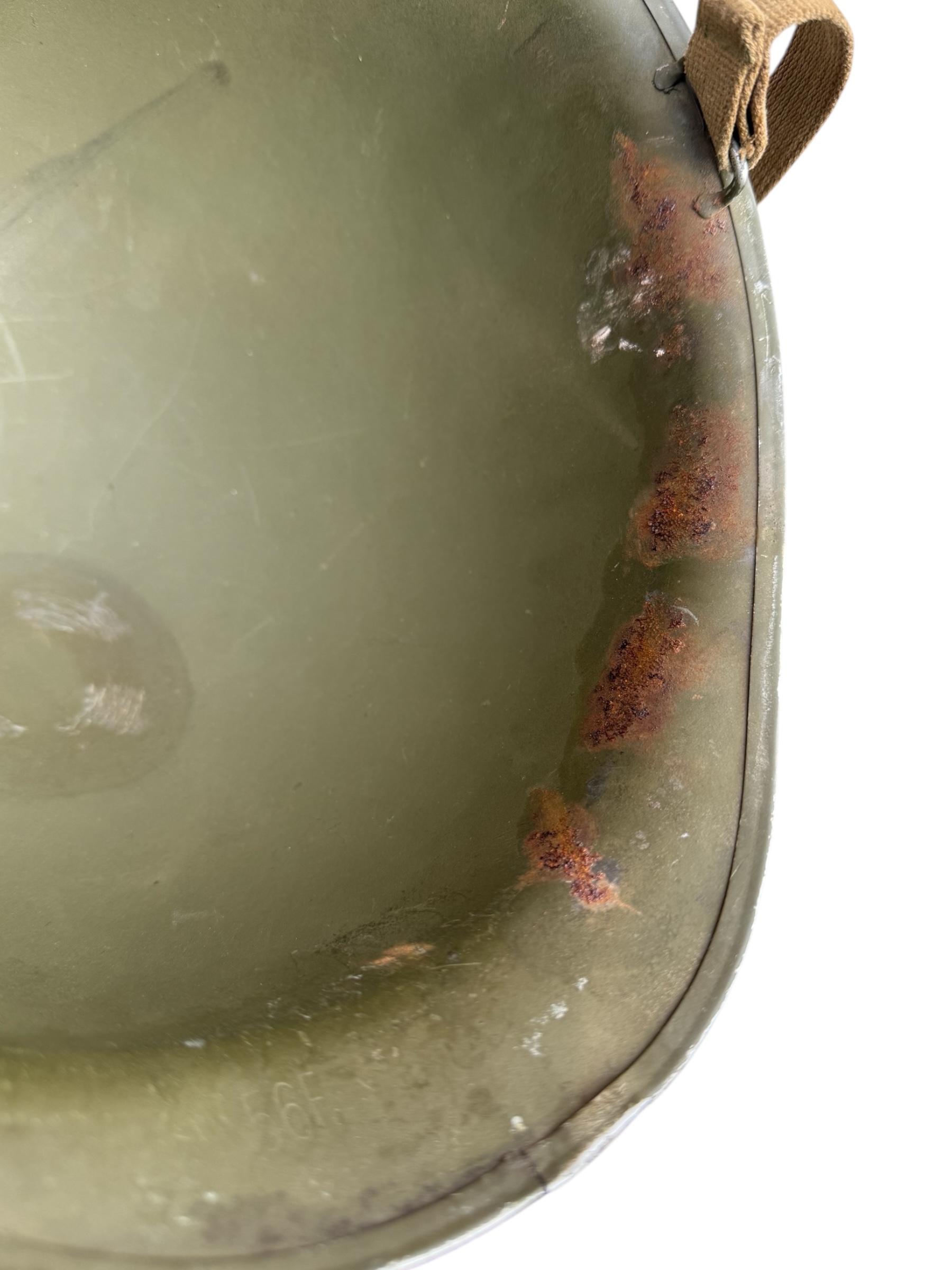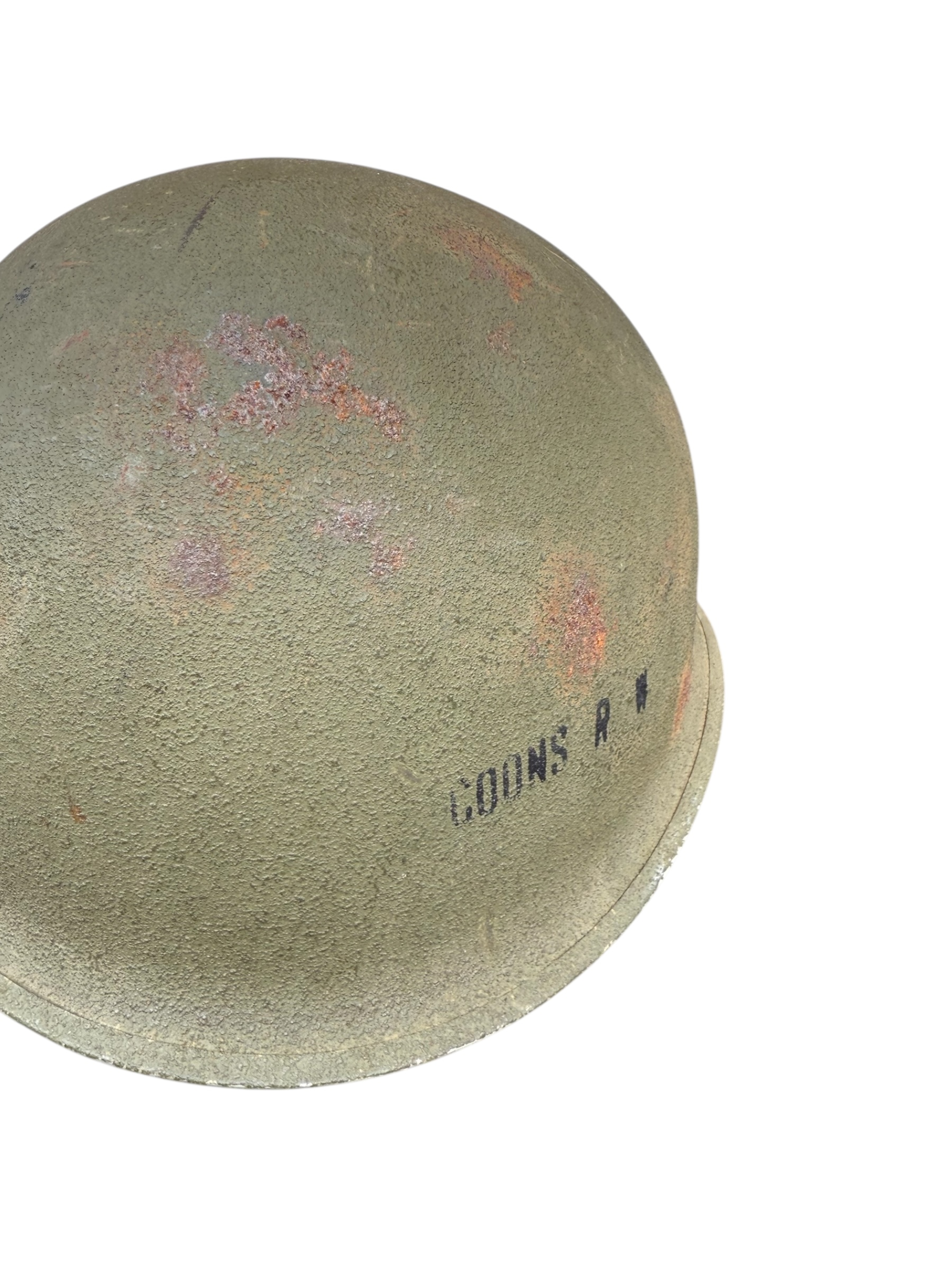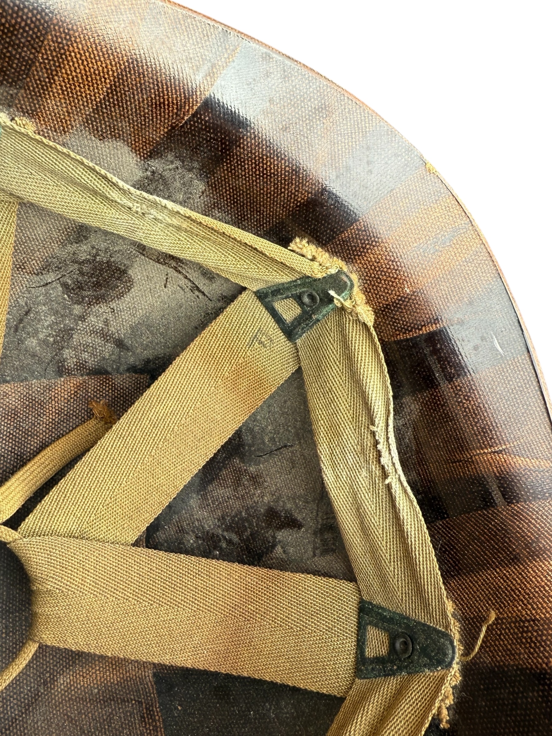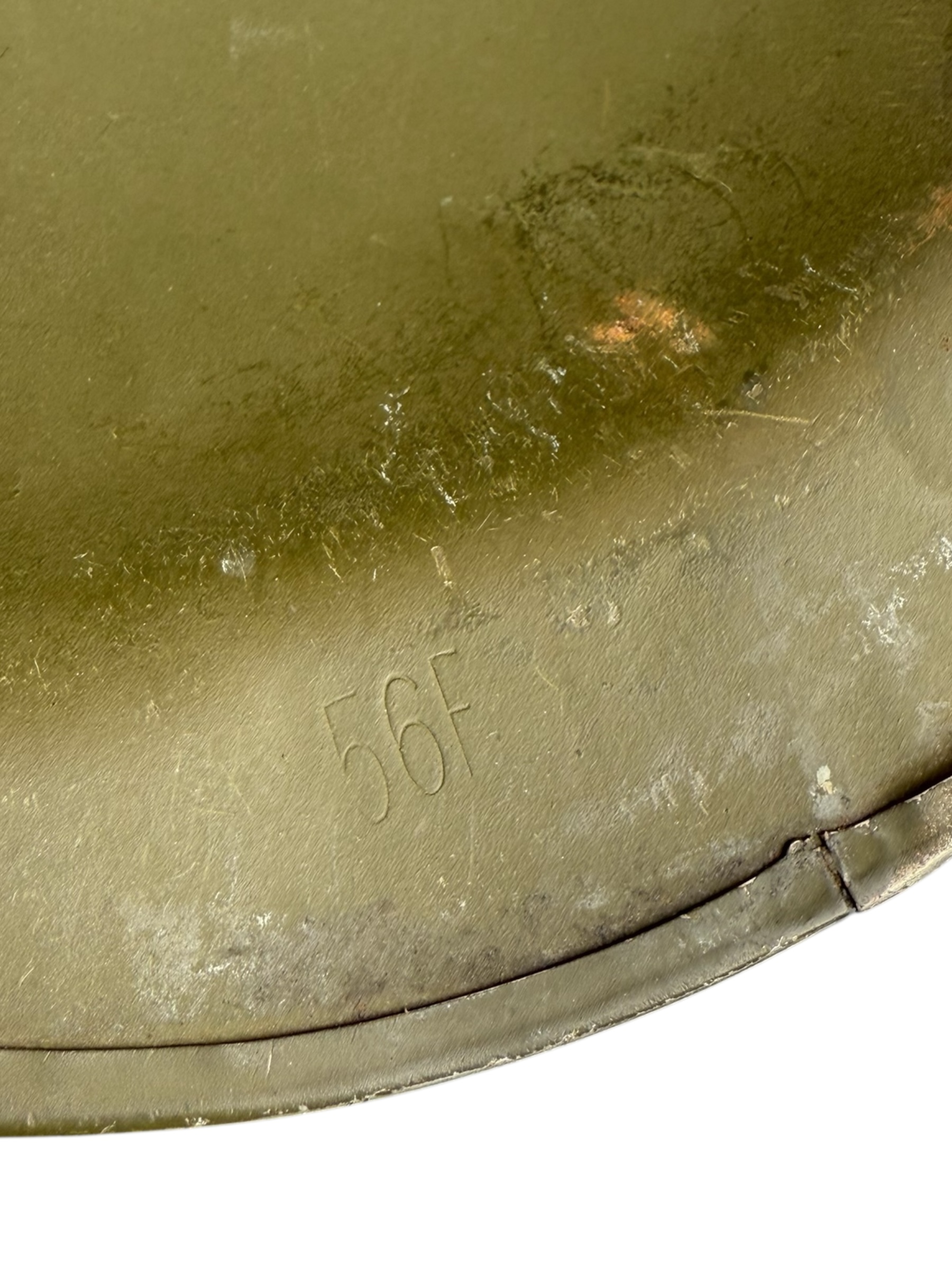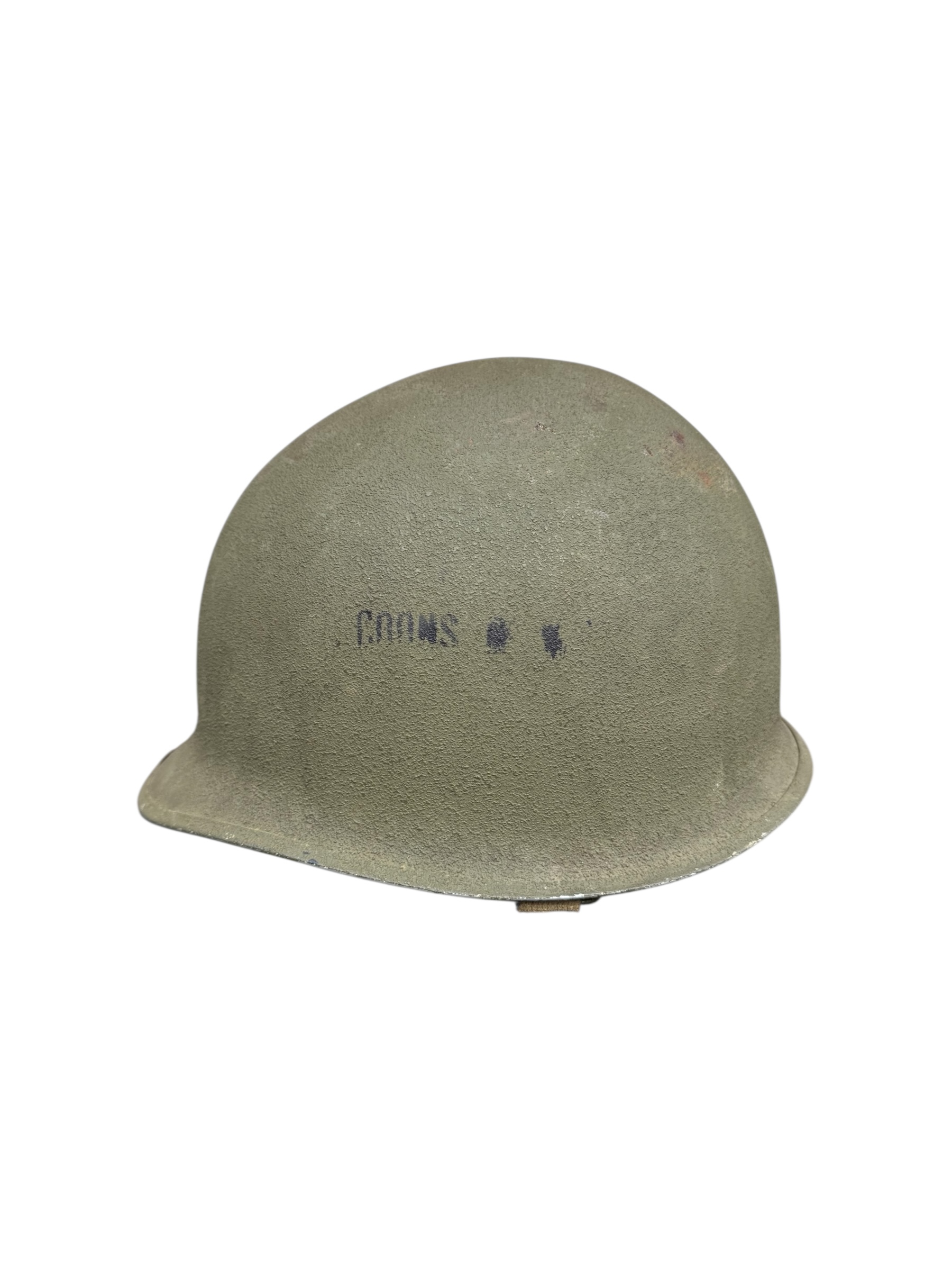 Amerikaanse WO2 M1 front seam fixed bale helm in nette staat. Het betreft een McCord schaal met een ruwe patina en de vroege Heatstamp 56F (1941/1942). De Westinghouse liner is nog in nette staat, maar de zweetband ontbreekt helaas. Een leuk detail is dat op meerdere plekken de naam Coons terug te vinden is. Hier is verder nog geen onderzoek naar gedaan.