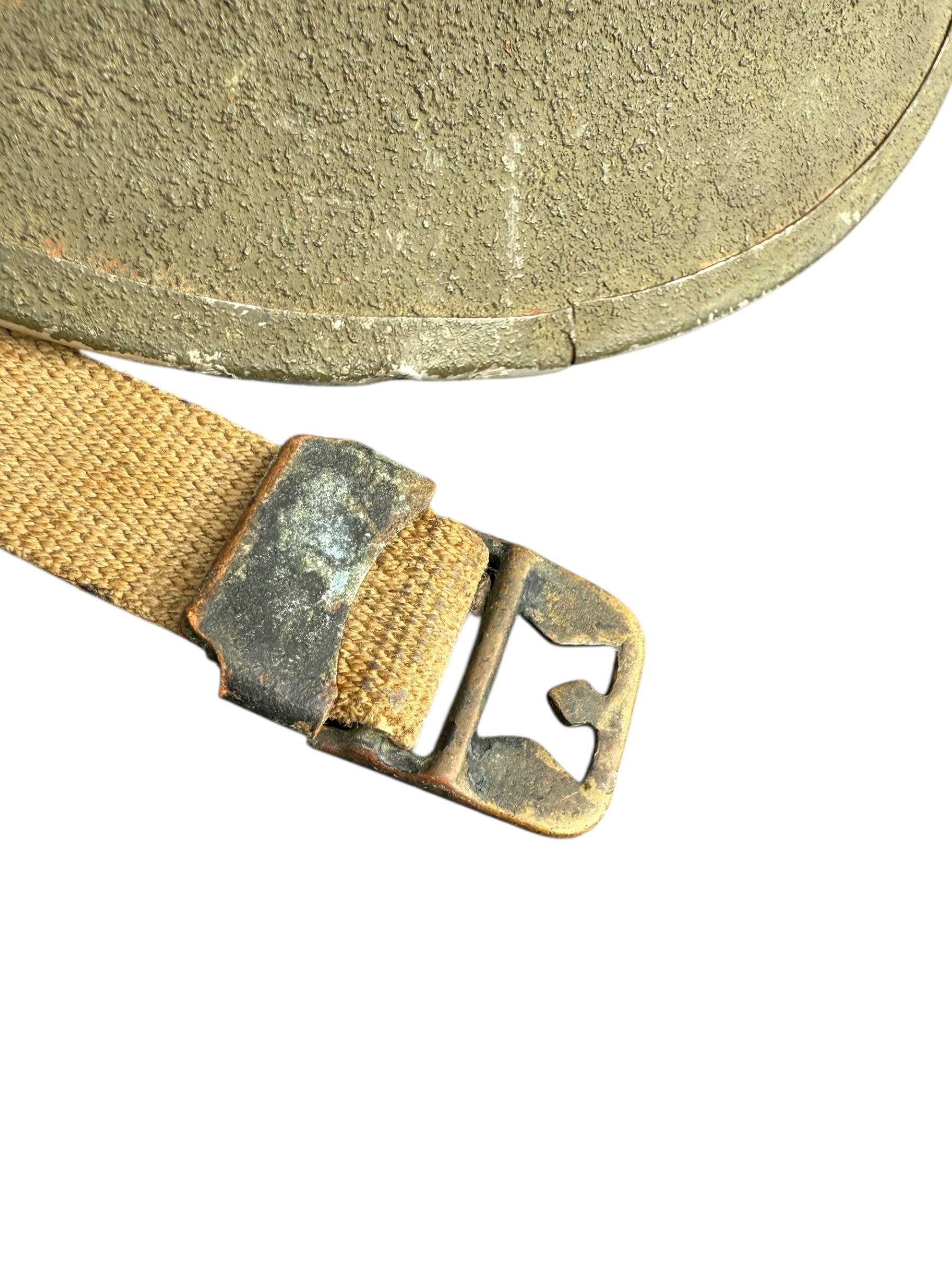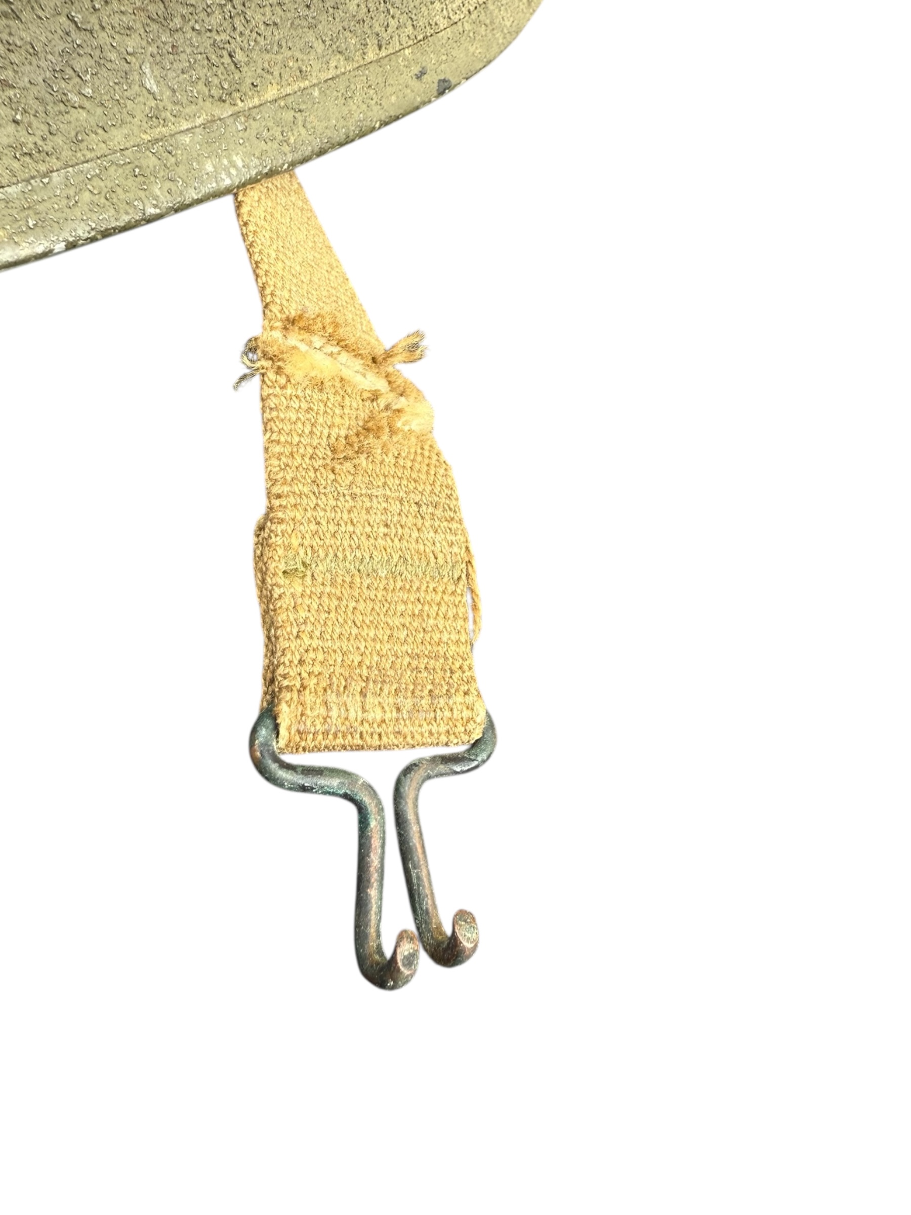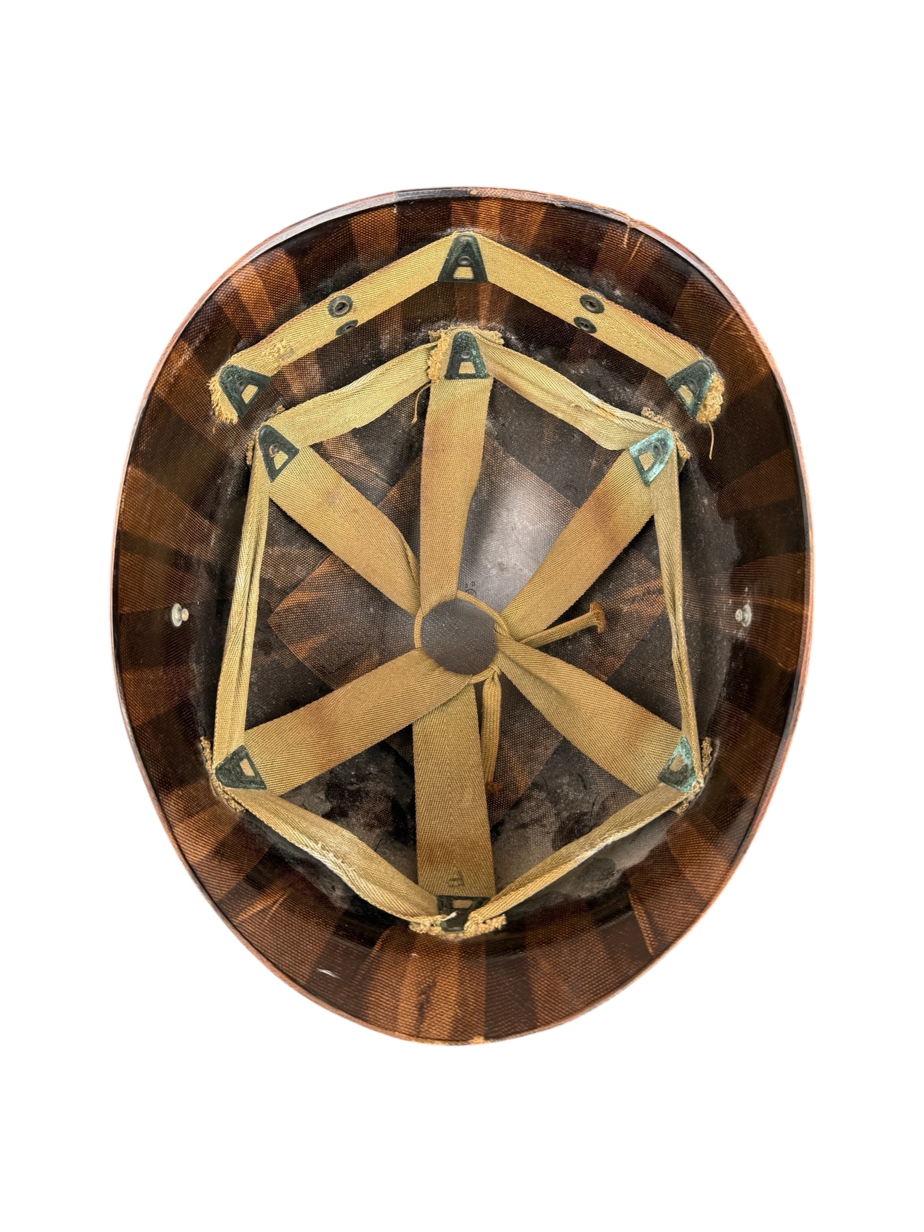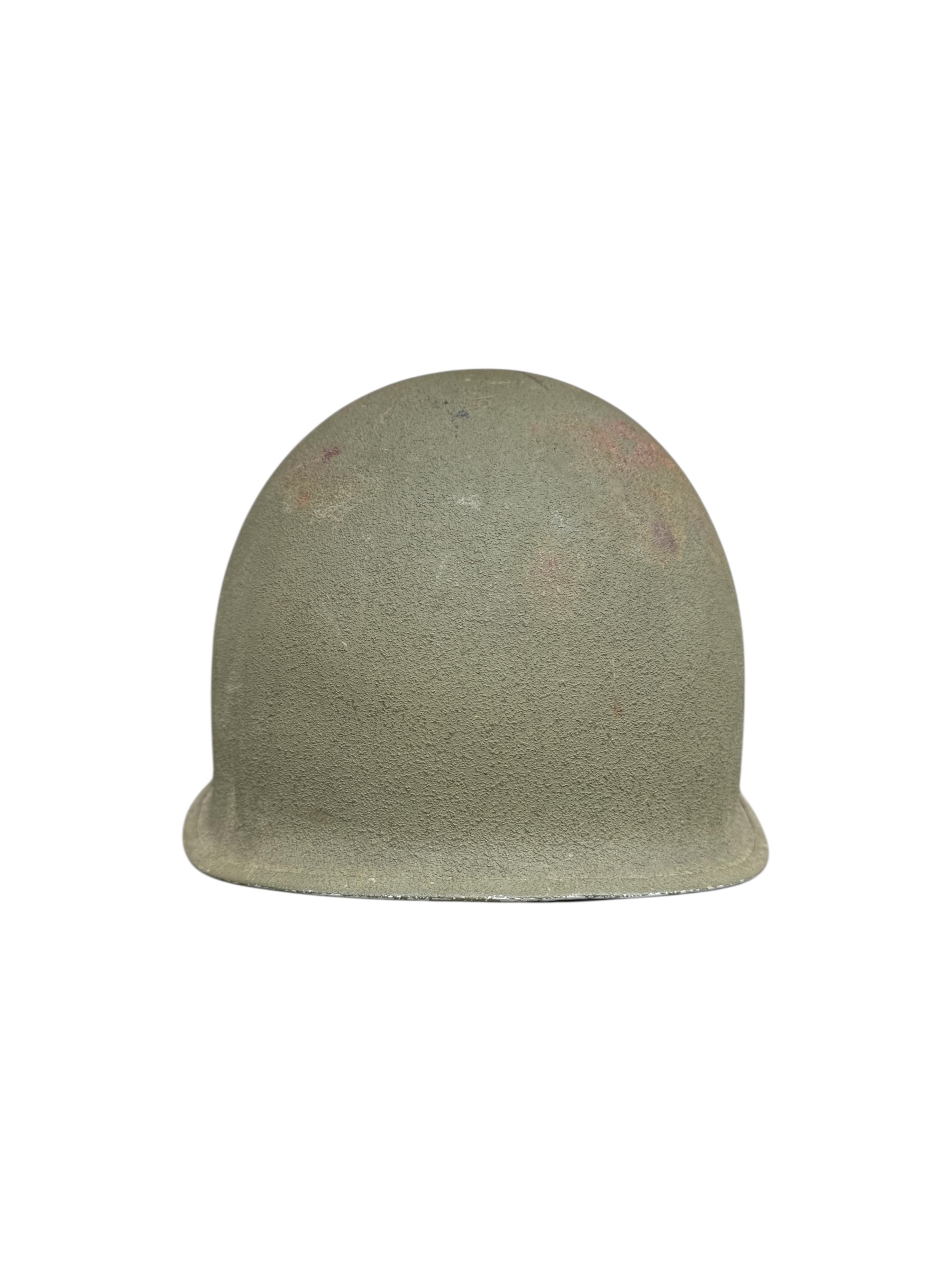 Amerikaanse WO2 M1 front seam fixed bale helm in nette staat. Het betreft een McCord schaal met een ruwe patina en de vroege Heatstamp 56F (1941/1942). De Westinghouse liner is nog in nette staat, maar de zweetband ontbreekt helaas. Een leuk detail is dat op meerdere plekken de naam Coons terug te vinden is. Hier is verder nog geen onderzoek naar gedaan.