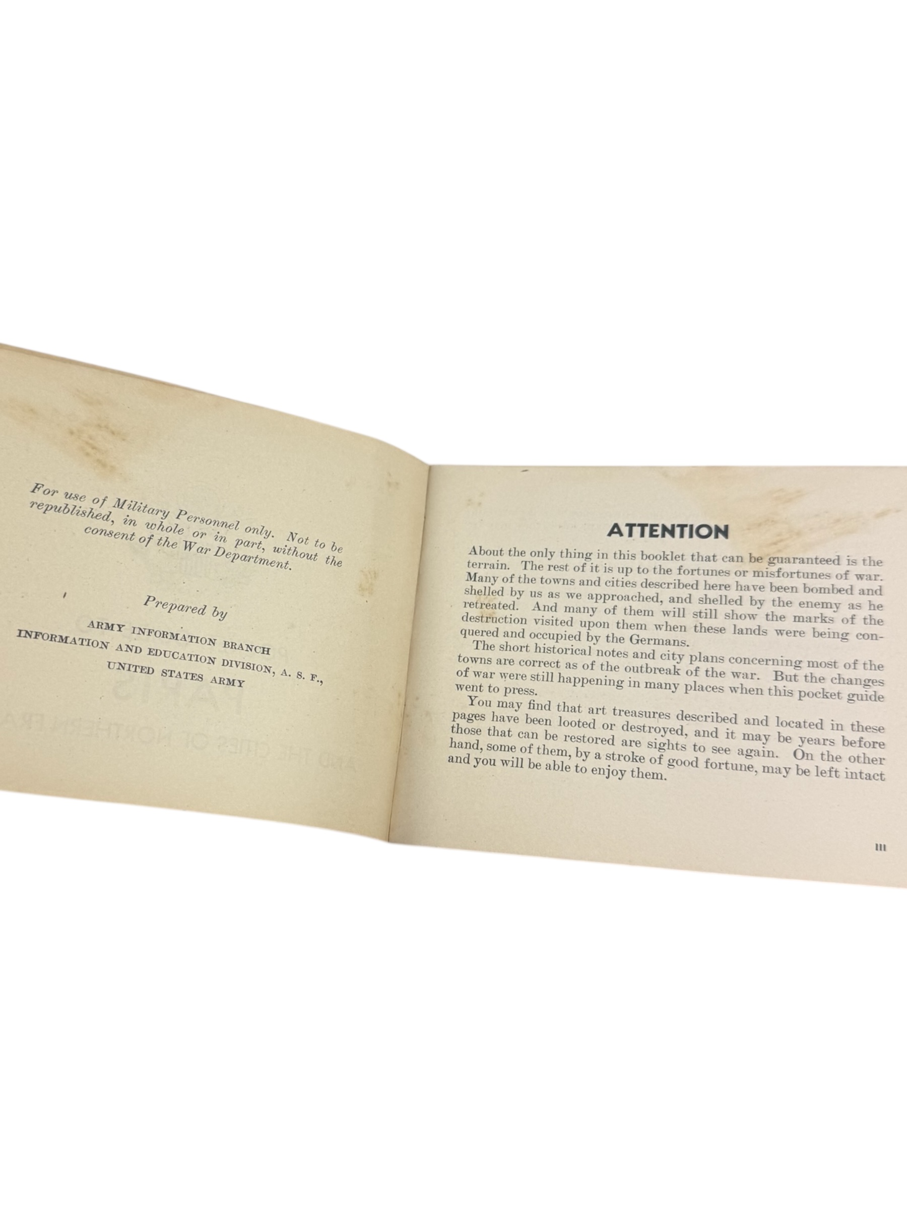 Amerikaanse WO2 Pocket Guide to Paris and cities of Northern France. Dit exemplaar werd uitgegeven in 1944 en verkeert in goede staat.