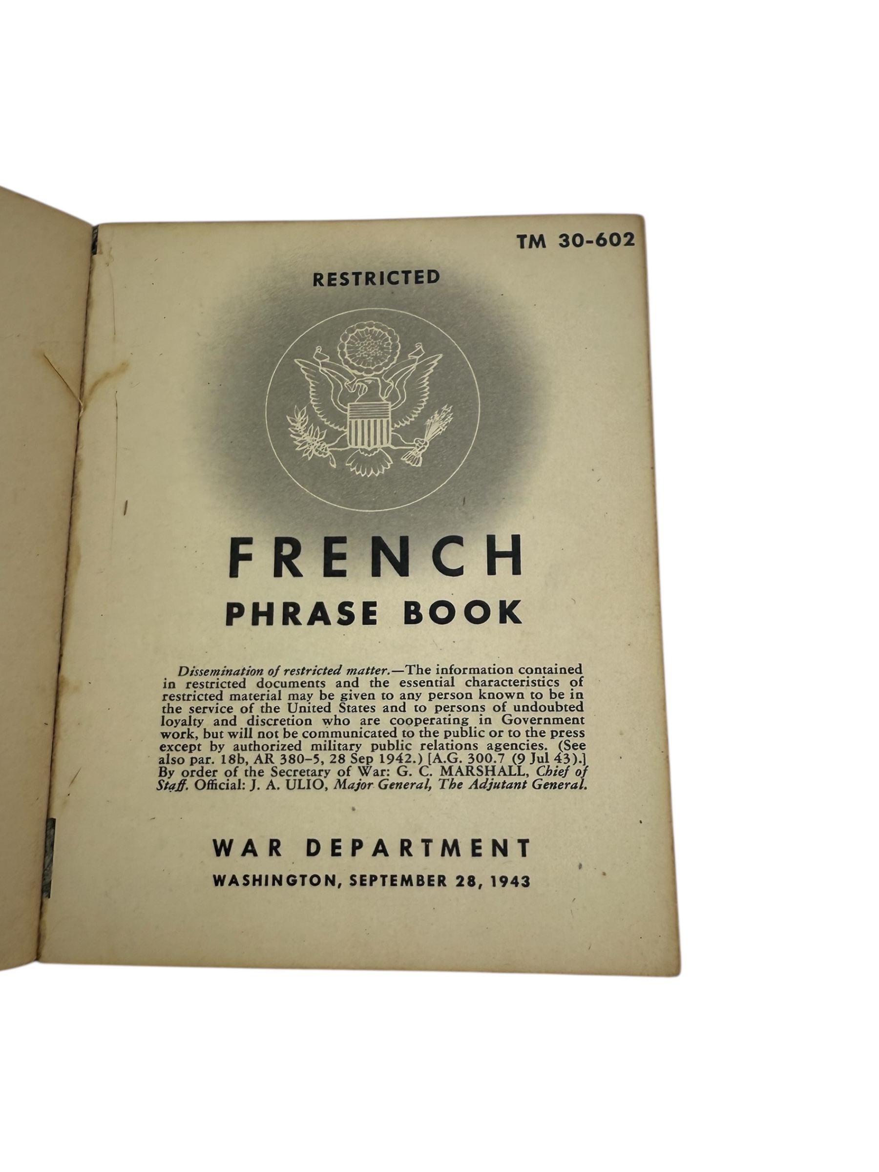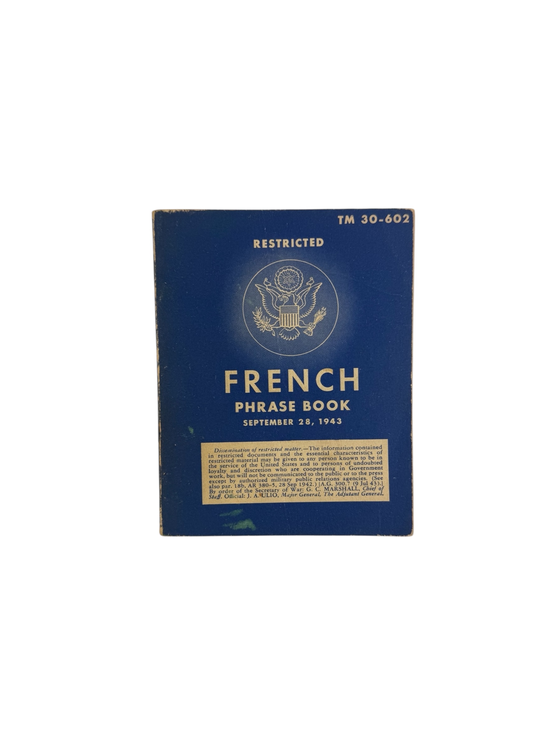 Amerikaanse WO2 Franstalige TM30-602 taalgids. Dit exemplaar is uitgebracht in 1943 en verkeert in goede gebruikte staat.