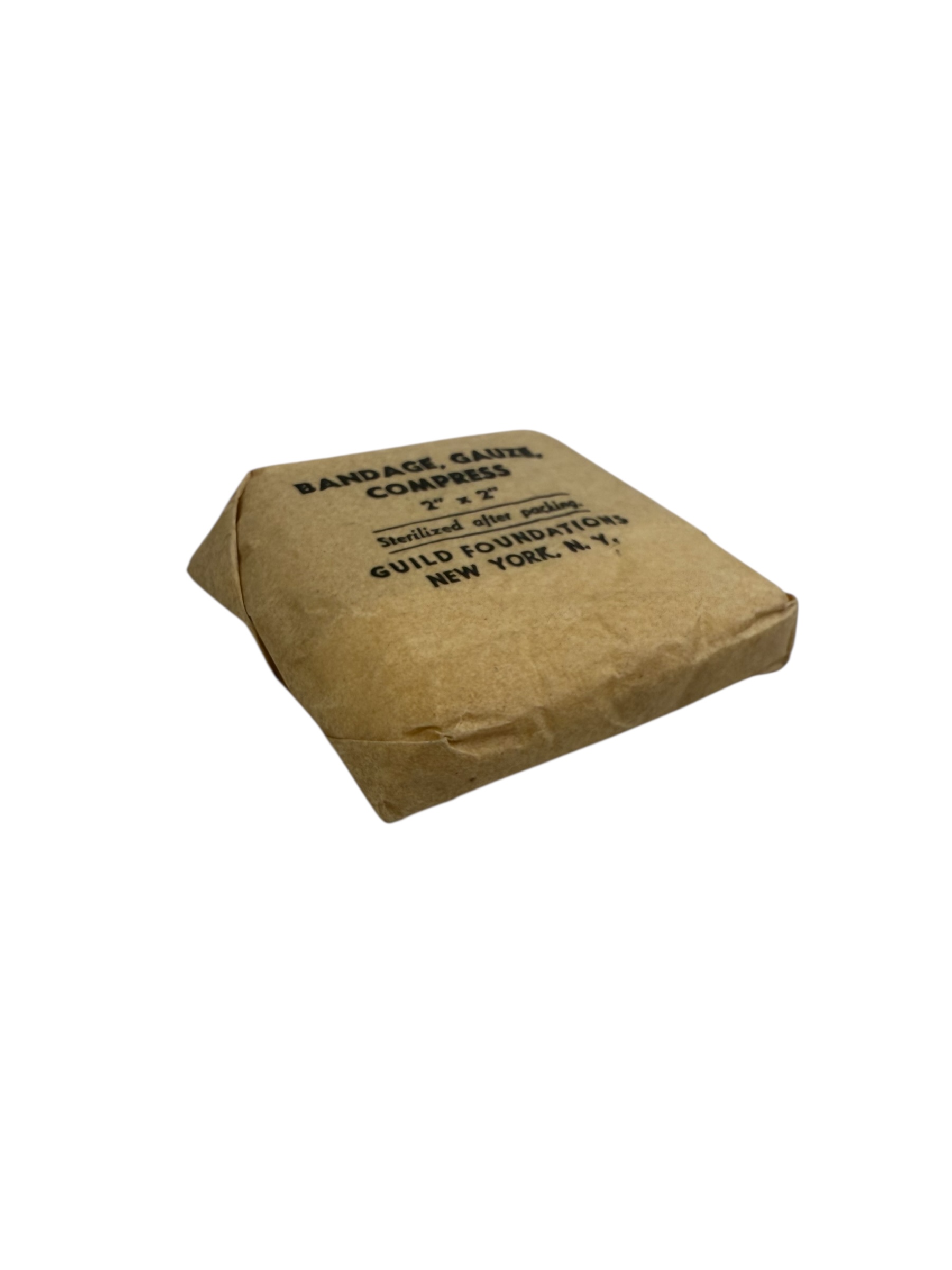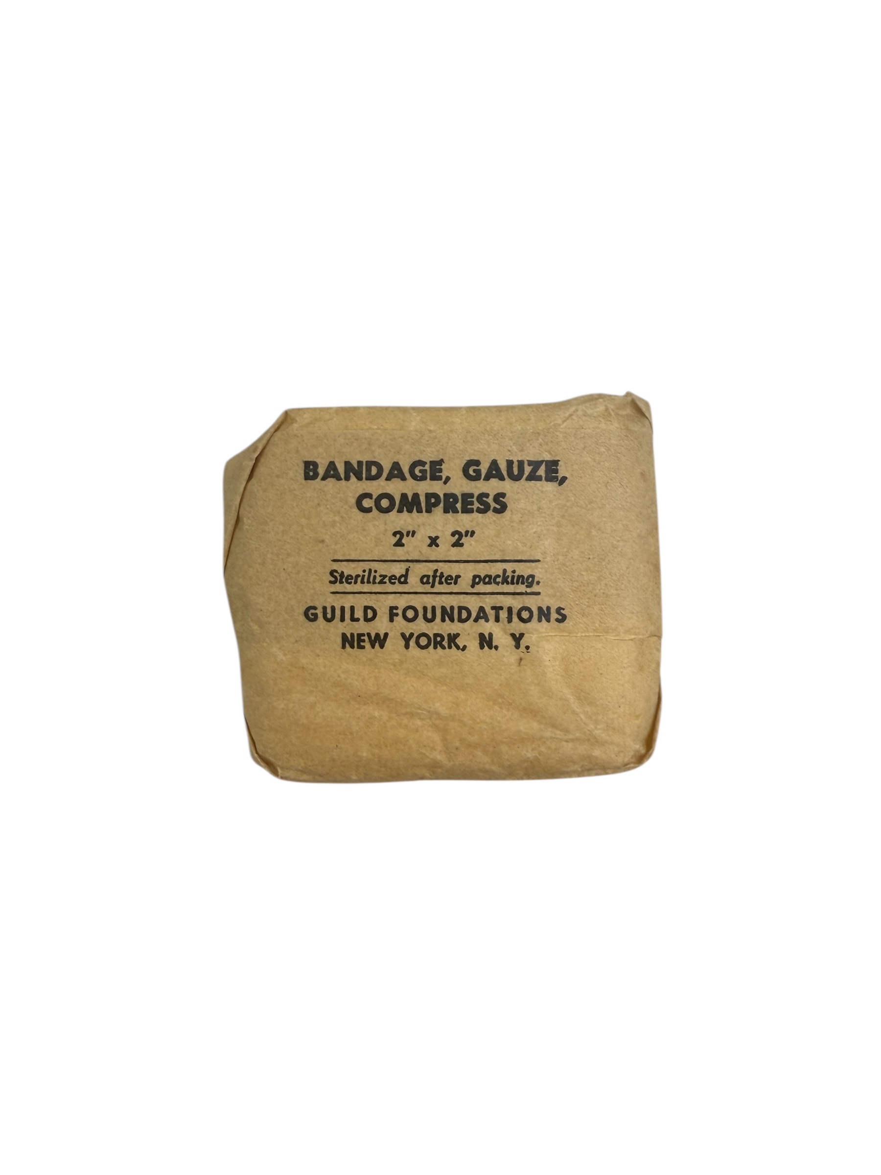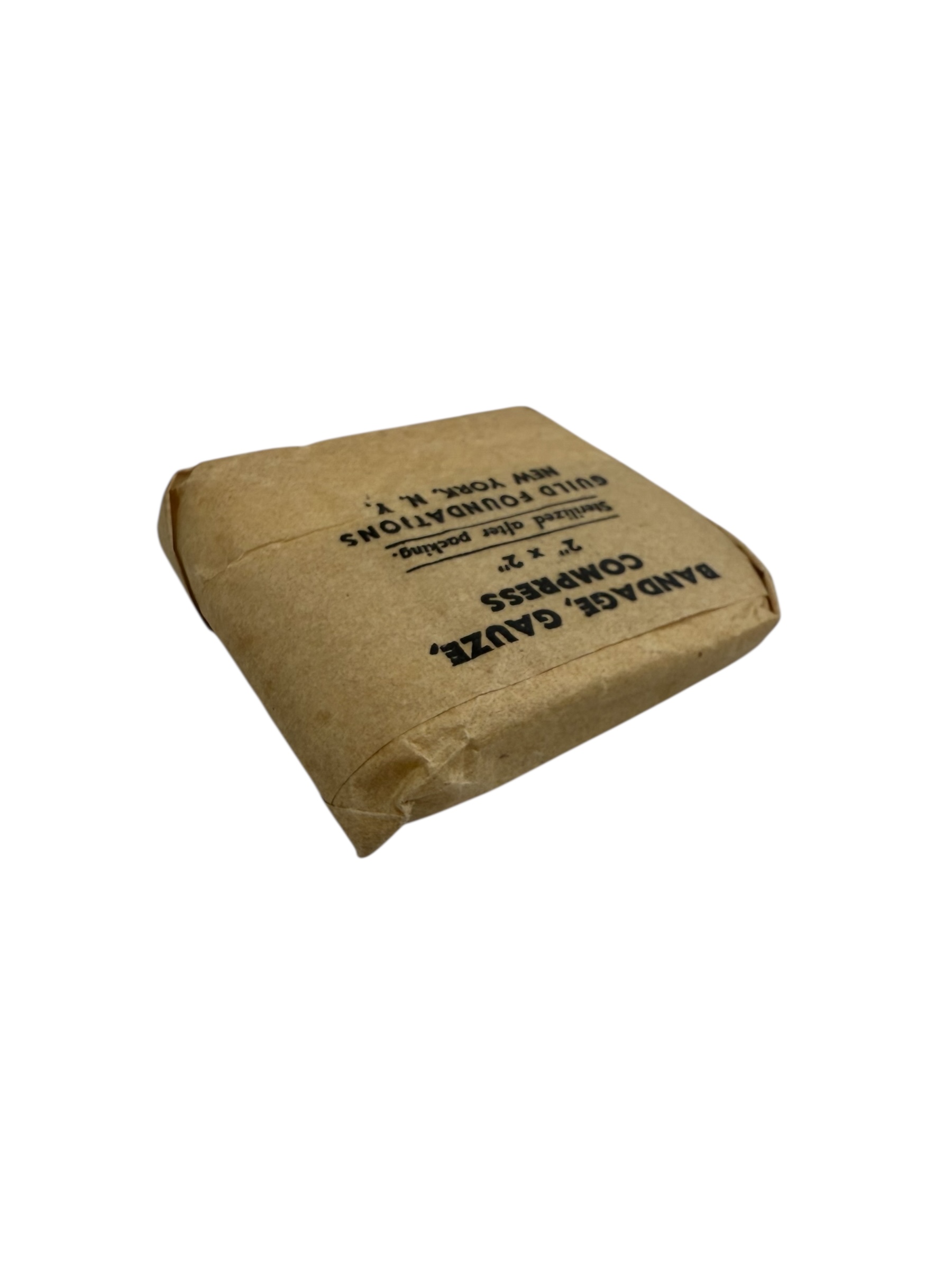 Amerikaanse WO2 Gauze Bandage Compress in goede staat. De verpakkingen zijn niet aangebroken, waardoor de originele inhoud nog volledig aanwezig is. Er zijn meerdere exemplaren beschikbaar, allemaal in vergelijkbare staat en met dezelfde markering.