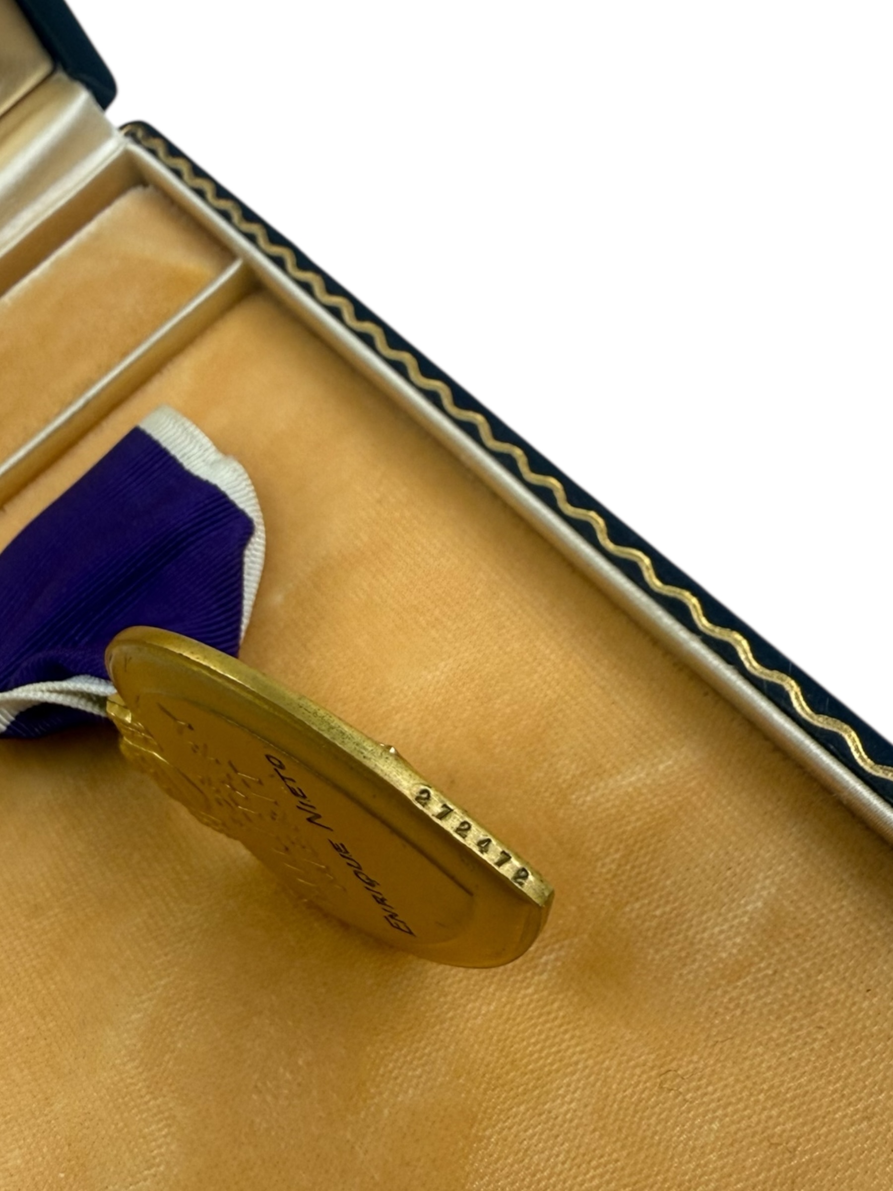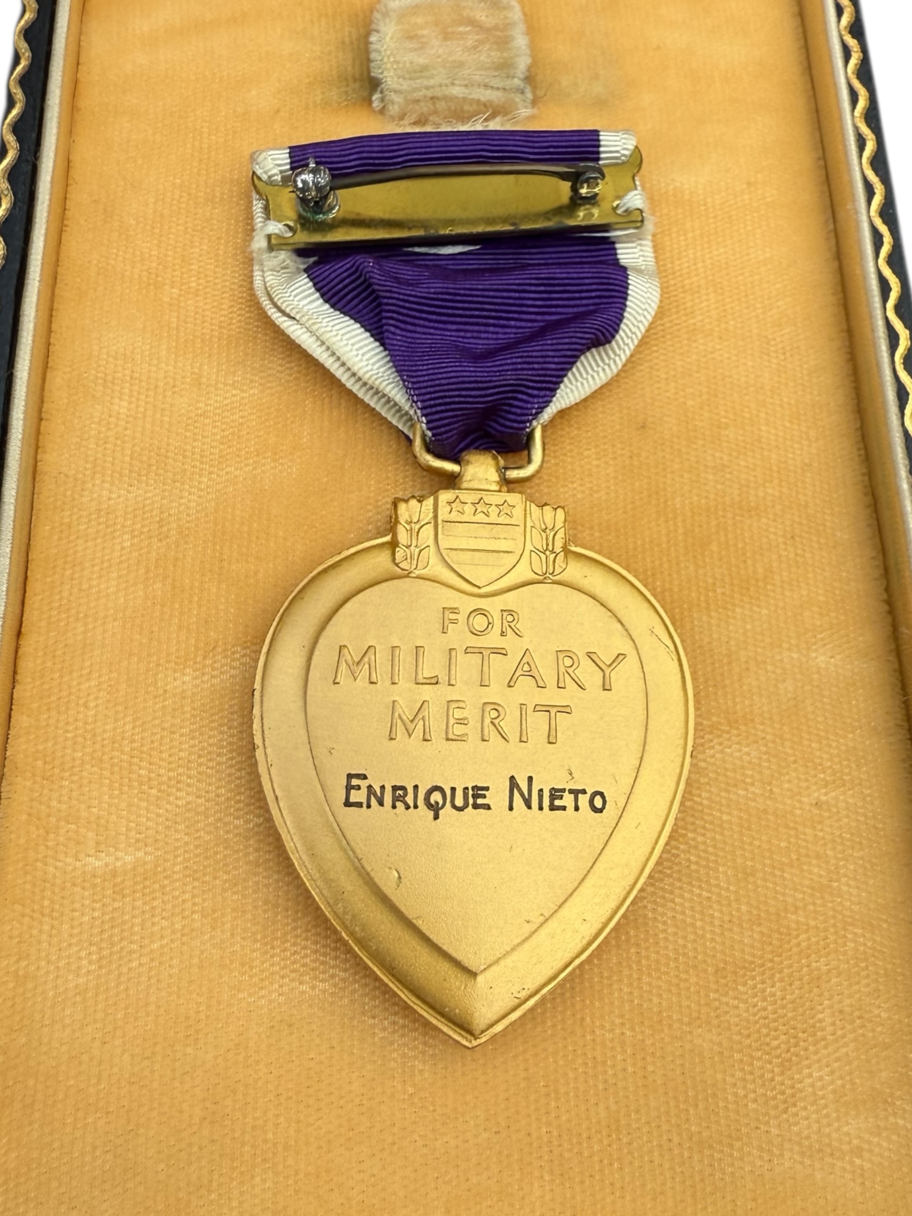 Deze Amerikaanse, handgegraveerde en genummerde Purple Heart werd toegekend aan Enrique Nieto, een jonge engineer met dienstnummer 18104575. Enrique stierf helaas op 29 mei 1943 op slechts 21‑jarige leeftijd. Amerikaanse Engineers bouwden tijdens de Tweede Wereldoorlog en onderhielden bruggen, wegen en vliegvelden, ruimden landmijnen op, legden verdedigingswerken aan en ondersteunden gevechtsoperaties. Ze zorgden ook voor water, sanitaire voorzieningen en elektriciteit, waardoor ze cruciaal waren voor de voortgang en veiligheid van de geallieerde troepen, vaak onder gevaarlijke omstandigheden.