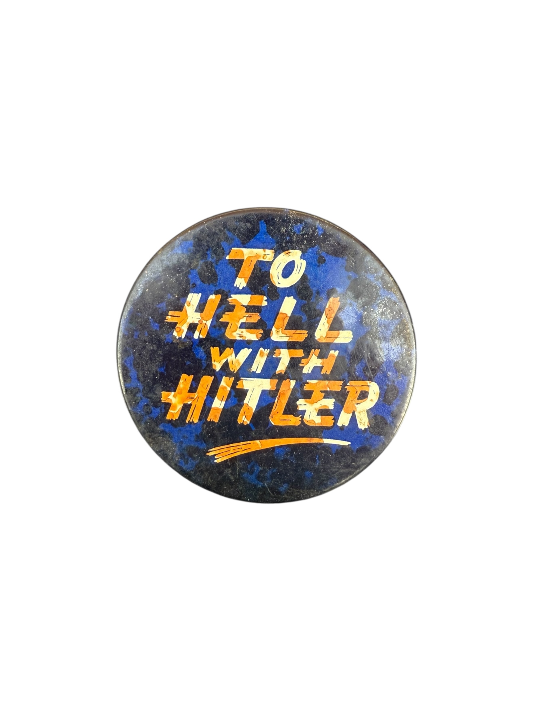 Amerikaanse WO2 Anti-Axis button in goede staat. Gemaakt van staal en voorzien van de tekst “To Hell with Hitler”.