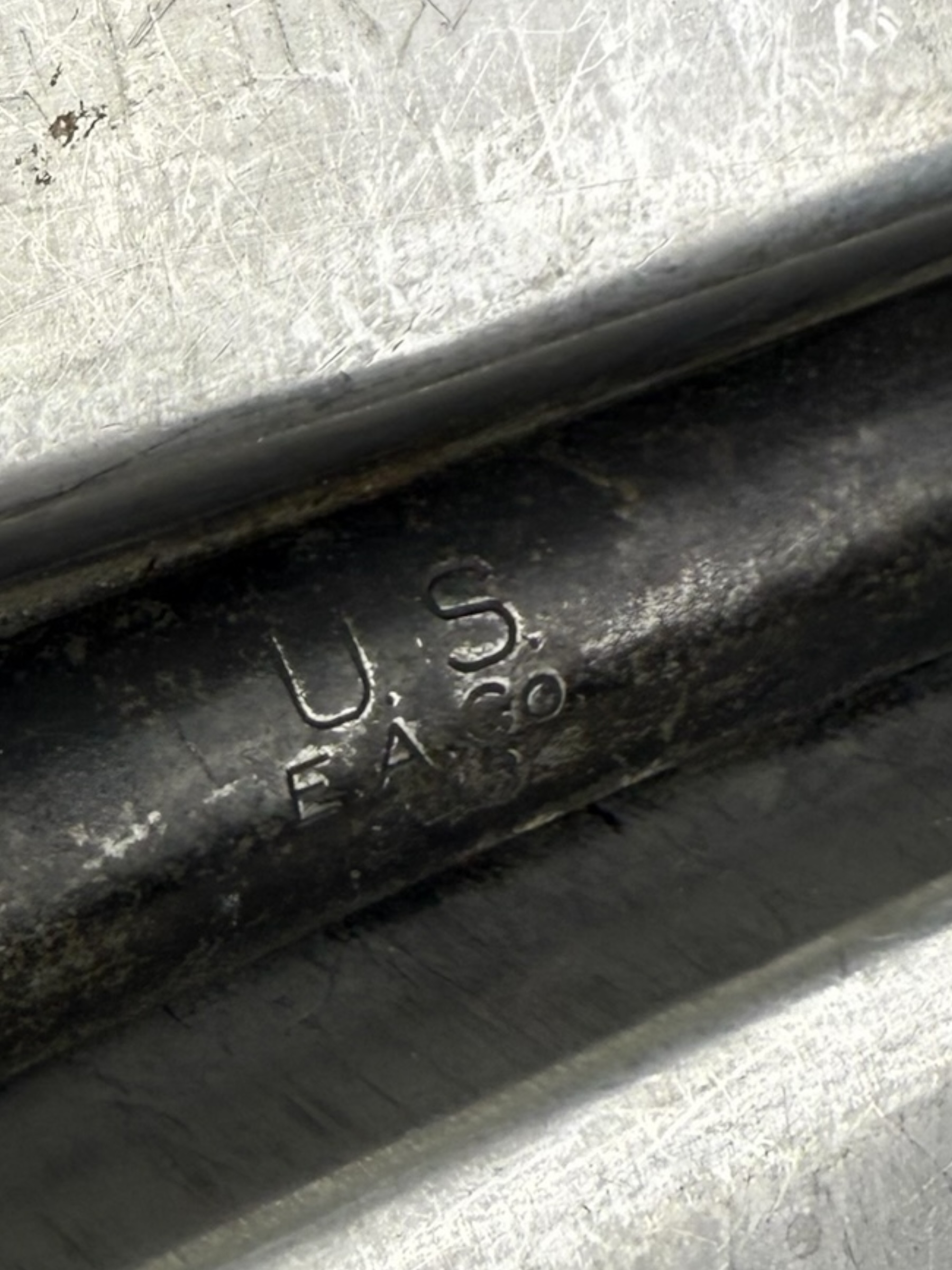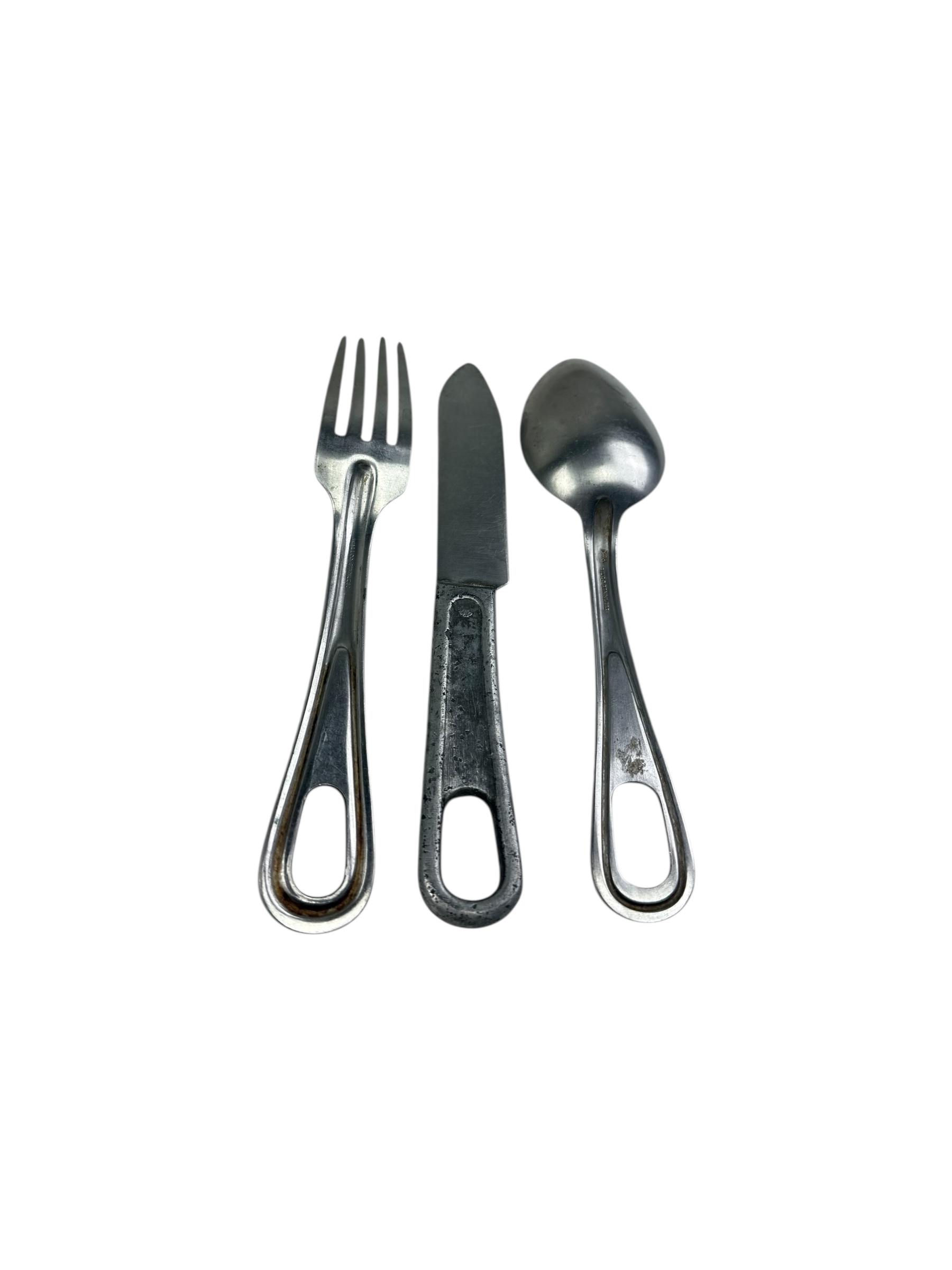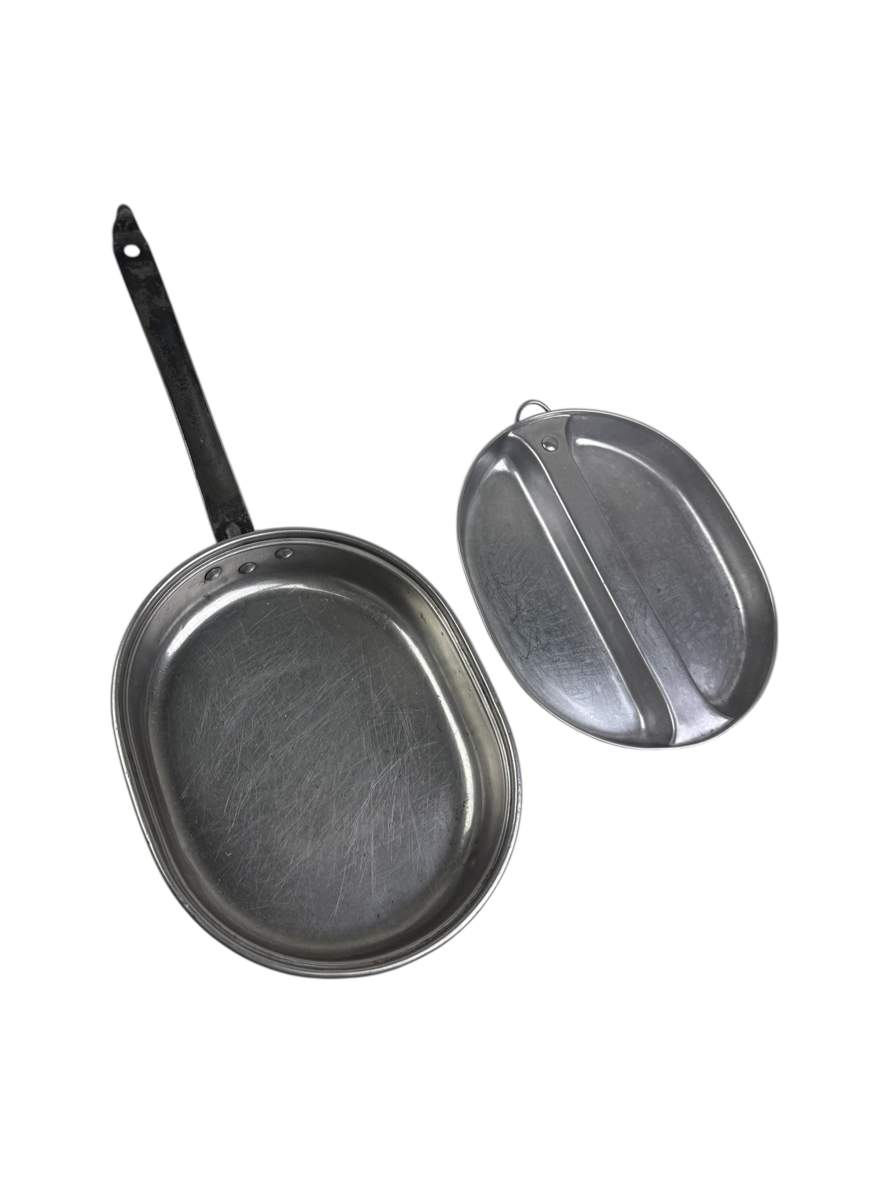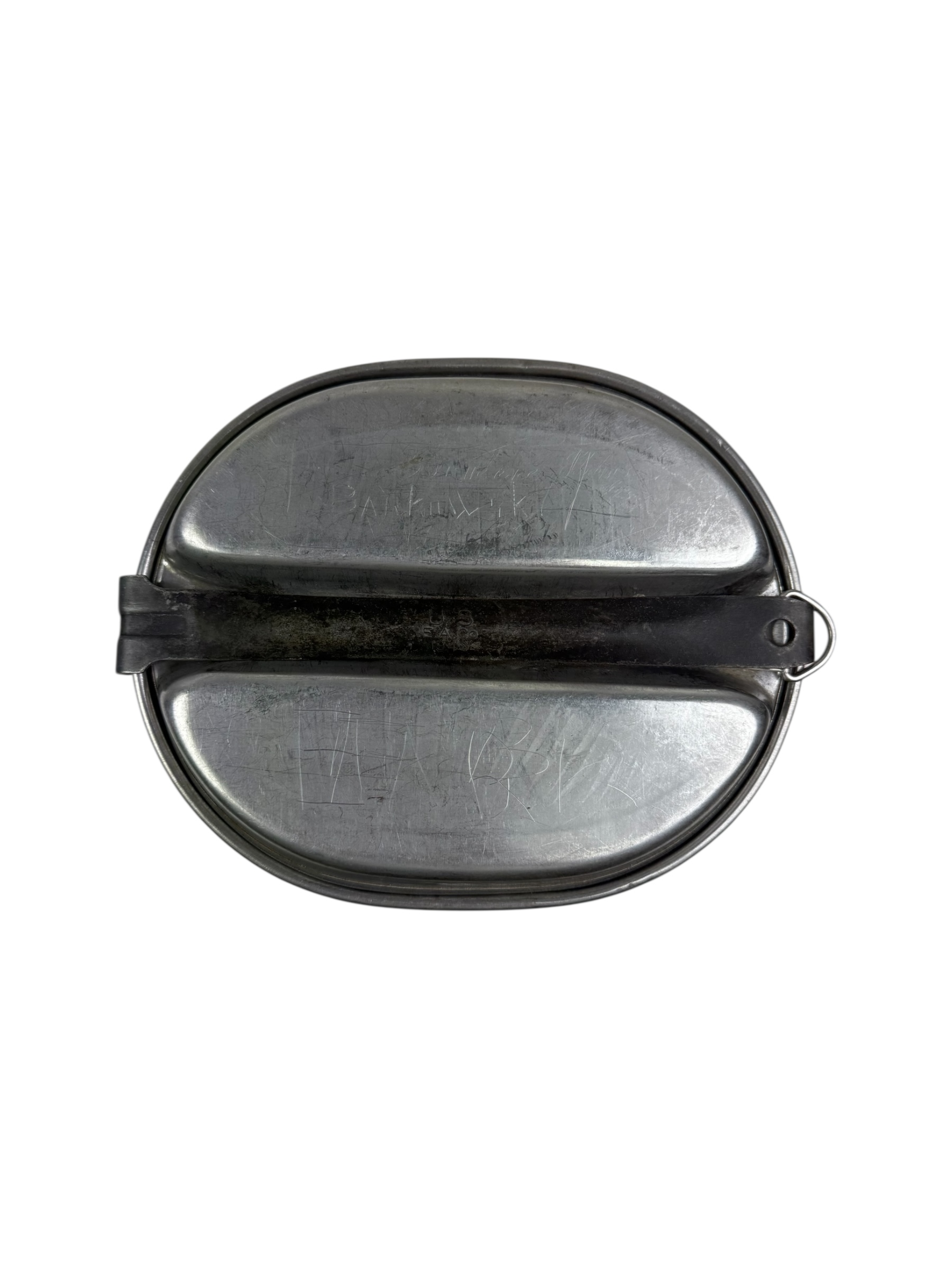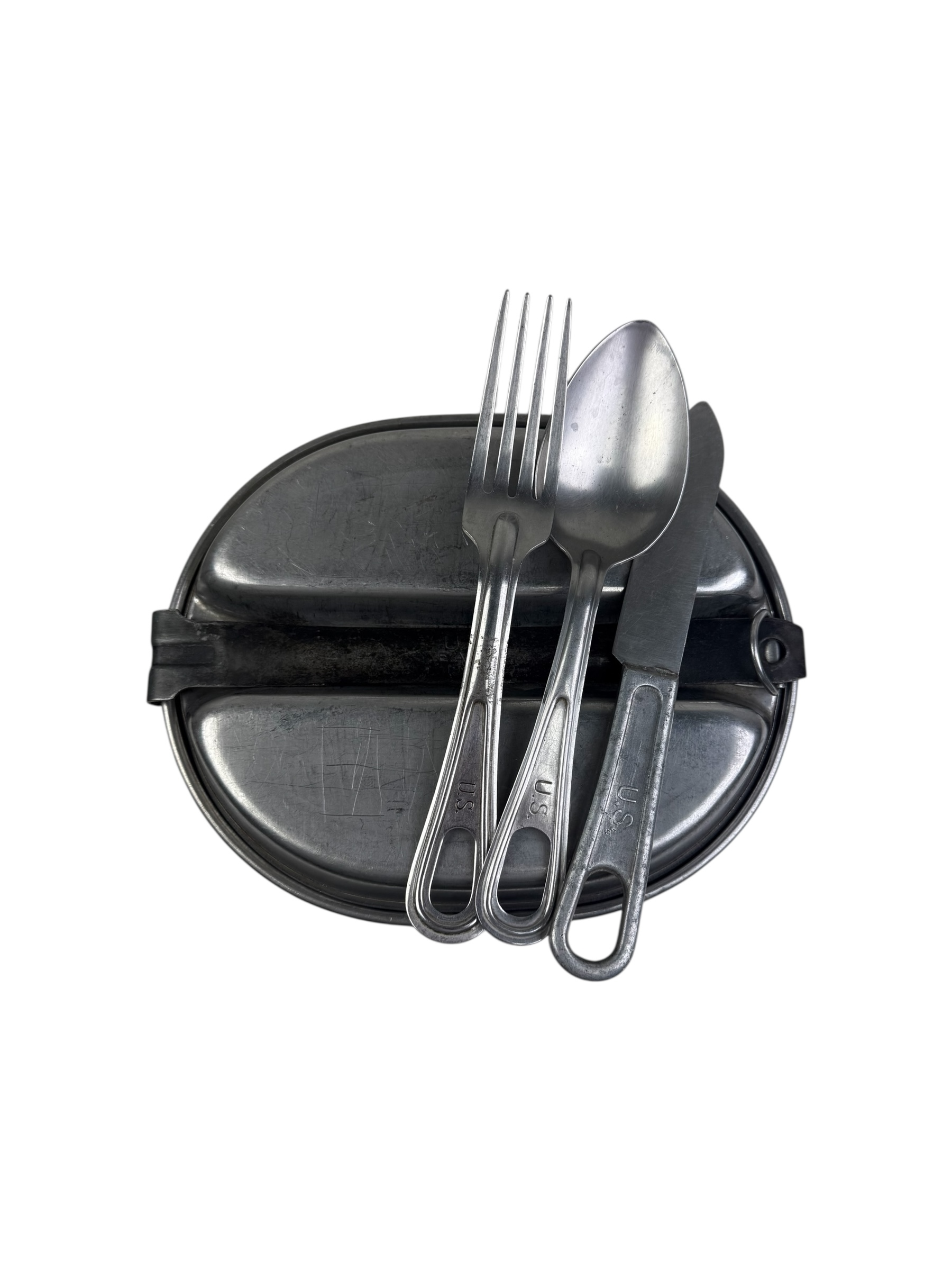 Deze Amerikaanse WO2 mess kit verkeert in goede staat, dateert uit 1943 en de bijbehorende bestek set is eveneens duidelijk gemarkeerd.