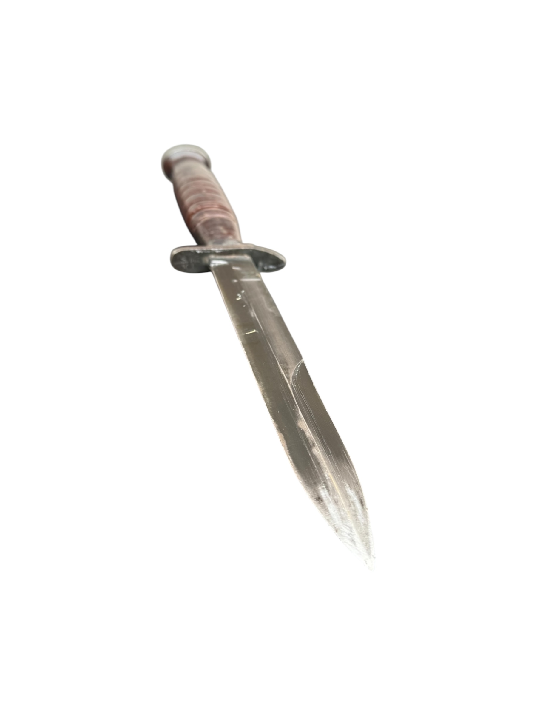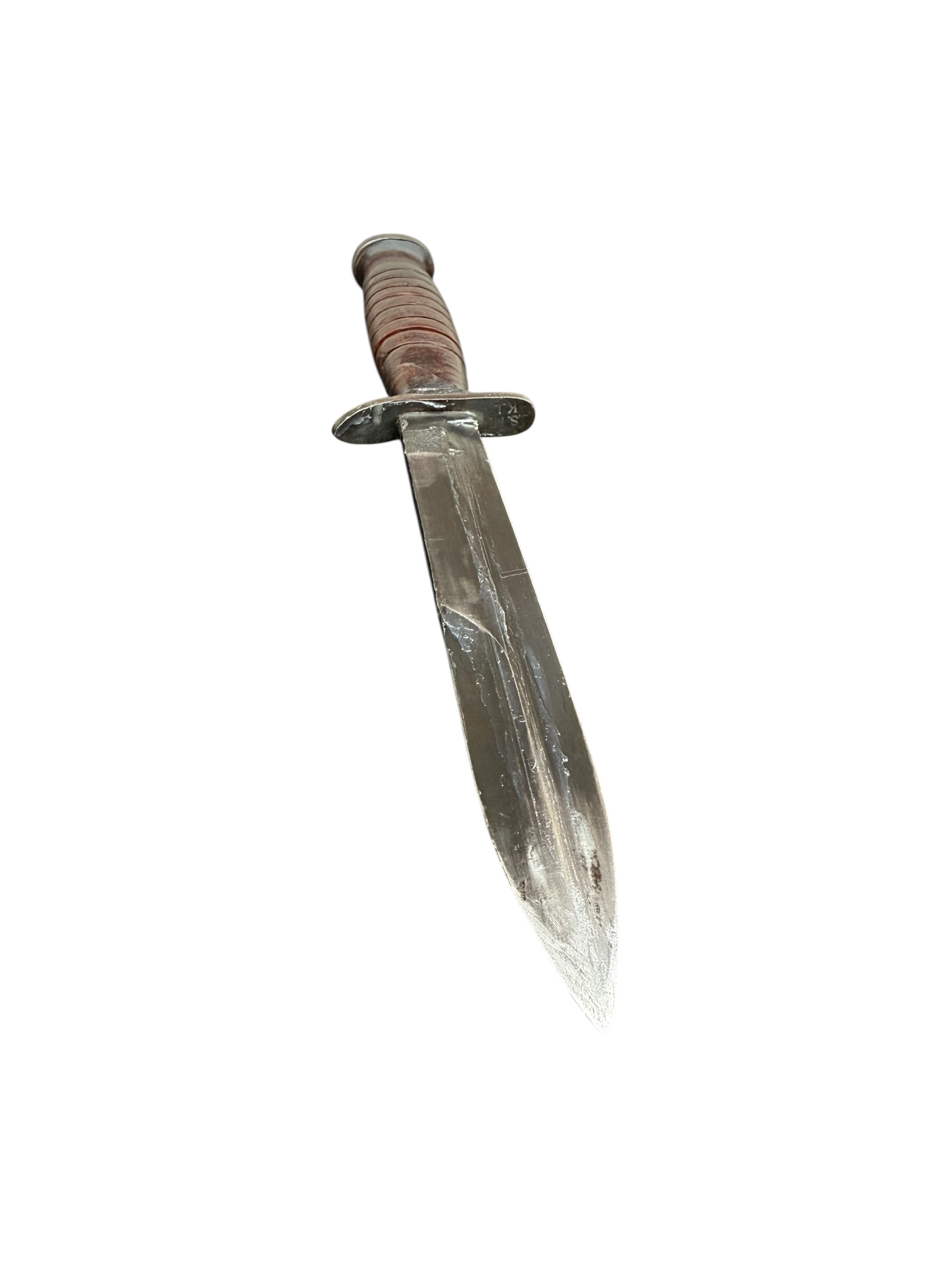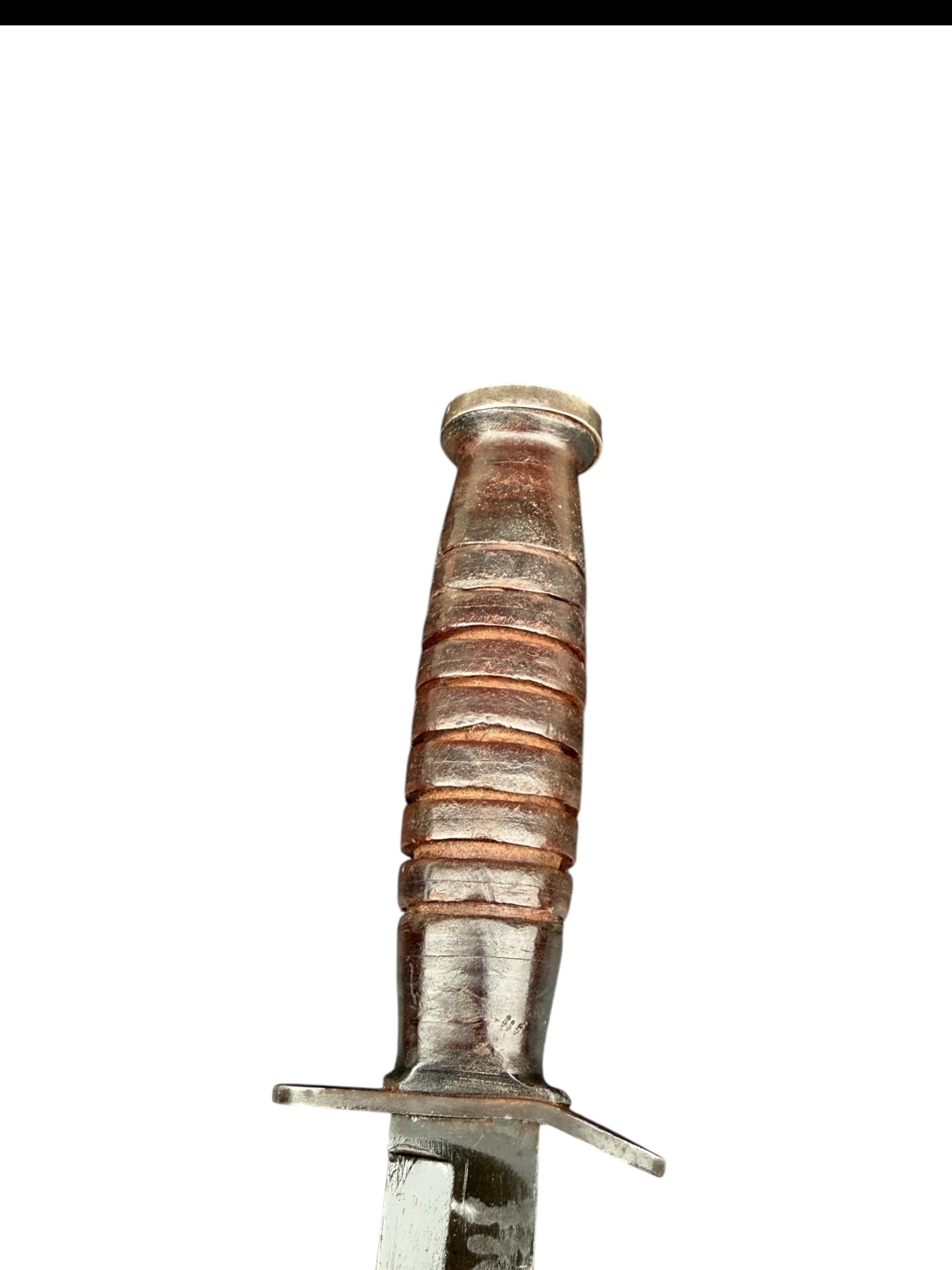 Amerikaans WO2 M3 gevechtsmes gemaakt door de zeldzamere producent Kinfolks. Het betreft het 3e model in nette staat. De Flaming Ball op de greep is nog duidelijk zichtbaar en alle andere markeringen zijn ook eenvoudig terug te vinden. In verband met de huisregels is het helaas niet toegestaan om items als deze te af te rekenen met Paypal. Geen verkoop onder de 18 jaar.