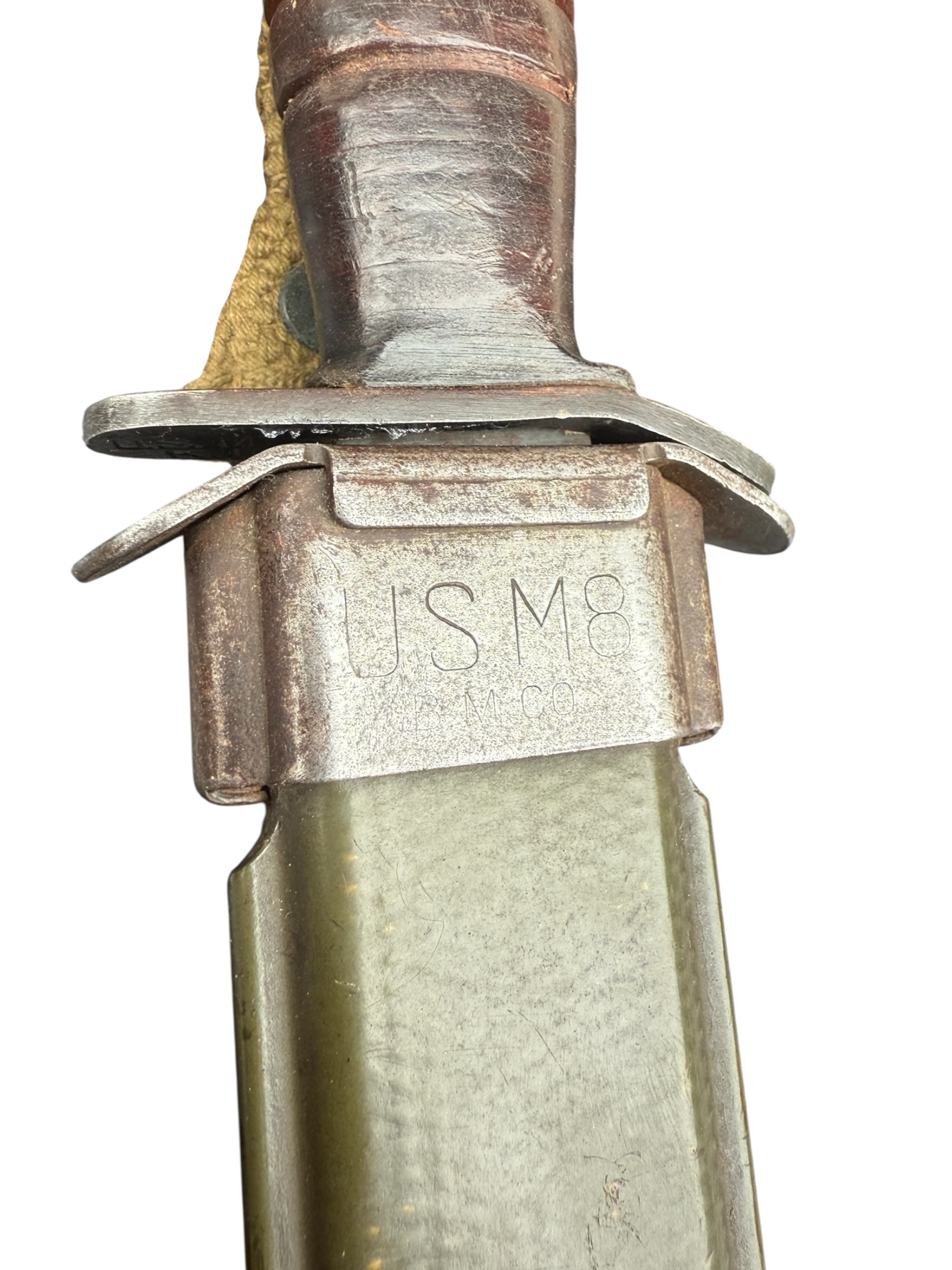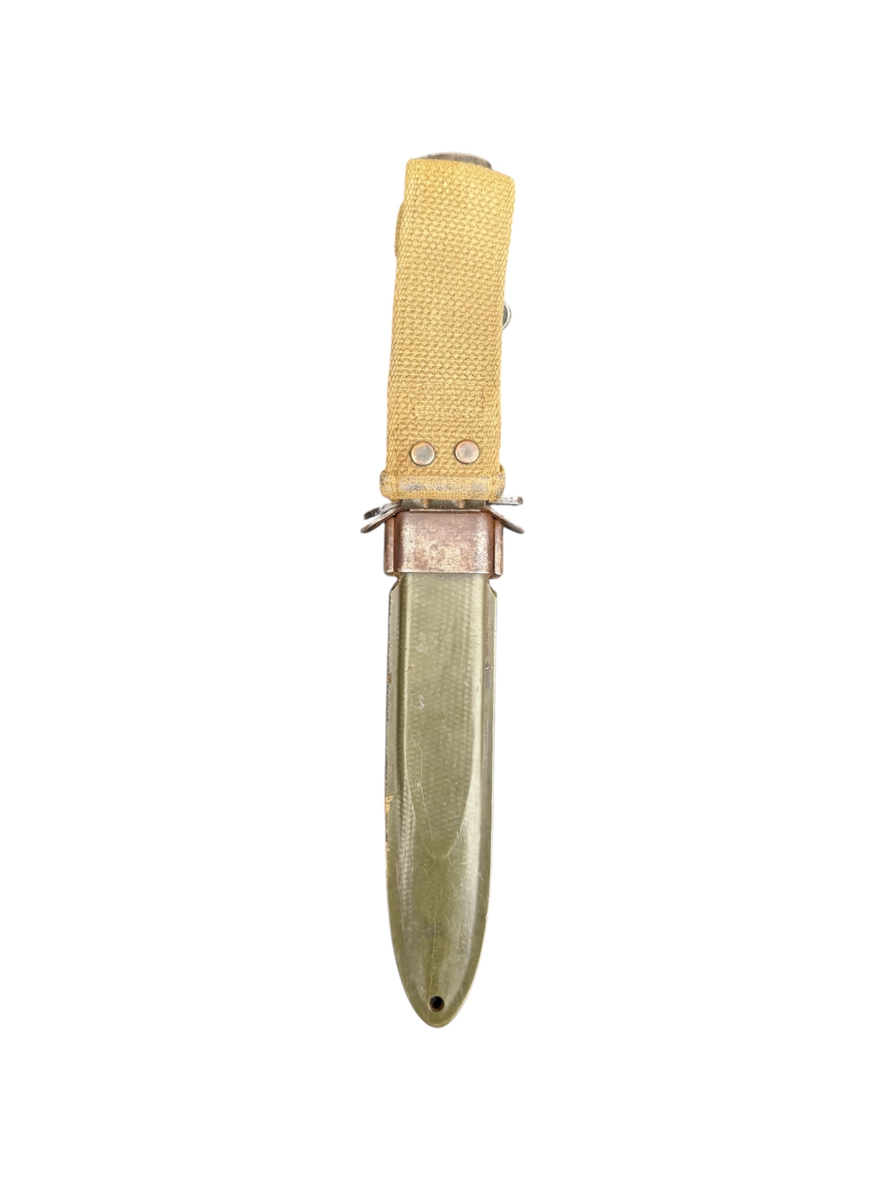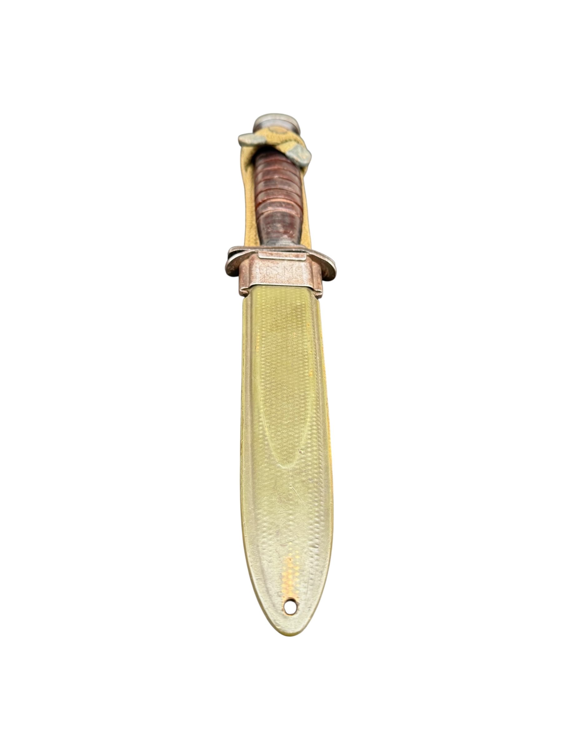 Amerikaans WO2 M3 gevechtsmes gemaakt door de zeldzamere producent Kinfolks. Het betreft het 3e model in nette staat. De Flaming Ball op de greep is nog duidelijk zichtbaar en alle andere markeringen zijn ook eenvoudig terug te vinden. In verband met de huisregels is het helaas niet toegestaan om items als deze te af te rekenen met Paypal. Geen verkoop onder de 18 jaar.