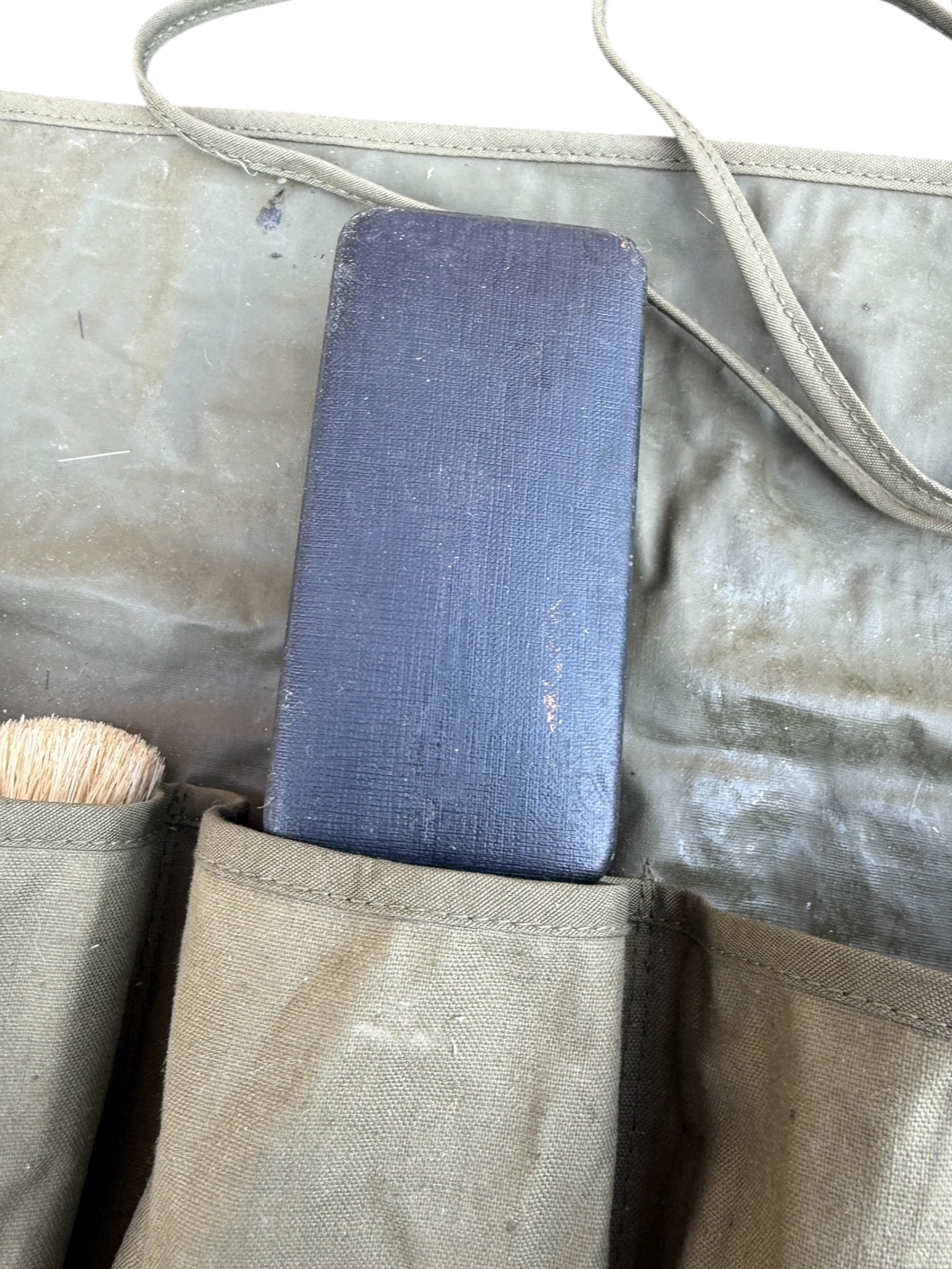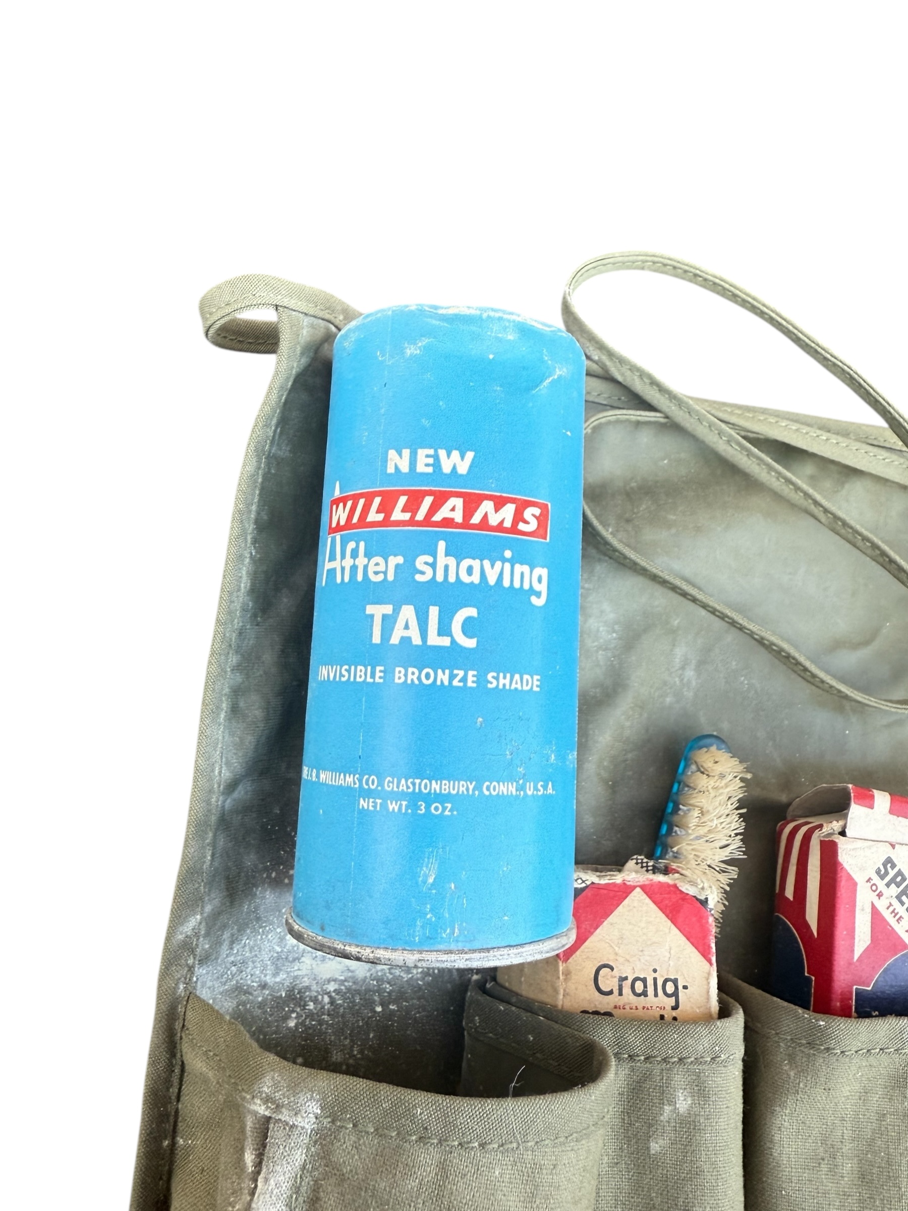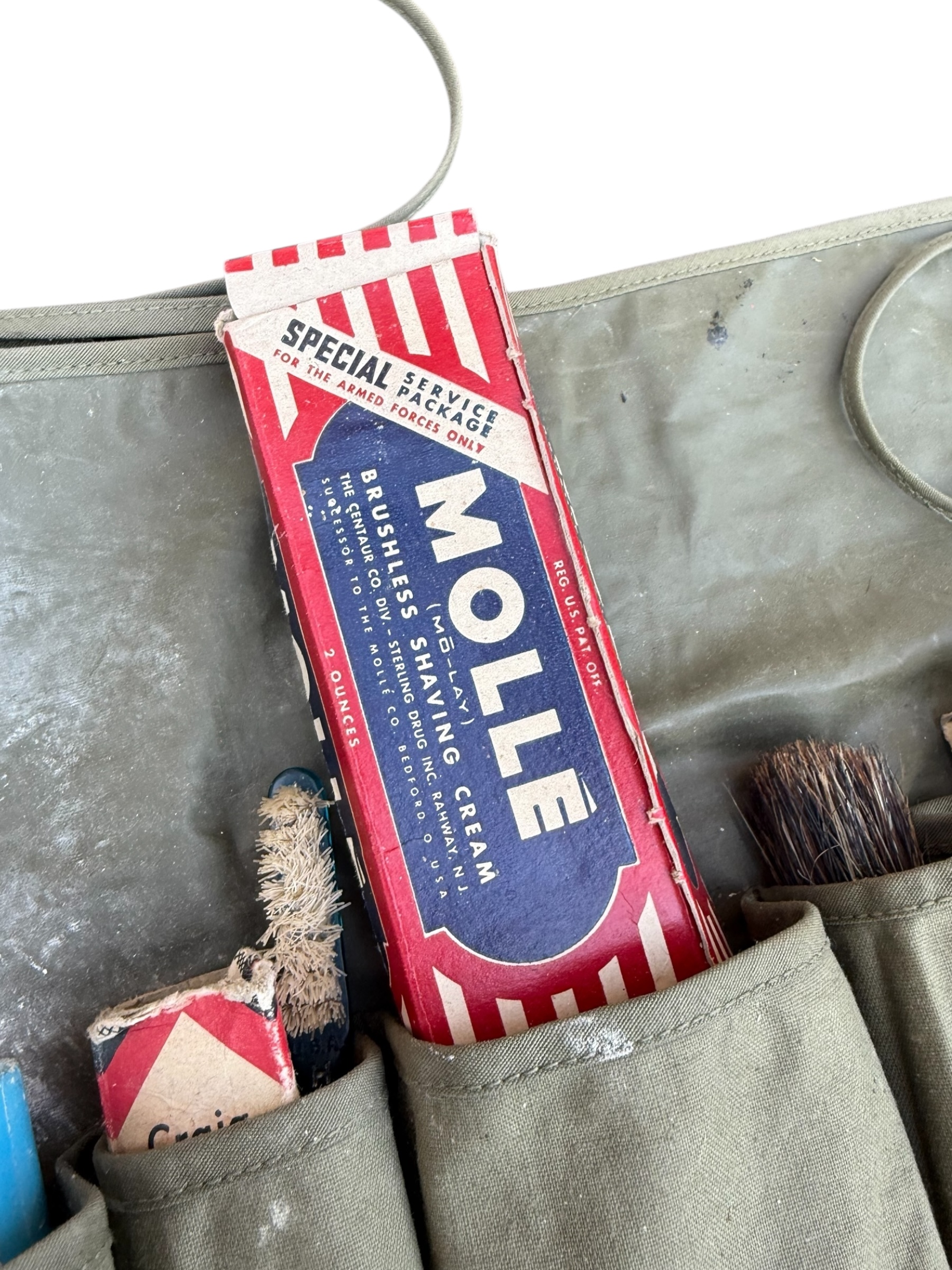 Amerikaanse WO2 Wash Roll in nette staat. Vrijwel compleet en gevuld met diverse persoonlijke items. Alles wat op de foto’s zichtbaar is, betreft de originele inhoud.