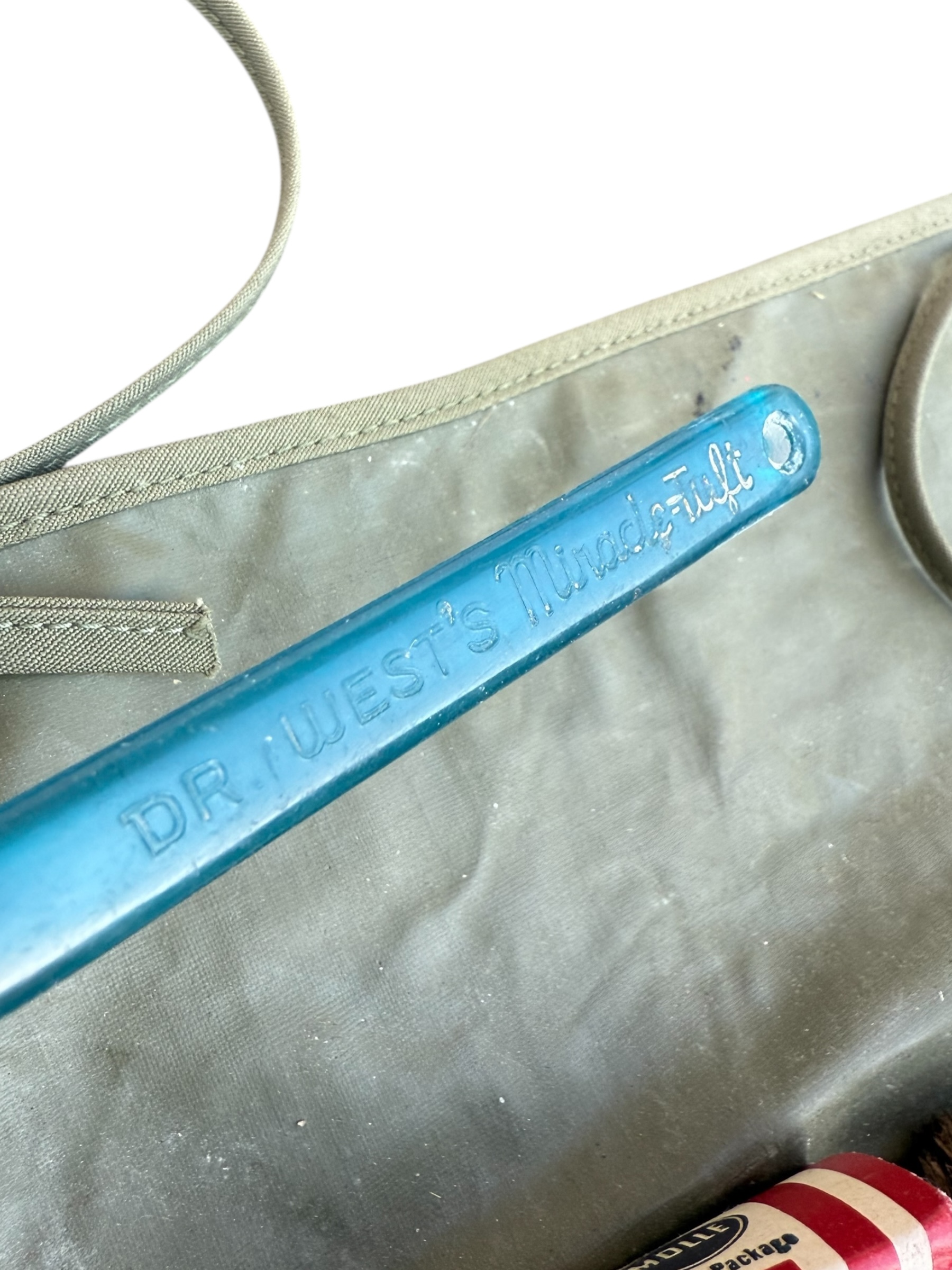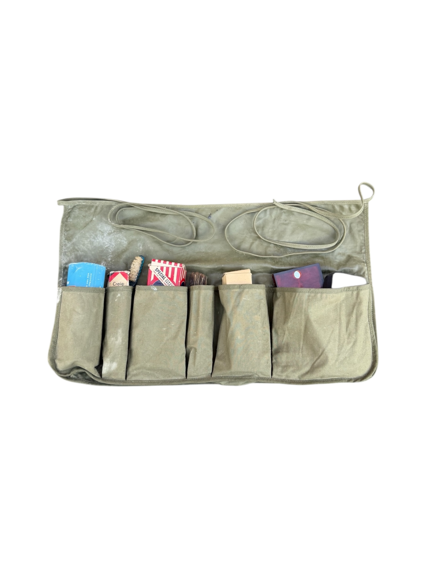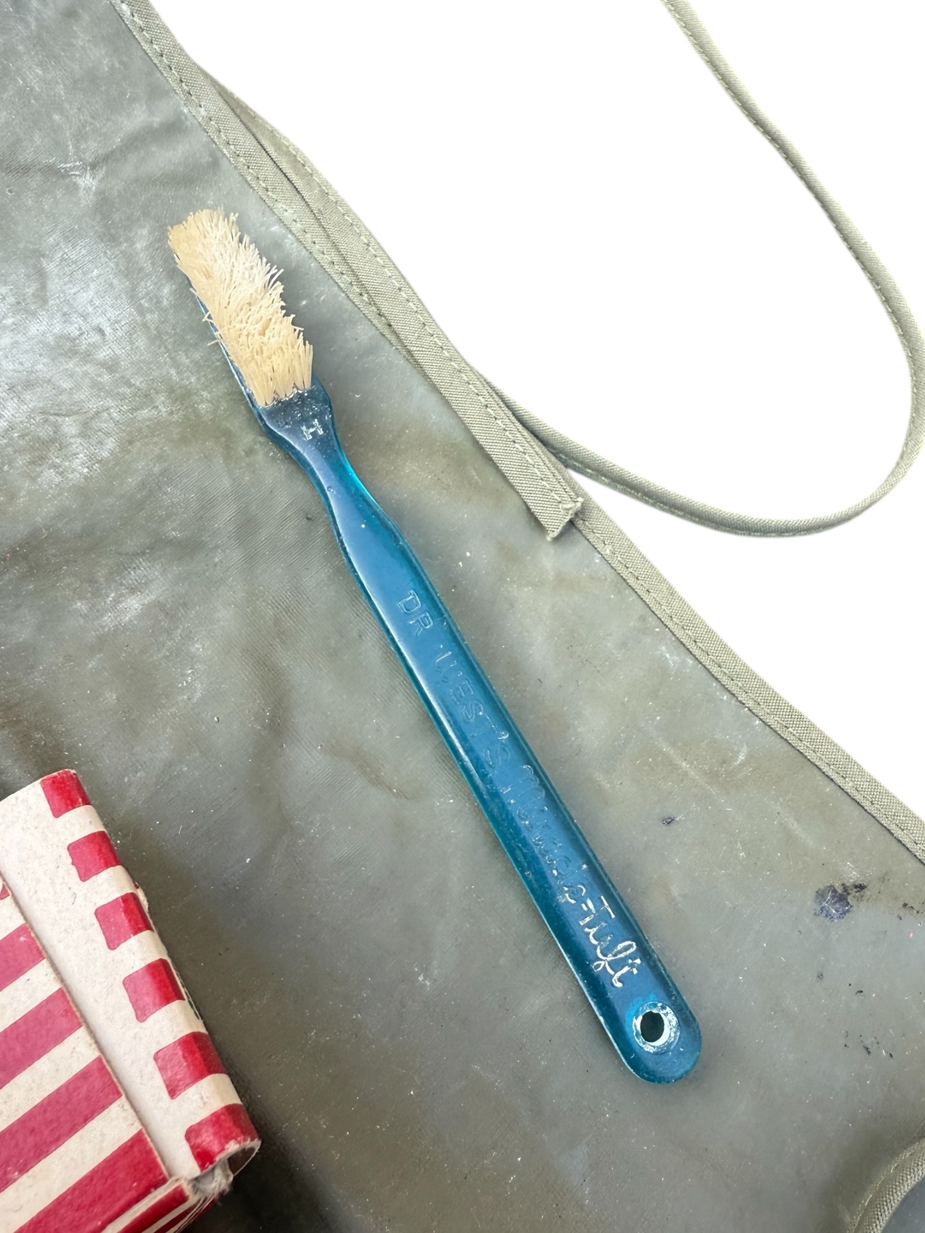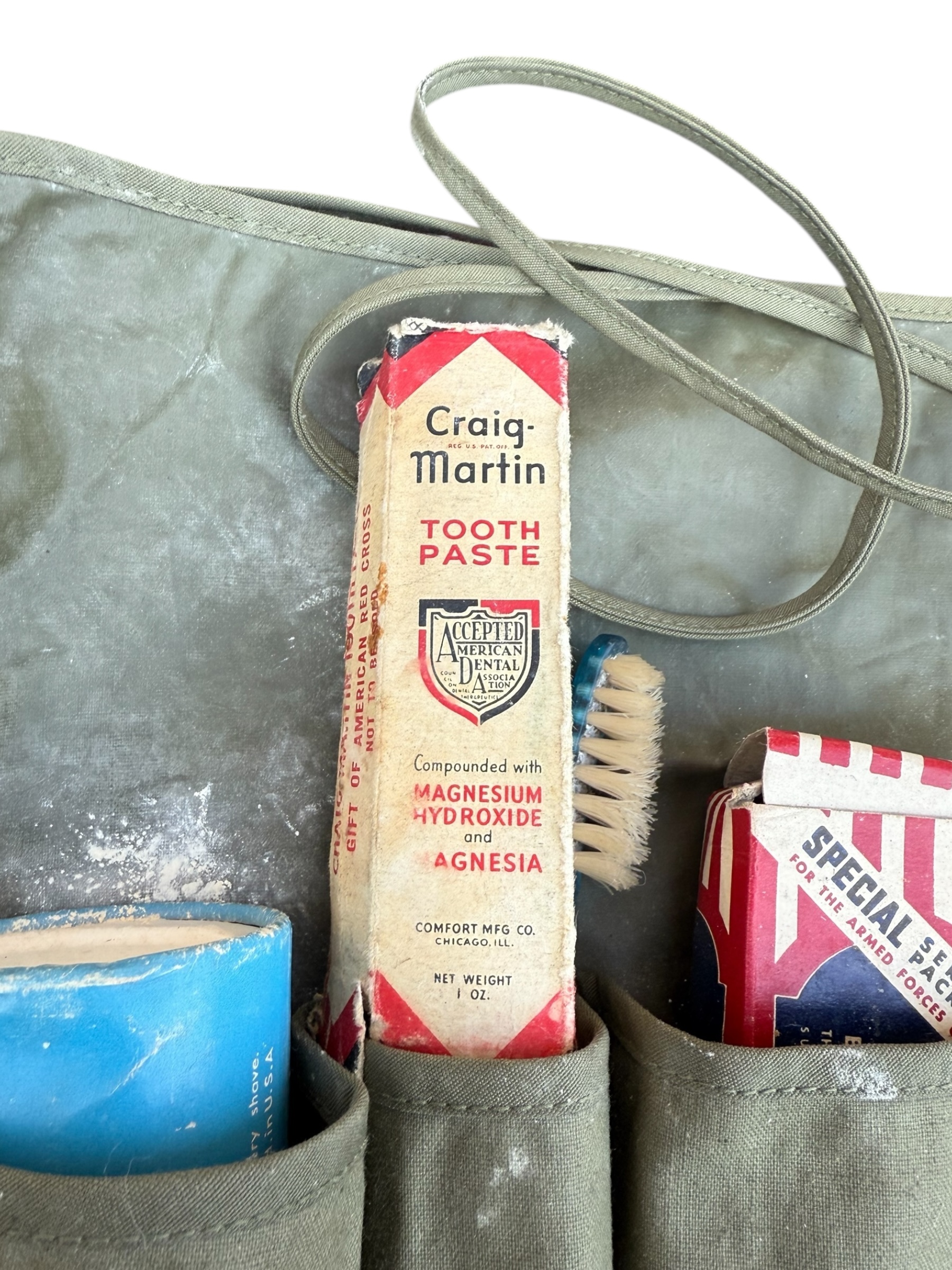 Amerikaanse WO2 Wash Roll in nette staat. Vrijwel compleet en gevuld met diverse persoonlijke items. Alles wat op de foto’s zichtbaar is, betreft de originele inhoud.