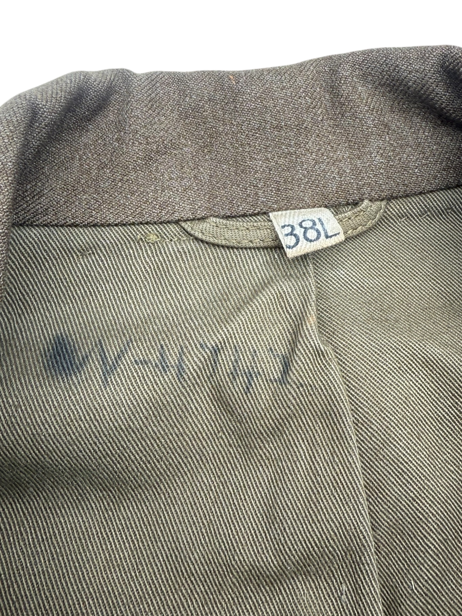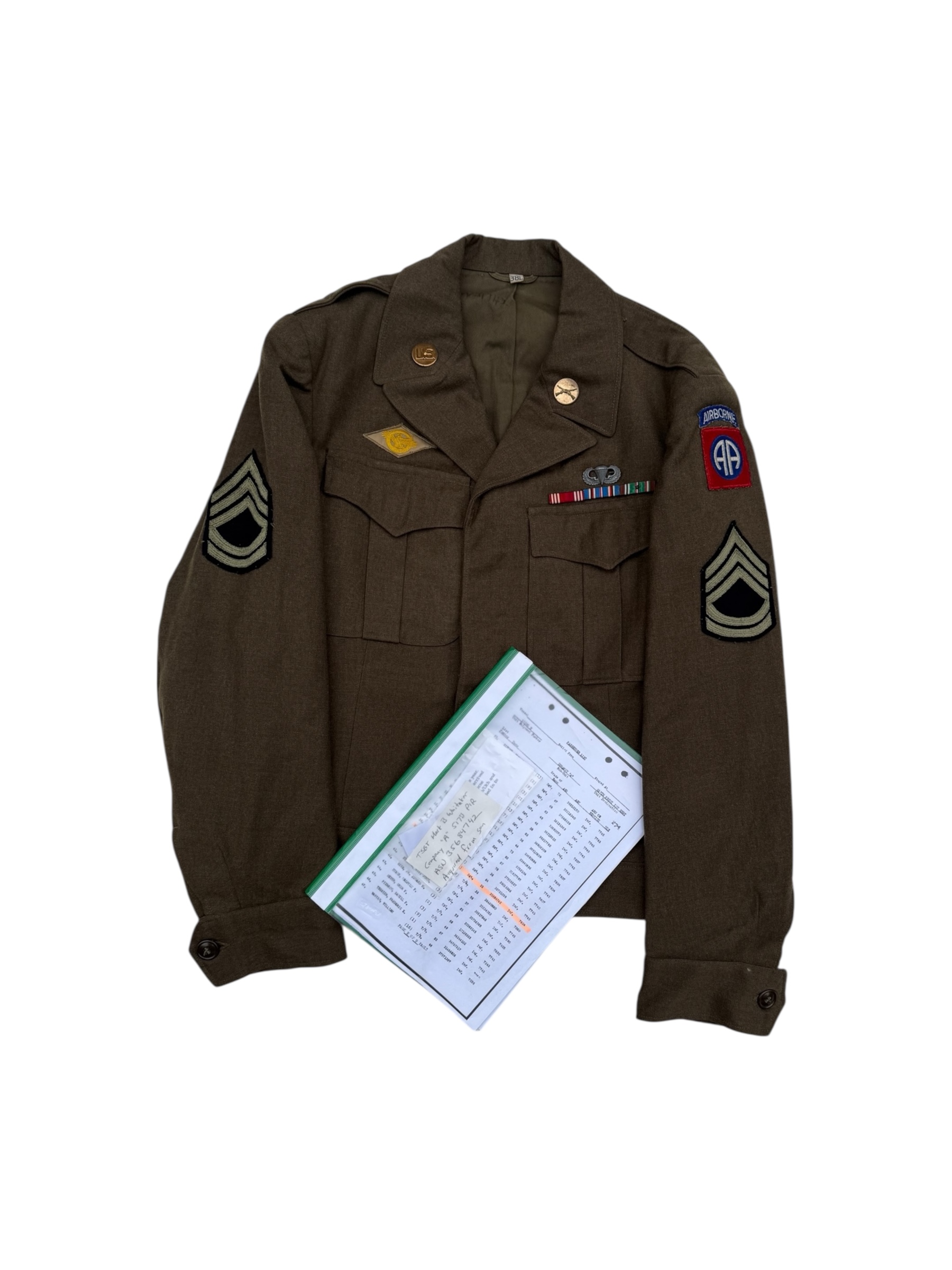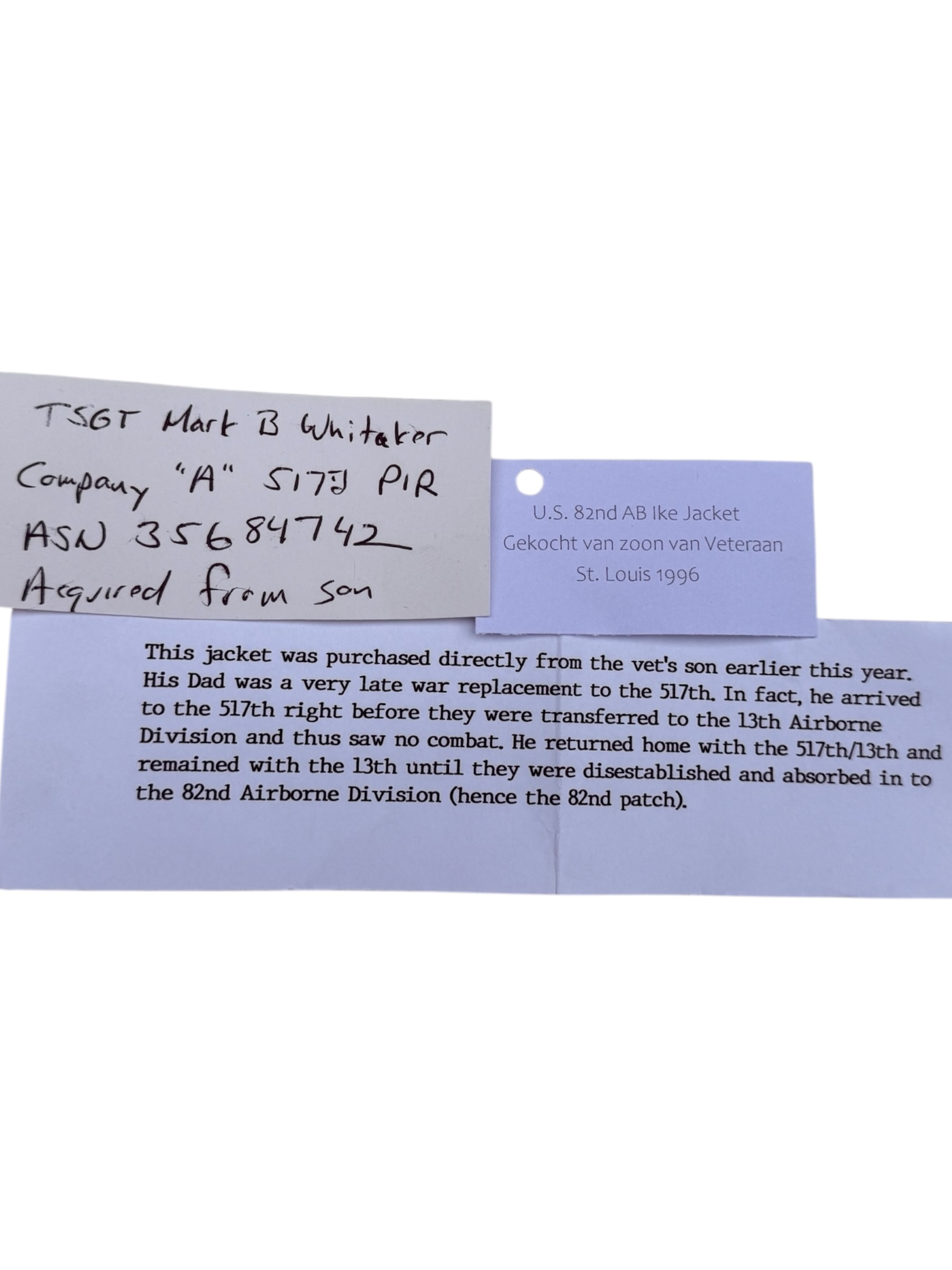 Amerikaanse WO2 82nd Airborne Division O.D. field jacket op naam van Mark B. Whitaker. Het betreft een ideale maat 38L in nette staat. De jas is voorzien van een Airborne Jump Wing en een ribbon bar met campaign star. In de nek is tevens zijn laundry mark “W-4742” terug te vinden, wat overeenkomt met alle informatie die bij de set zit. Er zit bovendien een notitie bij met de volgende tekst: