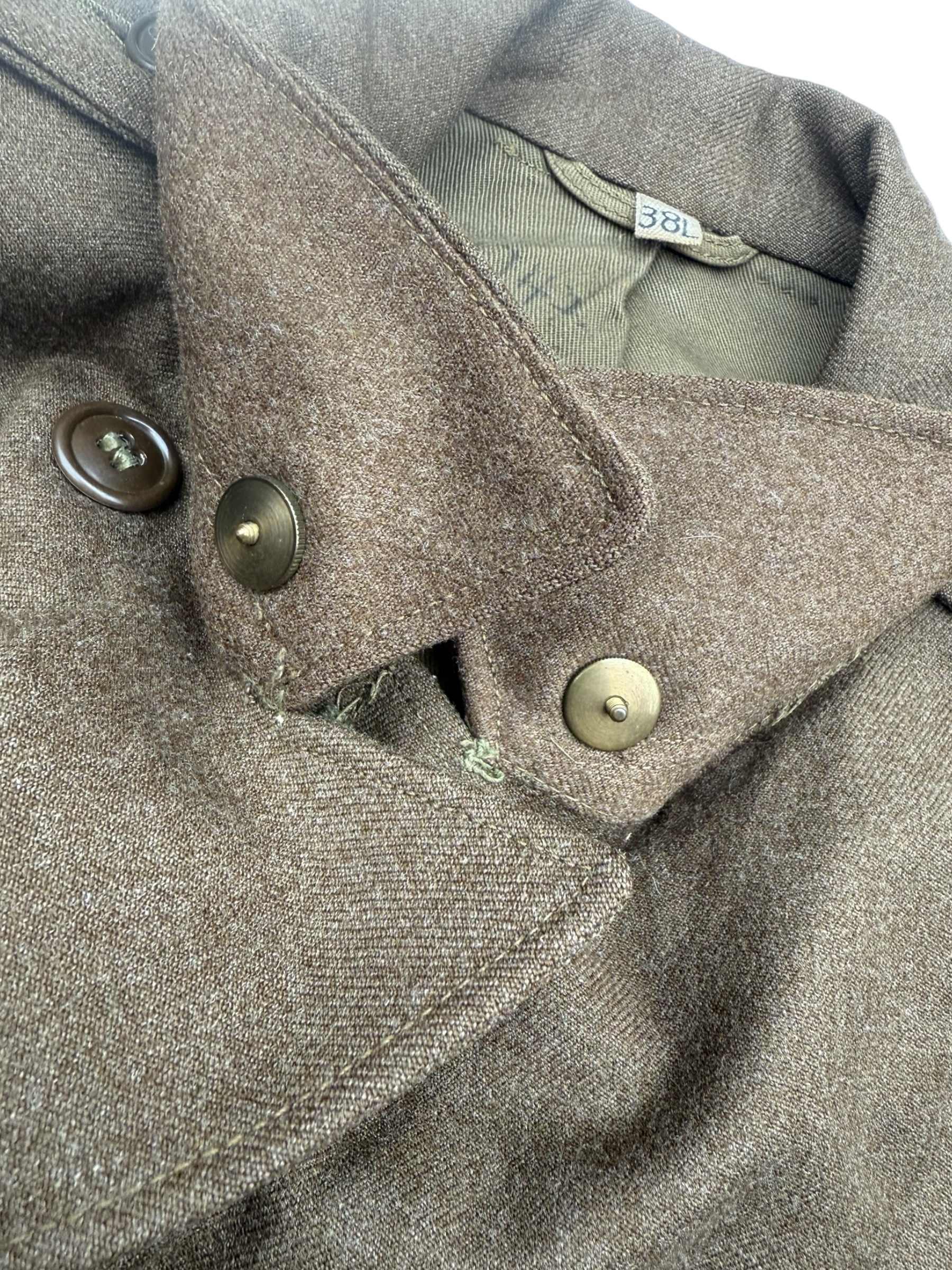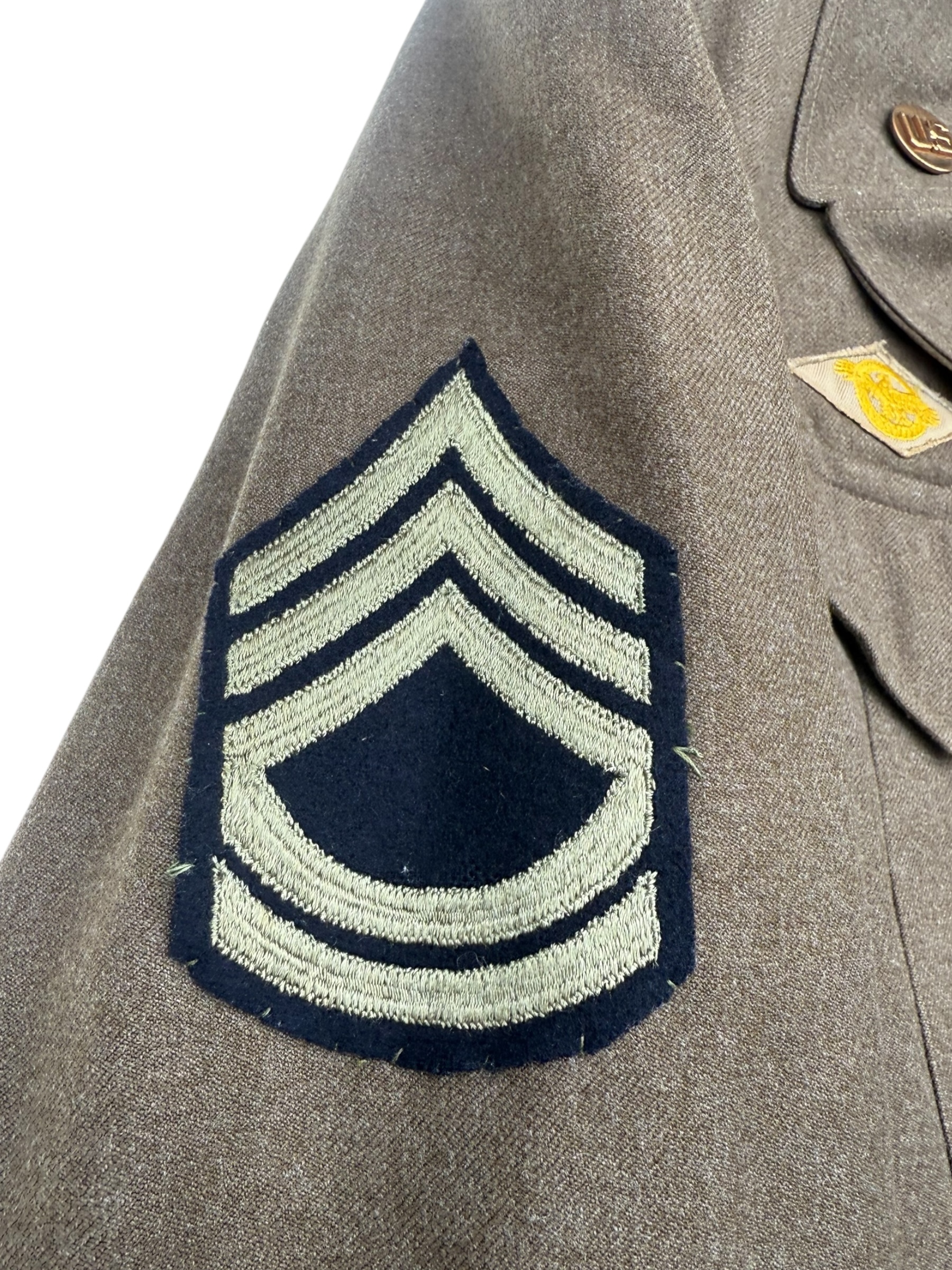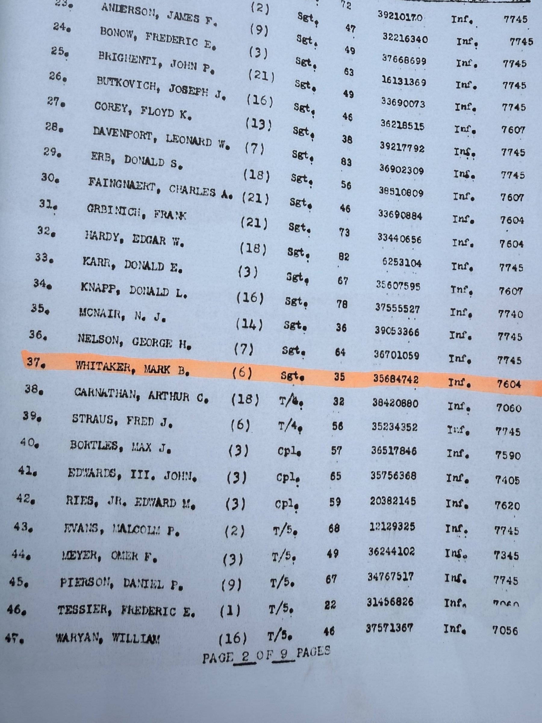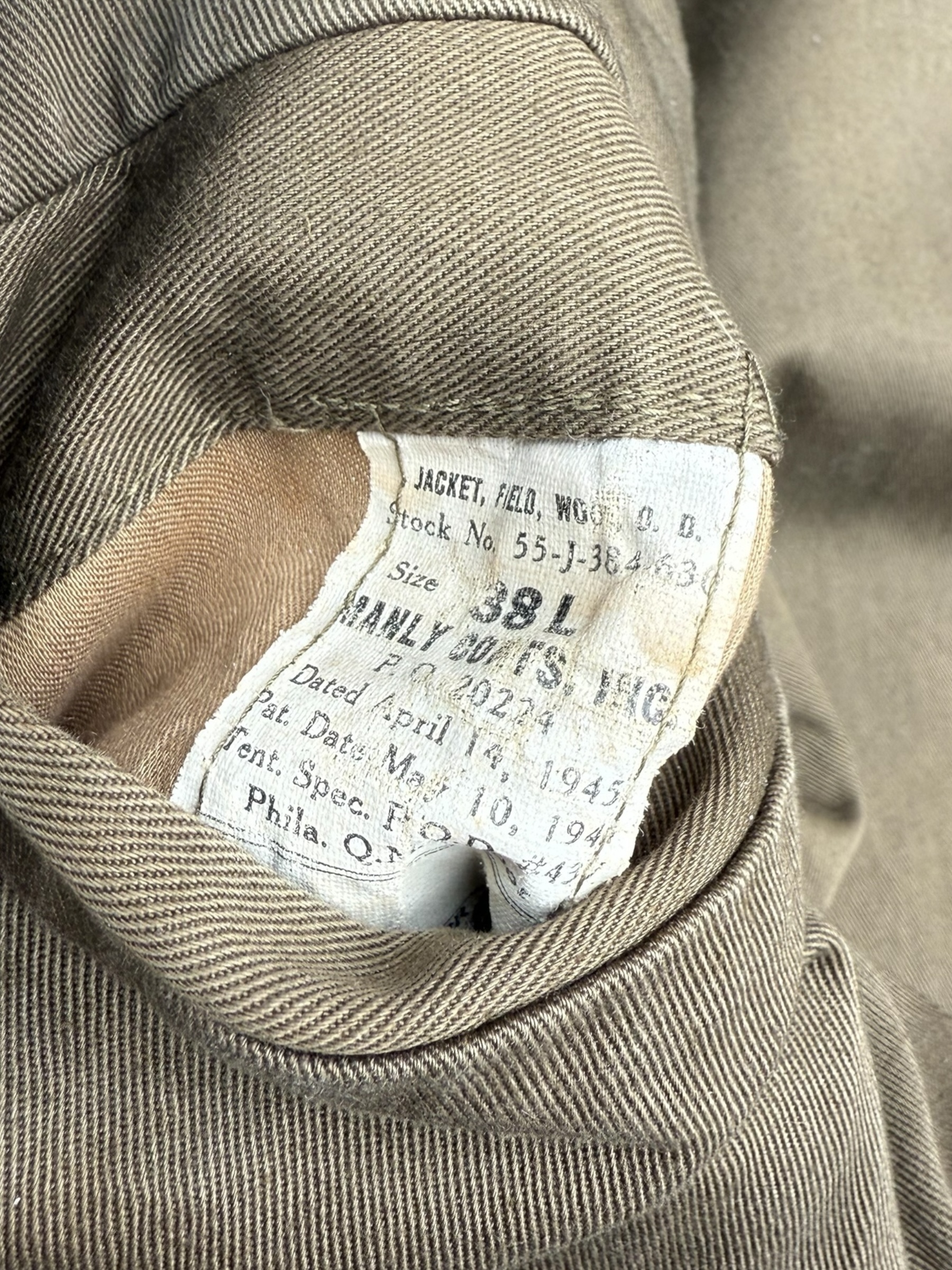 Amerikaanse WO2 82nd Airborne Division O.D. field jacket op naam van Mark B. Whitaker. Het betreft een ideale maat 38L in nette staat. De jas is voorzien van een Airborne Jump Wing en een ribbon bar met campaign star. In de nek is tevens zijn laundry mark “W-4742” terug te vinden, wat overeenkomt met alle informatie die bij de set zit. Er zit bovendien een notitie bij met de volgende tekst: