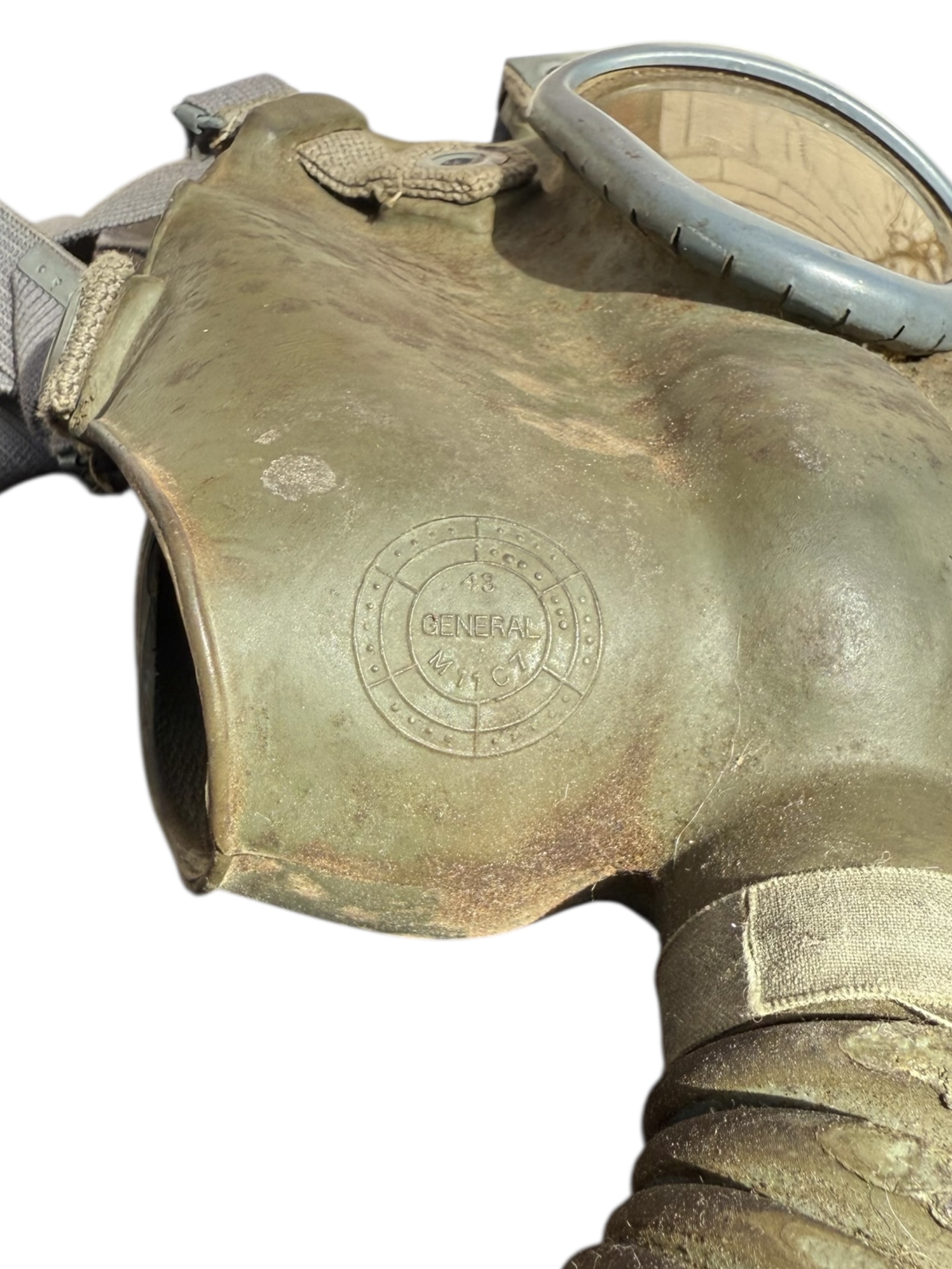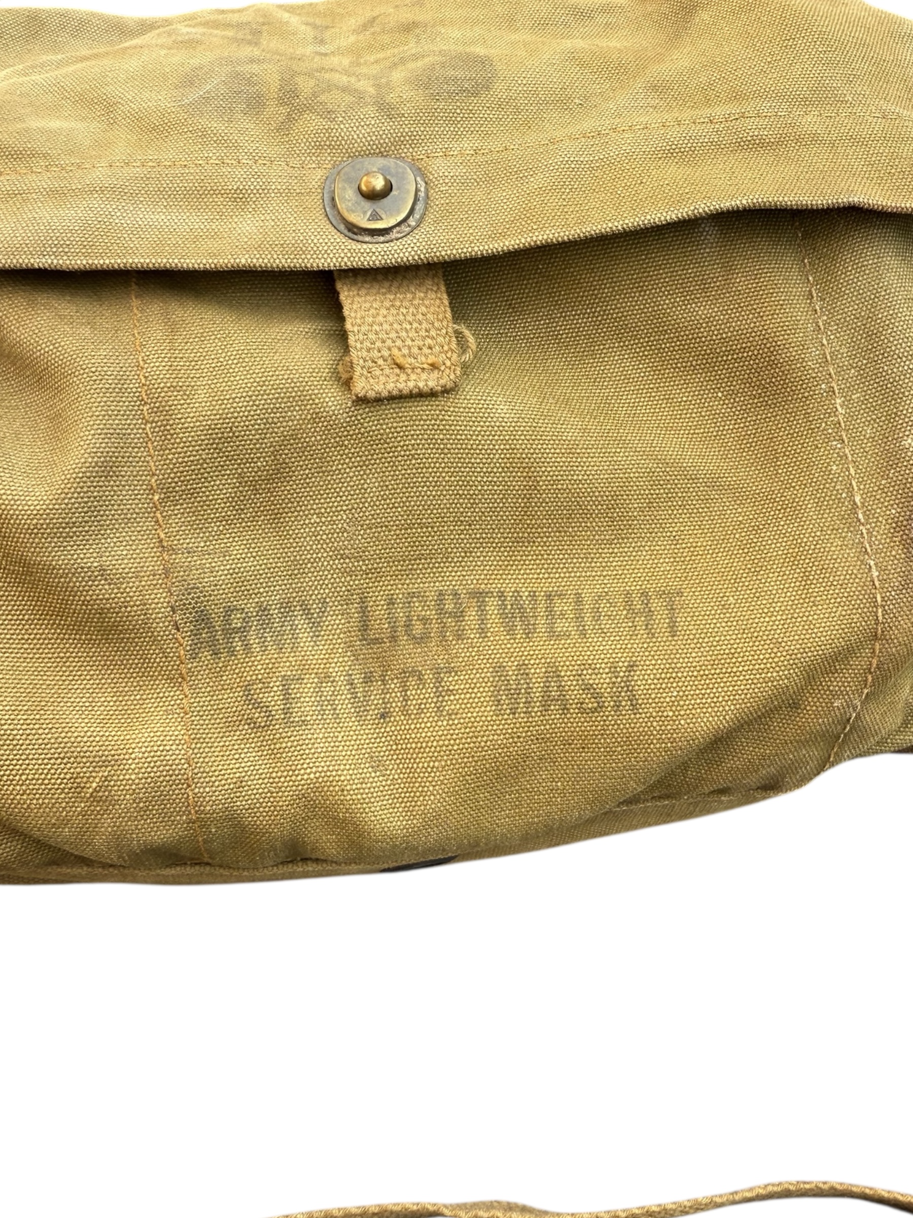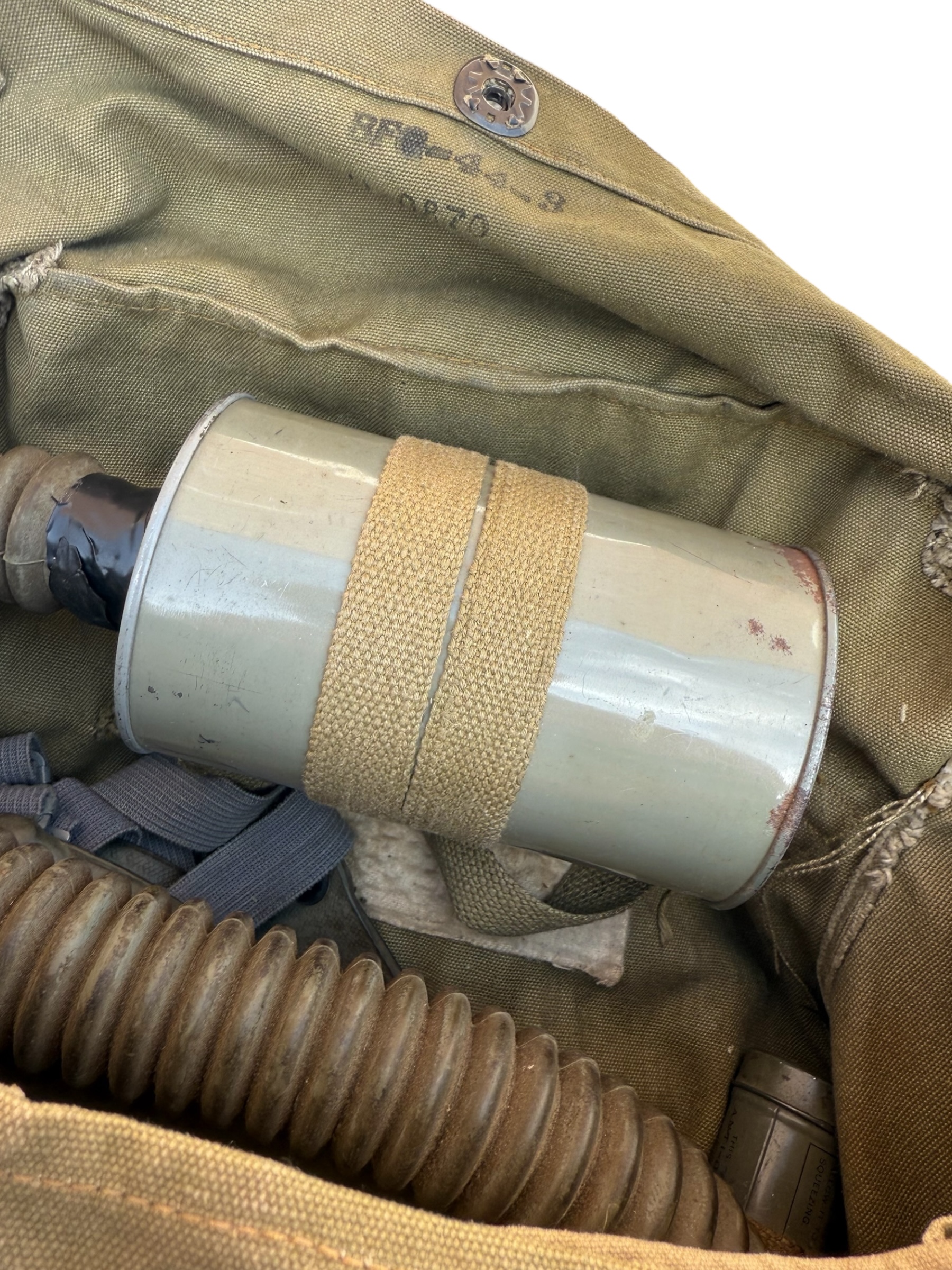 Amerikaans WO2 Lightweight gasmasker met tas en toebehoren. Alle onderdelen zijn periodiek gedateerd en verkeren in goede gebruikte staat. Het M4-ointmentdoosje en de Anti-Dim worden bij de aankoop meegeleverd.