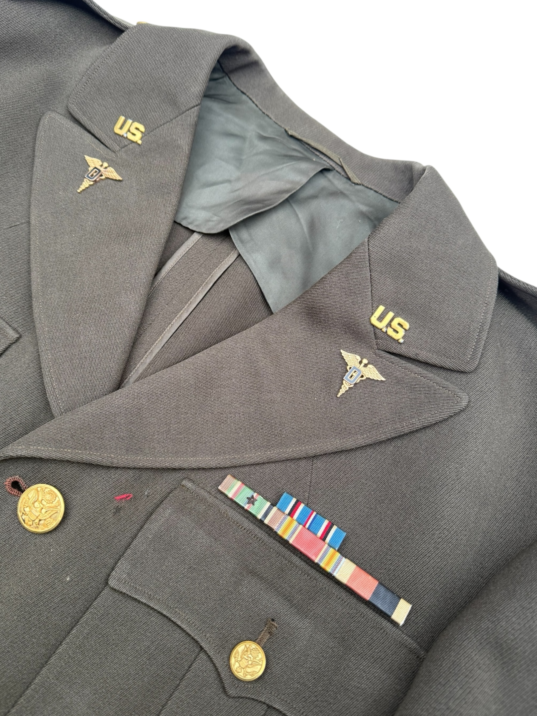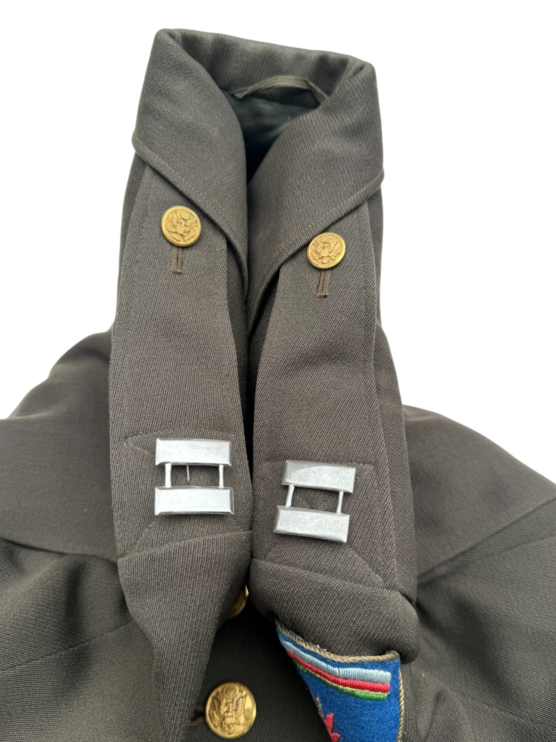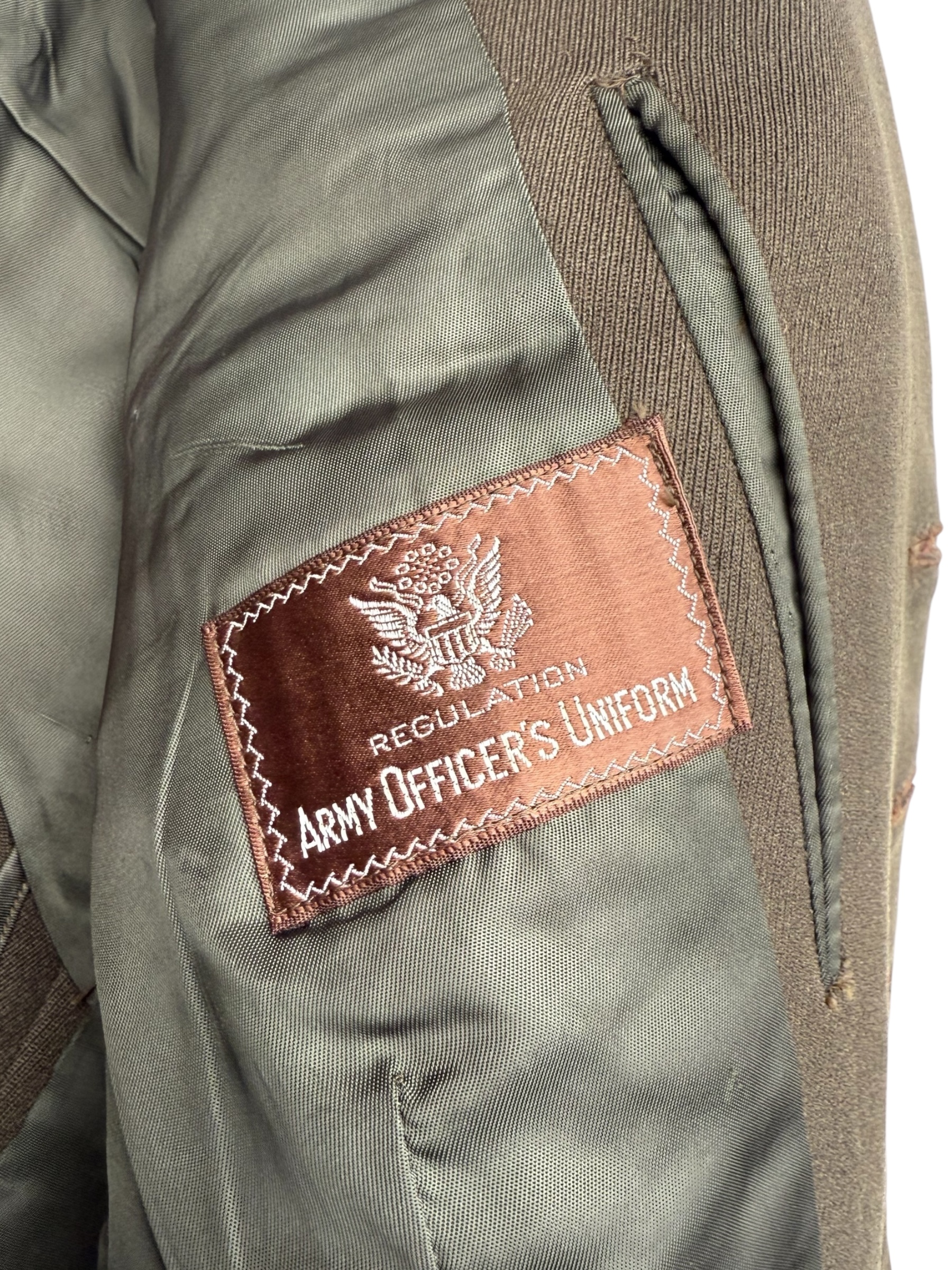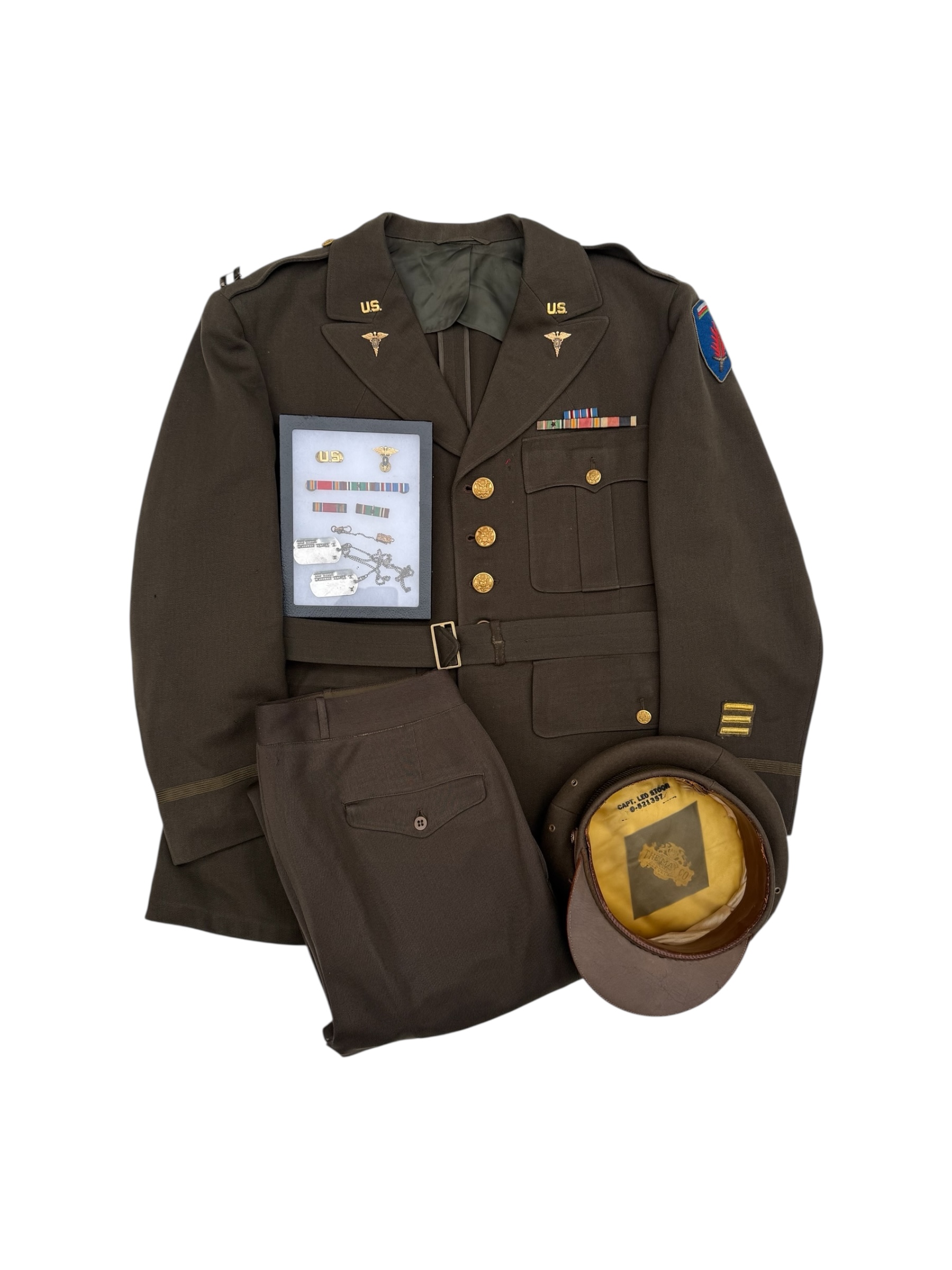 Amerikaanse WO2 set van Captain Leo Stoor. Stoor maakte deel uit van de Occupation Force Berlin van het Amerikaanse leger. De broek en de jas zijn beide door dezelfde producent vervaardigd en bovendien matching 1942 gedateerd. Alle labels zijn aanwezig en nog duidelijk leesbaar. De pet is gemarkeerd met zijn persoonlijke gegevens, wat overeenkomt met alle overige details. Daarnaast wordt de set geleverd met diverse persoonlijke bezittingen die het geheel nog completer maken.