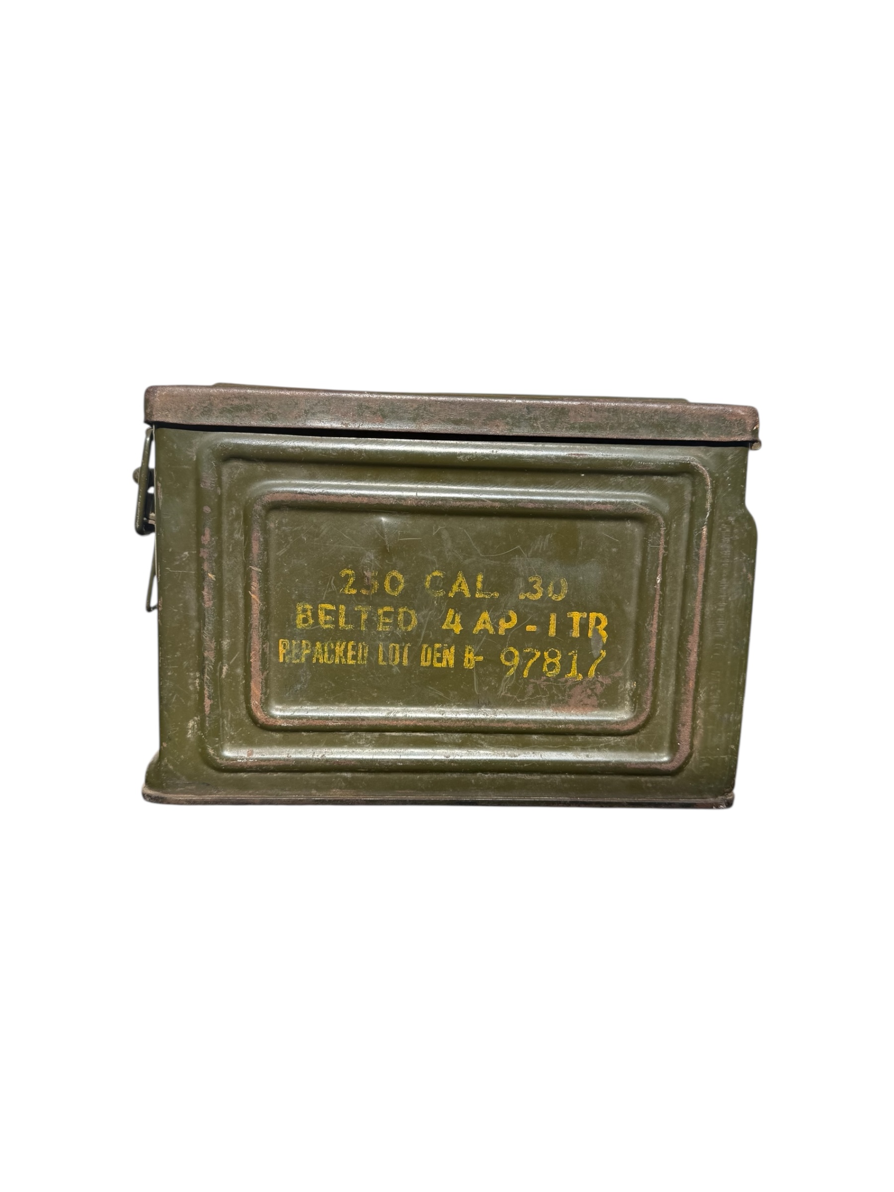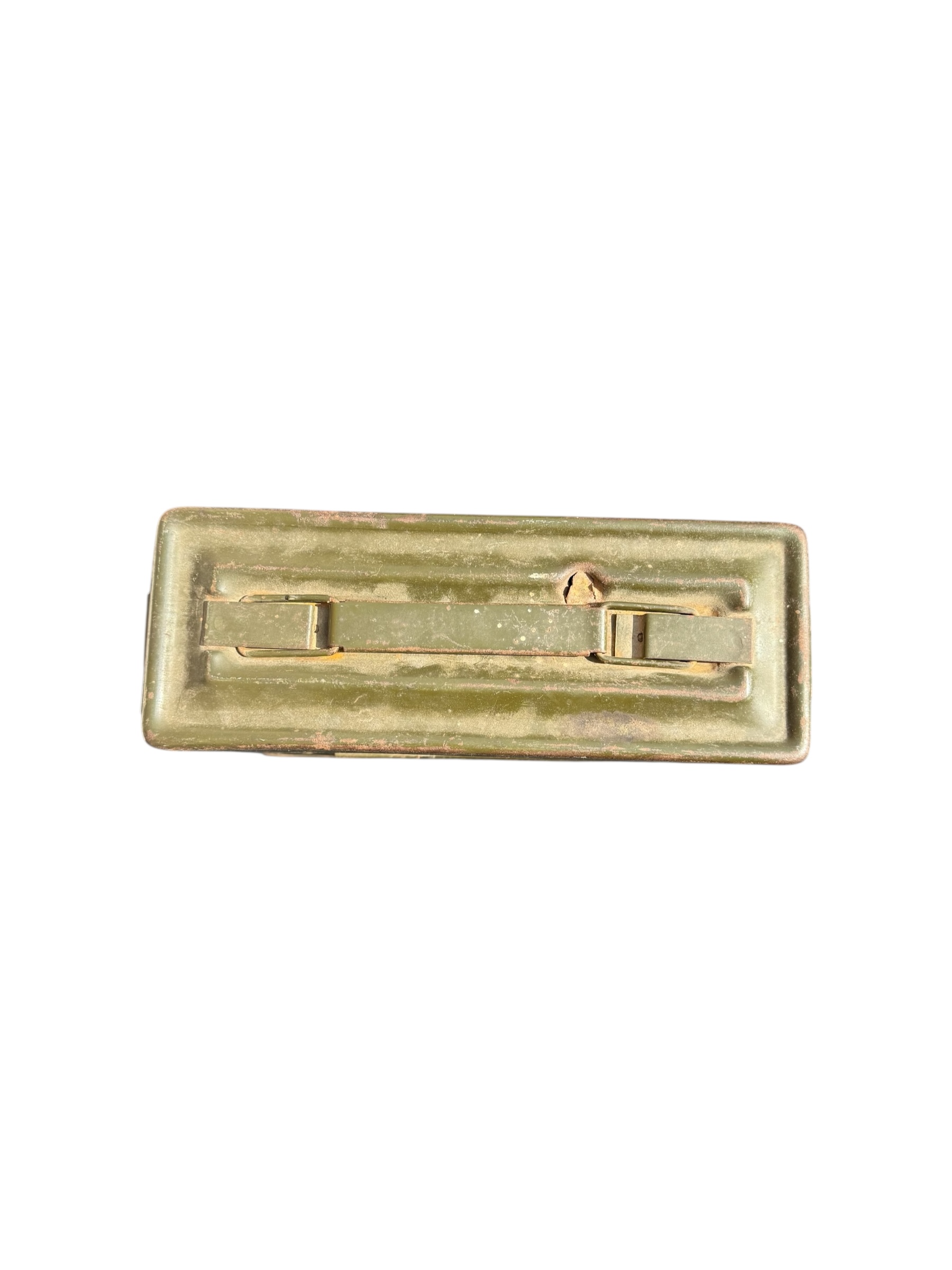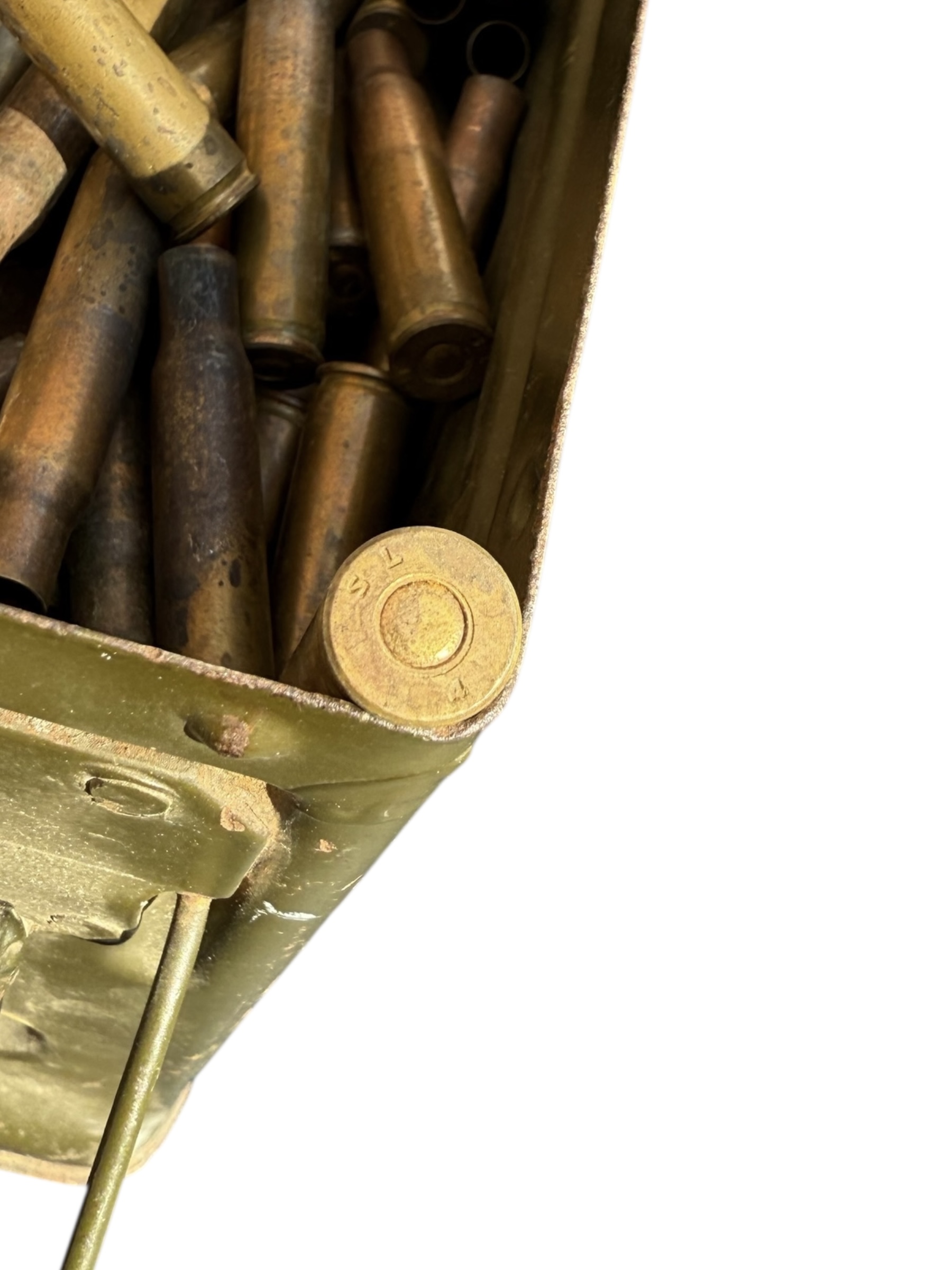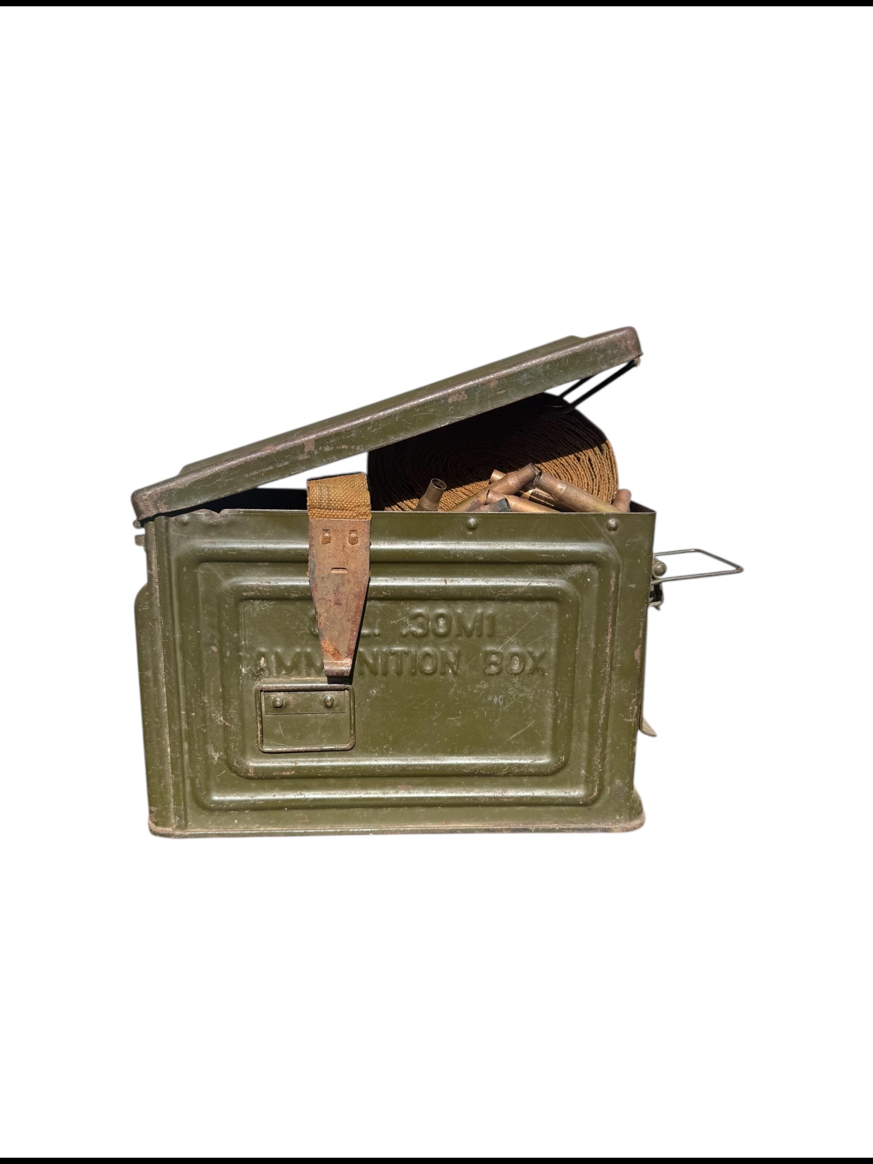 Amerikaanse WO2 .30 munitiekist in goede staat. Dit exemplaar is compleet met 244 lege patronen uit 1944 en de riem wordt bij de aankoop meegeleverd.