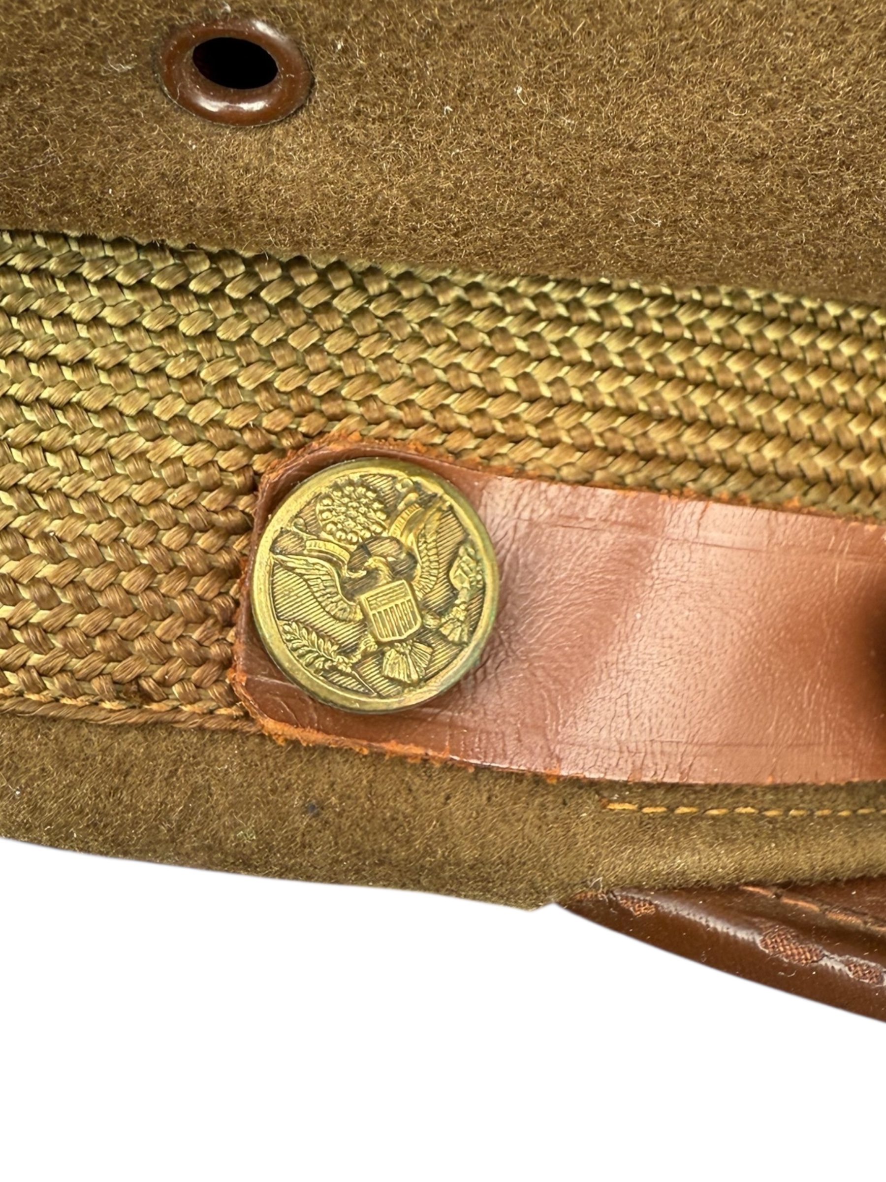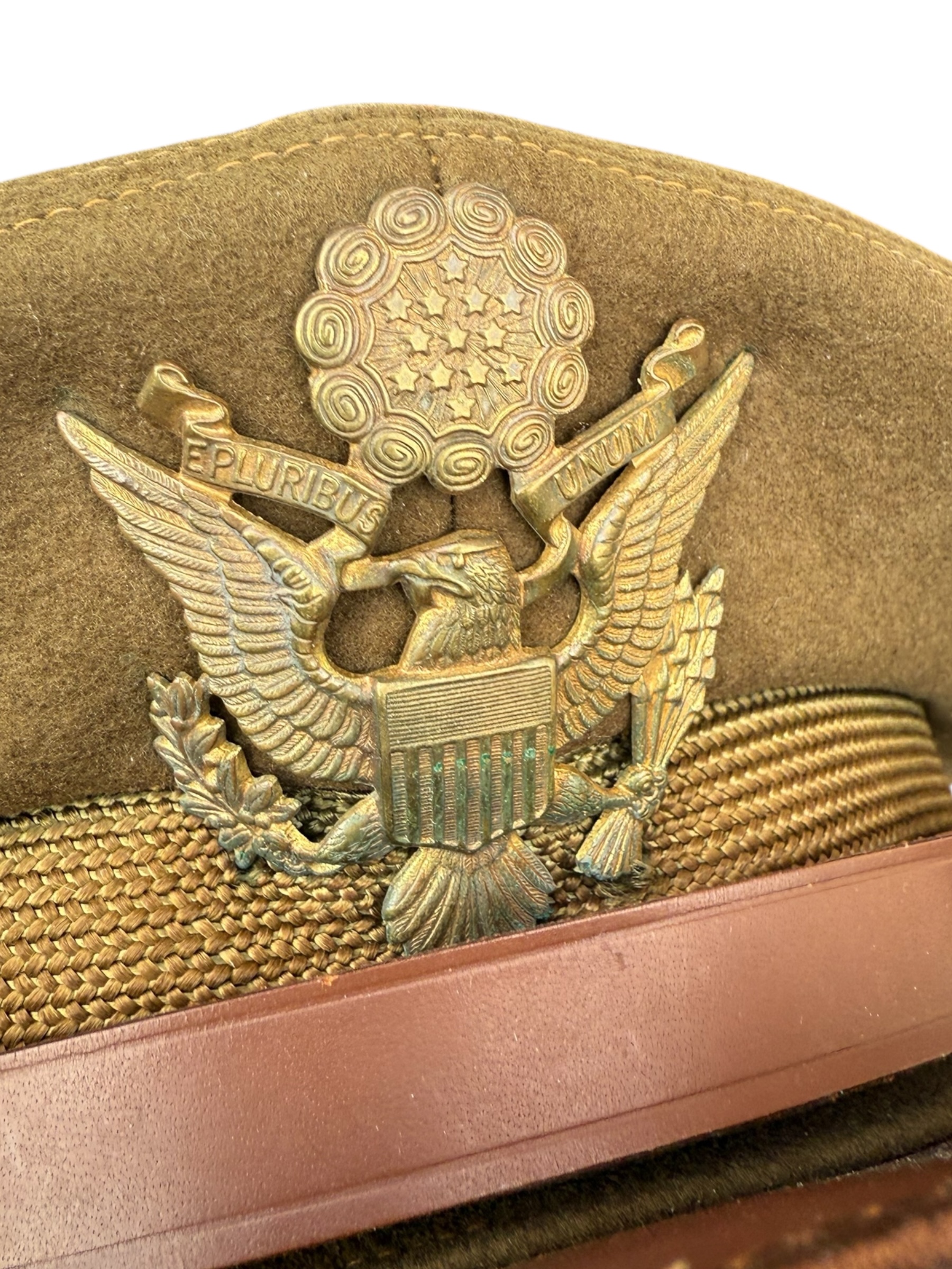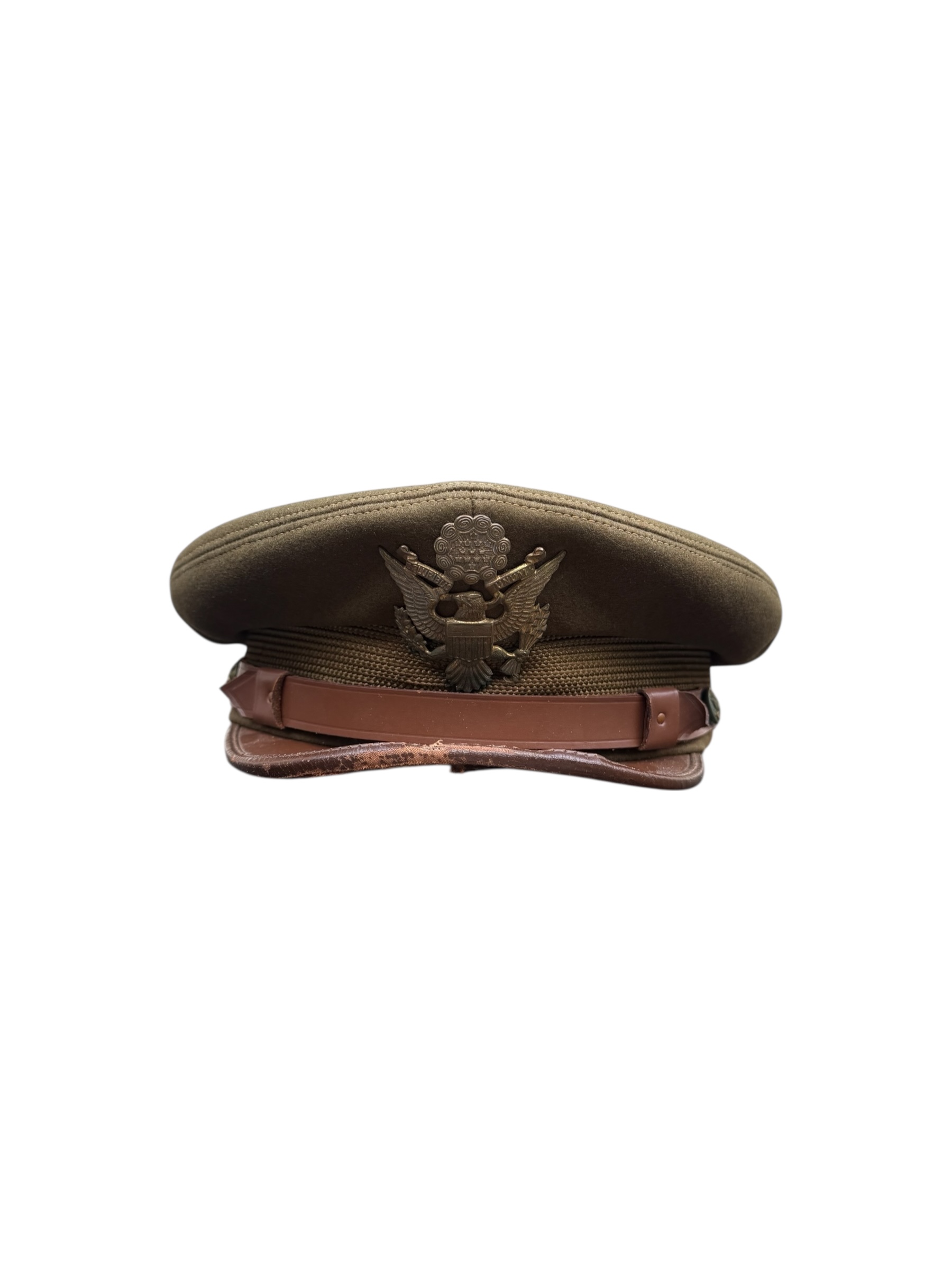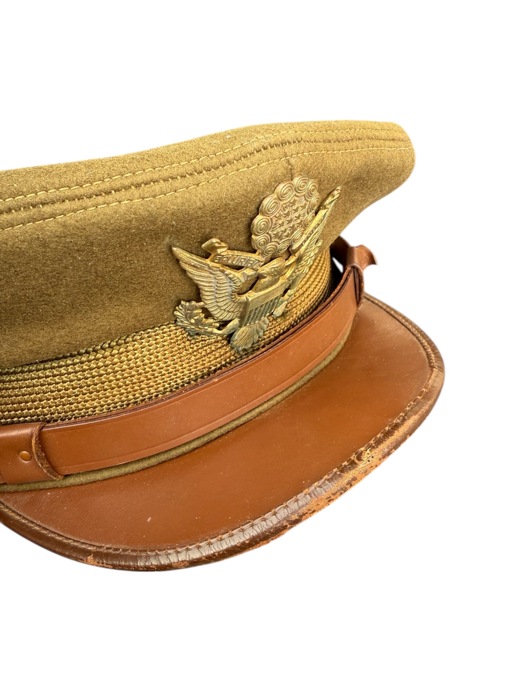 Amerikaanse WO2 officers cap in gedragen staat. Het betreft ongeveer maat 6 2/4 en de vorm is mooi bewaard gebleven. Het leer is nog soepel, maar het stiksel van de zweetband zit helaas los. Aan de buitenkant ziet de pet er overigens nog netjes uit.