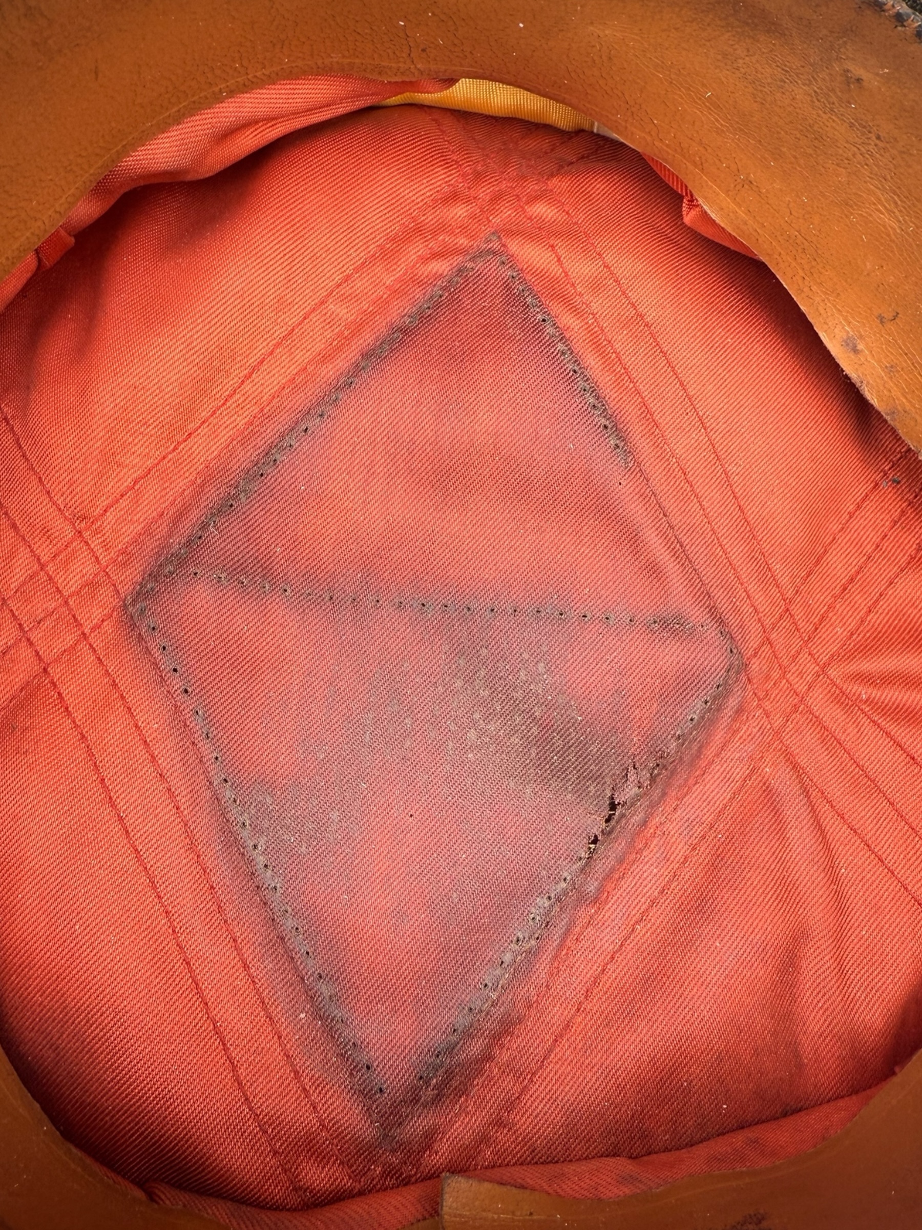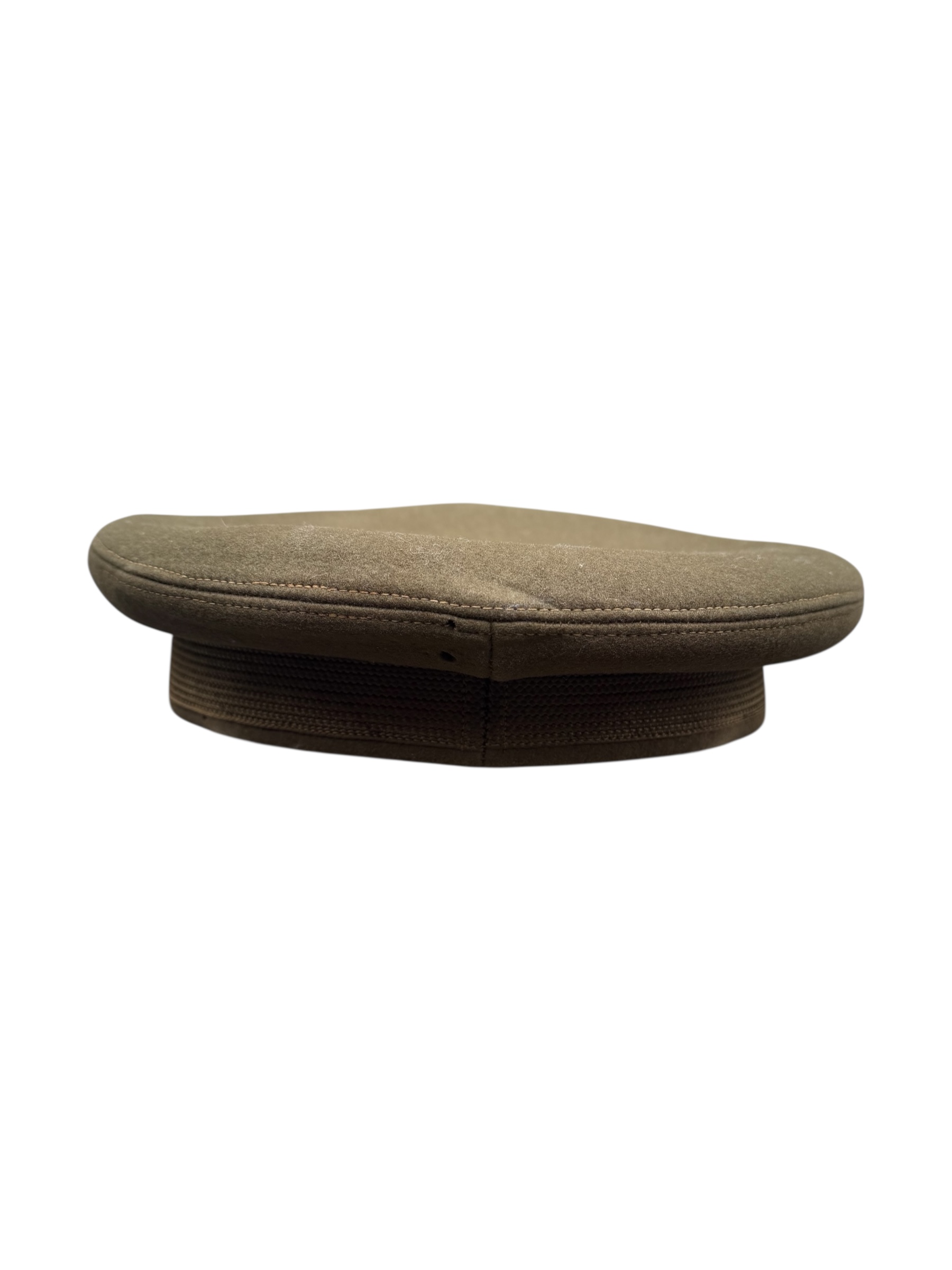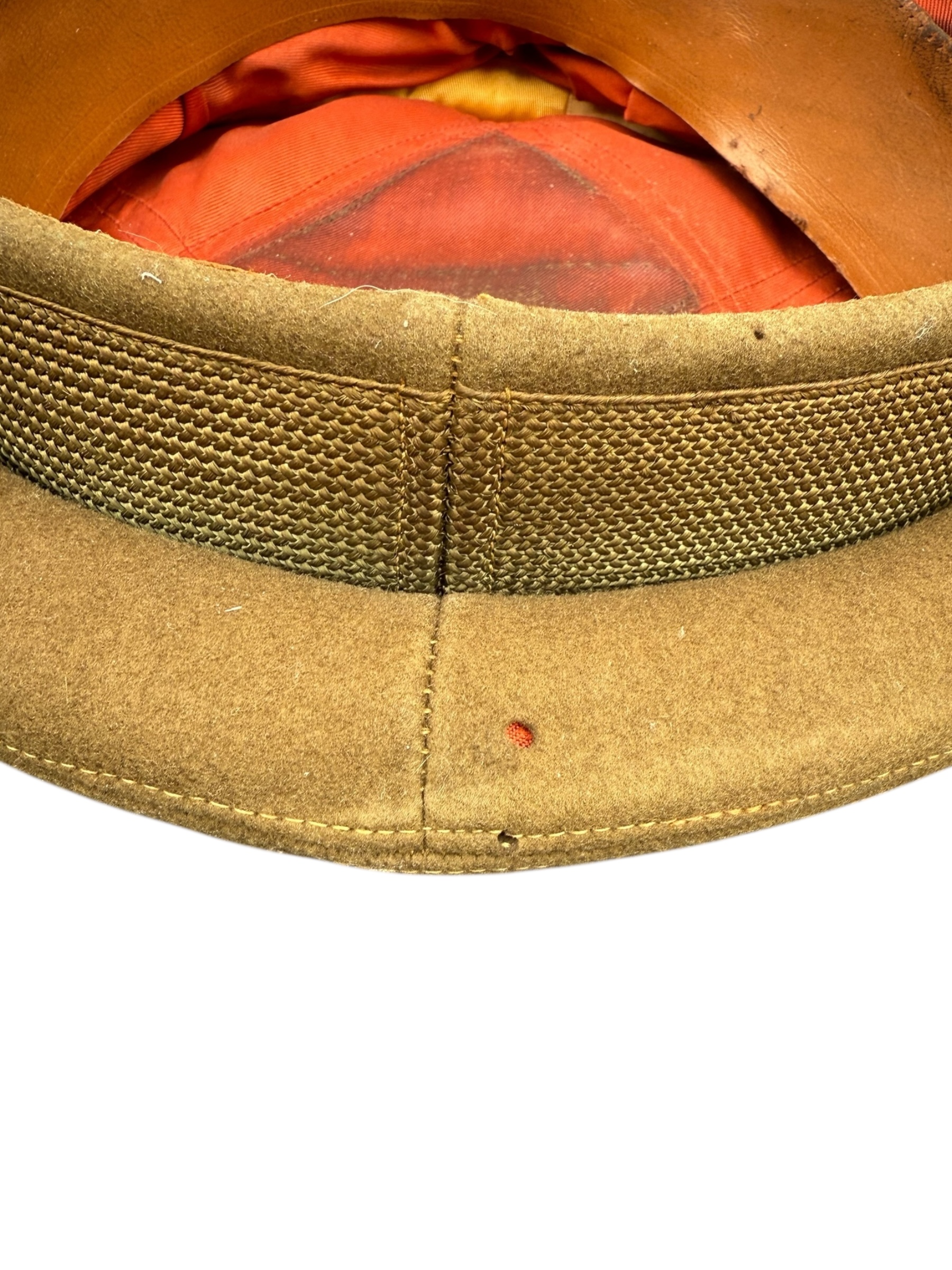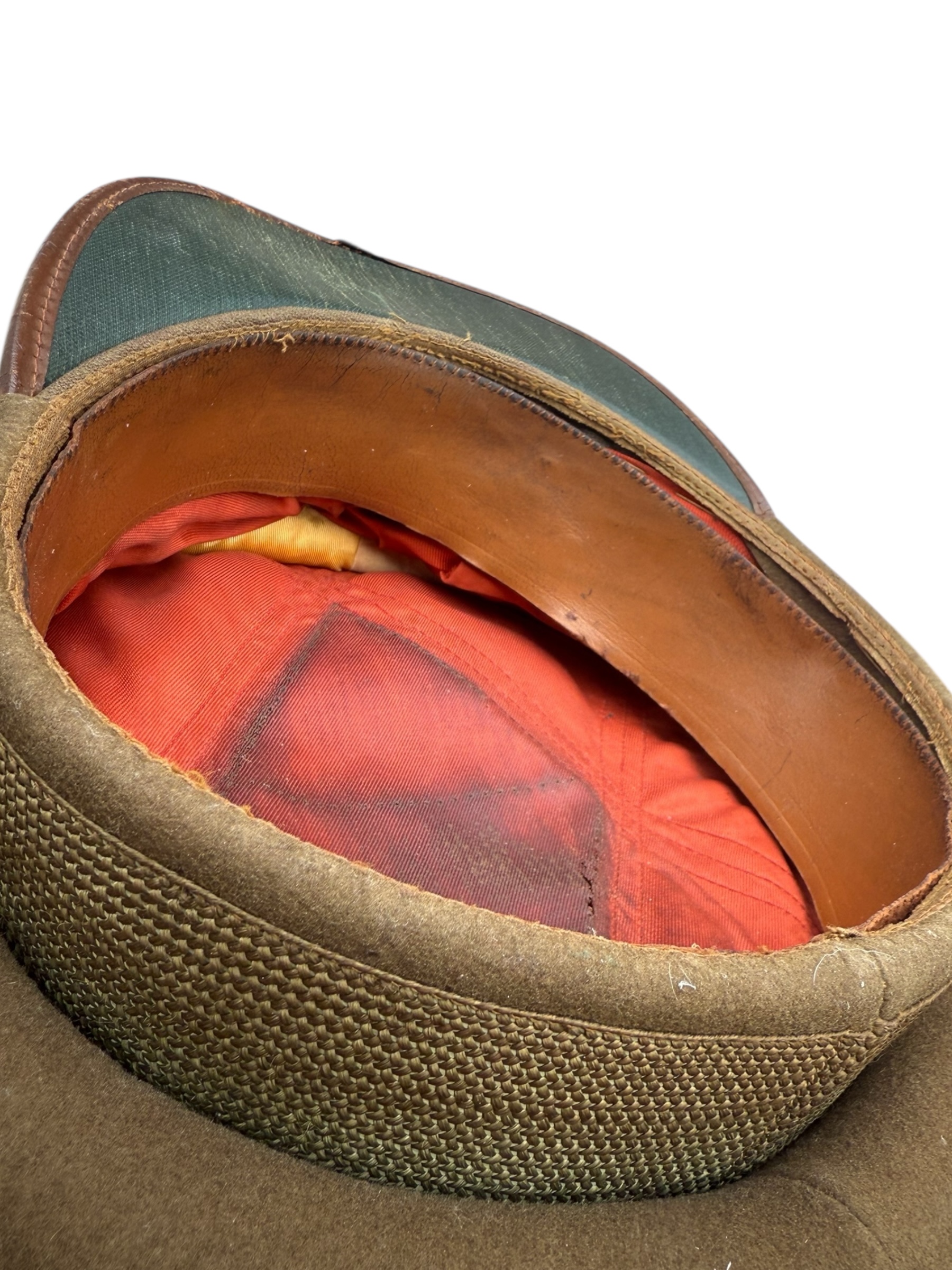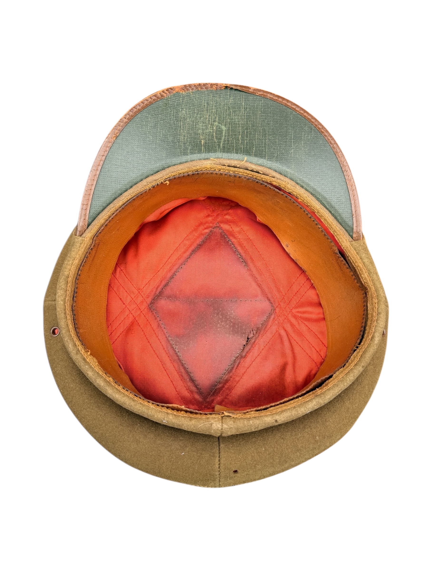 Amerikaanse WO2 officers cap in gedragen staat. Het betreft ongeveer maat 6 2/4 en de vorm is mooi bewaard gebleven. Het leer is nog soepel, maar het stiksel van de zweetband zit helaas los. Aan de buitenkant ziet de pet er overigens nog netjes uit.