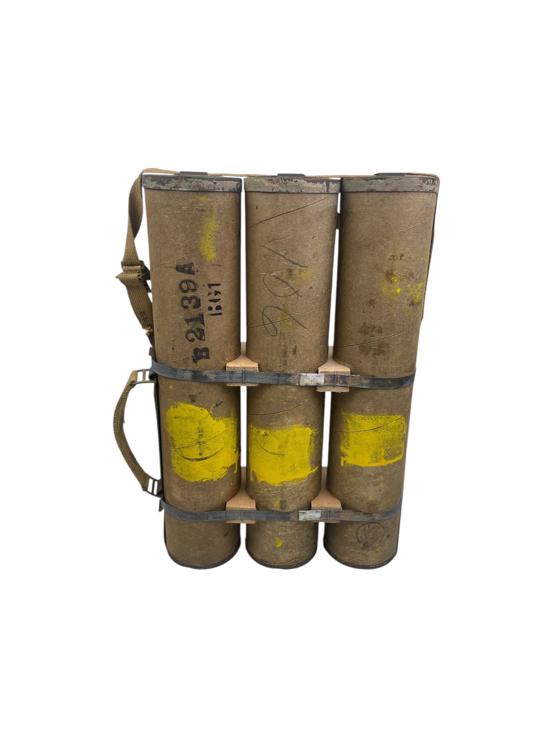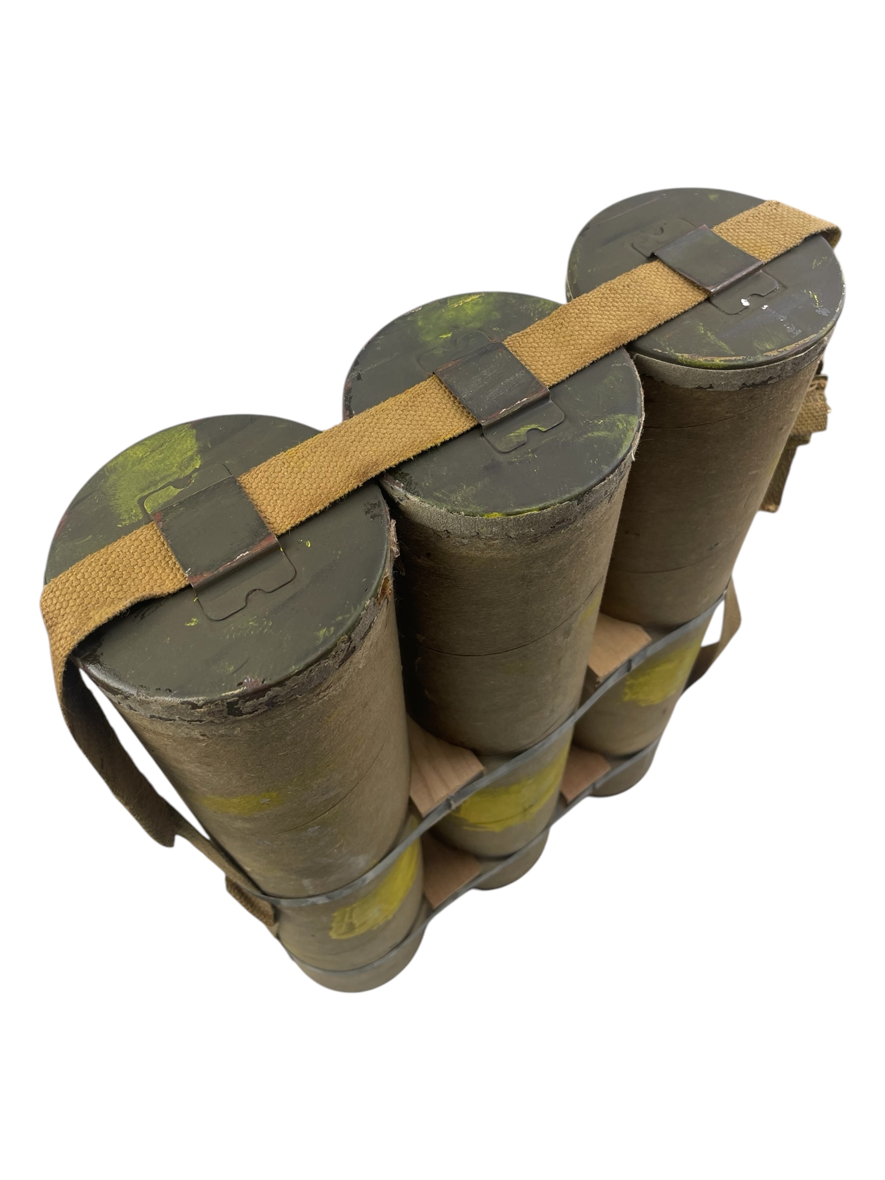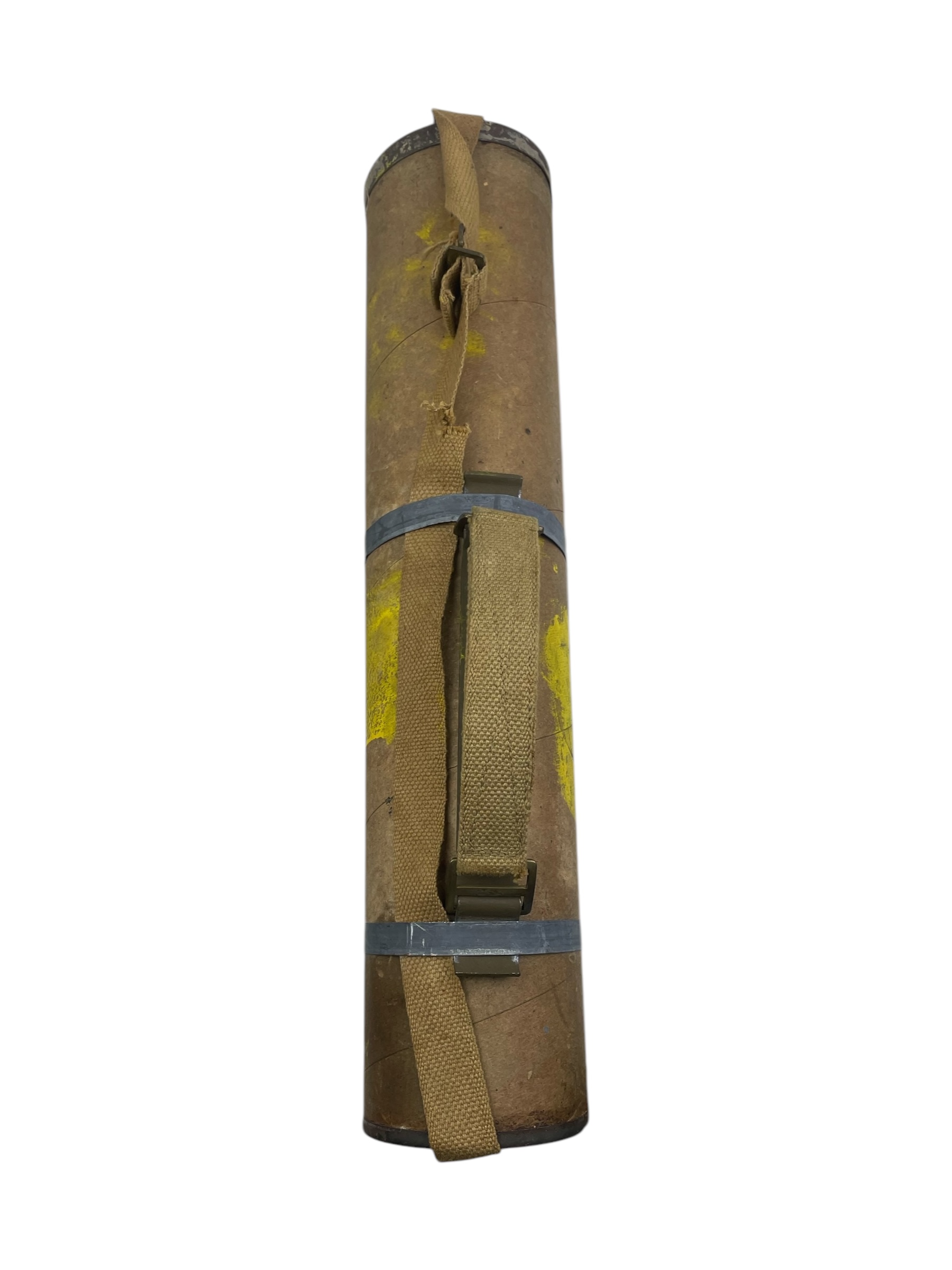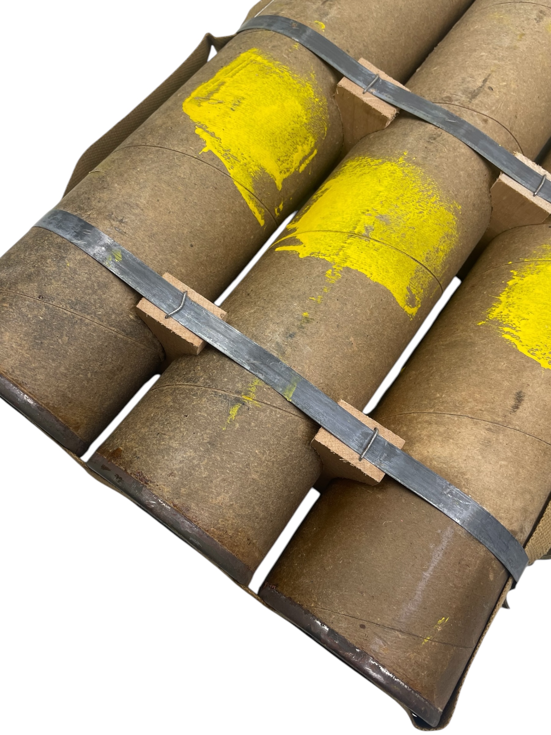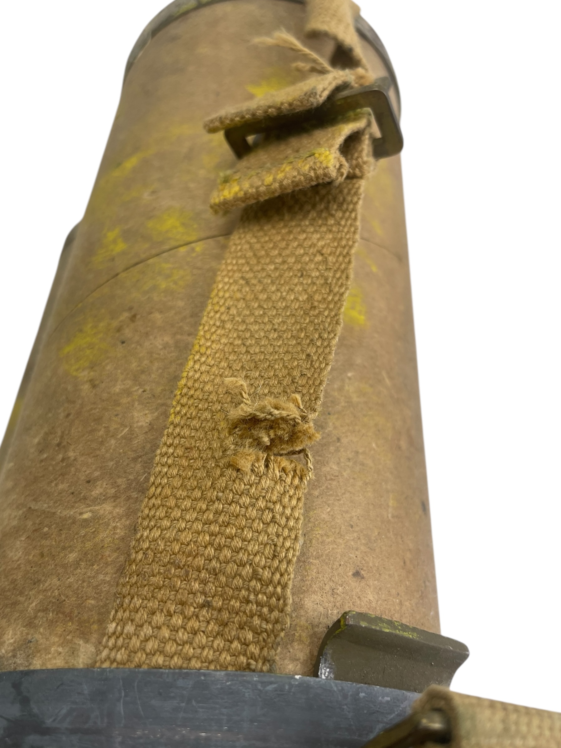 Canadese WO2 3inch mortar carrier. Deze is 1941 gedateerd en er zijn diverse markeringen terug te vinden op de kokers en op de webbing. Het wordt steeds lastiger om dit soort exemplaren te vinden!
