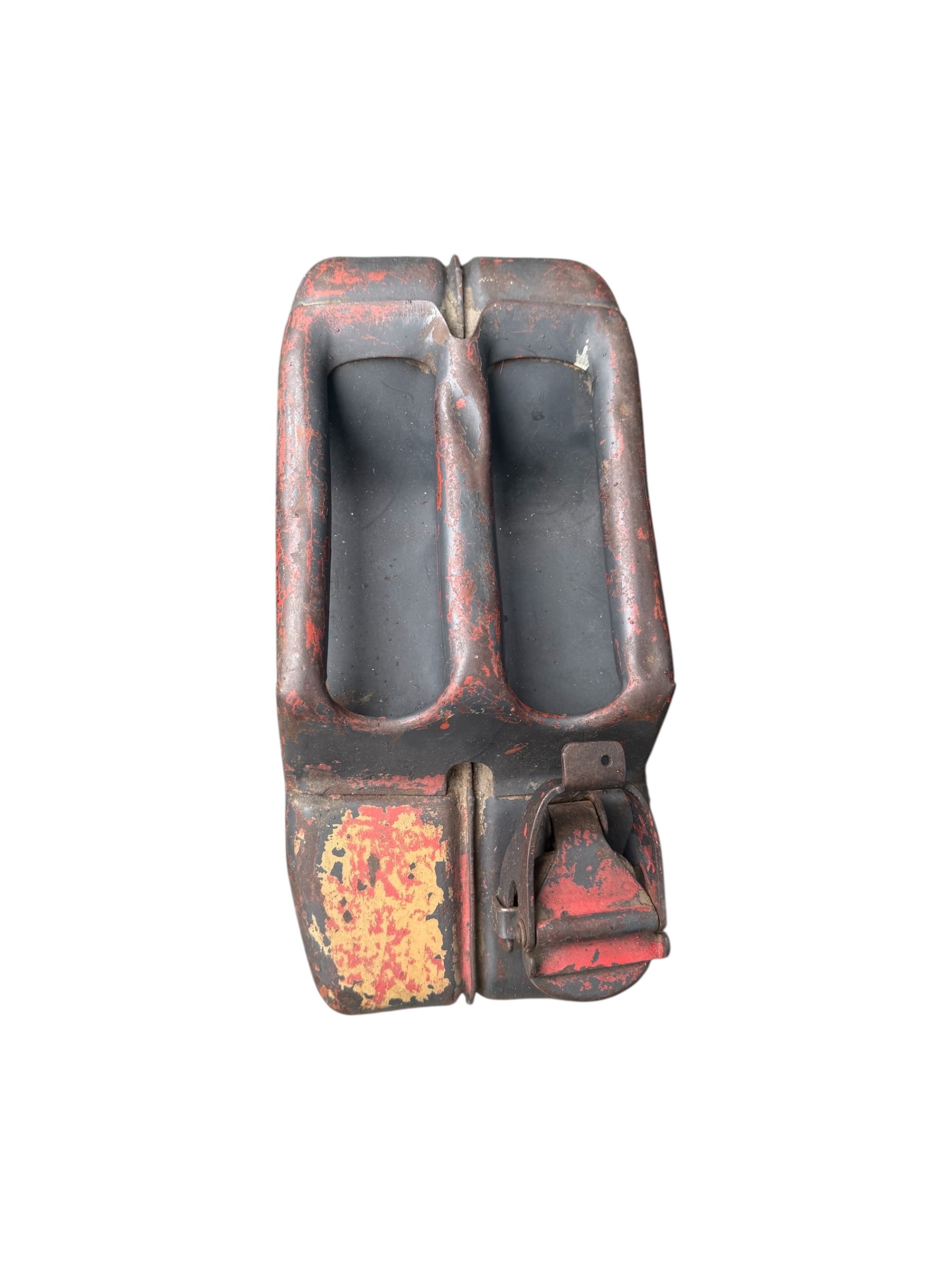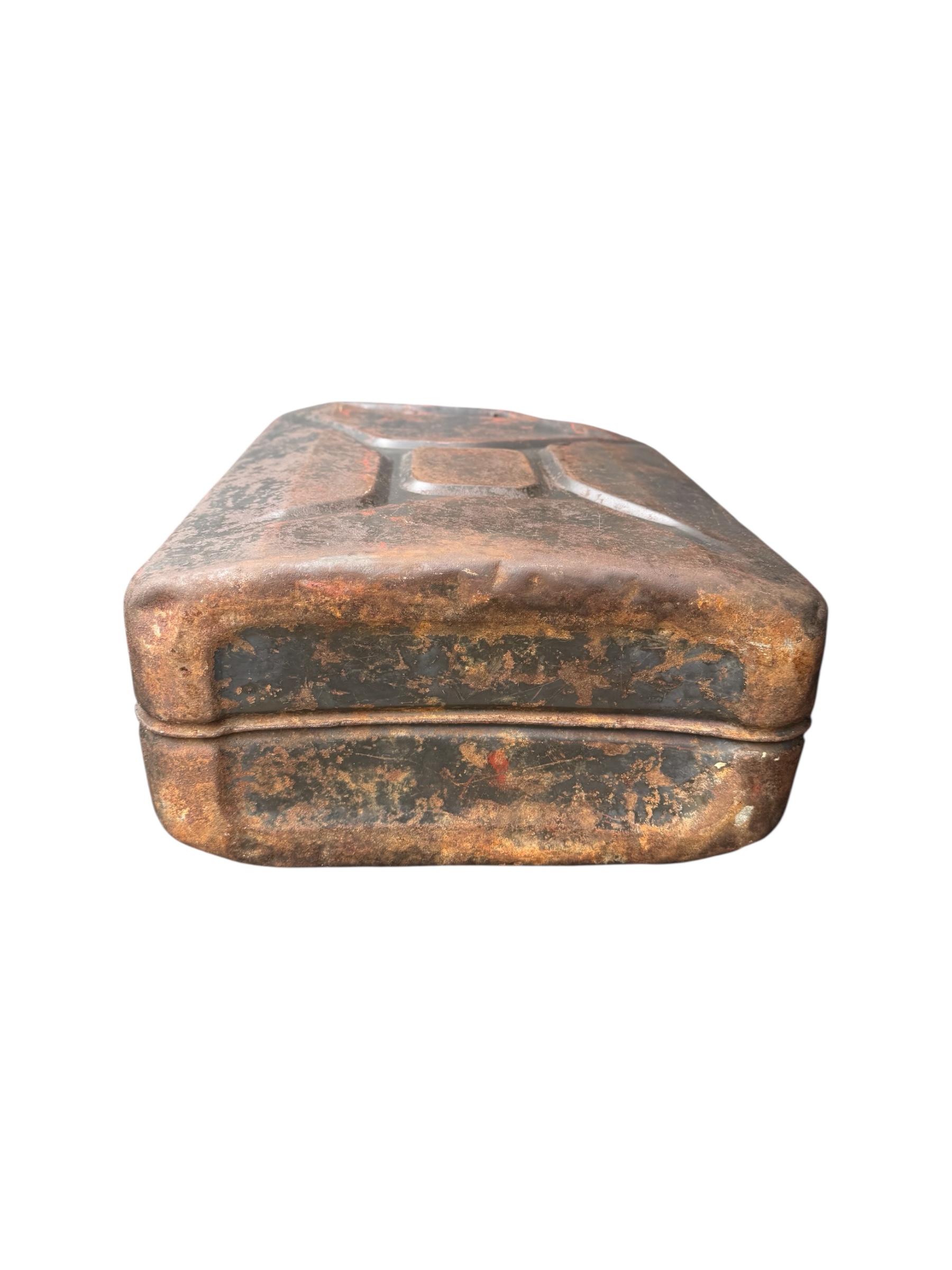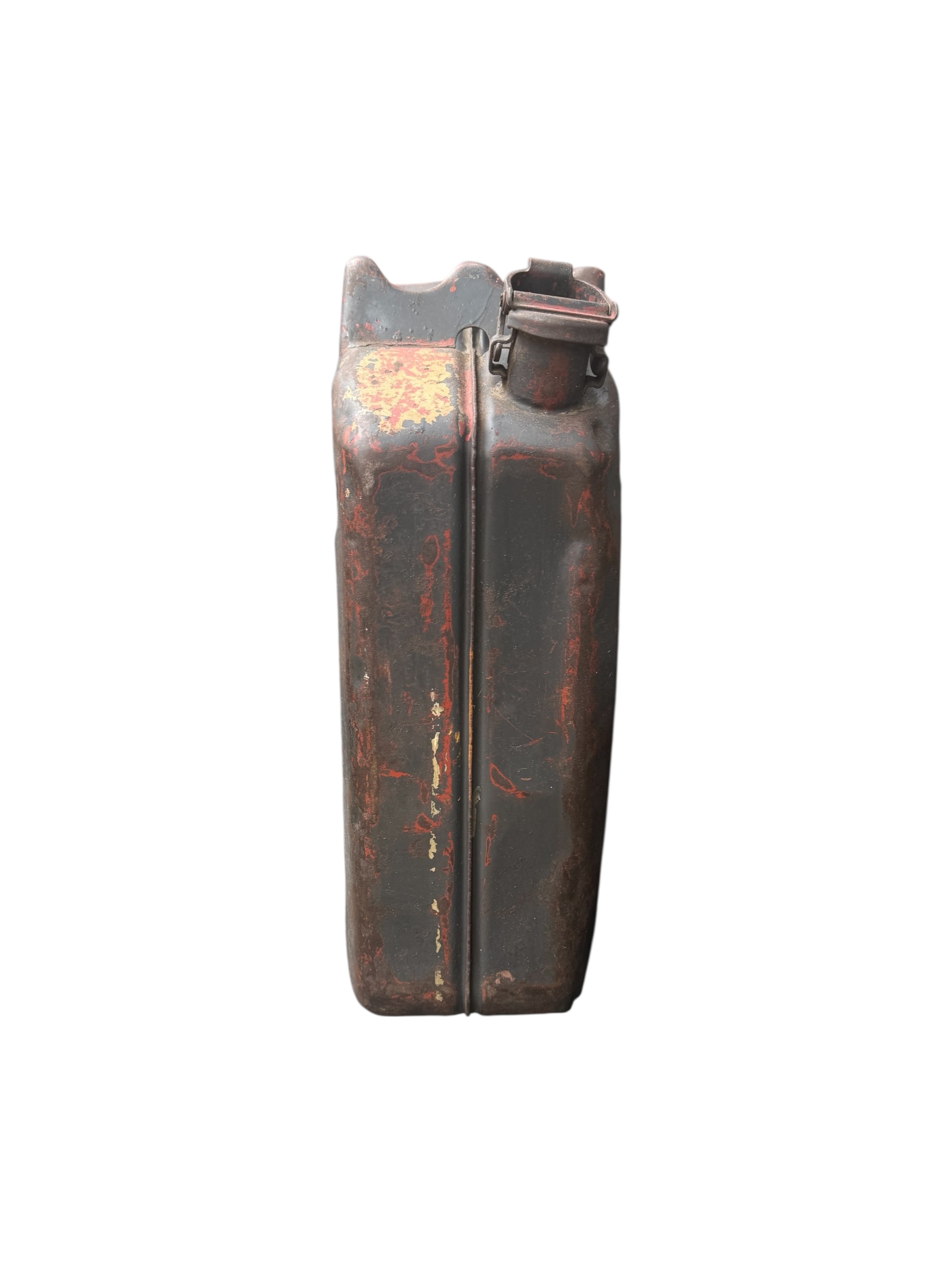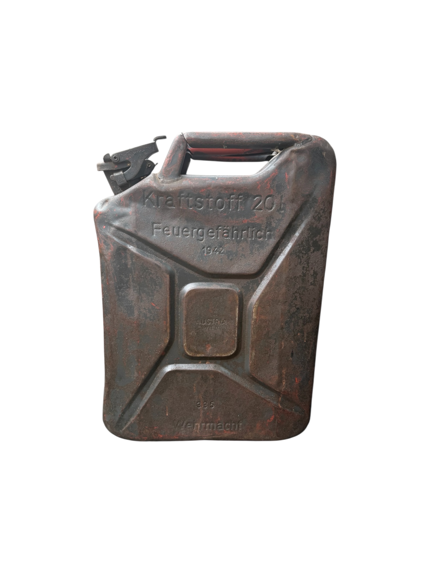 Duitse WO2 Wehrmacht jerrycan in gebruikte staat. Dit exemplaar is geproduceerd in 1942 en het kenmerk van de producent is nog duidelijk zichtbaar.