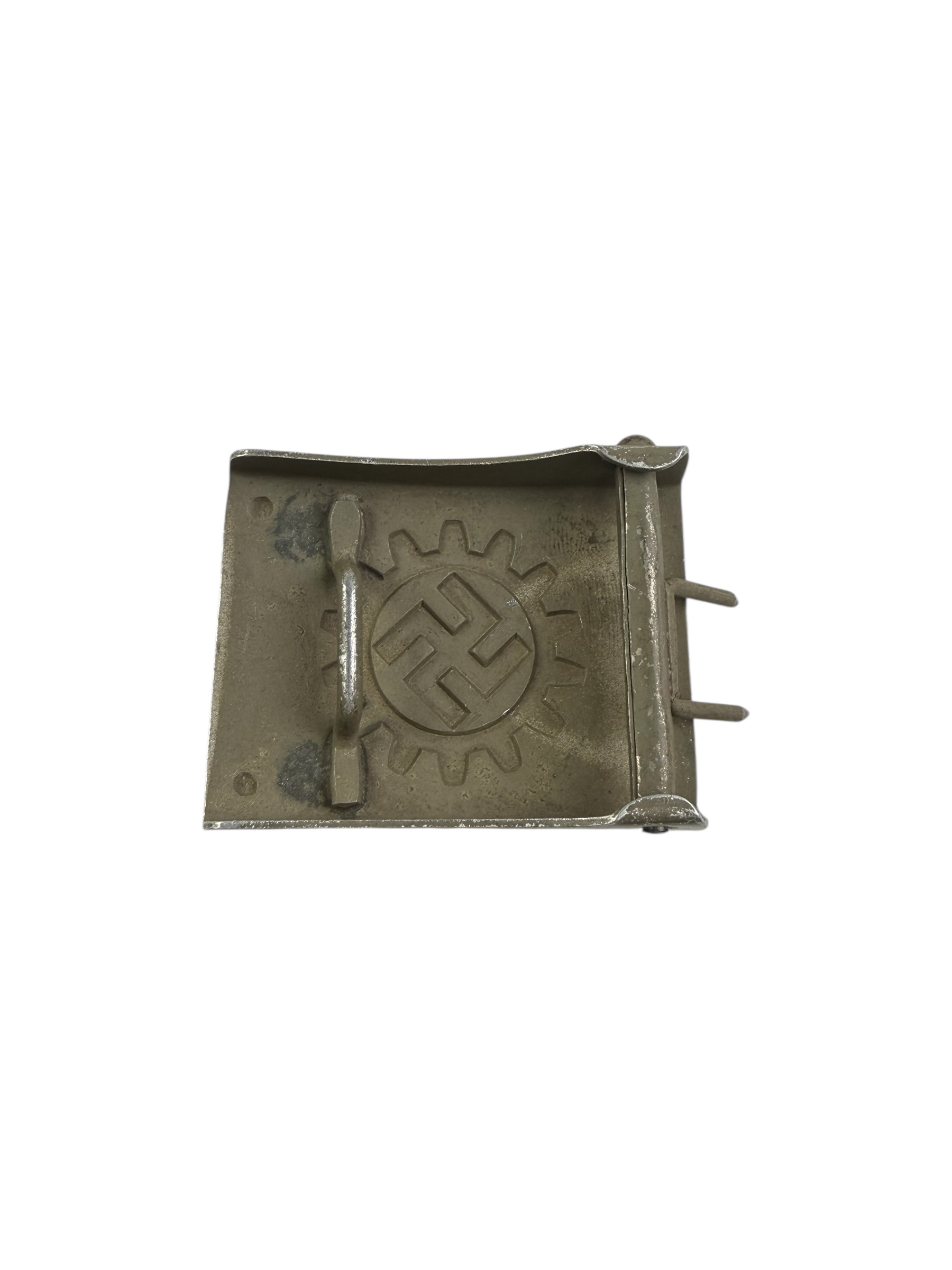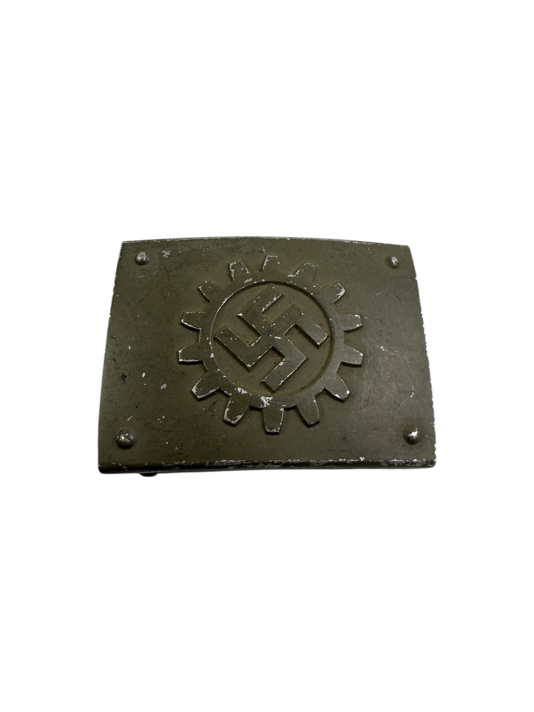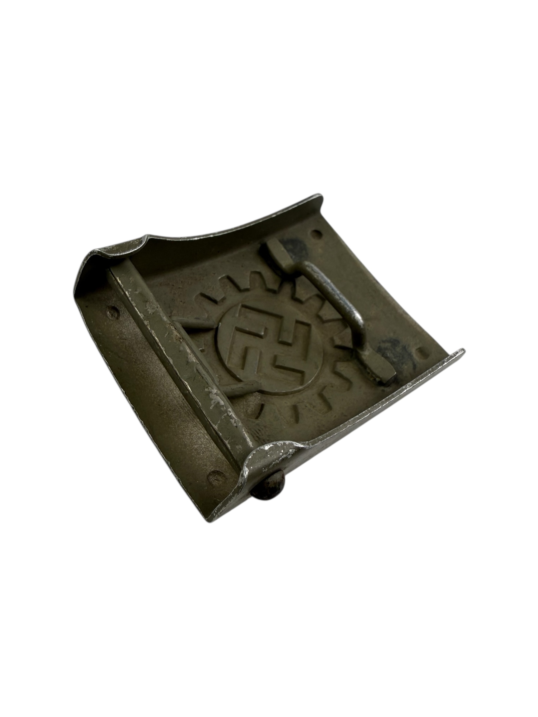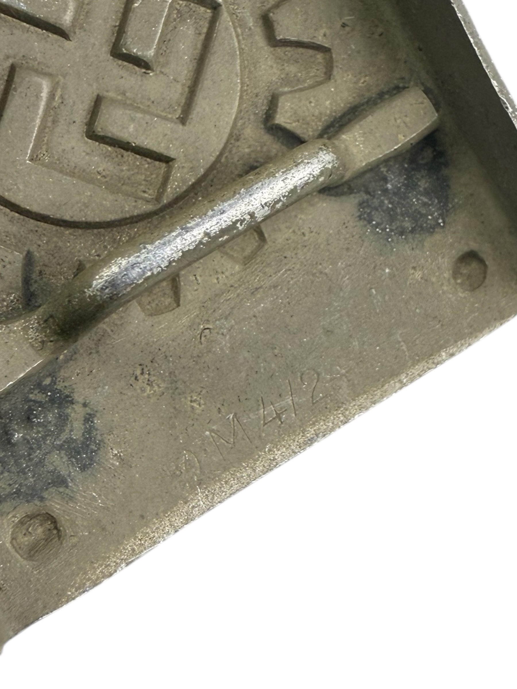 Duits WO2 Deutsche Arbeitsfront koppelslot. Dit exemplaar is gemaakt van aluminium en verkeert in zeer nette staat. De originele verf is grotendeels behouden en de RZM M4/24-markering is nog duidelijk zichtbaar.