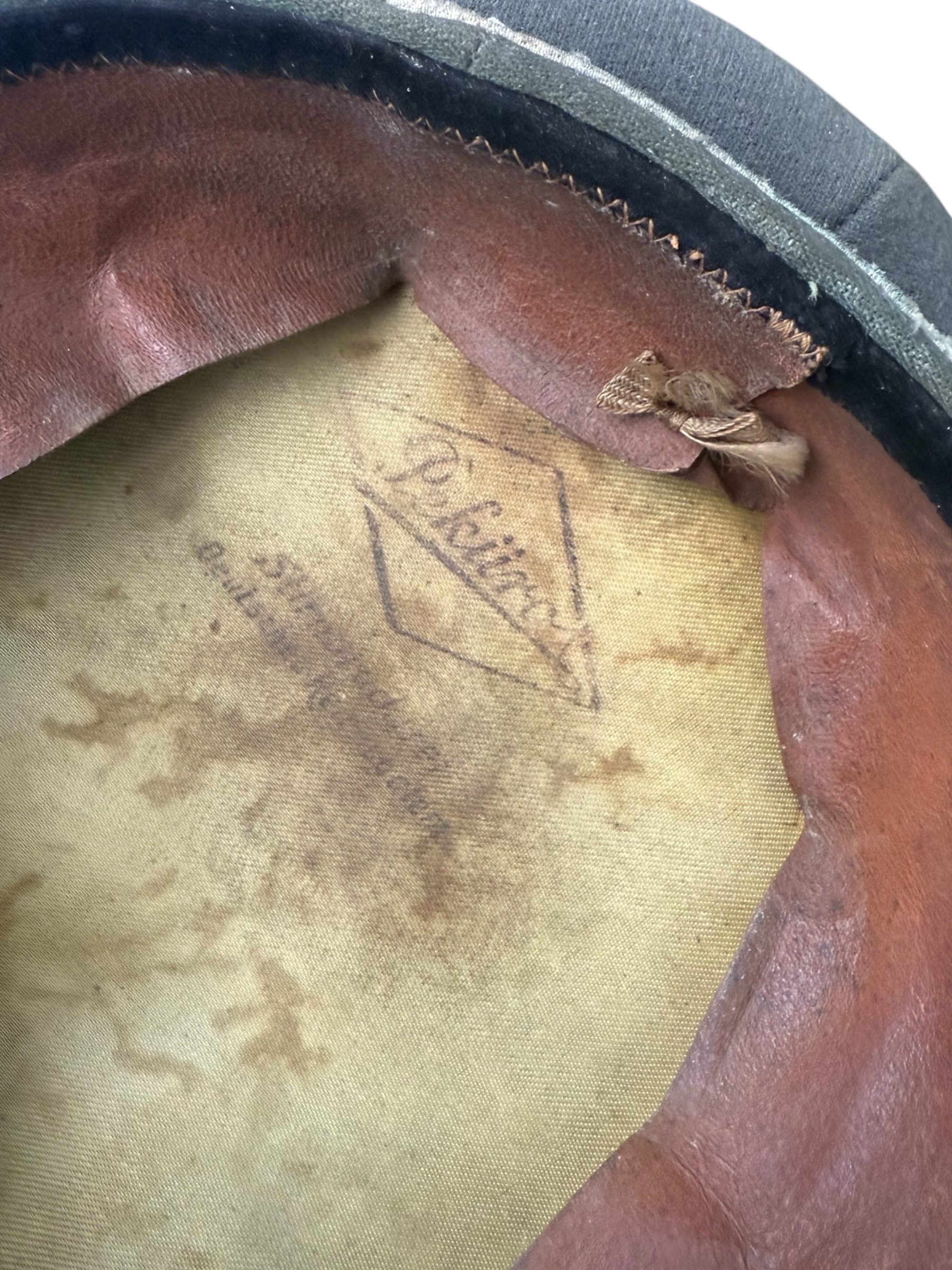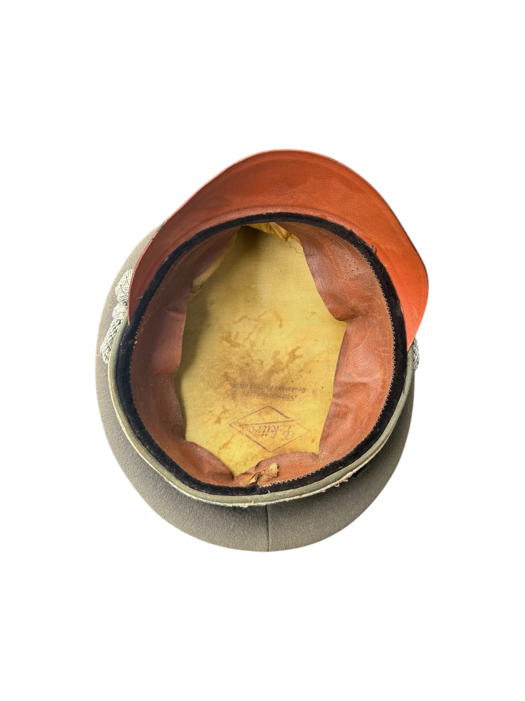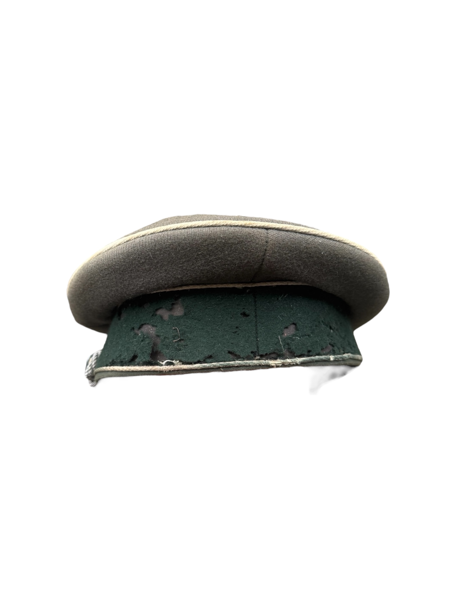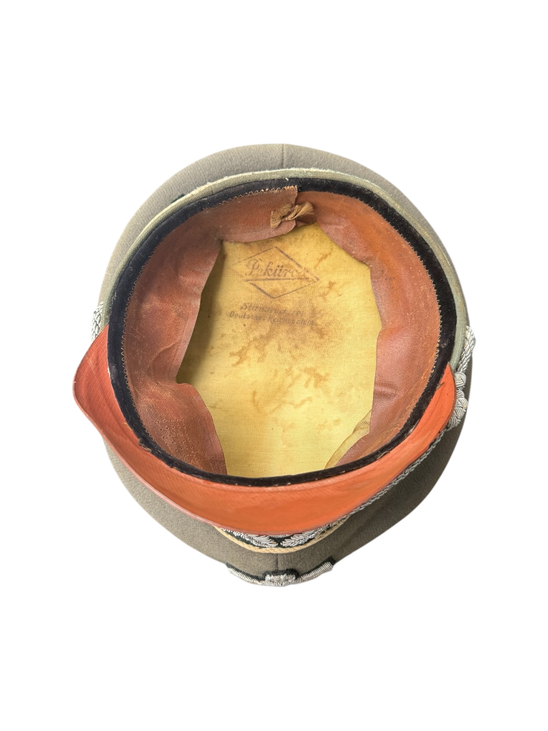 Duitse WO2 Wehrmacht Infanterie Officiers Schirmmütze, circa maat 55, in gedragen staat. Het leder van de zweetband is nog vrij soepel en de vorm van de pet is goed bewaard gebleven. Het kenmerk van de producent is overigens nog prima leesbaar. Aan de achterkant is er mottenbeschadiging aanwezig, dus bekijk de foto’s aandachtig. Gelukkig is dit aan de voorzijde nauwelijks zichtbaar wanneer de pet wordt gebruikt als display item.