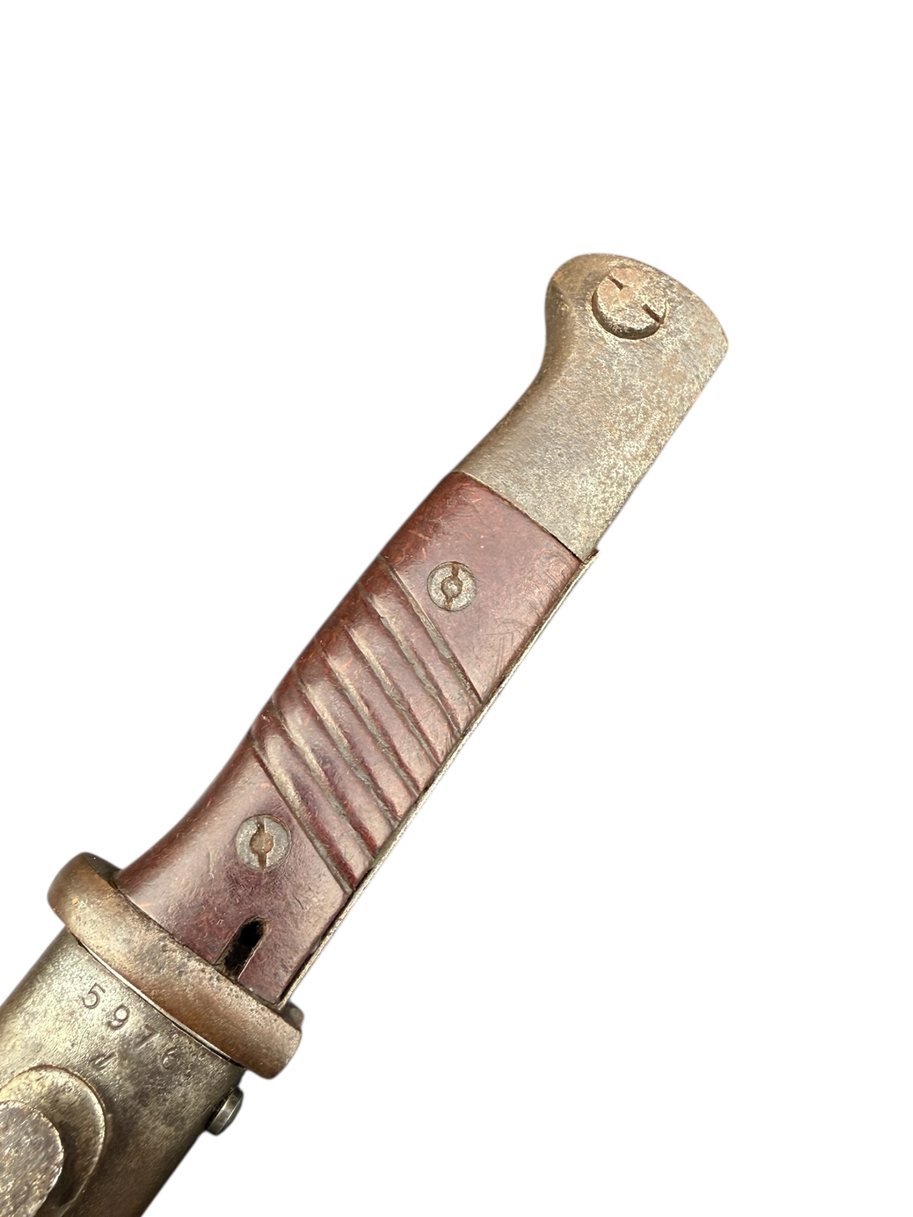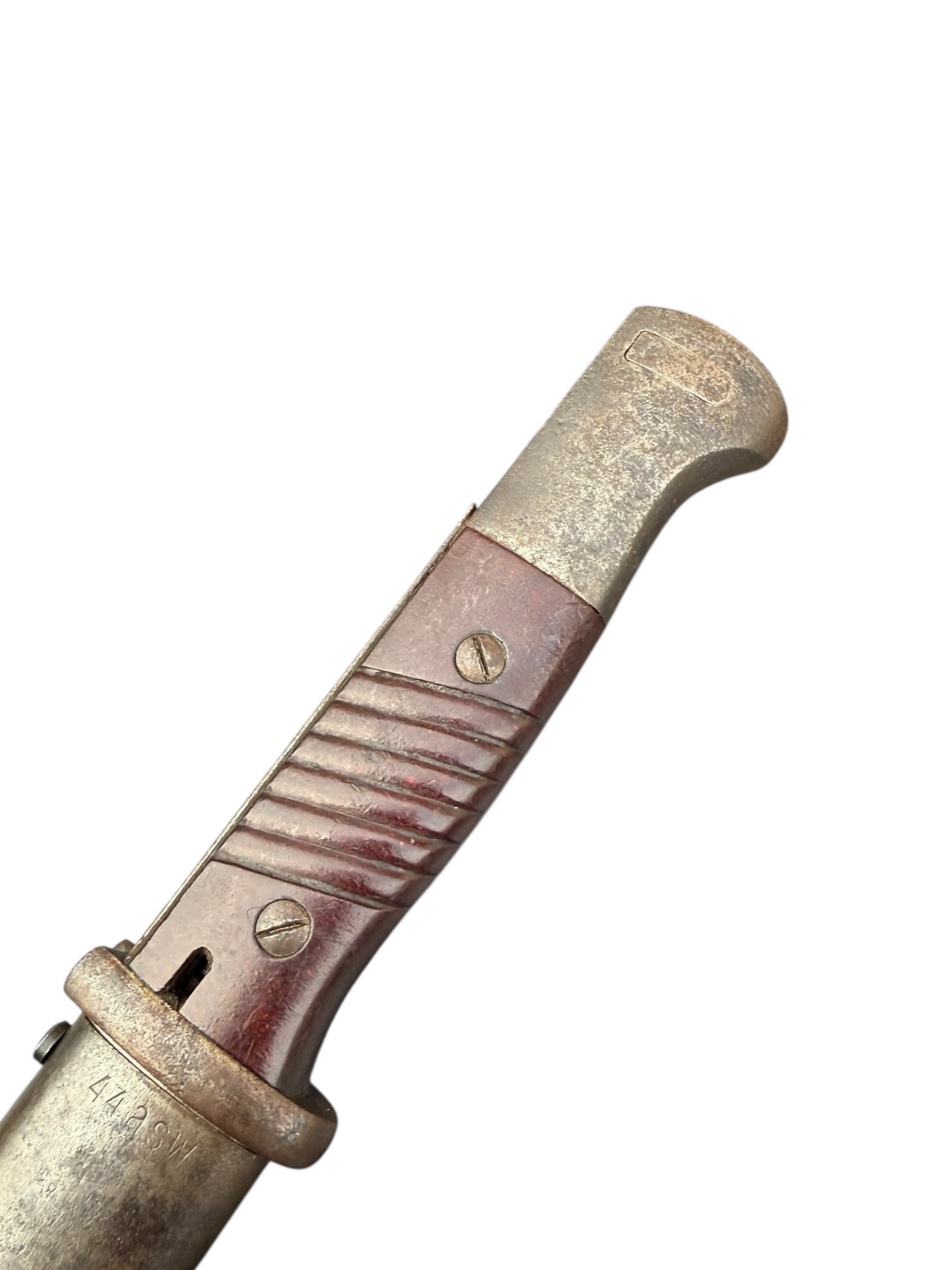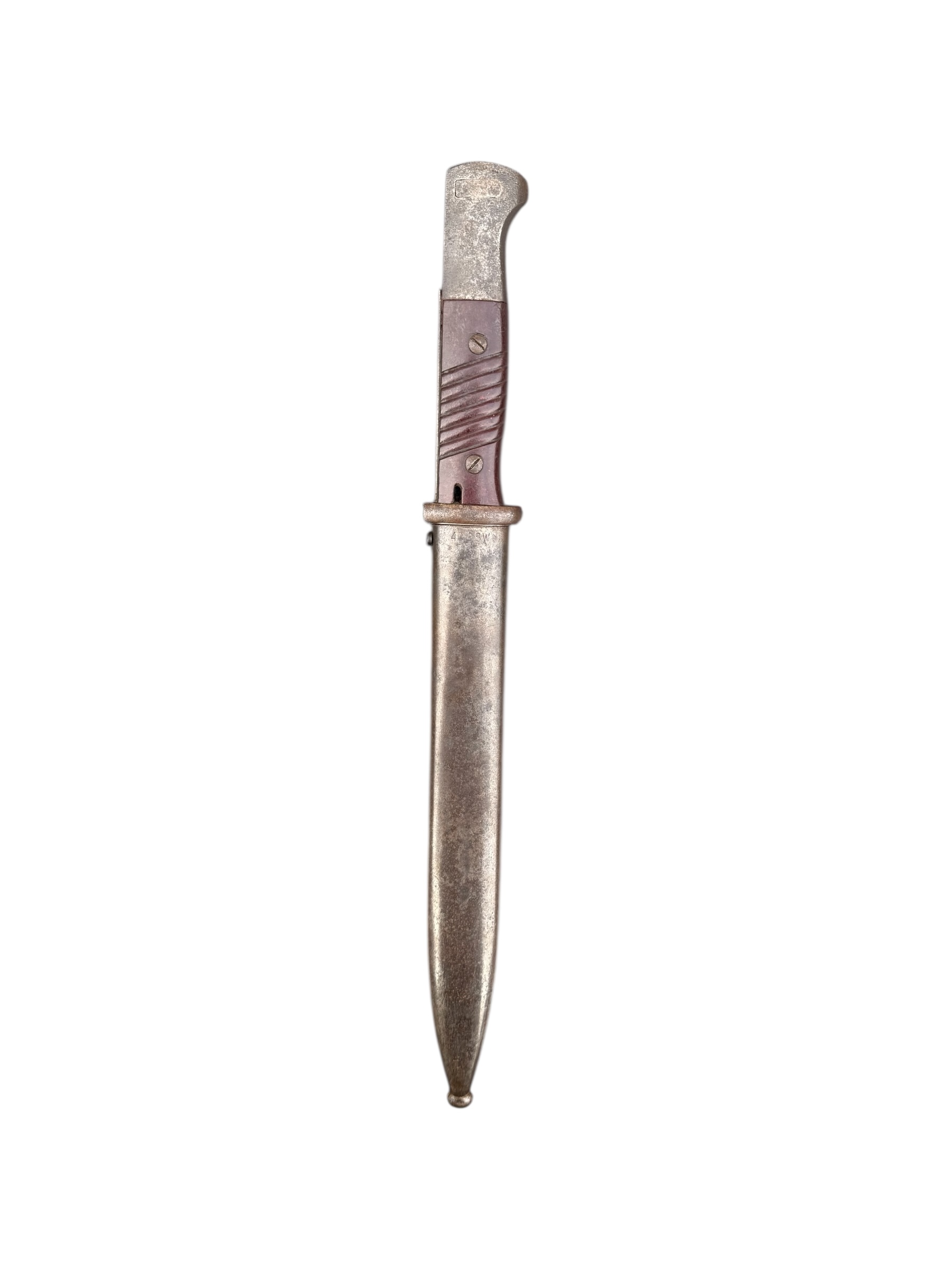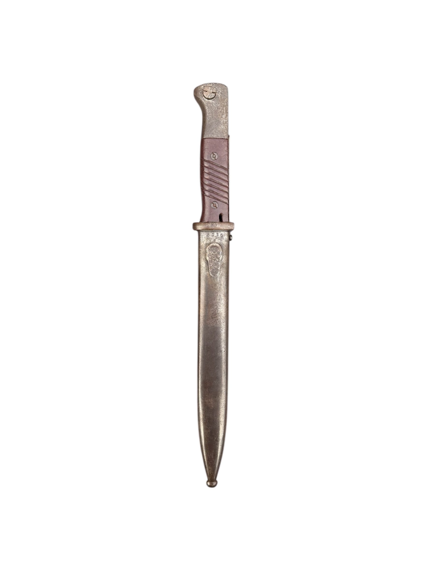 Duitse nummergelijke WO2 K98 bajonet uit 1944. Diverse WaA markeringen zijn aanwezig en ook de producentenkenmerken zijn nog duidelijk zichtbaar. Het lemmet is ongeslepen en de blauwing is grotendeels behouden. Het betreft een zeldzamere uitvoering met rood bakeliet. Let op: vanwege de huisregels kan dit item niet via PayPal worden betaald. Verkoop uitsluitend aan personen van 18 jaar en ouder.