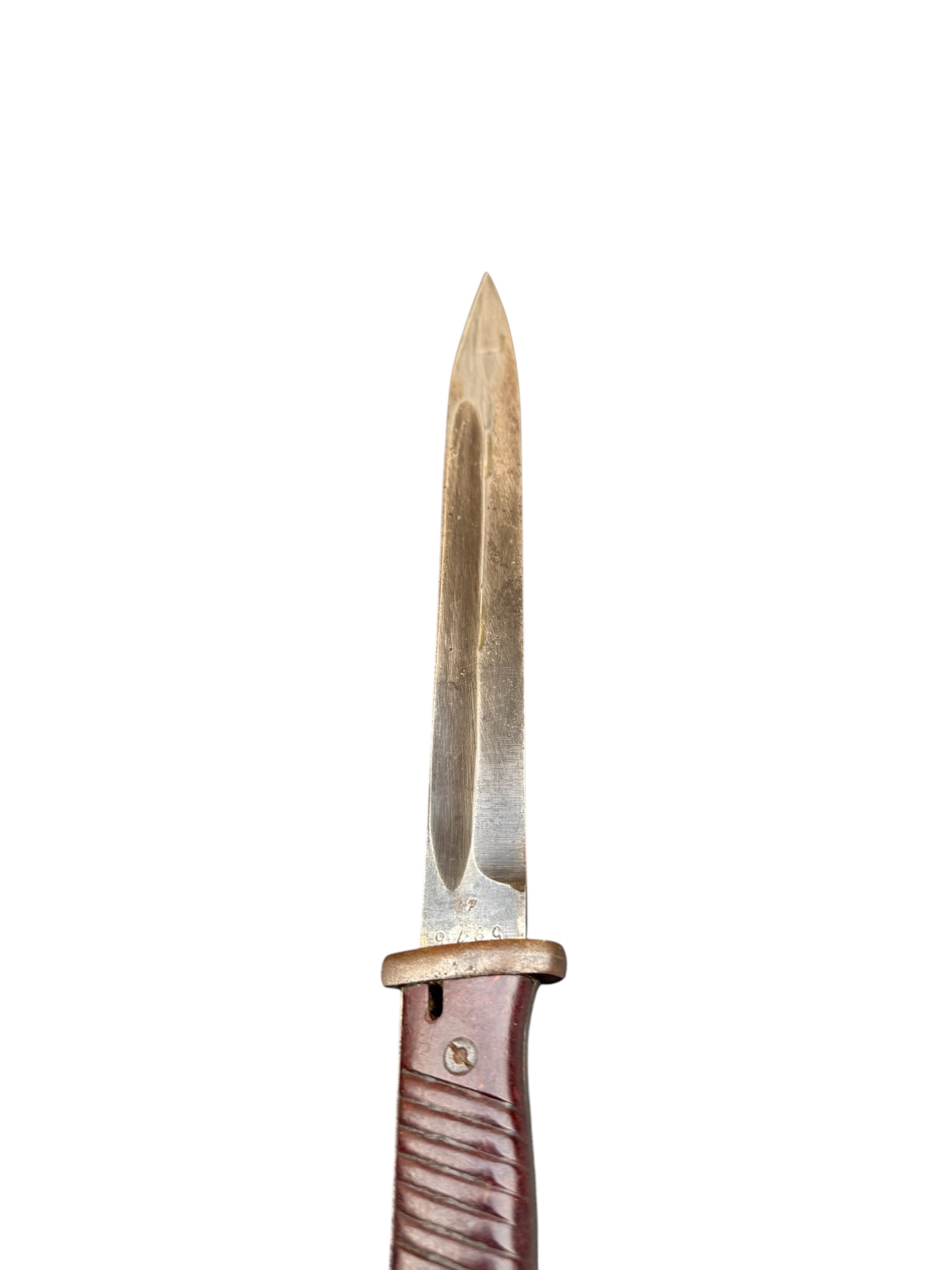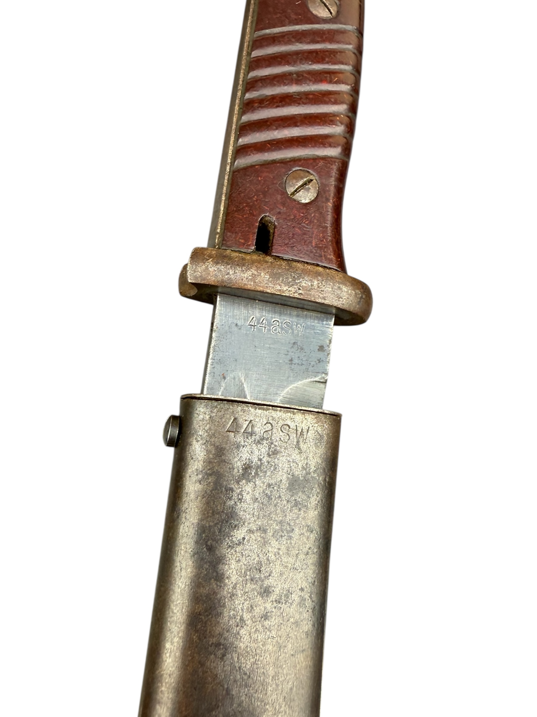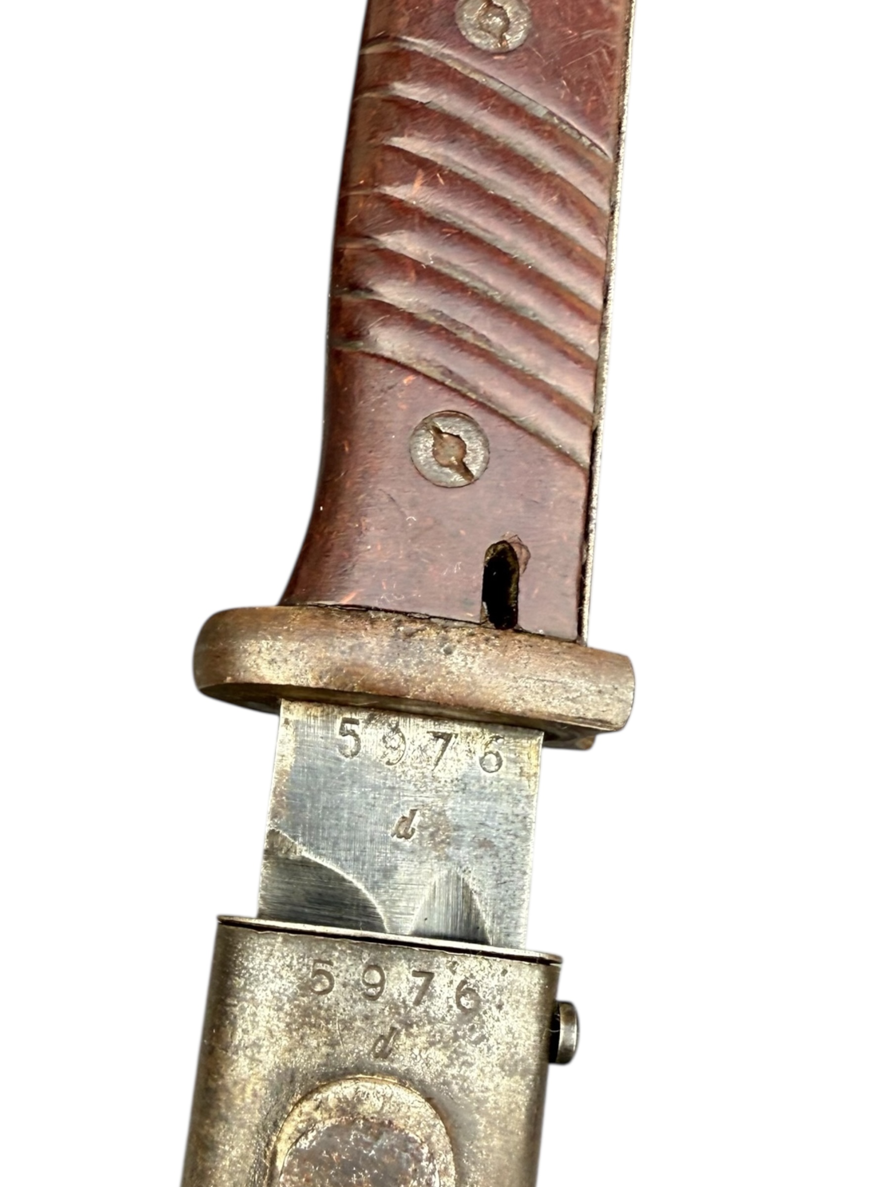 Duitse nummergelijke WO2 K98 bajonet uit 1944. Diverse WaA markeringen zijn aanwezig en ook de producentenkenmerken zijn nog duidelijk zichtbaar. Het lemmet is ongeslepen en de blauwing is grotendeels behouden. Het betreft een zeldzamere uitvoering met rood bakeliet. Let op: vanwege de huisregels kan dit item niet via PayPal worden betaald. Verkoop uitsluitend aan personen van 18 jaar en ouder.