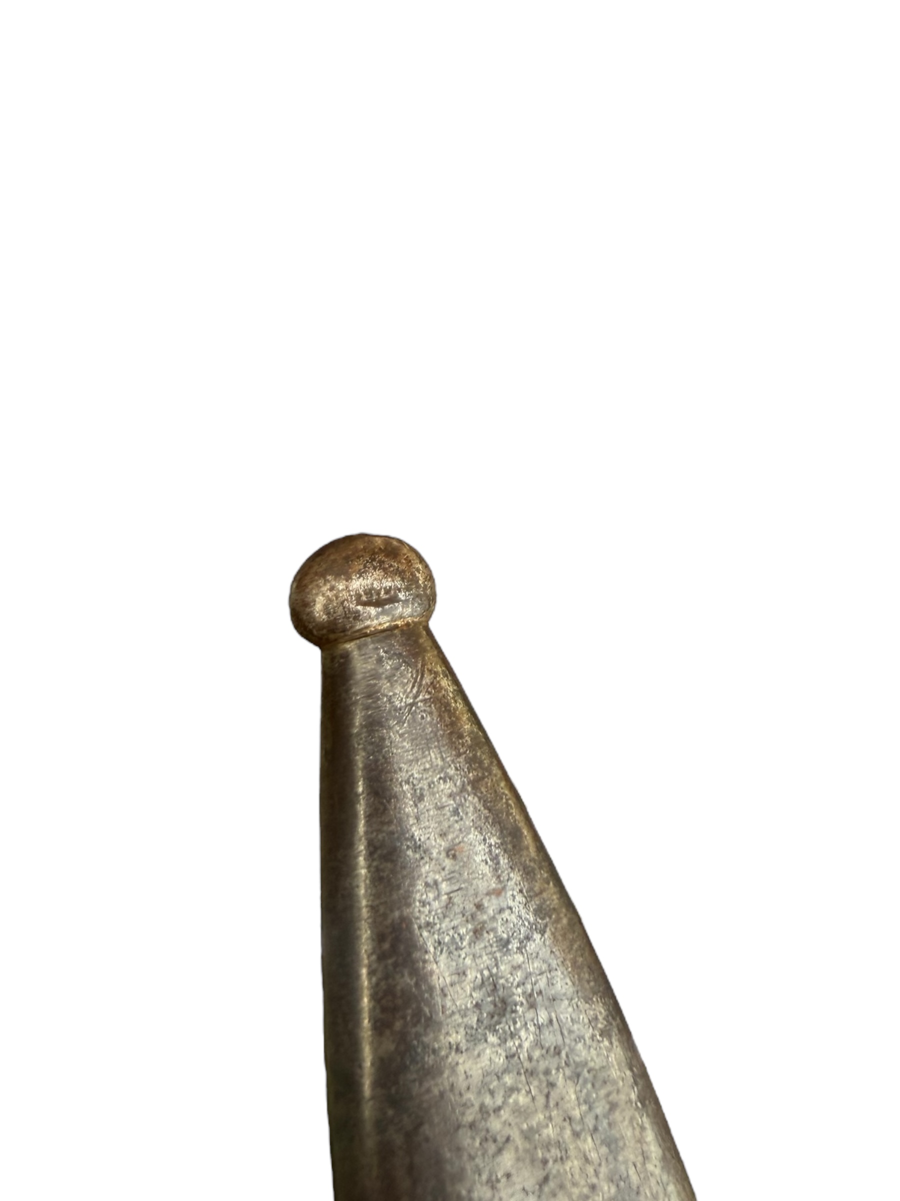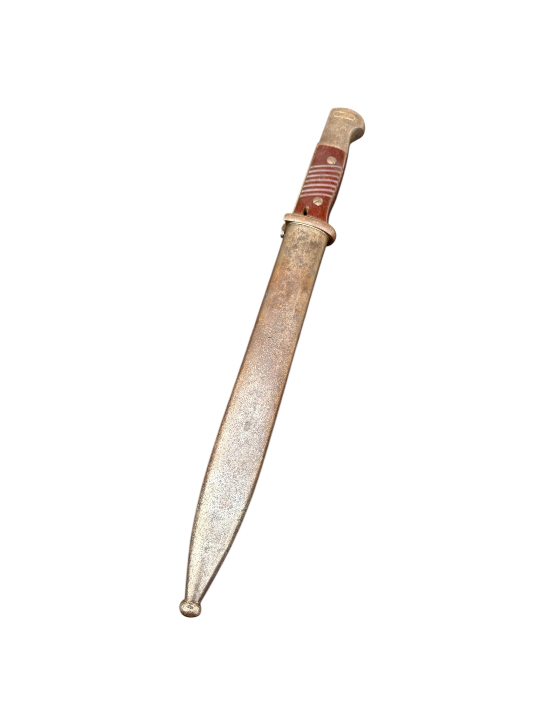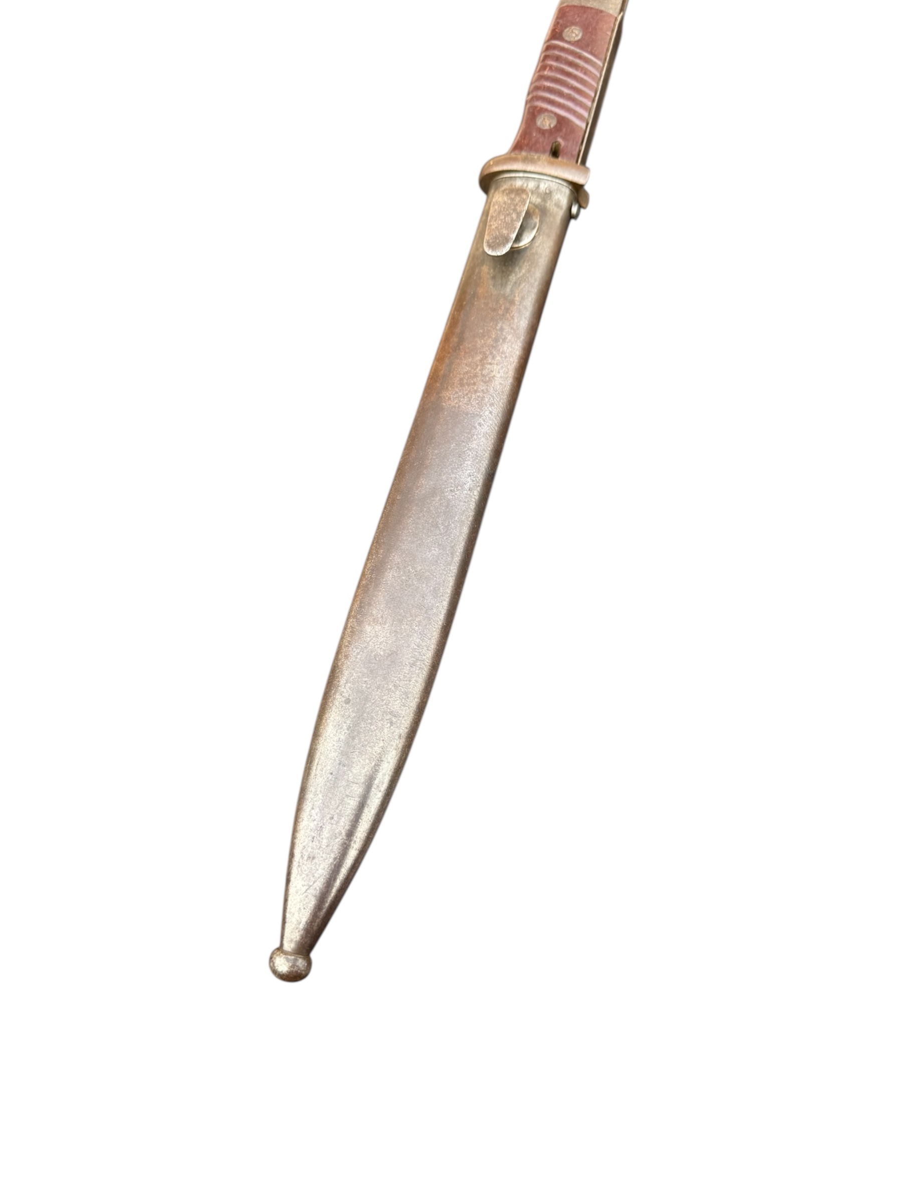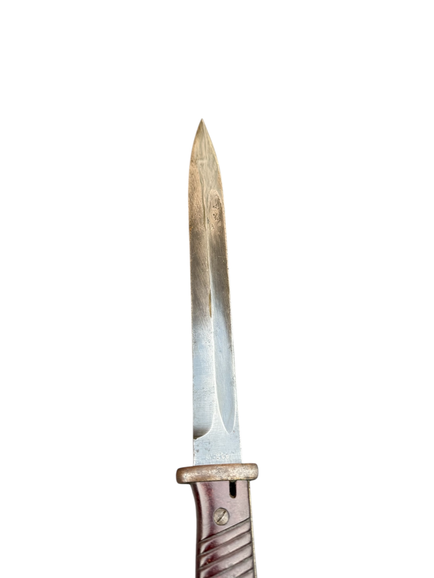 Duitse nummergelijke WO2 K98 bajonet uit 1944. Diverse WaA markeringen zijn aanwezig en ook de producentenkenmerken zijn nog duidelijk zichtbaar. Het lemmet is ongeslepen en de blauwing is grotendeels behouden. Het betreft een zeldzamere uitvoering met rood bakeliet. Let op: vanwege de huisregels kan dit item niet via PayPal worden betaald. Verkoop uitsluitend aan personen van 18 jaar en ouder.