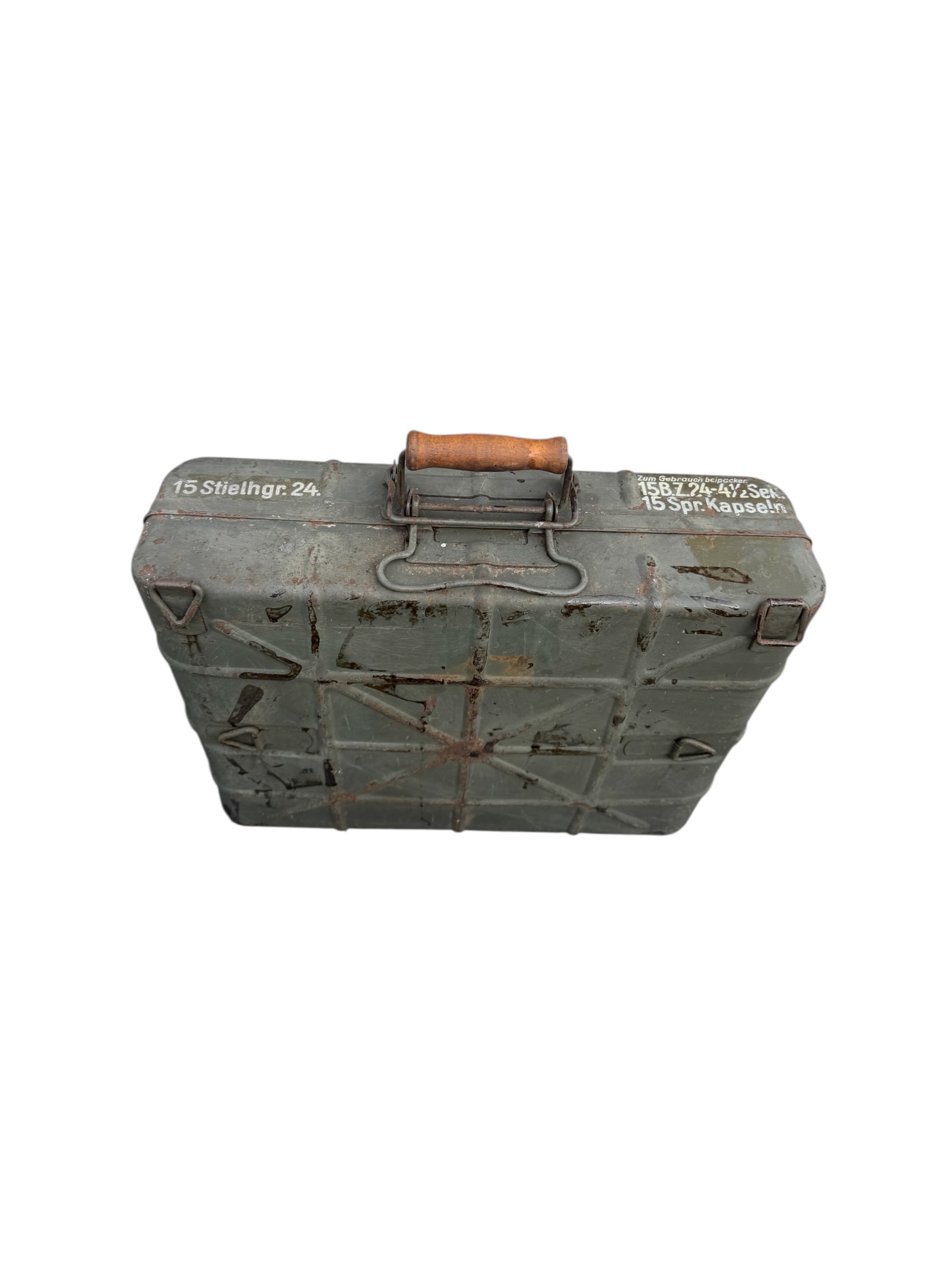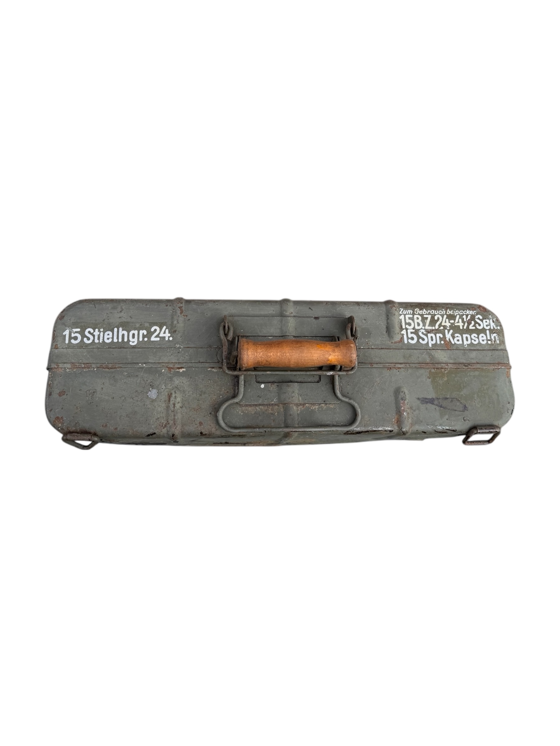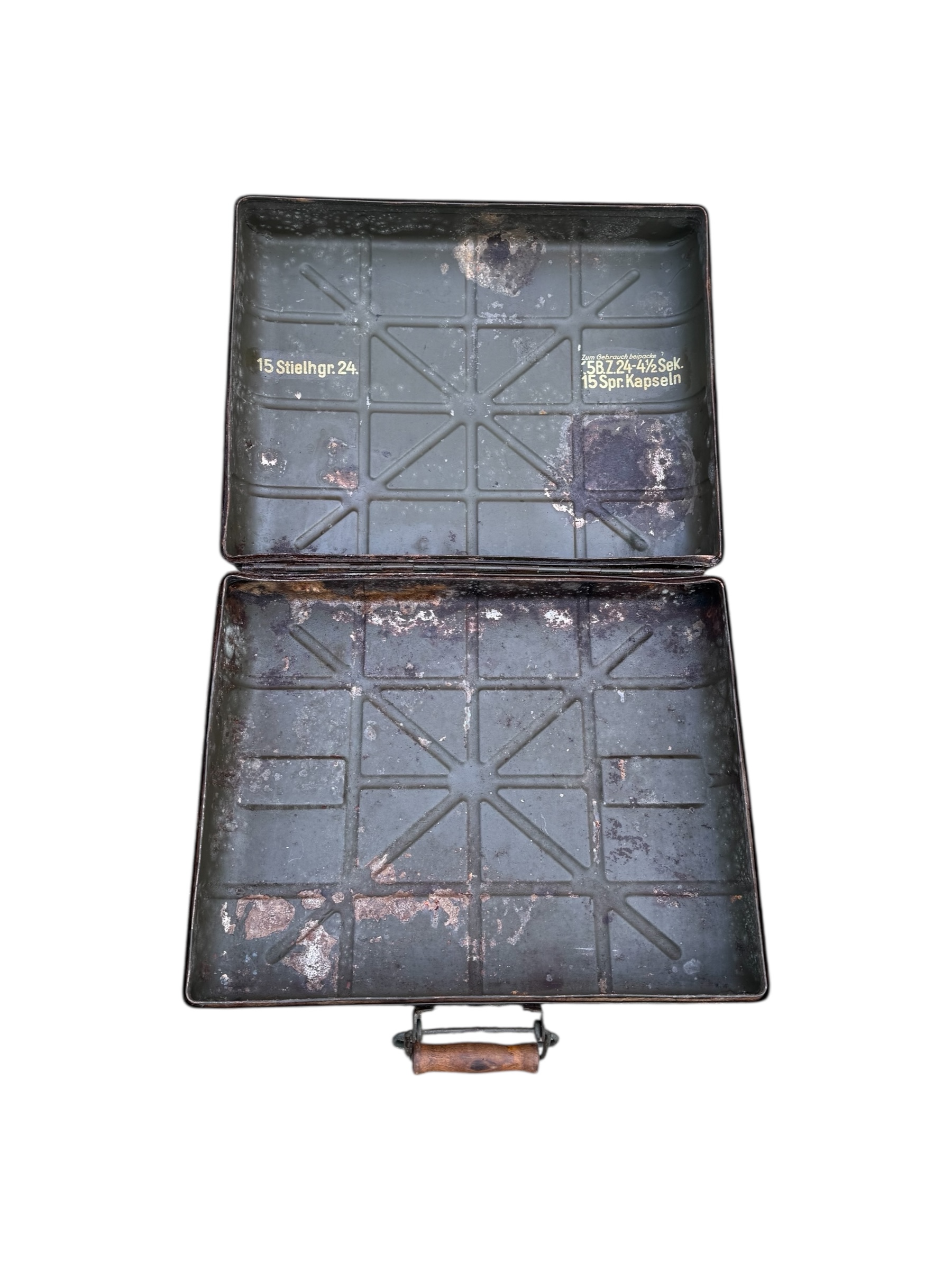 Duitse WO2 transportkist voor Steelhandgranaten. Deze verkeert in goede, gebruikte staat en is gedateerd 1940. Alle markeringen zijn grotendeels bewaard gebleven.