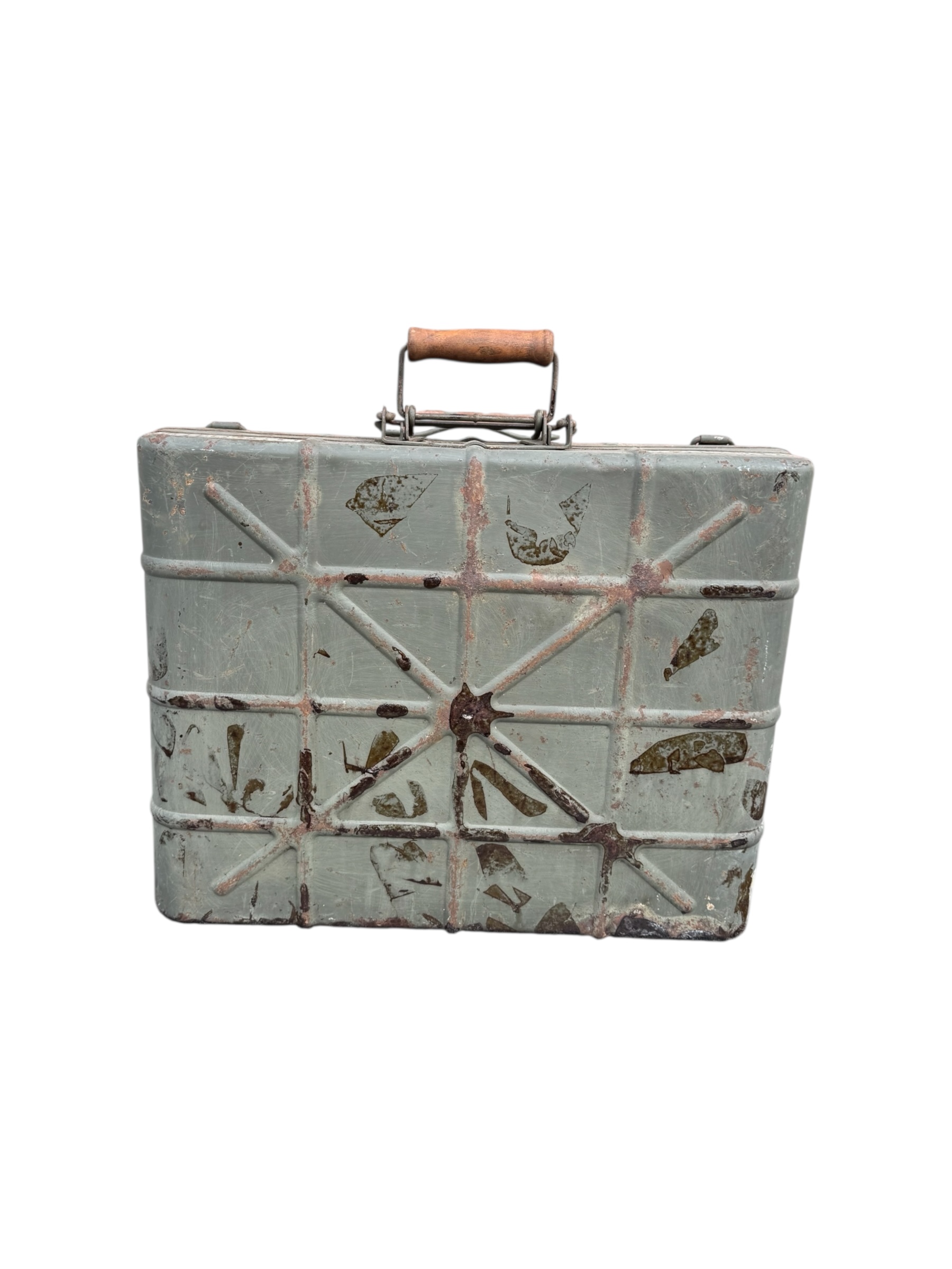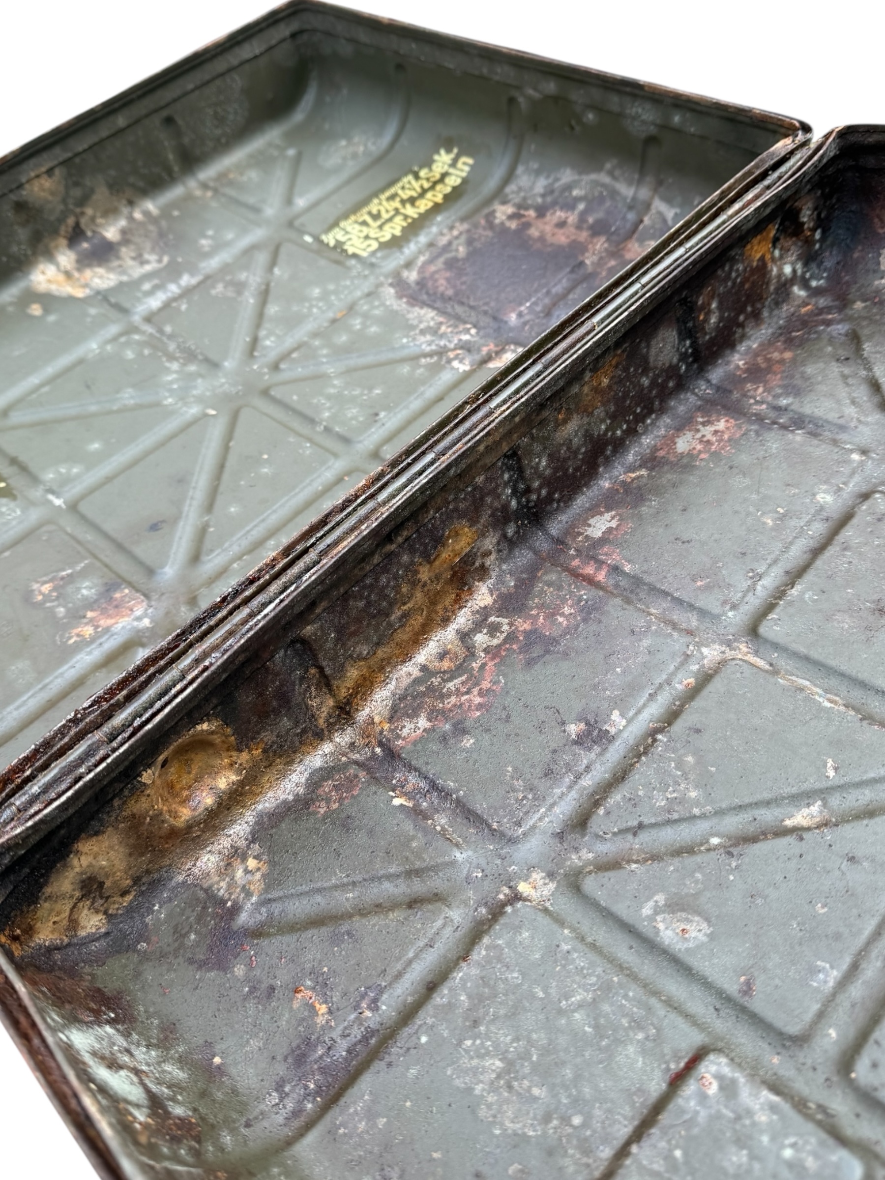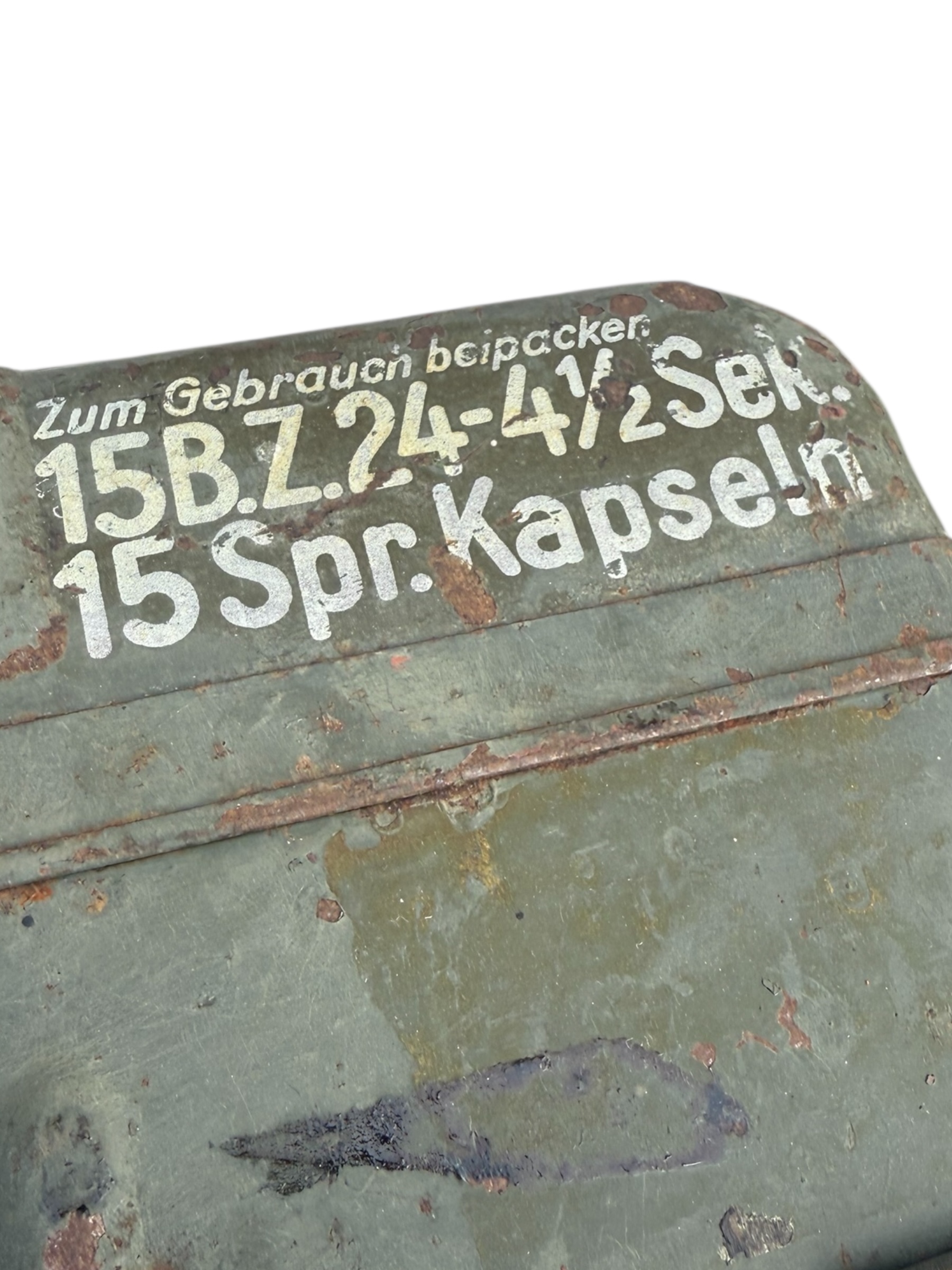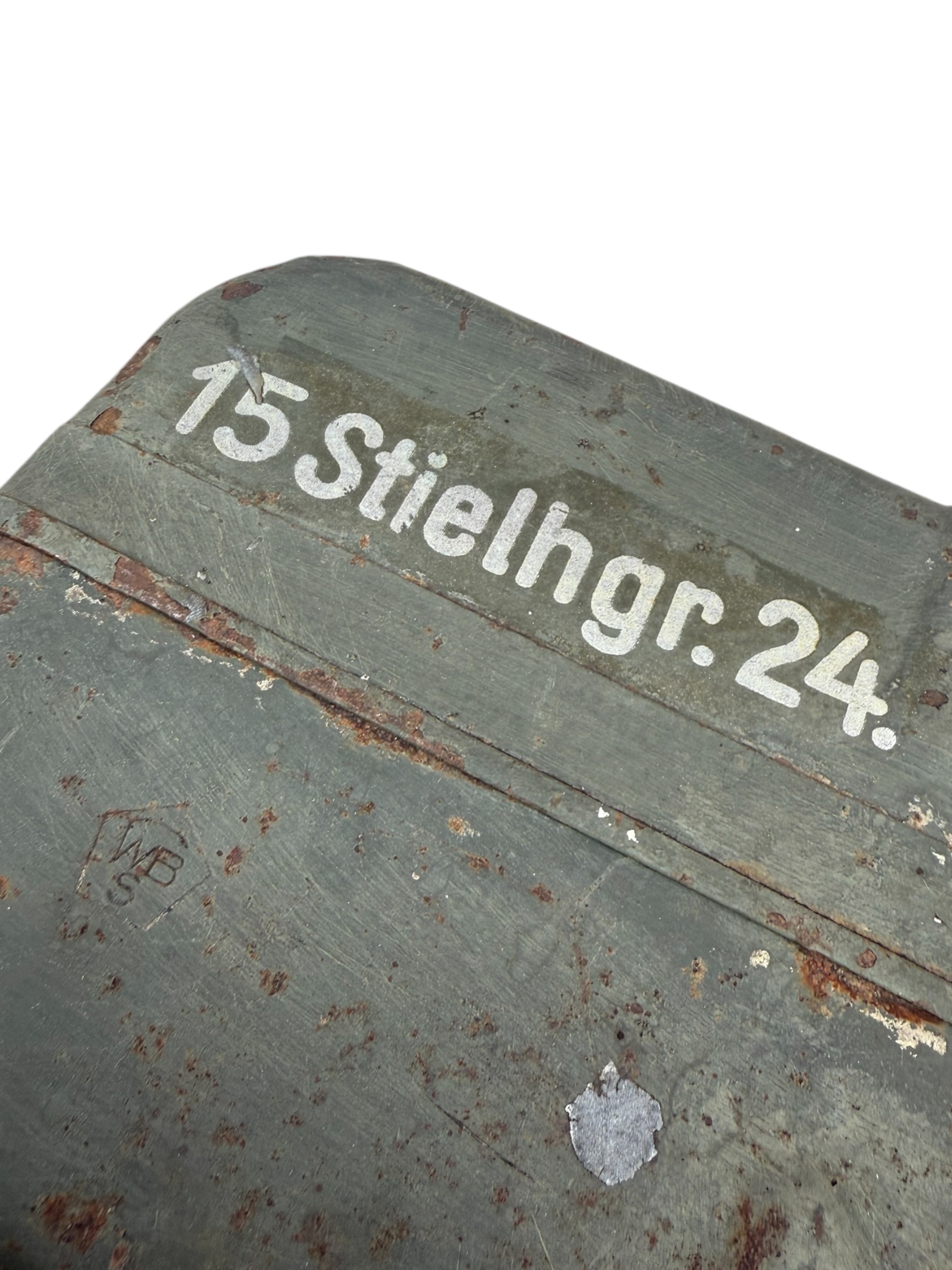 Duitse WO2 transportkist voor Steelhandgranaten. Deze verkeert in goede, gebruikte staat en is gedateerd 1940. Alle markeringen zijn grotendeels bewaard gebleven.