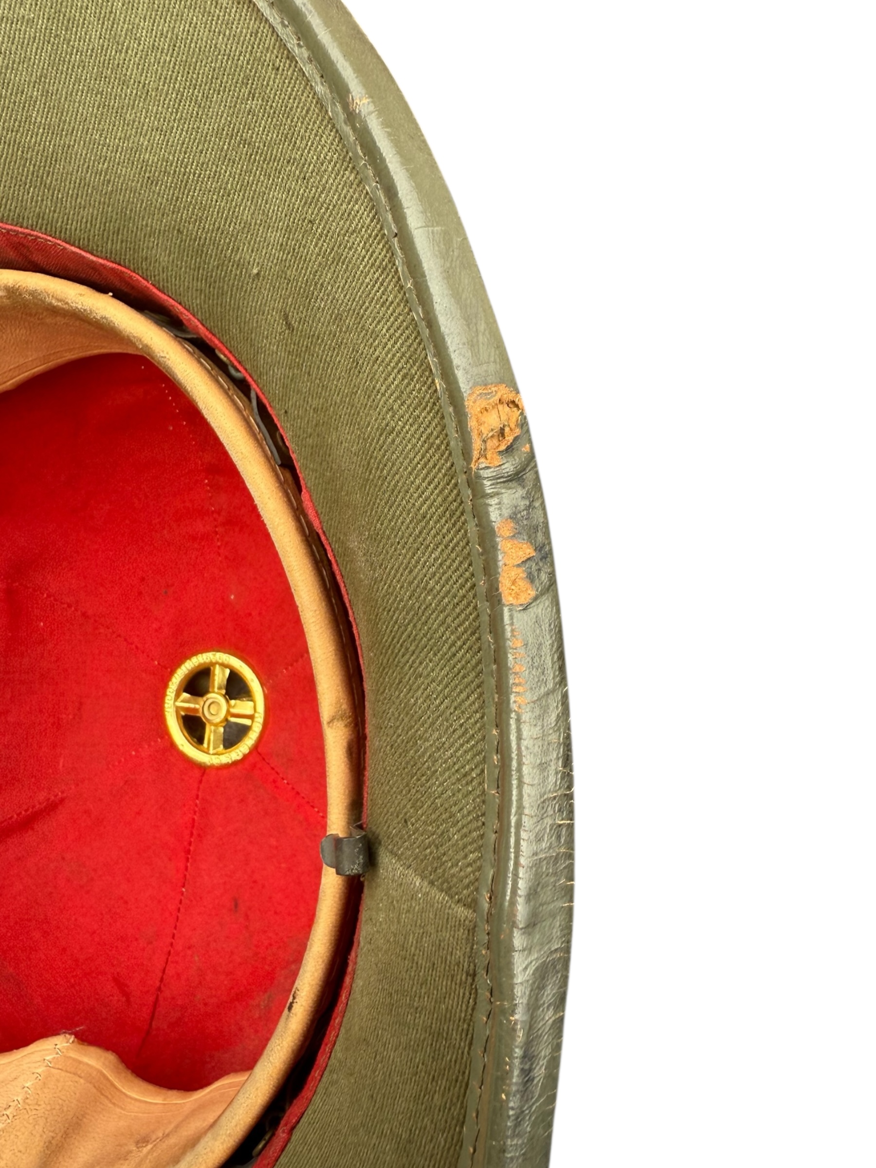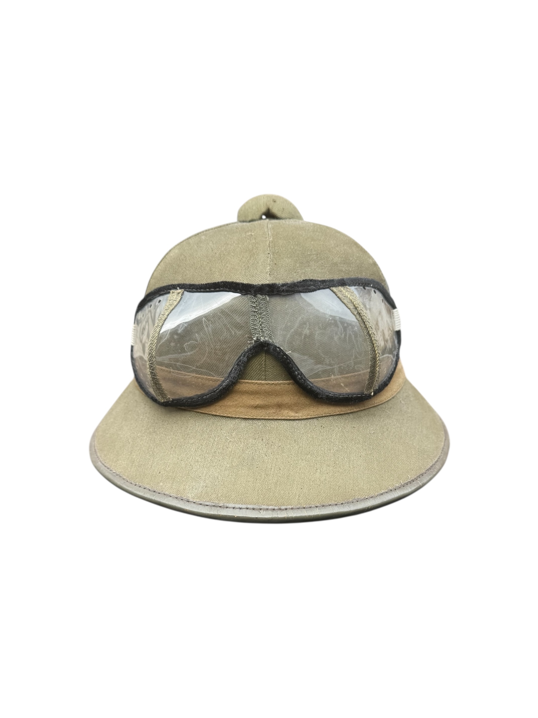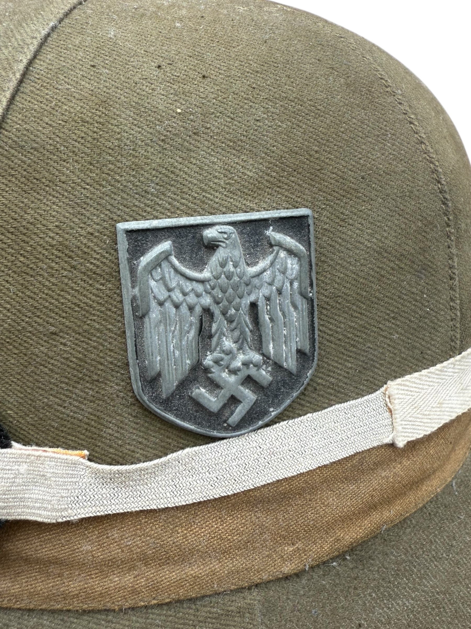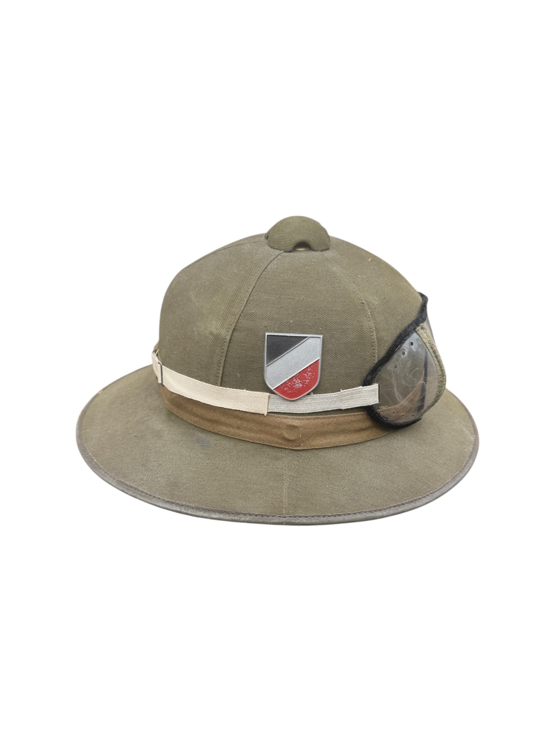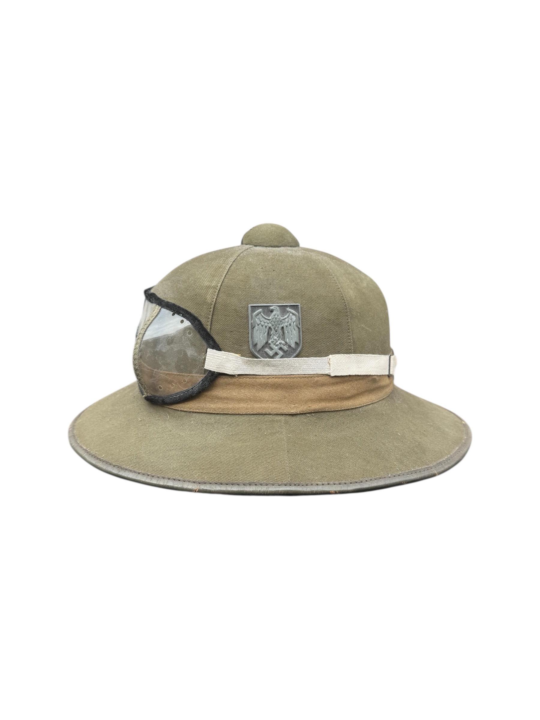 Duitse WO2 tropenhelm in nette staat. Het betreft een maat 57, geproduceerd door Keller & Co. Alle markeringen zijn nog goed zichtbaar en de stofbril wordt bij de aankoop meegeleverd.
