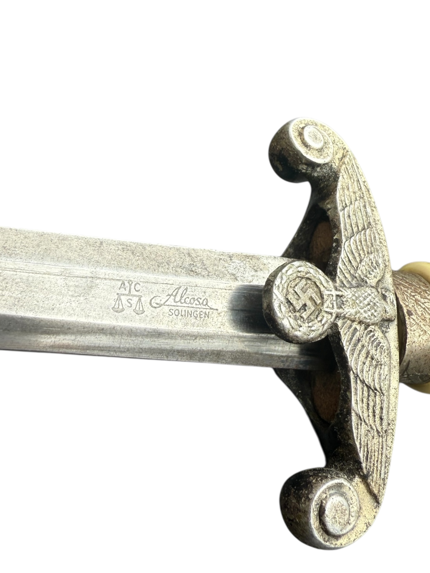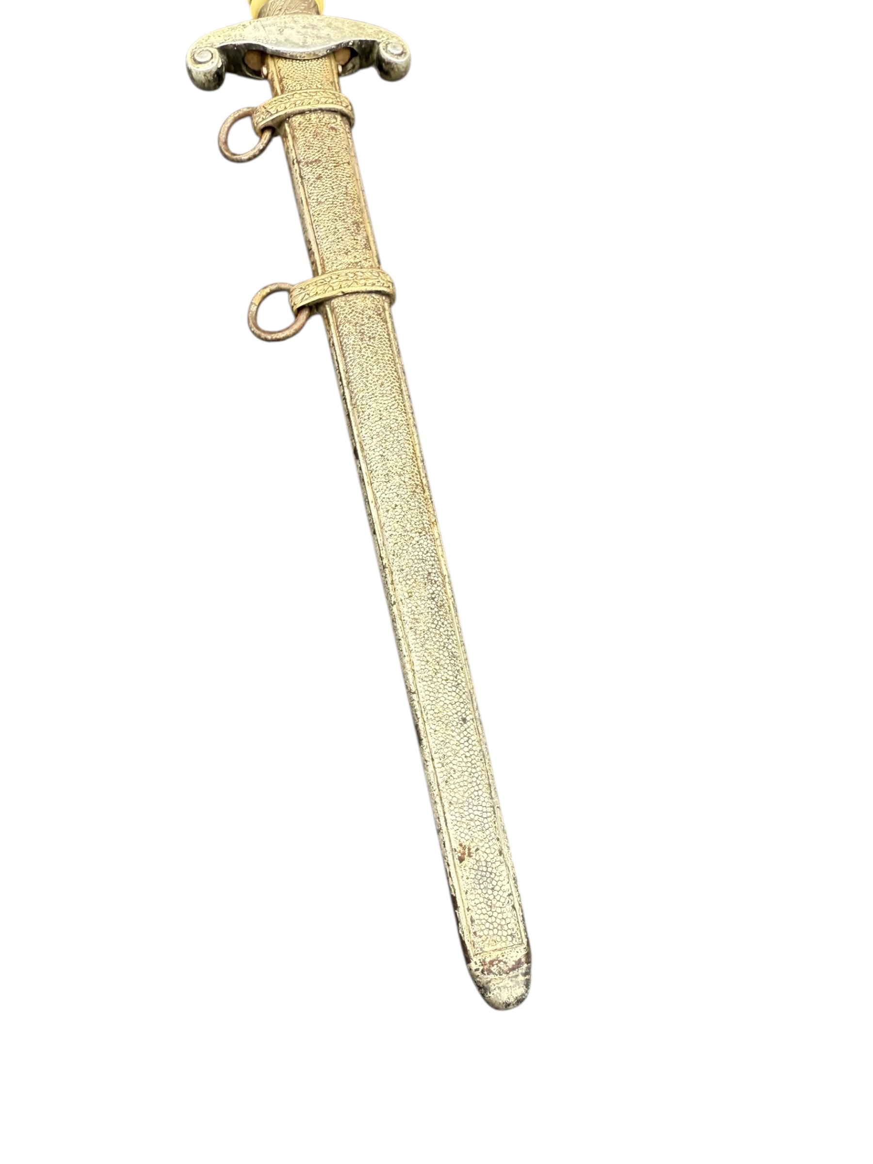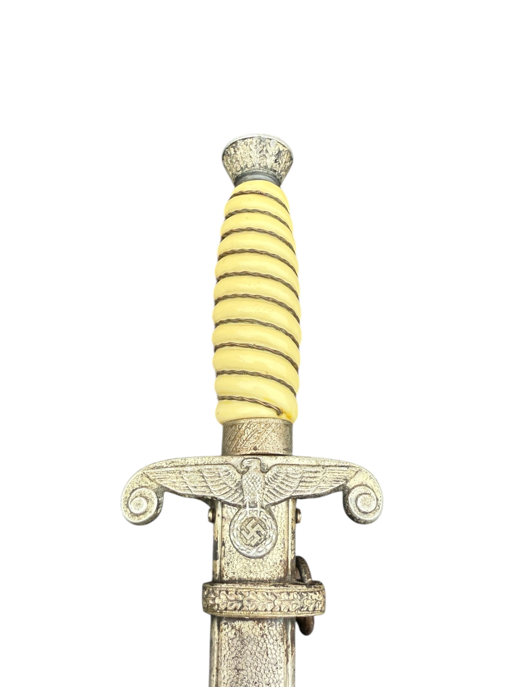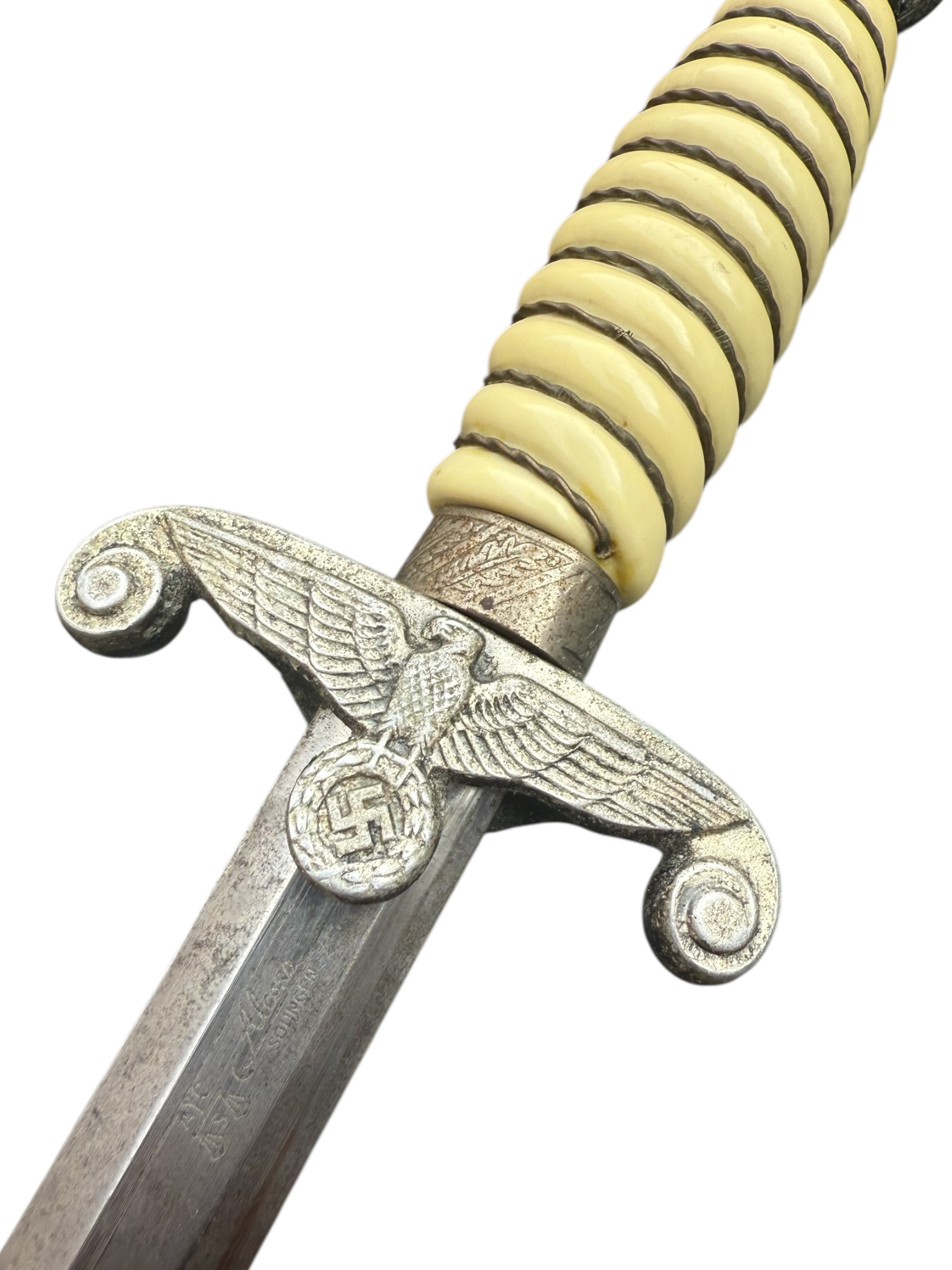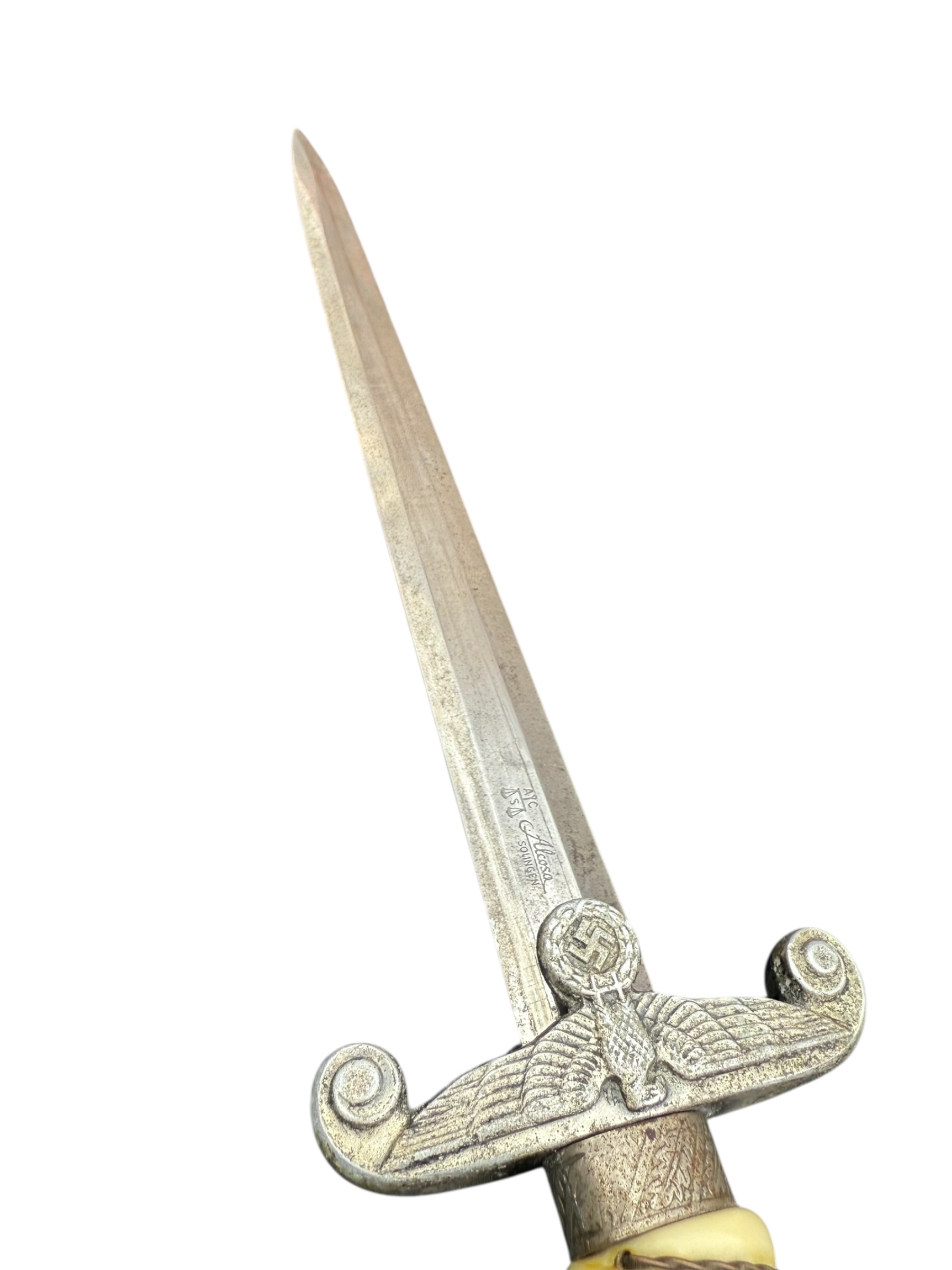 Duitse WO2 Wehrmacht officiersdolk in goede gebruikte staat, geproduceerd door Alcoso Solingen. Enkele gebruikssporen zijn zichtbaar, maar het lemmet is niet geslepen. De totale lengte zonder schede is circa 37 cm en met schede circa 40 cm. Vanwege de huisregels is betaling via PayPal helaas niet toegestaan. Verkoop uitsluitend aan personen van 18 jaar en ouder.
