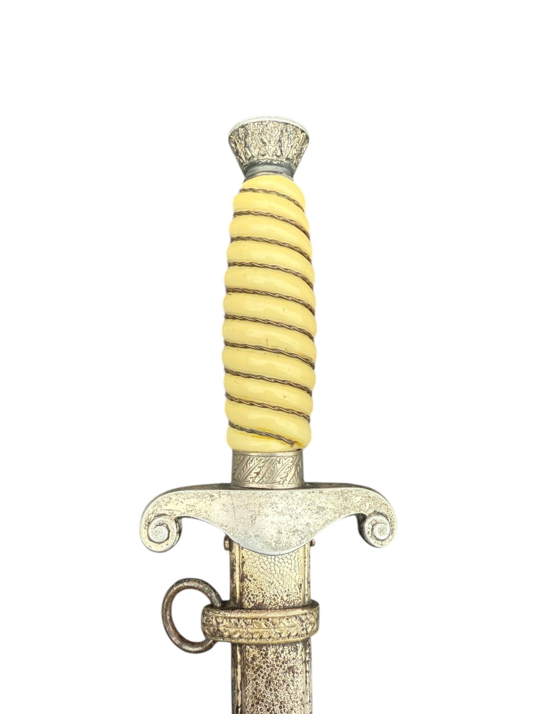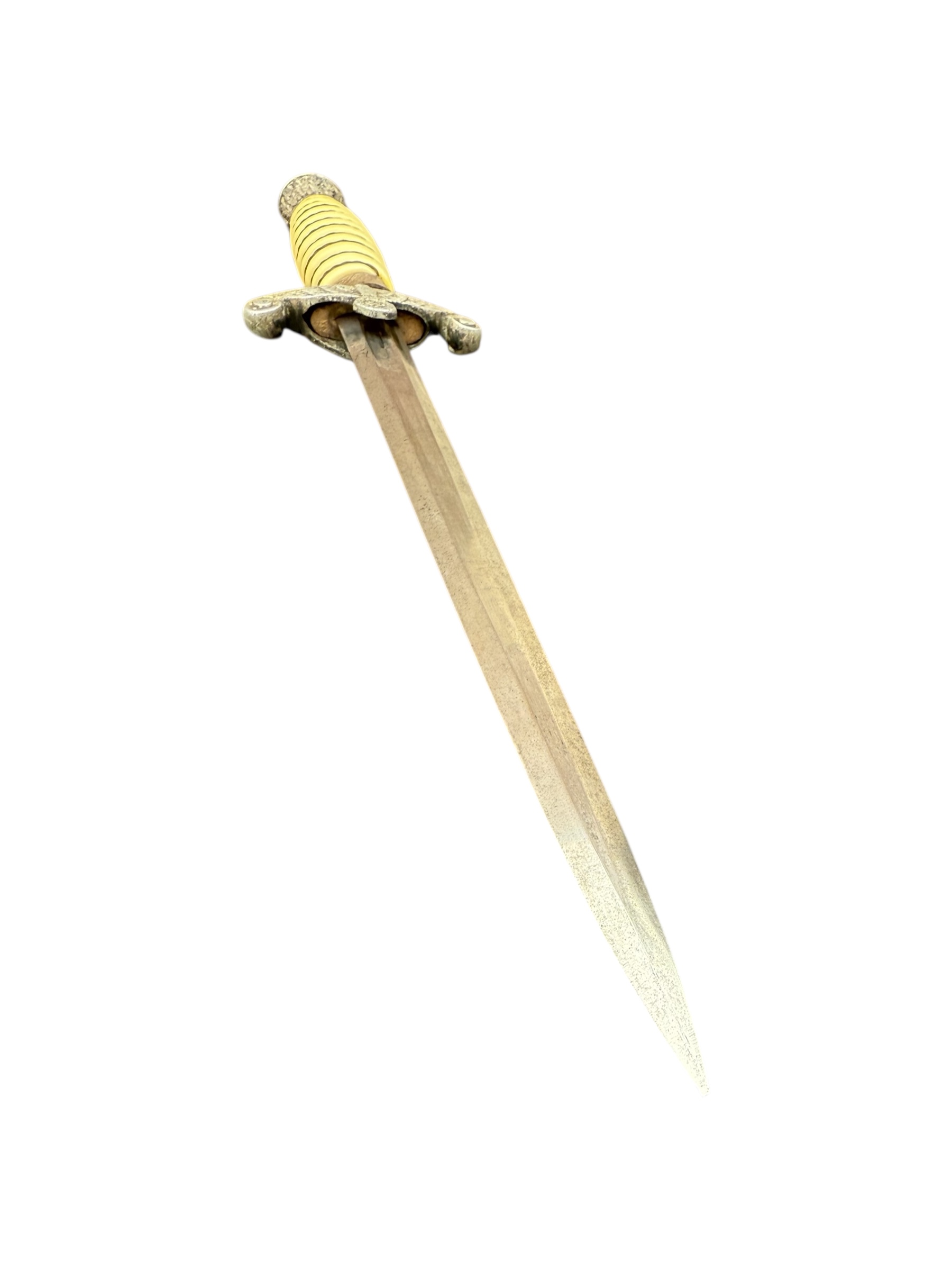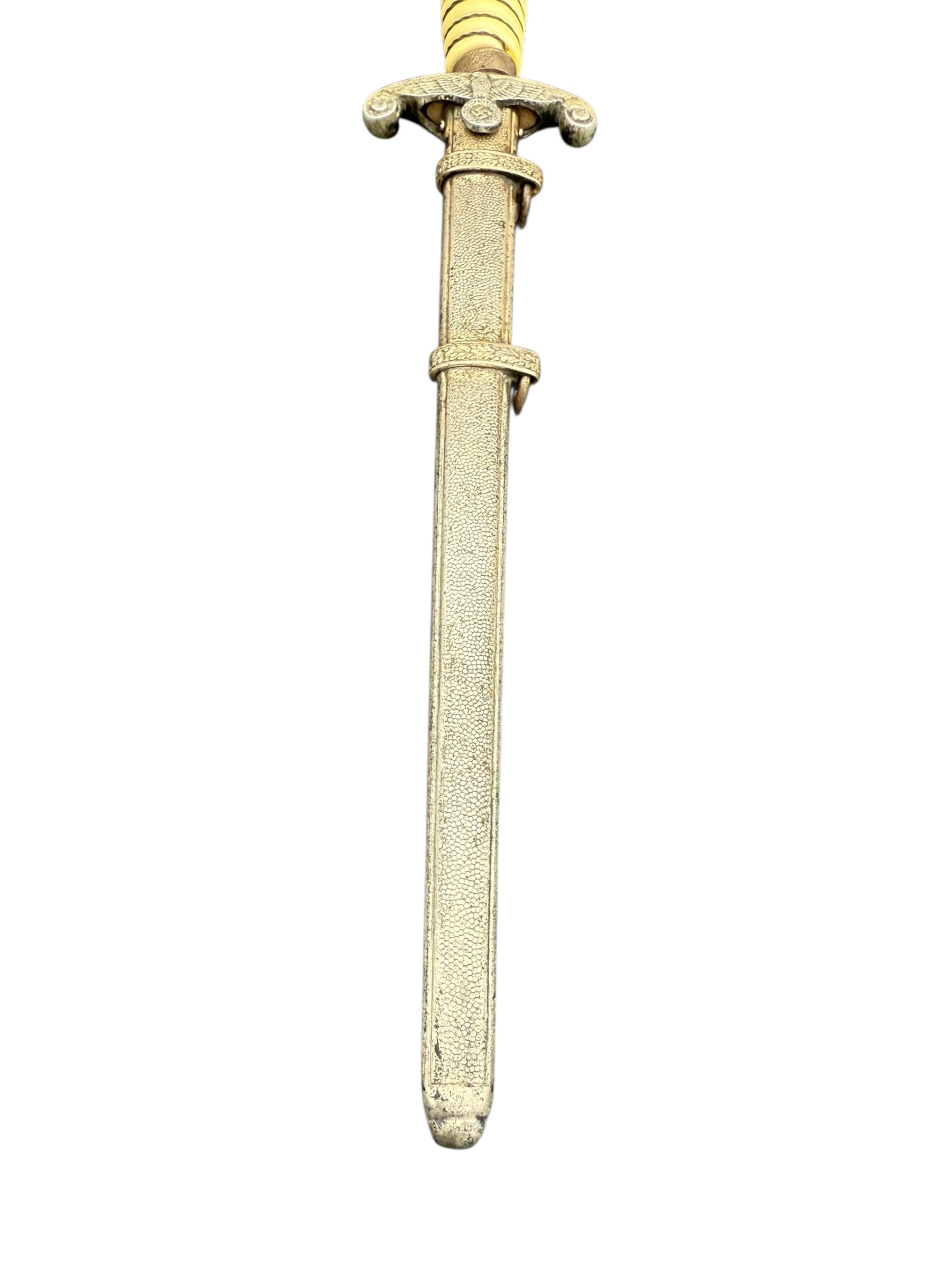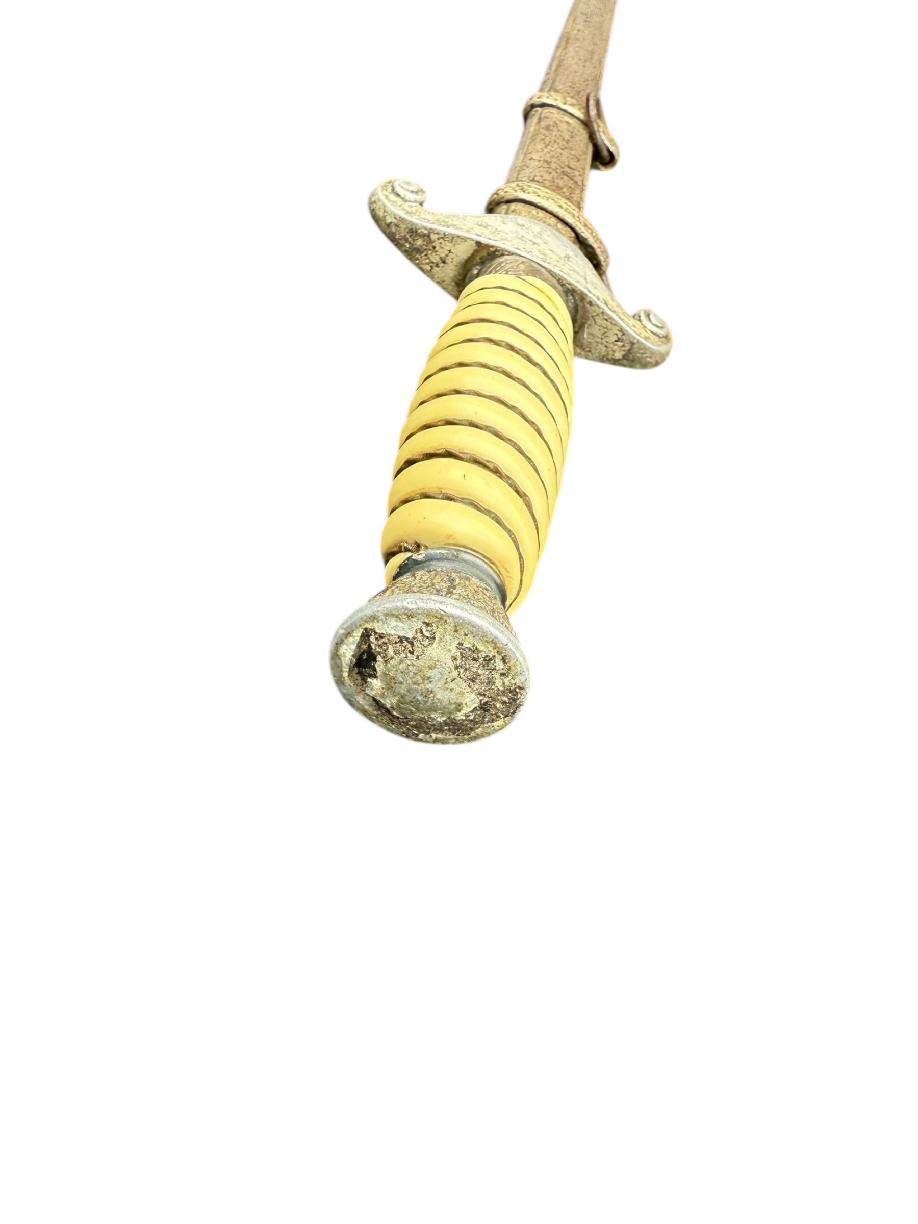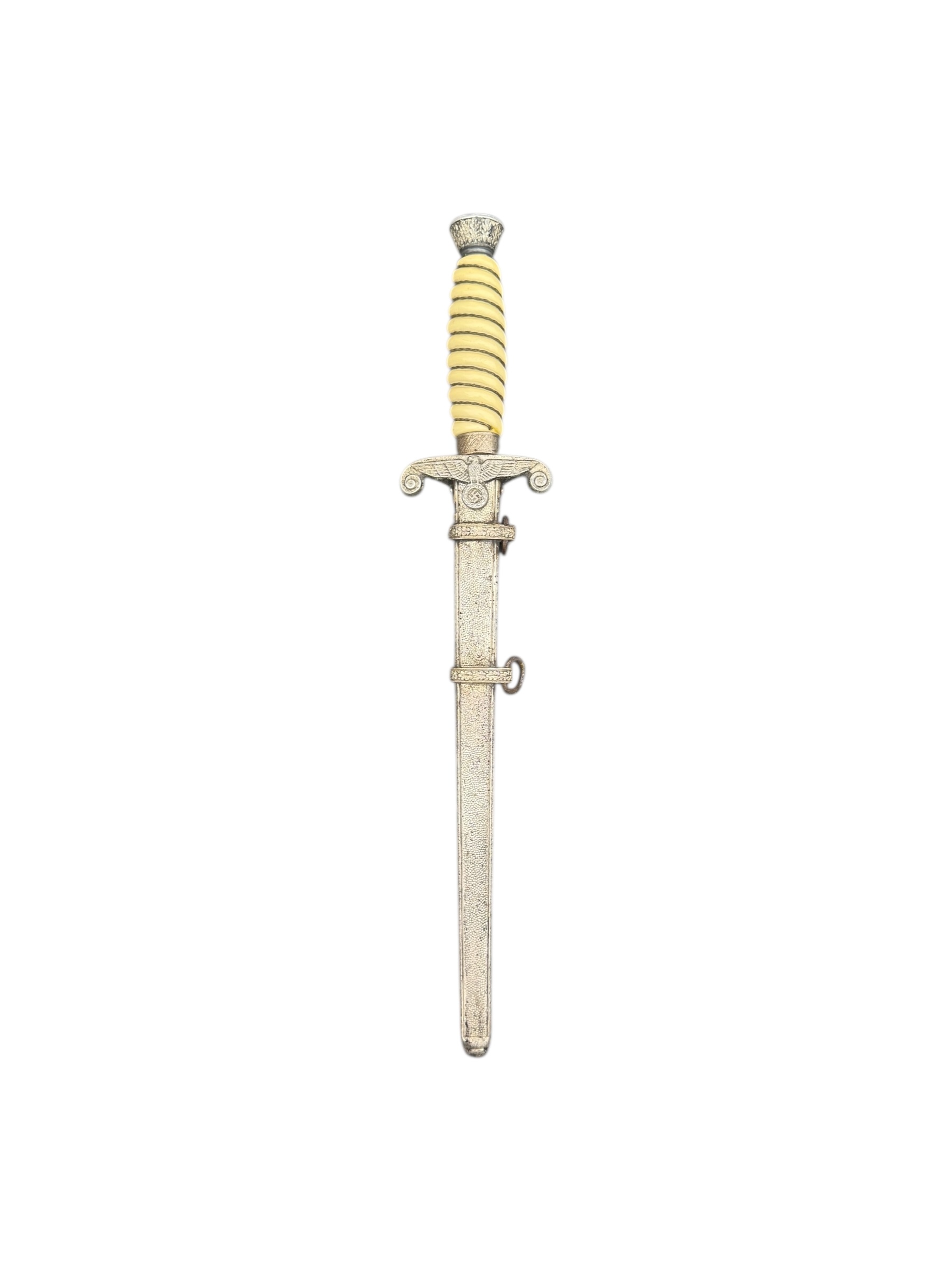 Duitse WO2 Wehrmacht officiersdolk in goede gebruikte staat, geproduceerd door Alcoso Solingen. Enkele gebruikssporen zijn zichtbaar, maar het lemmet is niet geslepen. De totale lengte zonder schede is circa 37 cm en met schede circa 40 cm. Vanwege de huisregels is betaling via PayPal helaas niet toegestaan. Verkoop uitsluitend aan personen van 18 jaar en ouder.