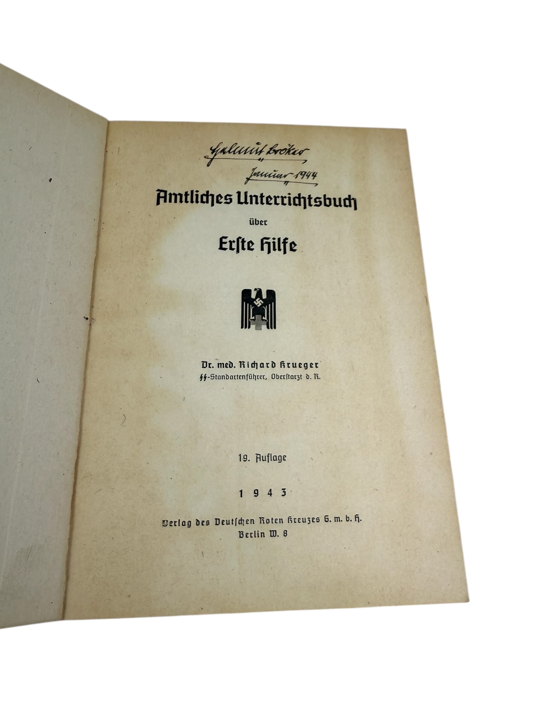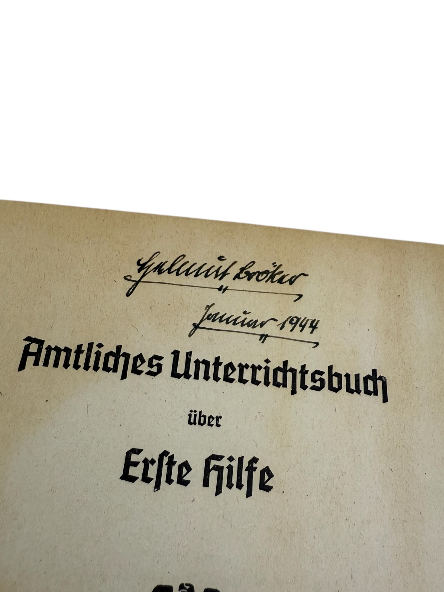 Duits WO2 DRK Amtliches Unterrichtsbuch Erste Hilfe in nette, gebruikte staat. Dit exemplaar heeft een harde kaft en is 1943 gedateerd.