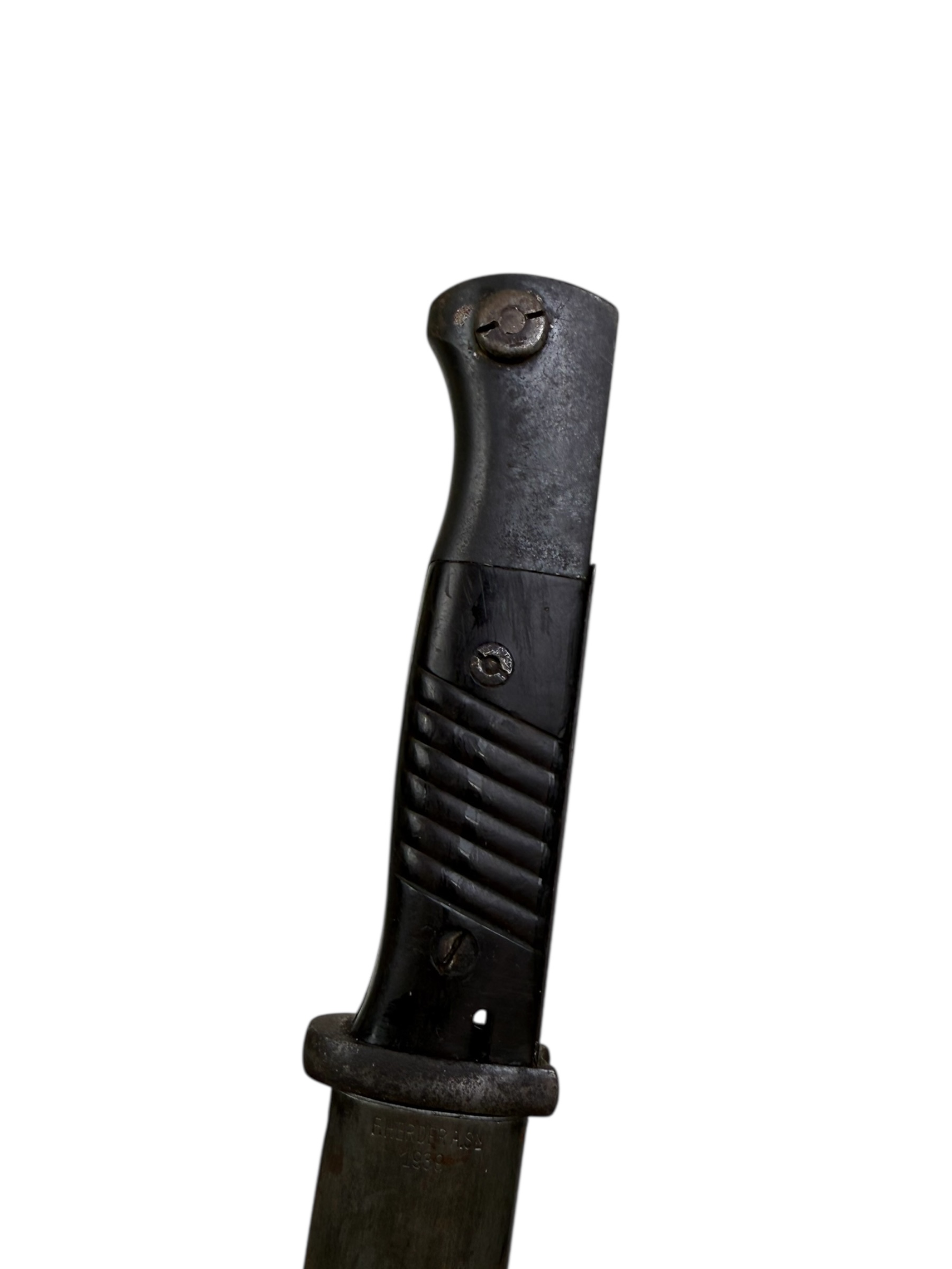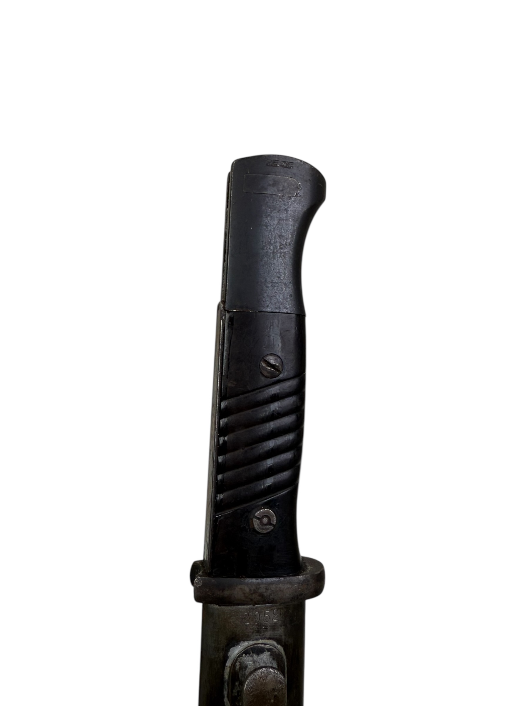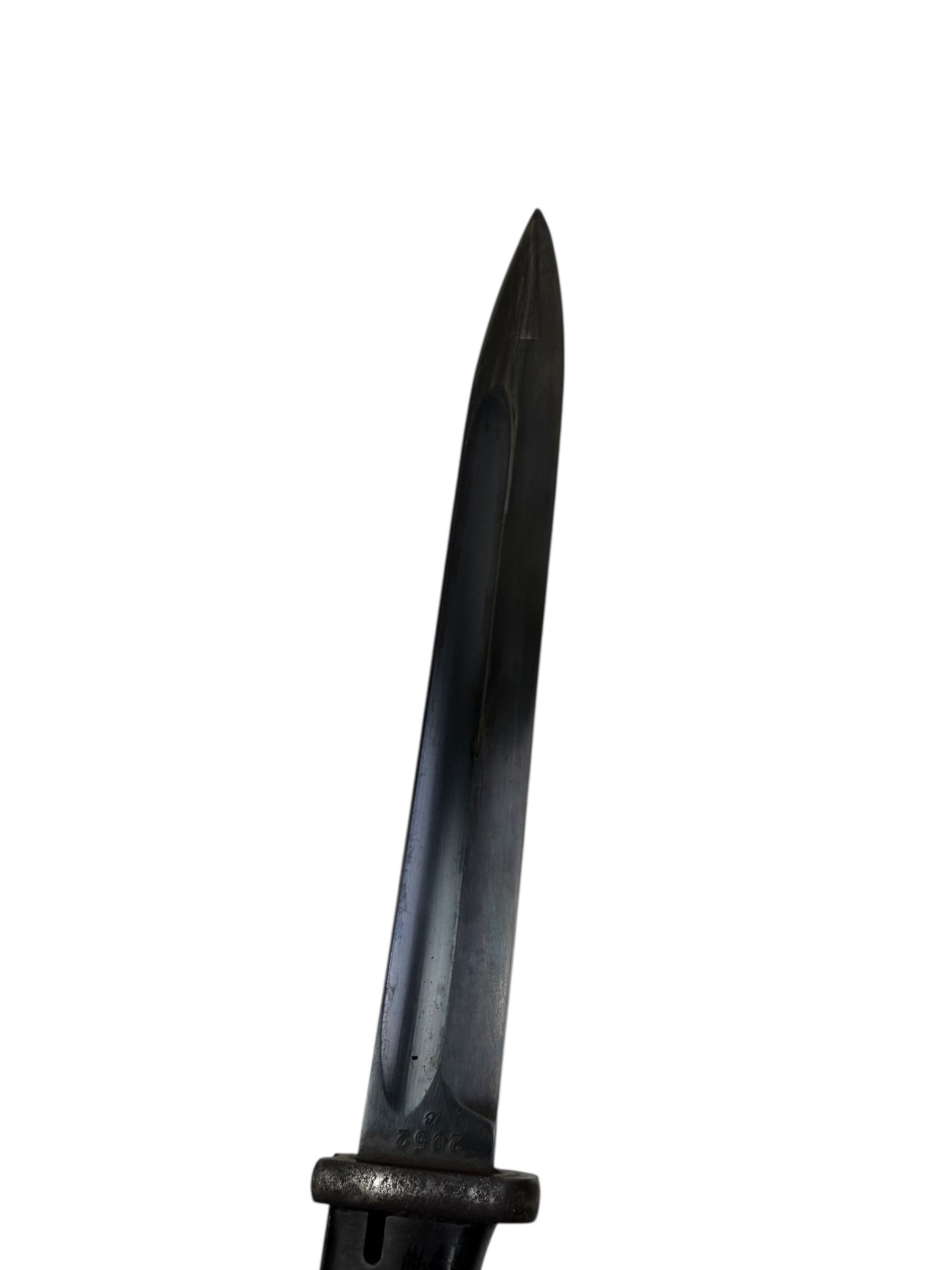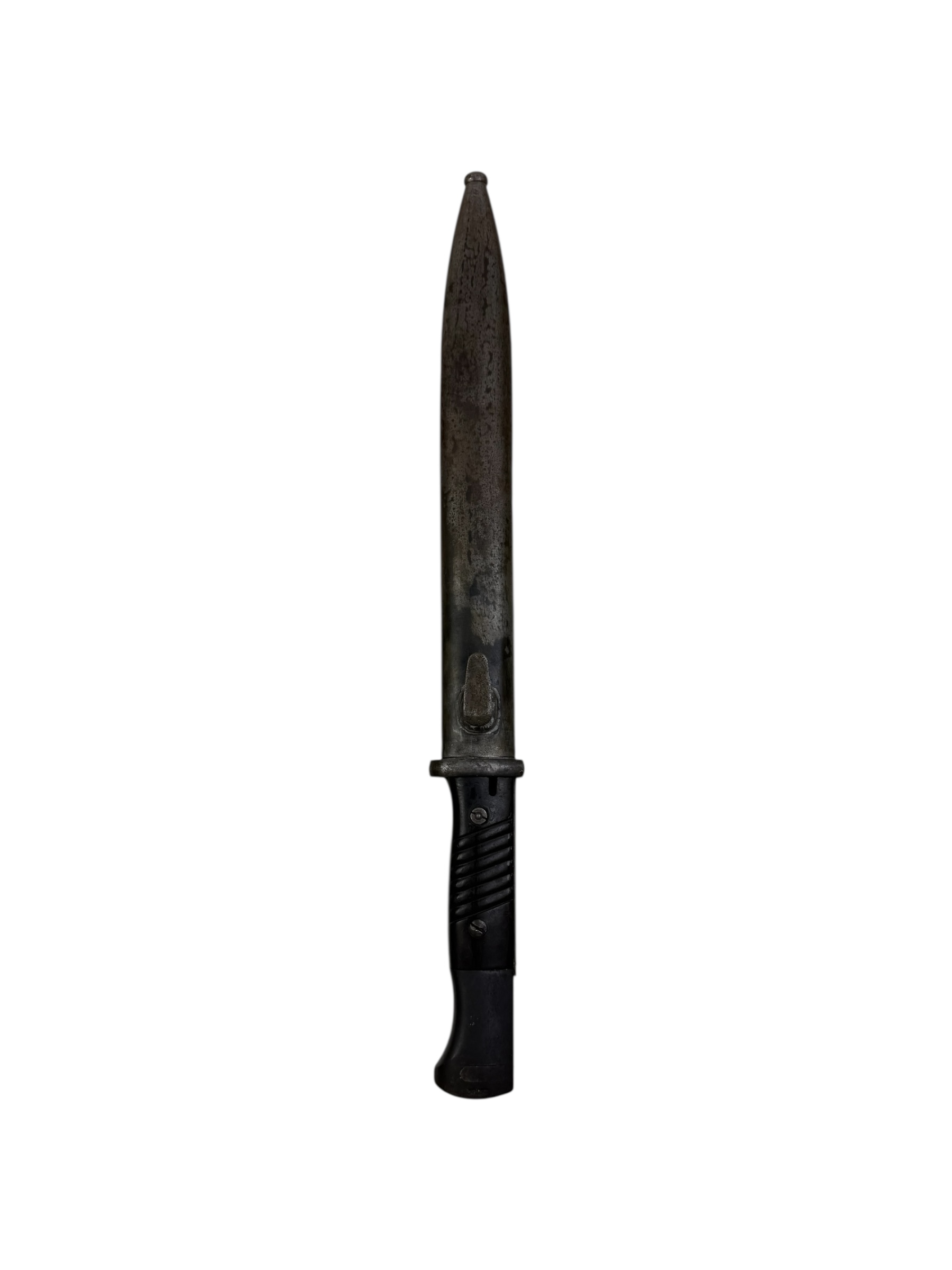 Duitse WO2 K98 bajonet in gebruikte staat. Diverse WaA markeringen zijn aanwezig en ook de producentenkenmerken zijn nog duidelijk zichtbaar. Het lemmet is ongeslepen en de blauwing is grotendeels behouden. Let op: vanwege de huisregels kan dit item niet via PayPal worden afgerekend. Verkoop uitsluitend aan personen van 18 jaar en ouder.