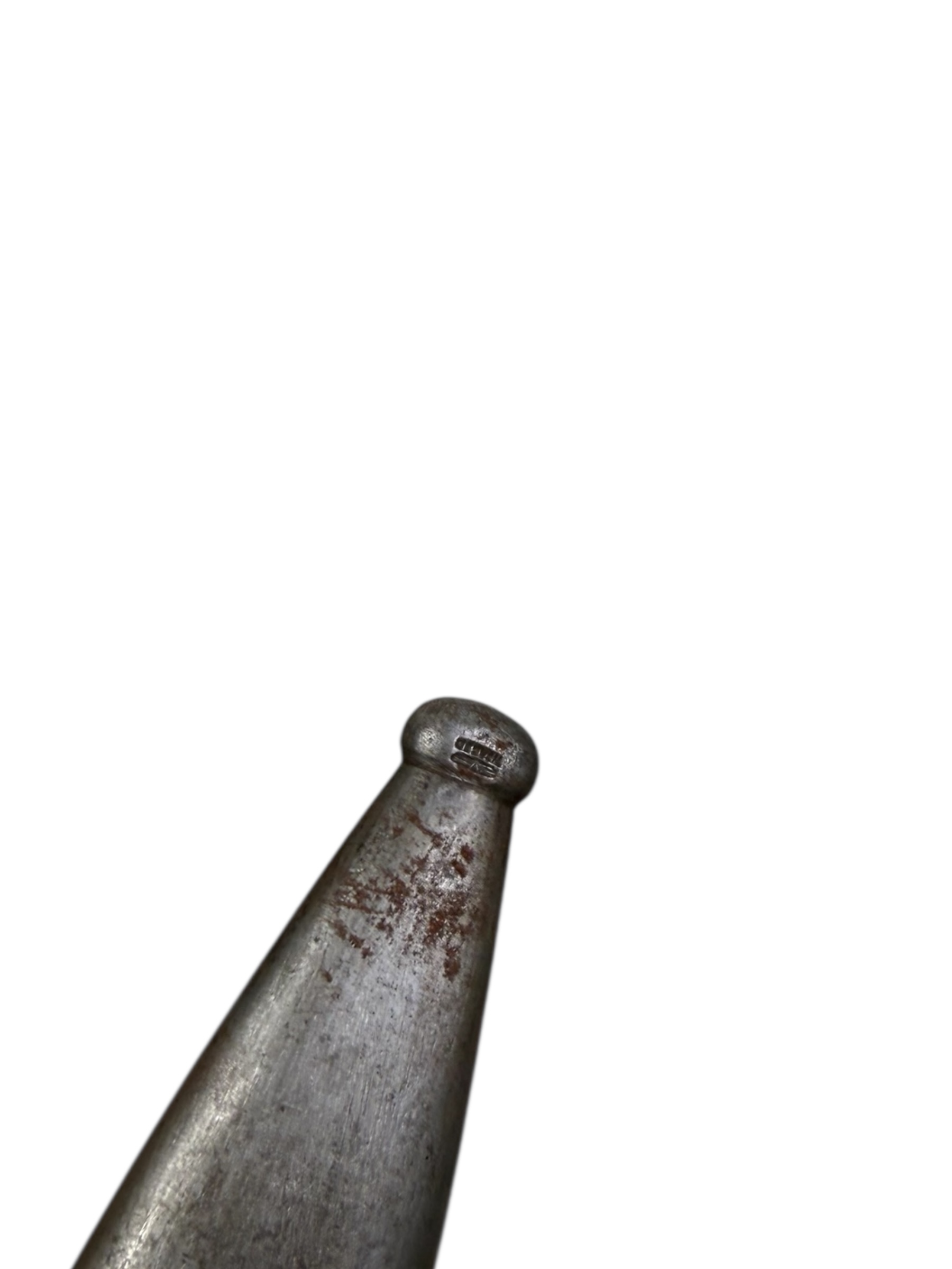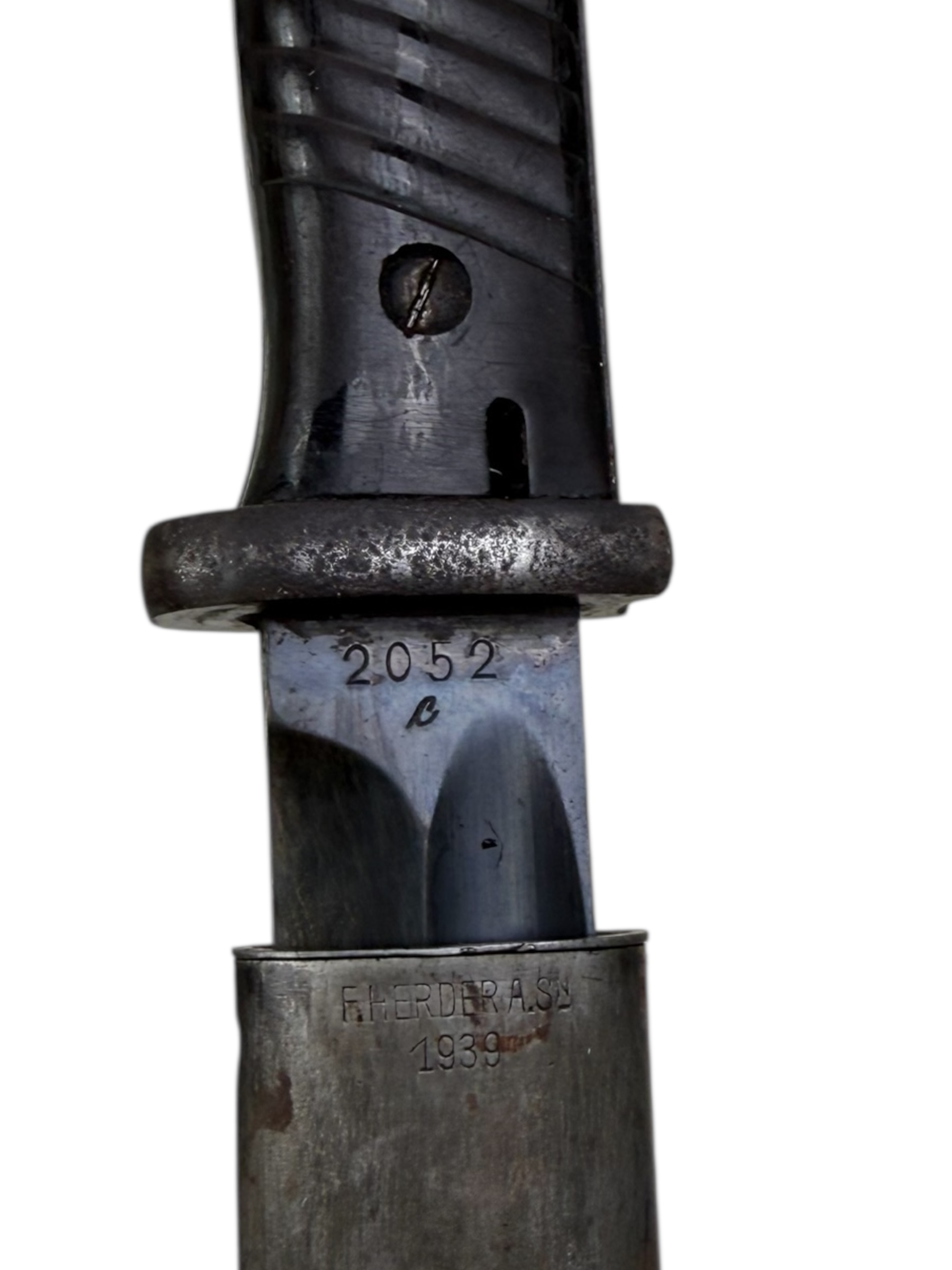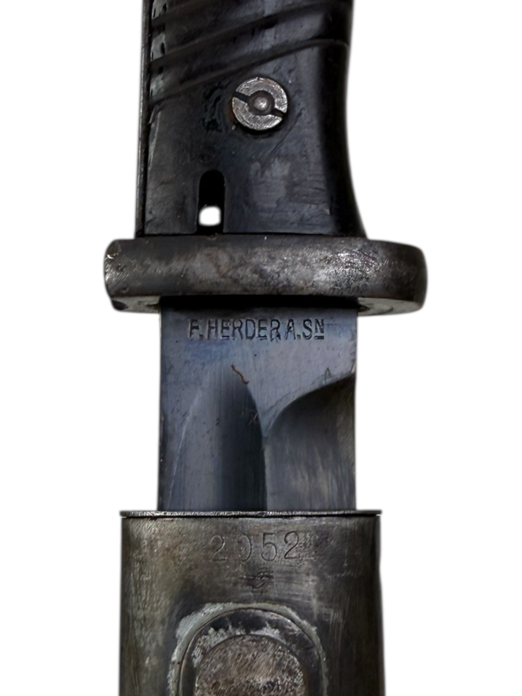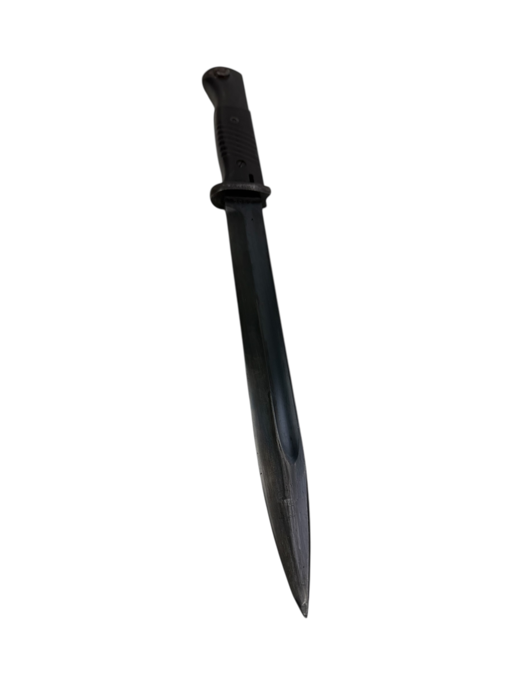 Duitse WO2 K98 bajonet in gebruikte staat. Diverse WaA markeringen zijn aanwezig en ook de producentenkenmerken zijn nog duidelijk zichtbaar. Het lemmet is ongeslepen en de blauwing is grotendeels behouden. Let op: vanwege de huisregels kan dit item niet via PayPal worden afgerekend. Verkoop uitsluitend aan personen van 18 jaar en ouder.