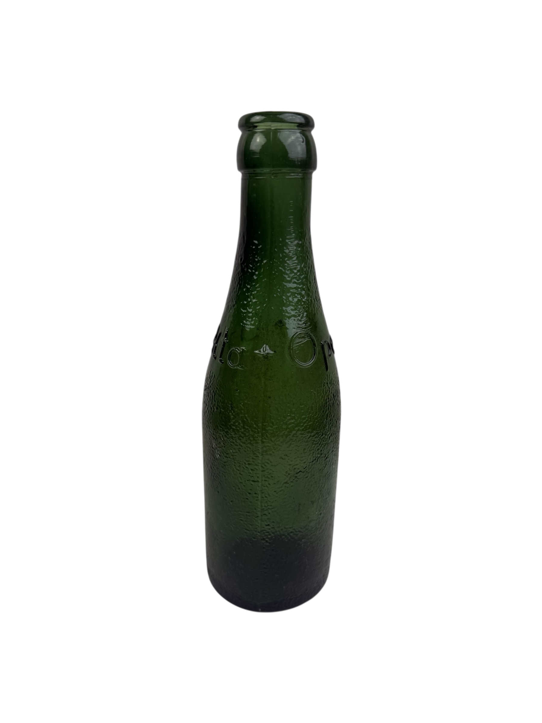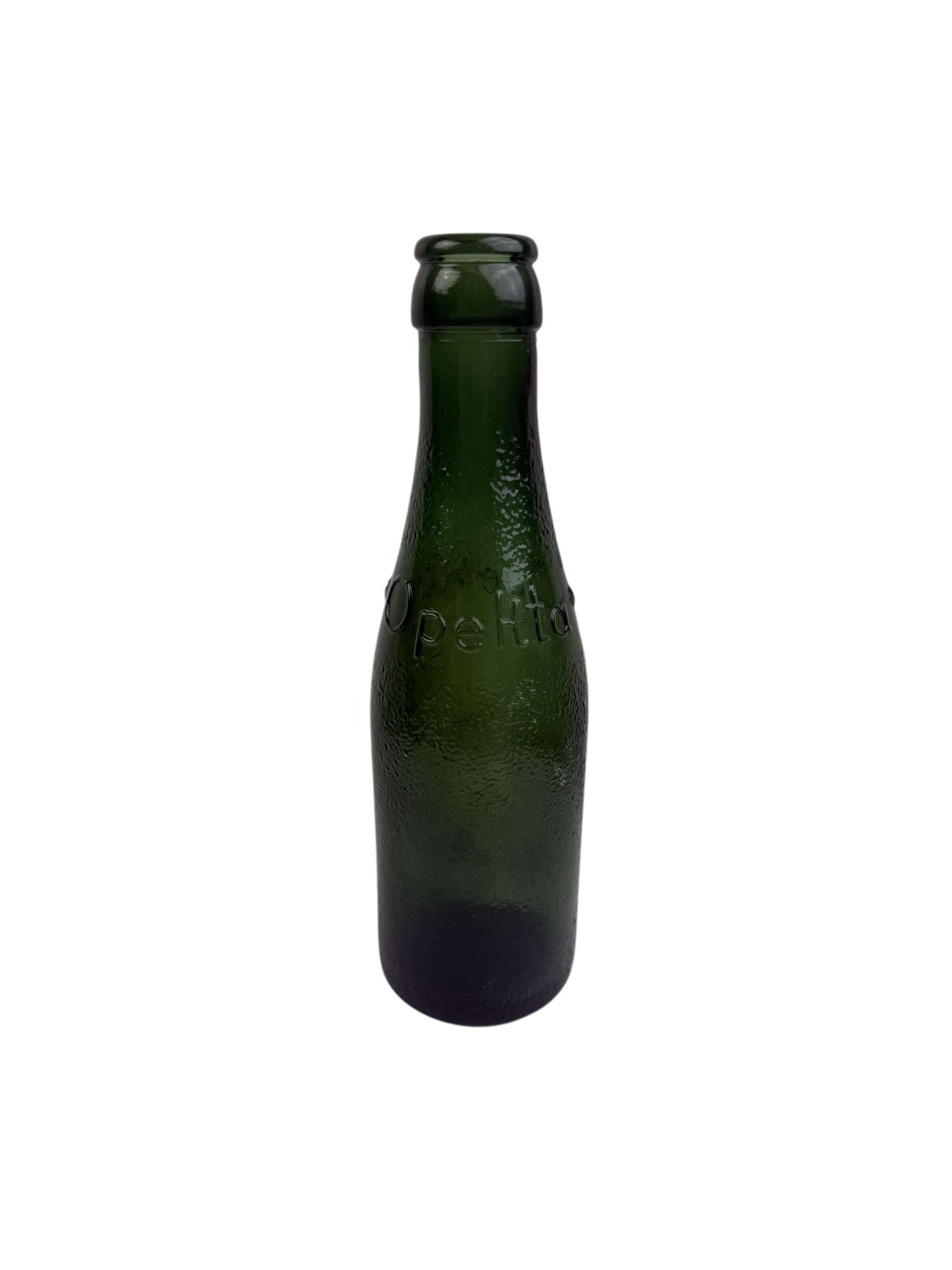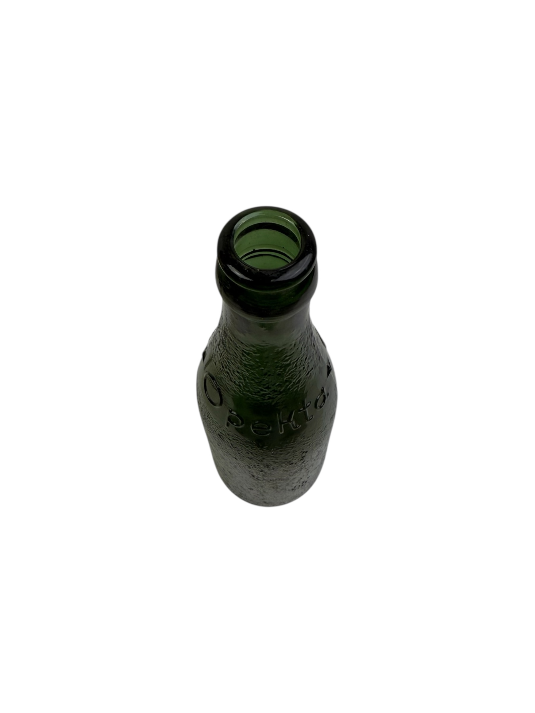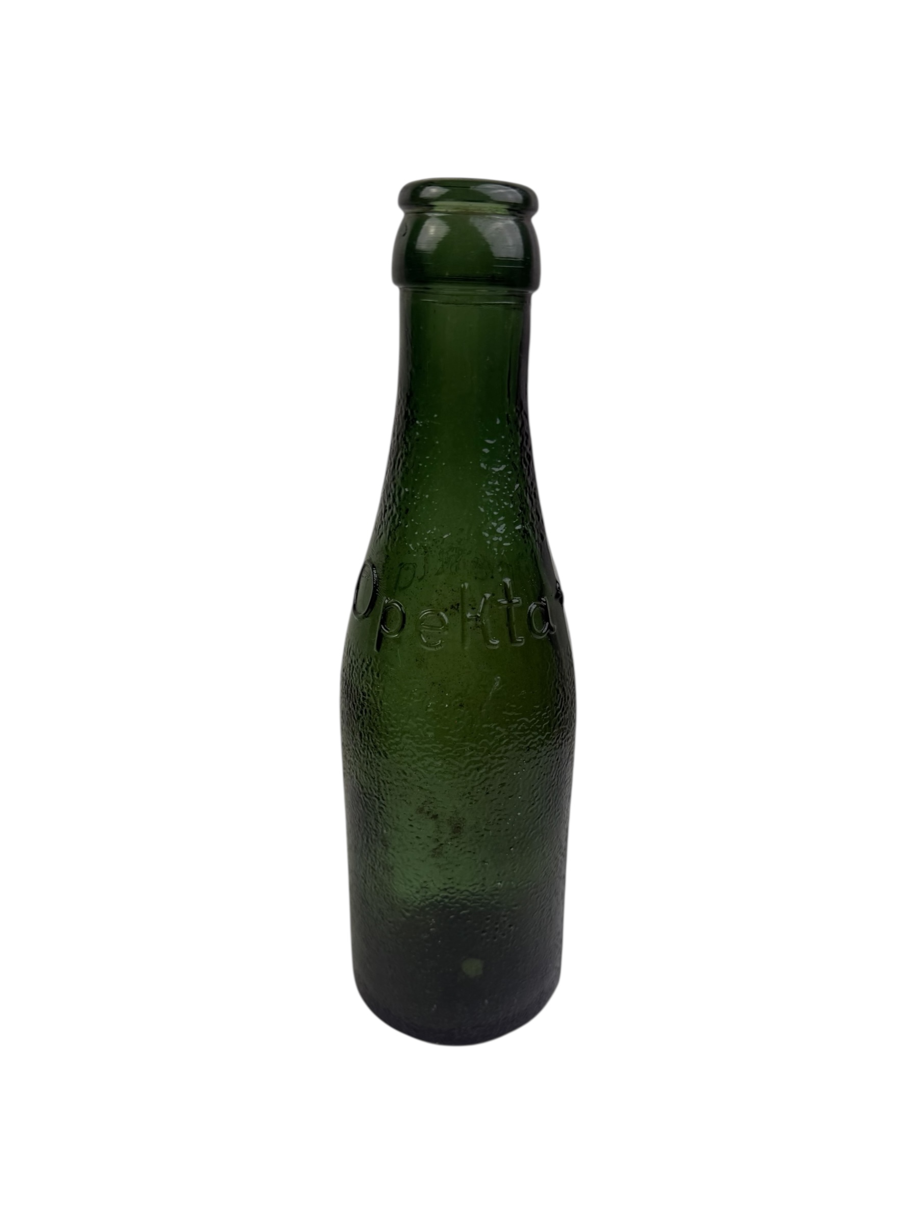Nederlandse WO2 Opekta vruchtensapfles in goede, ongereinigde staat. Otto Frank, de vader van Anne Frank, was eigenaar van Opekta Nederland. Tijdens de bezetting werd er nog steeds Opekta geproduceerd in het benedenhuis, terwijl de familie in het Achterhuis ondergedoken zat. Het glas is verder onbeschadigd en de markeringen zijn duidelijk zichtbaar. Het betreft bovendien de kleine groene uitgave.