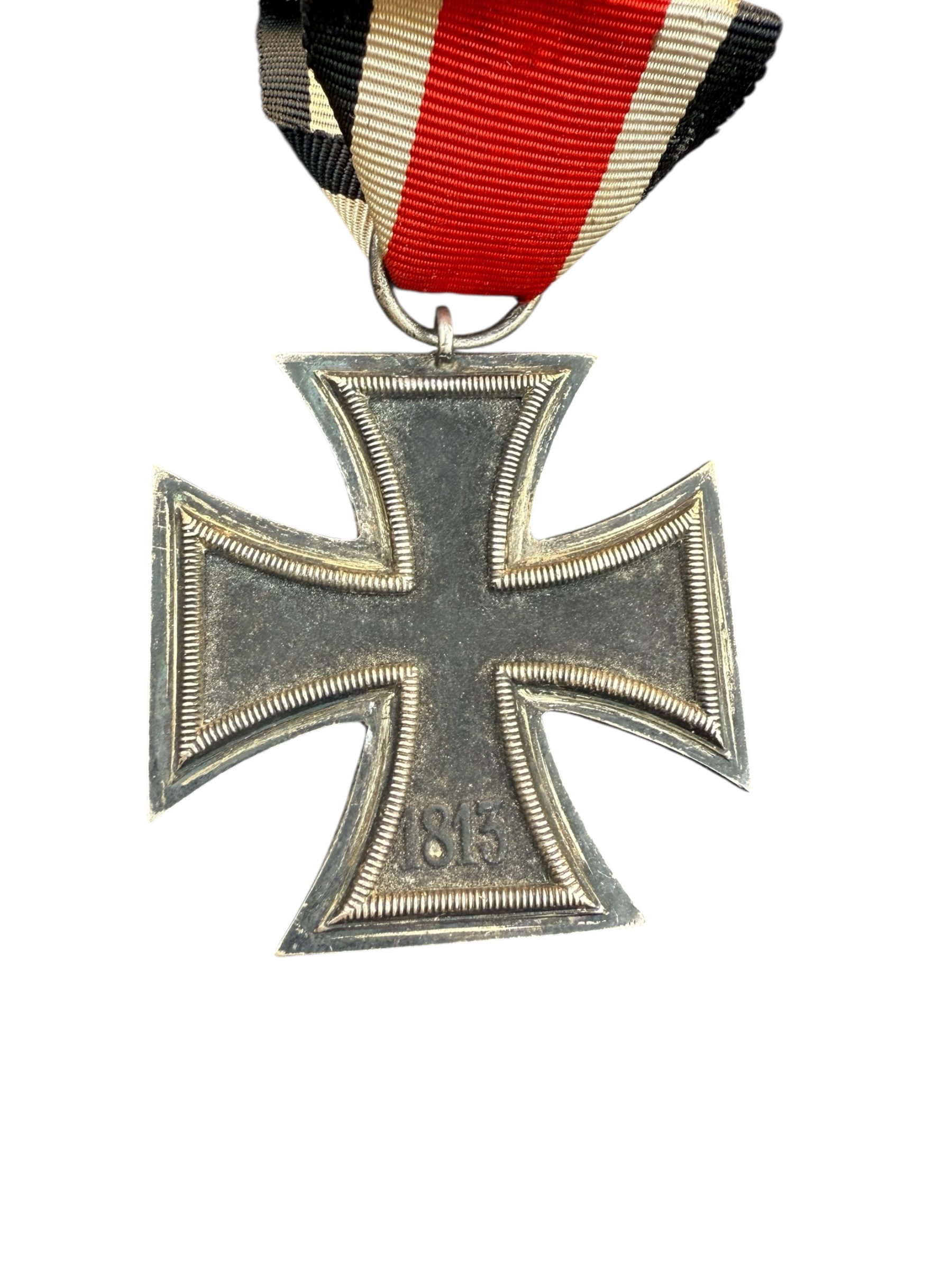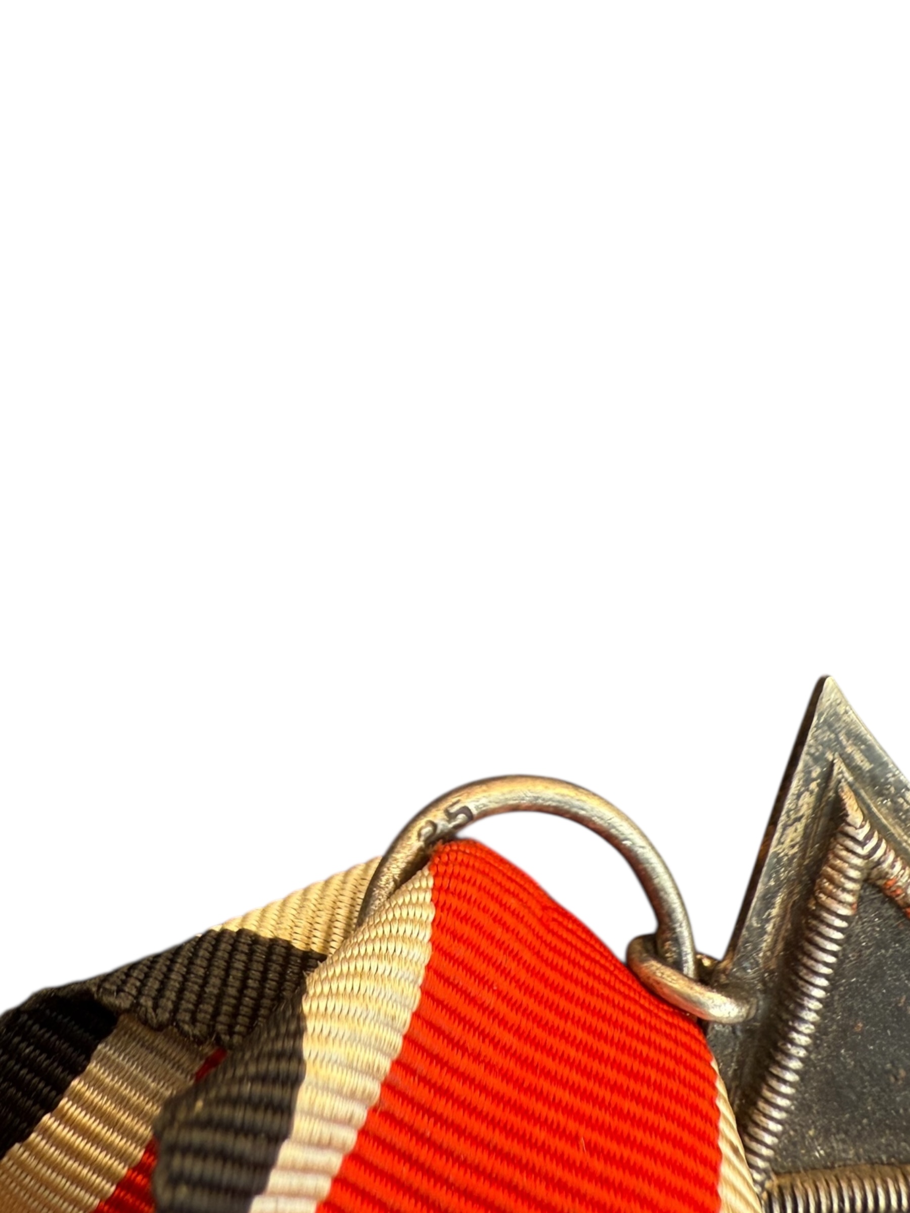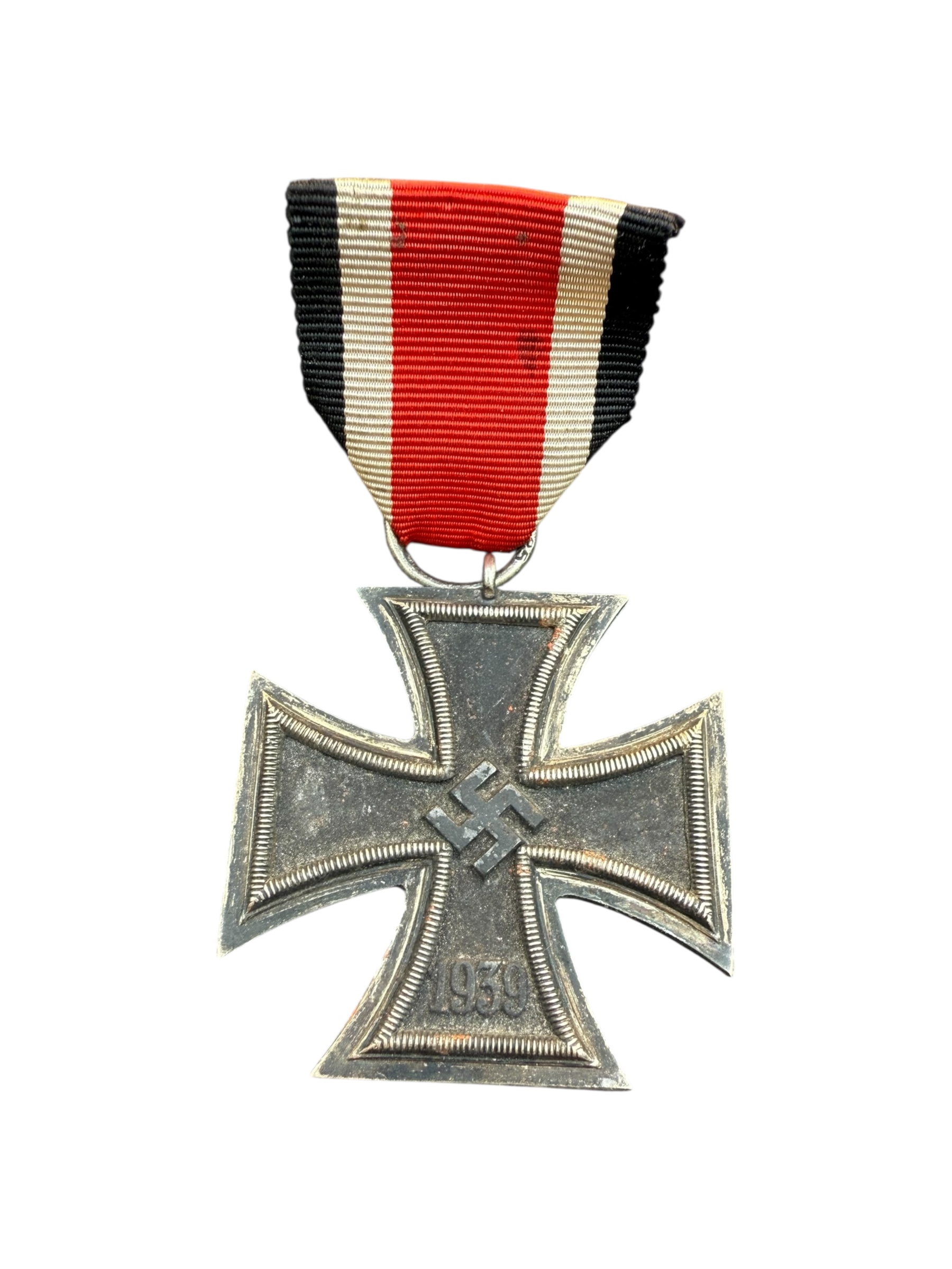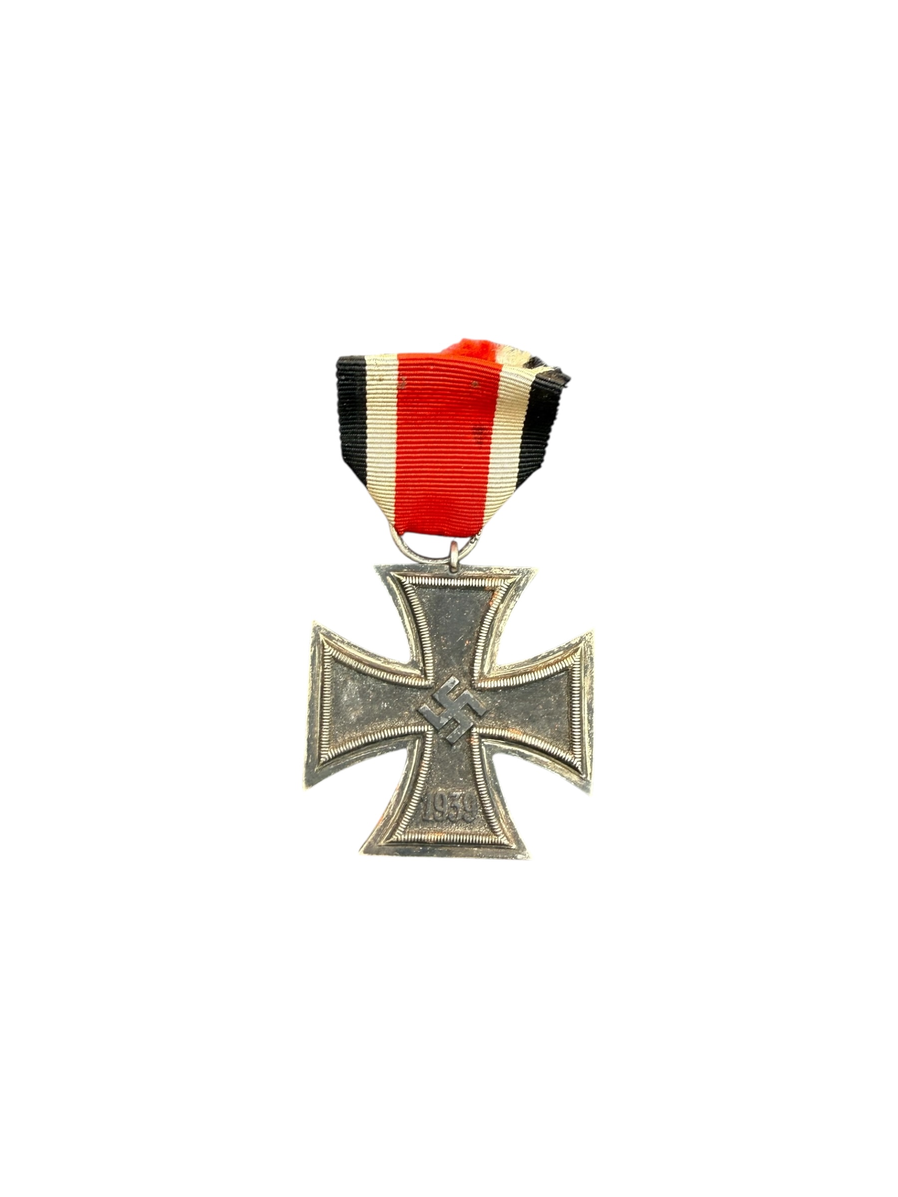 Duits WO2 IJzeren Kruis EK2 medaille. Dit exemplaar is gemarkeerd met maker 25, wat verwijst naar productie door Arbeitsgemeinschaft der Graveur, Gold und Silberschmiede Innungen, Hanau. De medaille verkeert in gedragen staat en heeft een vrij kort lint.