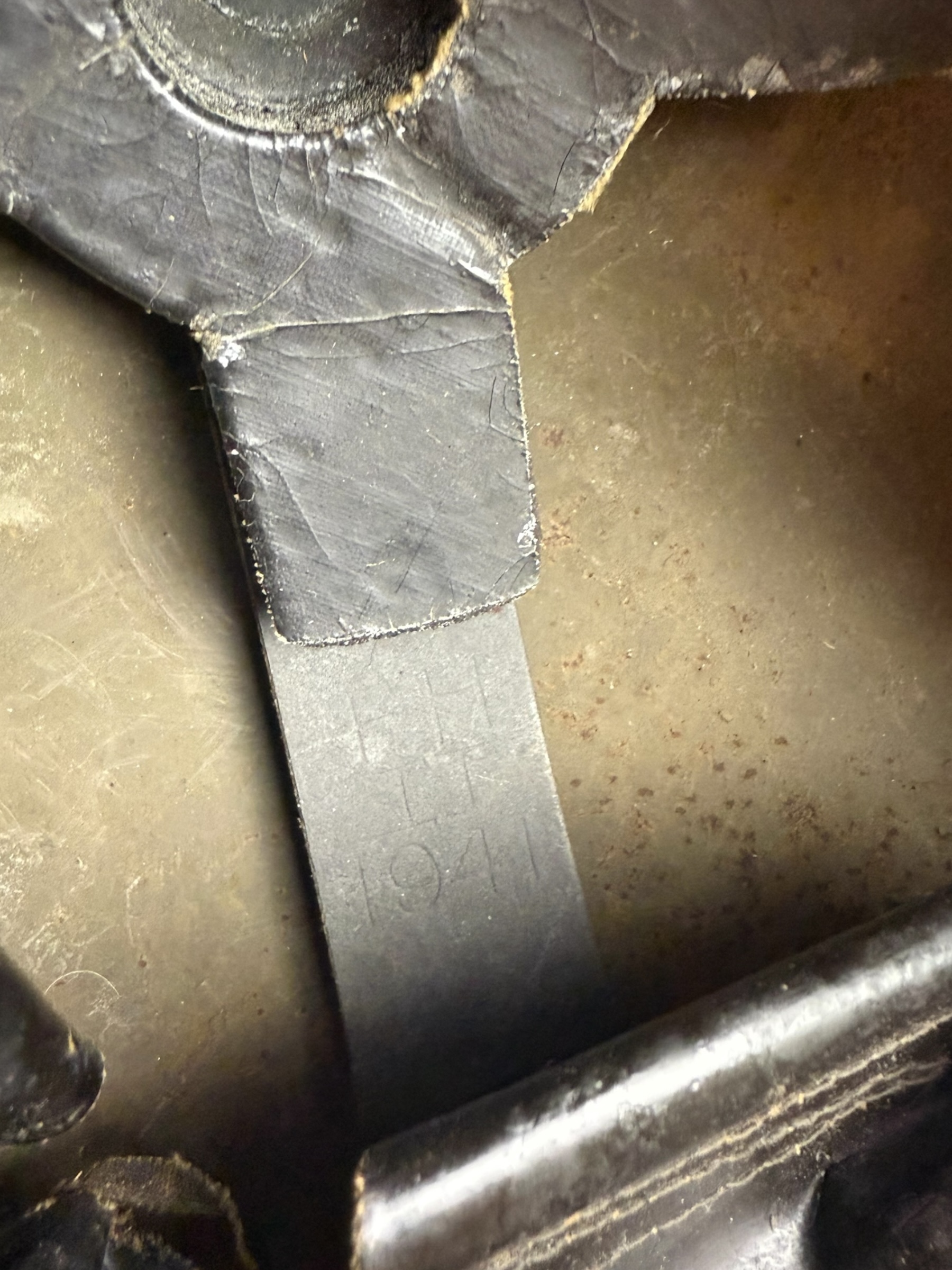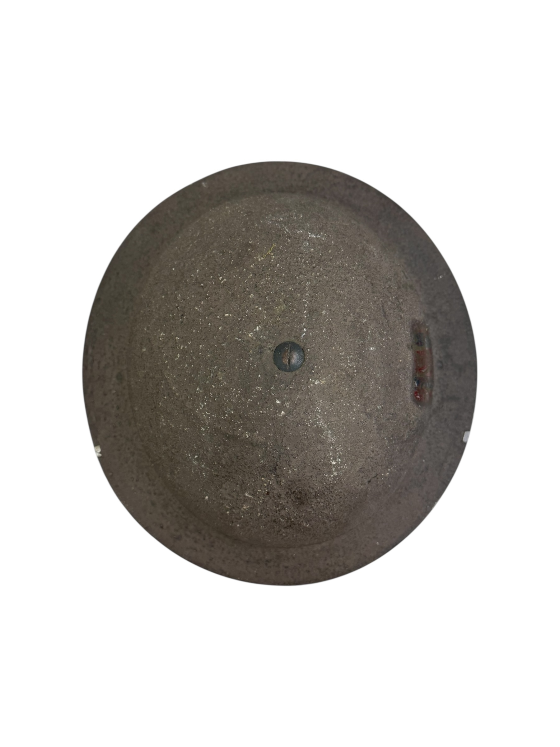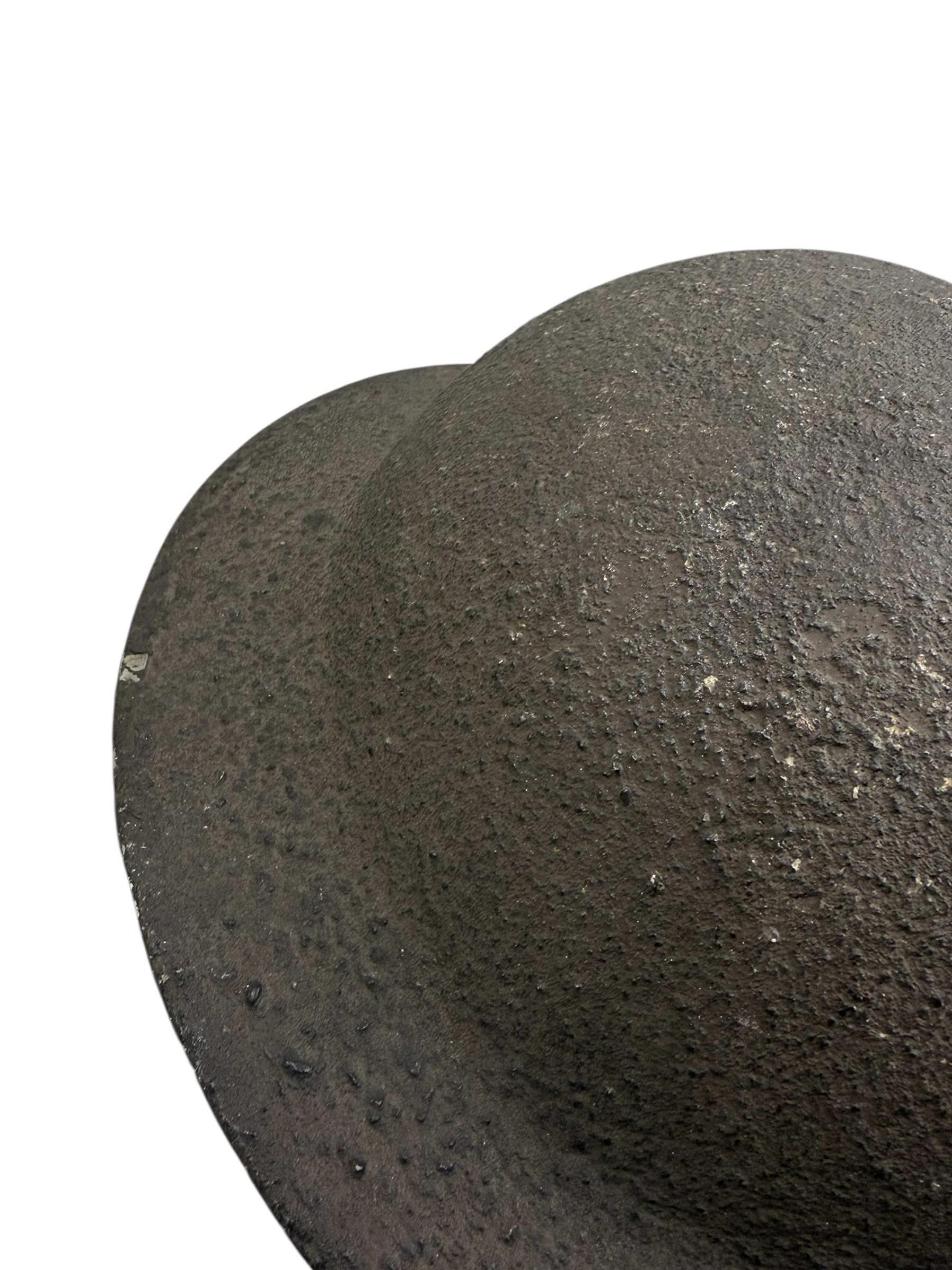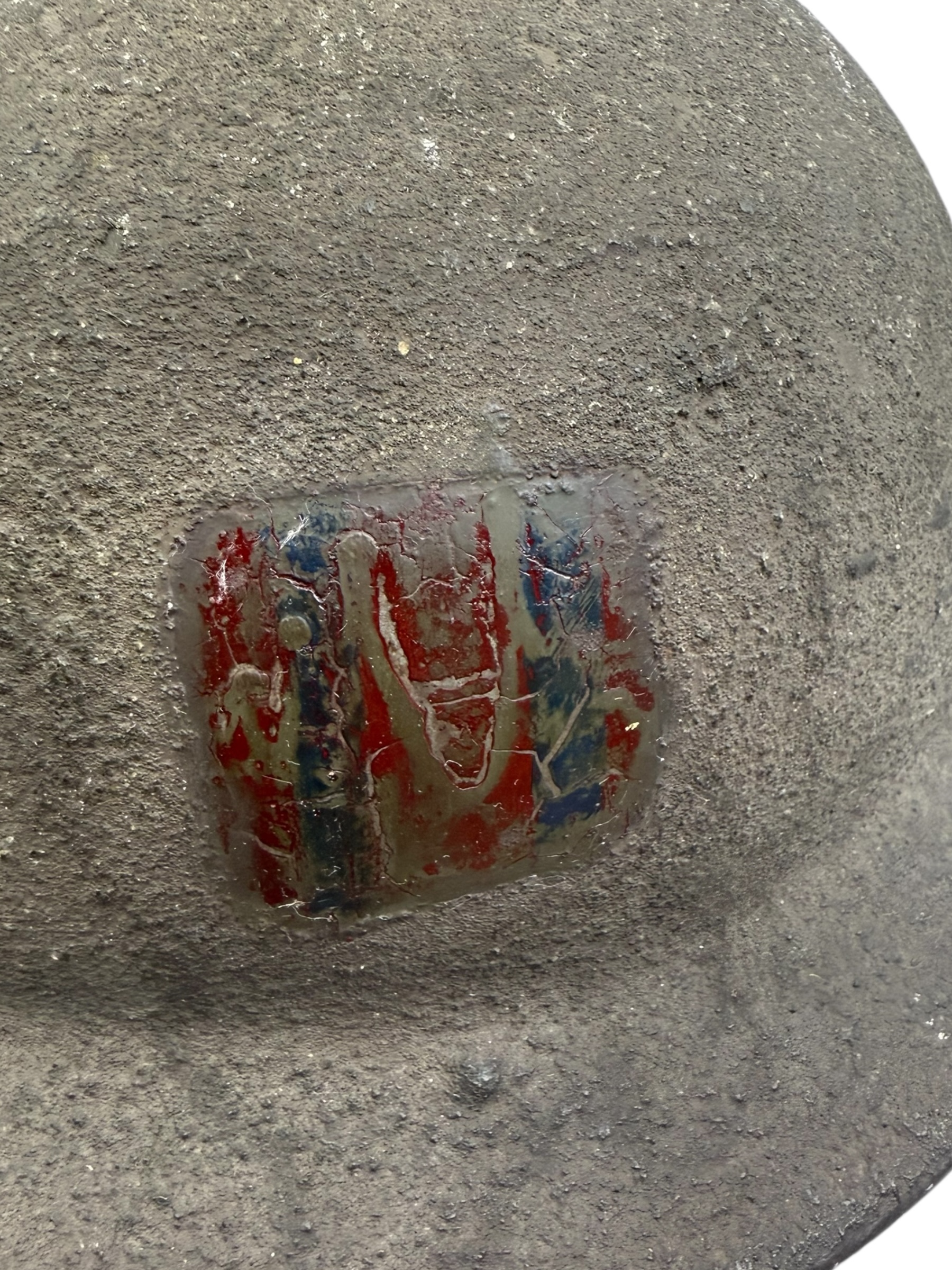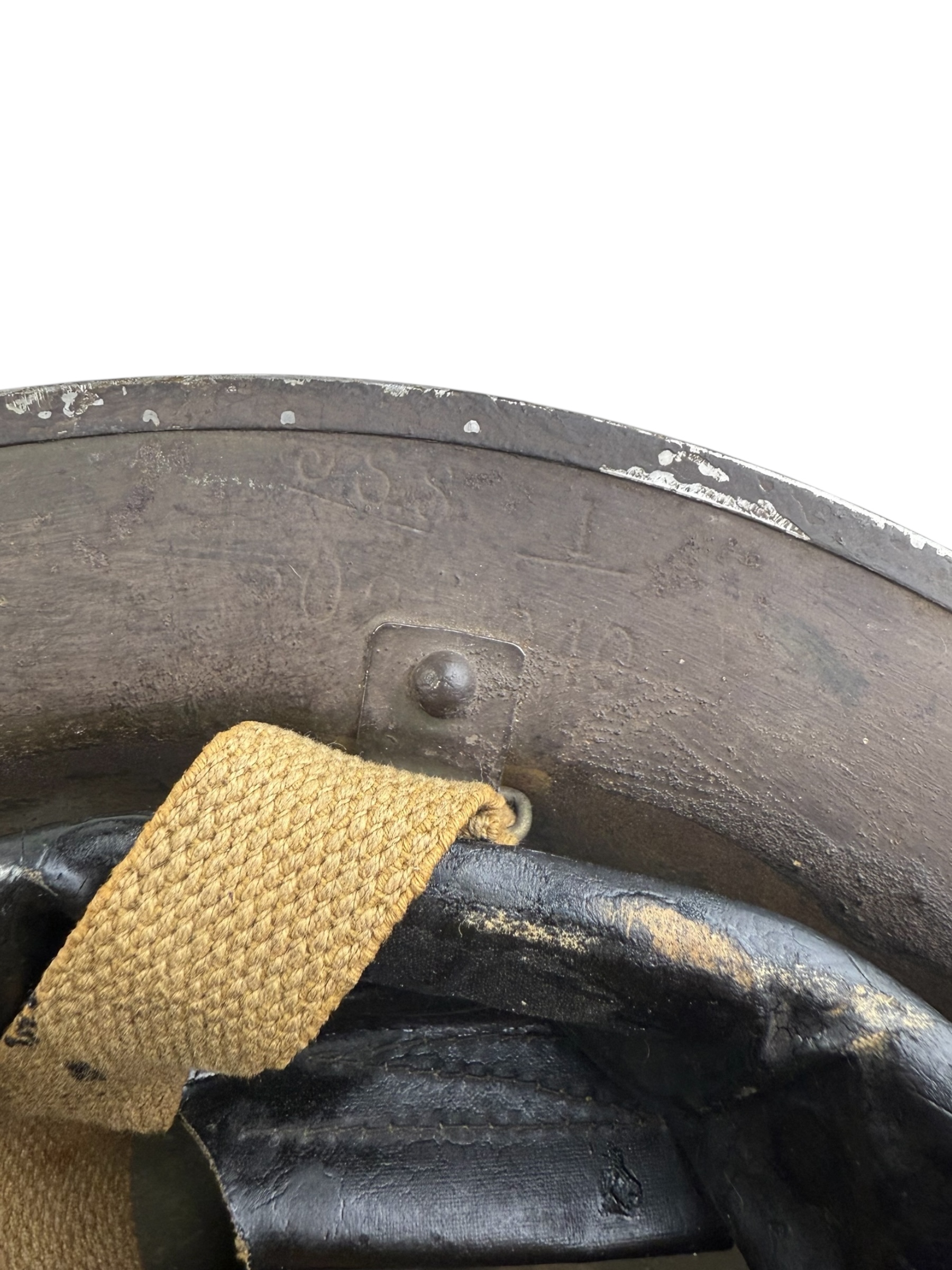 Engelse WO2 Royal Engineers helm in prachtige staat. Dit exemplaar heeft een absolute “been there” uitstraling door de diverse persoonlijke aanpassingen. Zo is deze helm voorzien van een Royal Engineers Flash, en later is deze nog eens voorzien van een dikke ruwe laag beton/zand camouflage. Tevens is er ook een naam en servicenummer terug te vinden is de rand van de schaal. De schaal is 1940 gedateerd en de liner 1941.