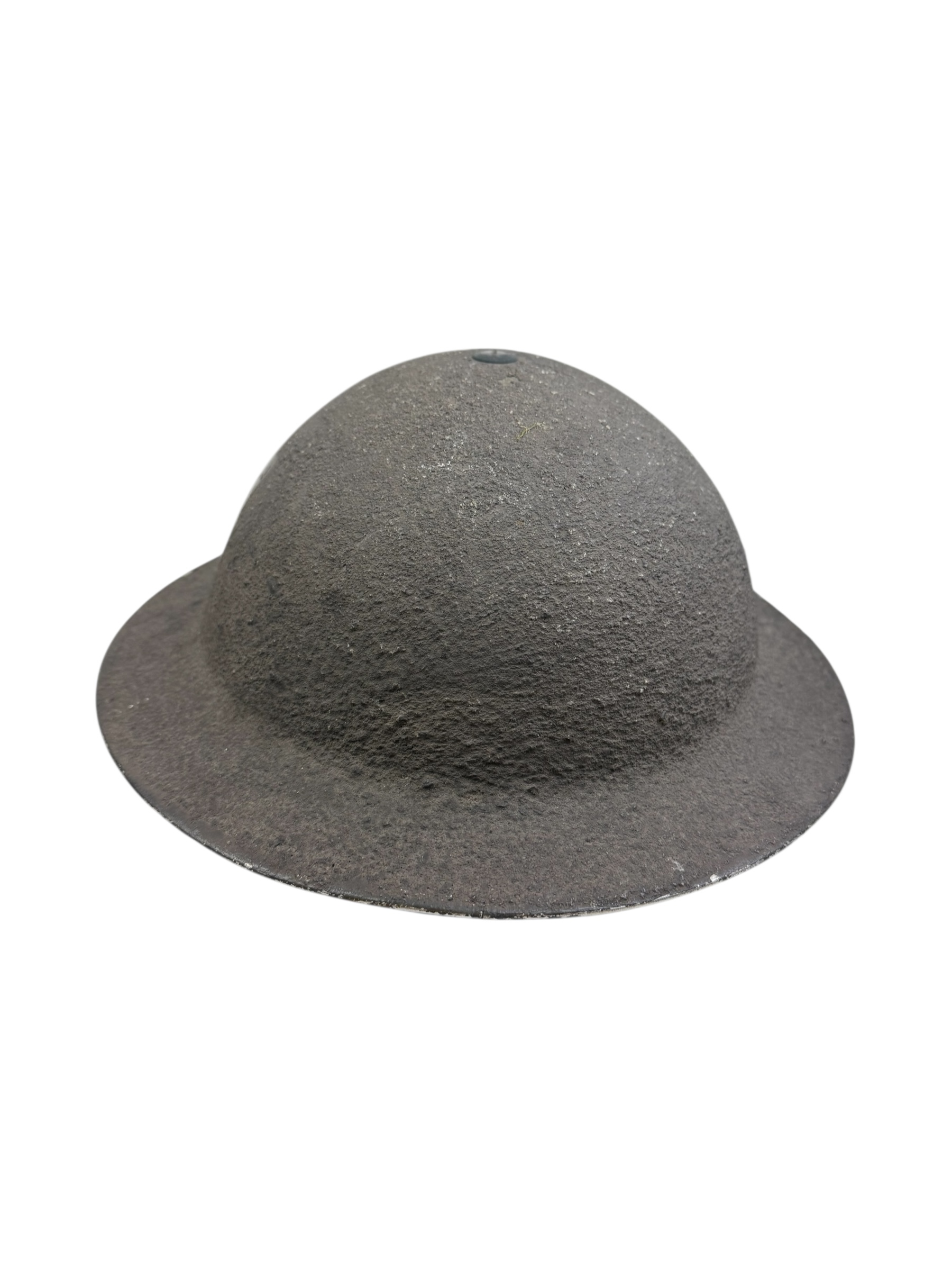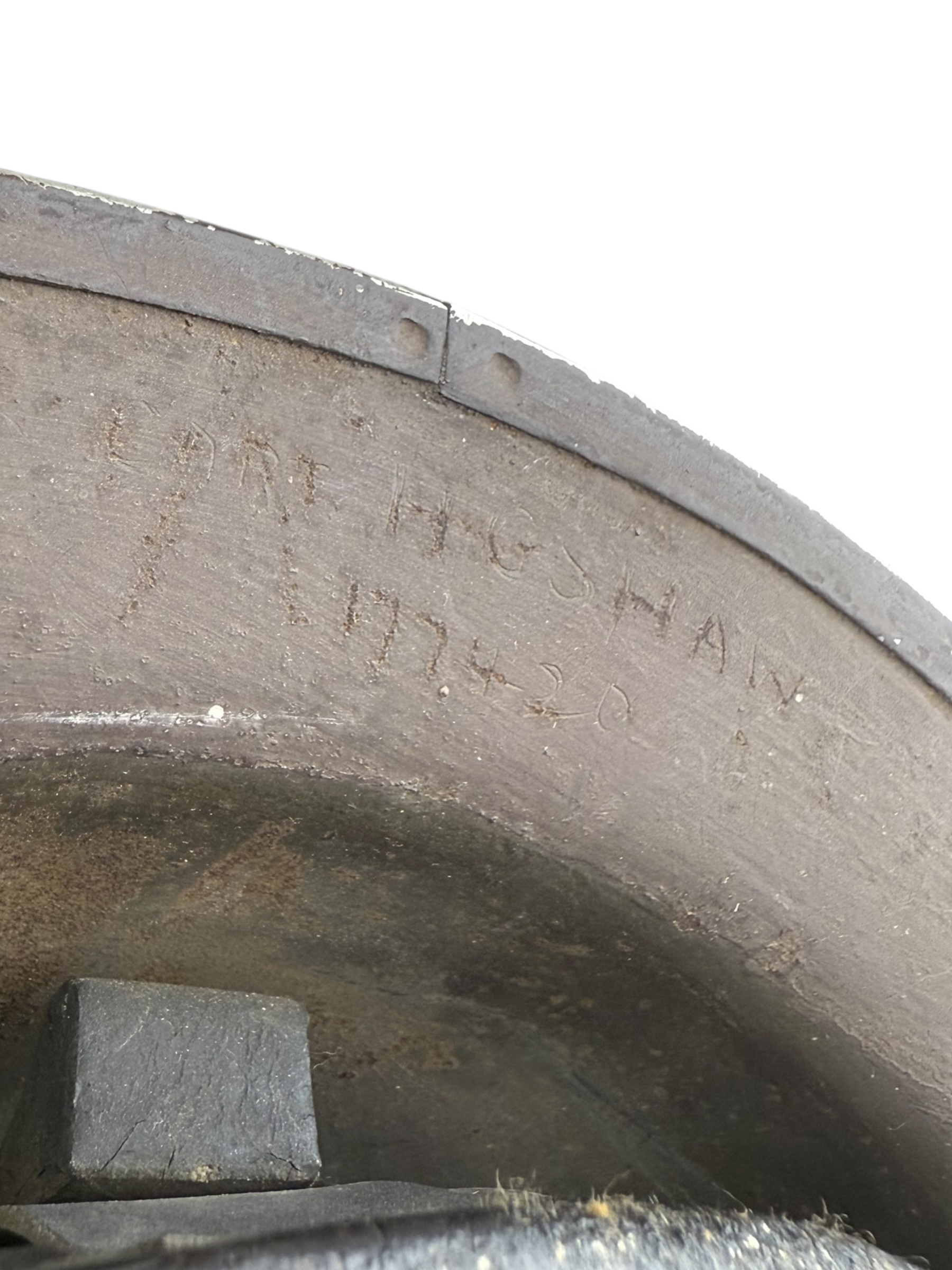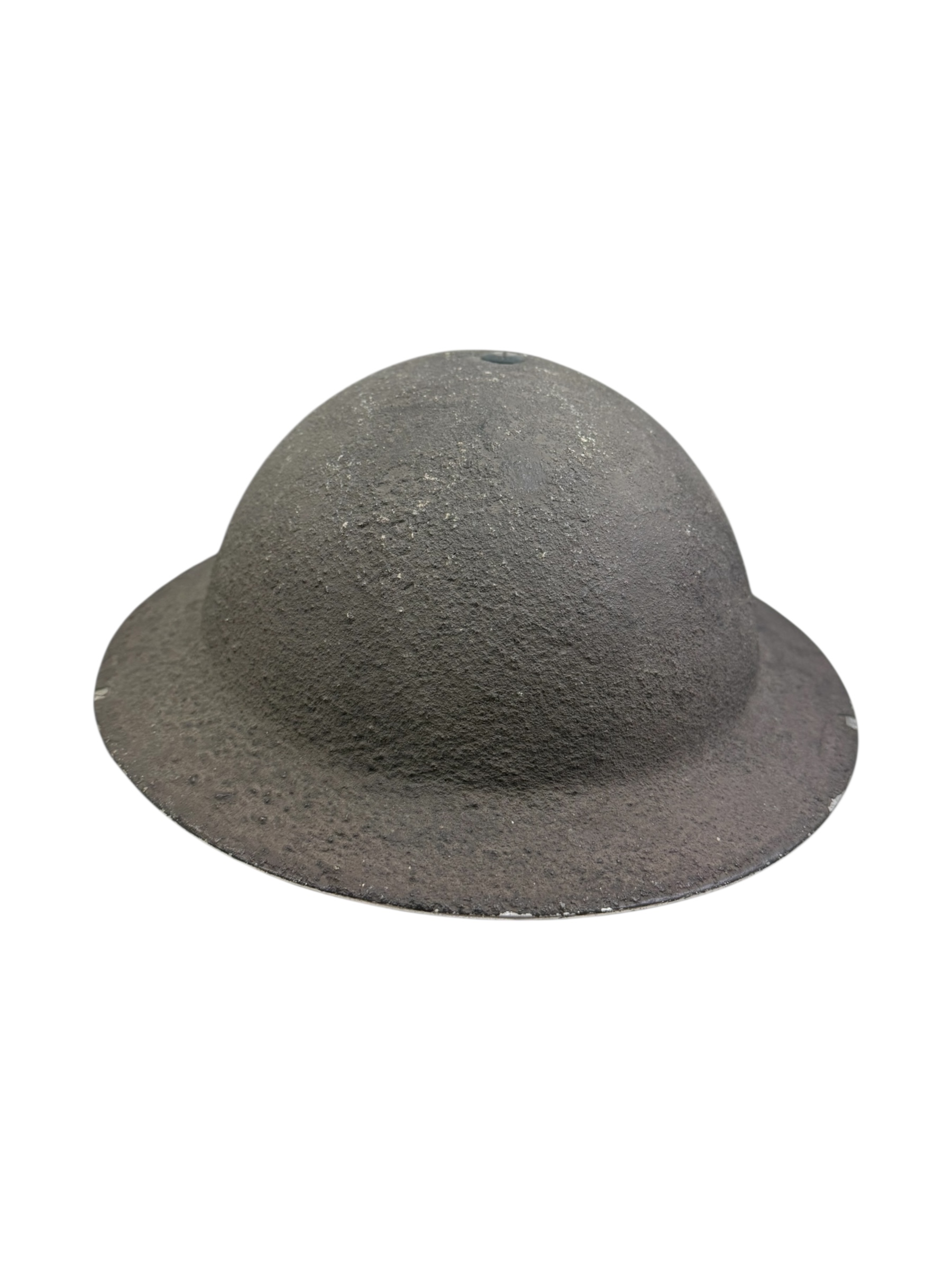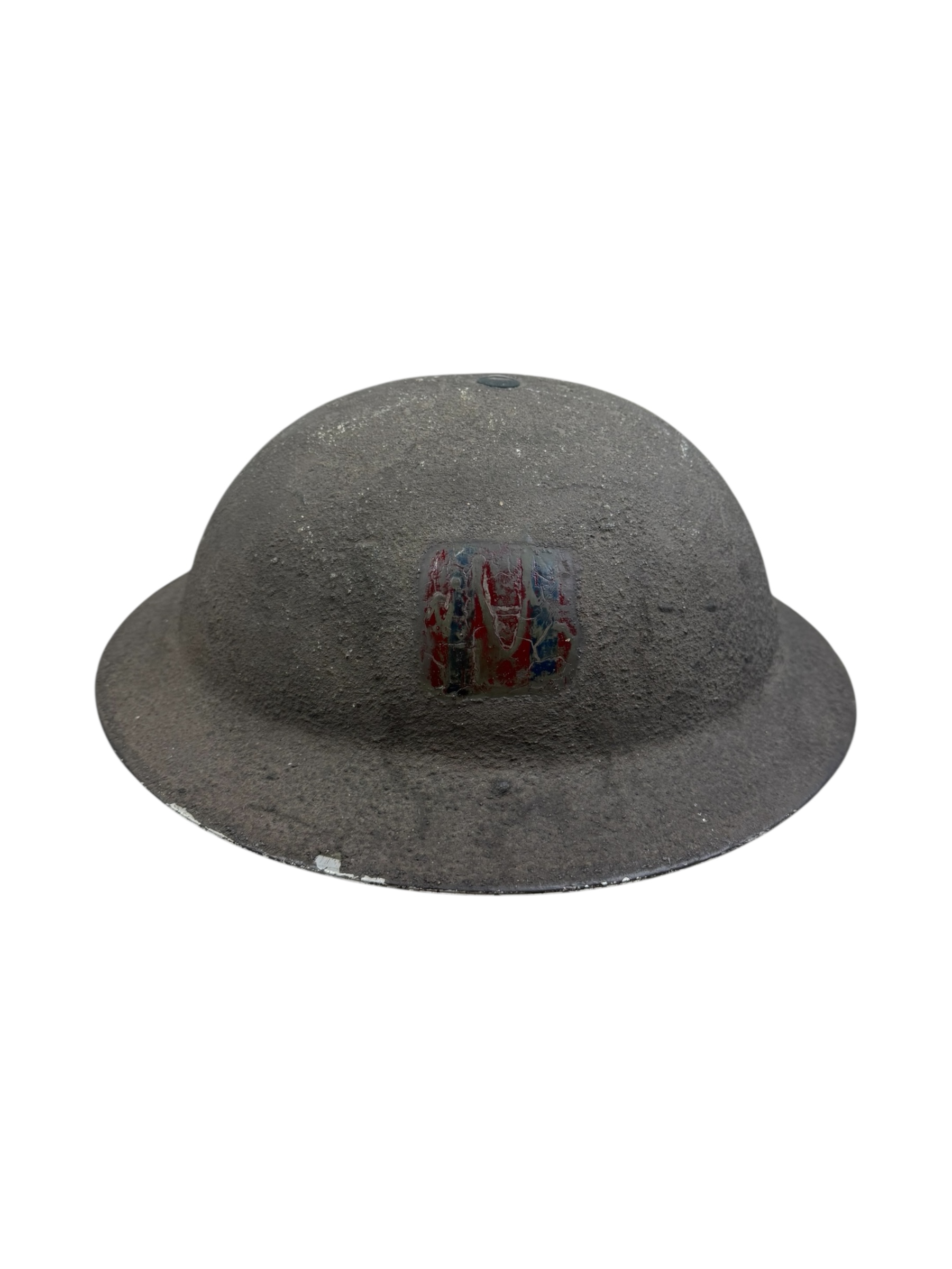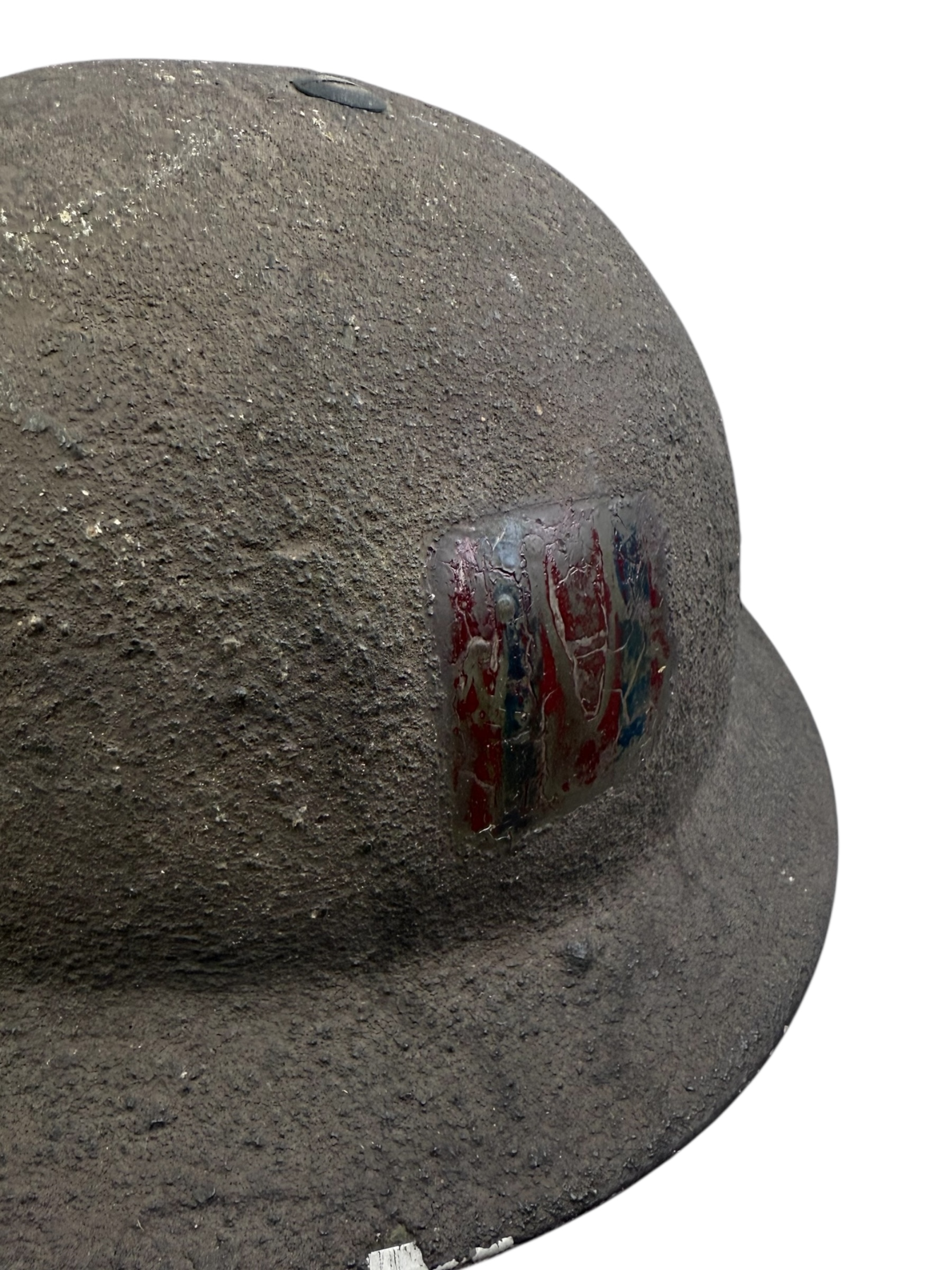 Engelse WO2 Royal Engineers helm in prachtige staat. Dit exemplaar heeft een absolute “been there” uitstraling door de diverse persoonlijke aanpassingen. Zo is deze helm voorzien van een Royal Engineers Flash, en later is deze nog eens voorzien van een dikke ruwe laag beton/zand camouflage. Tevens is er ook een naam en servicenummer terug te vinden is de rand van de schaal. De schaal is 1940 gedateerd en de liner 1941.