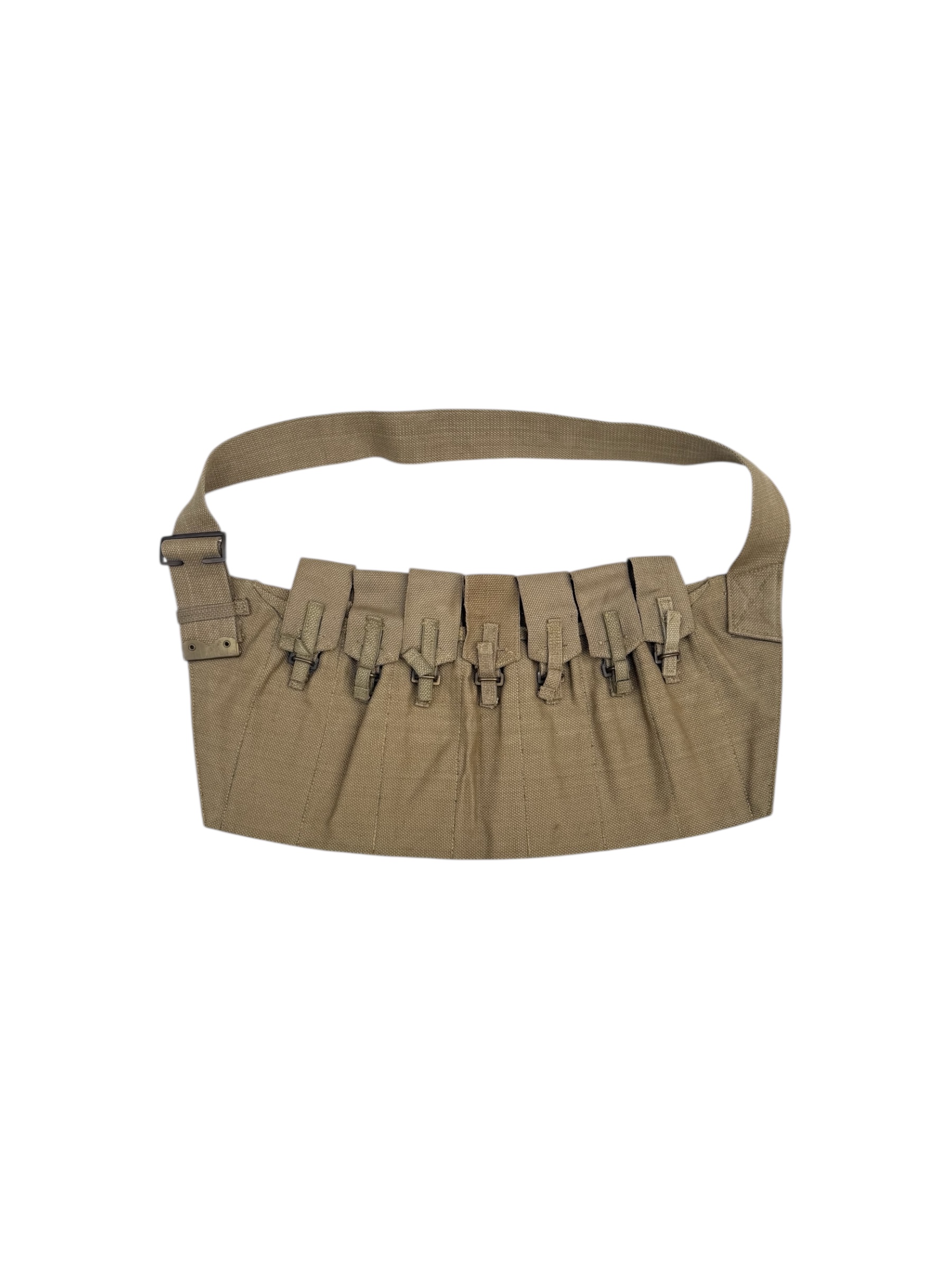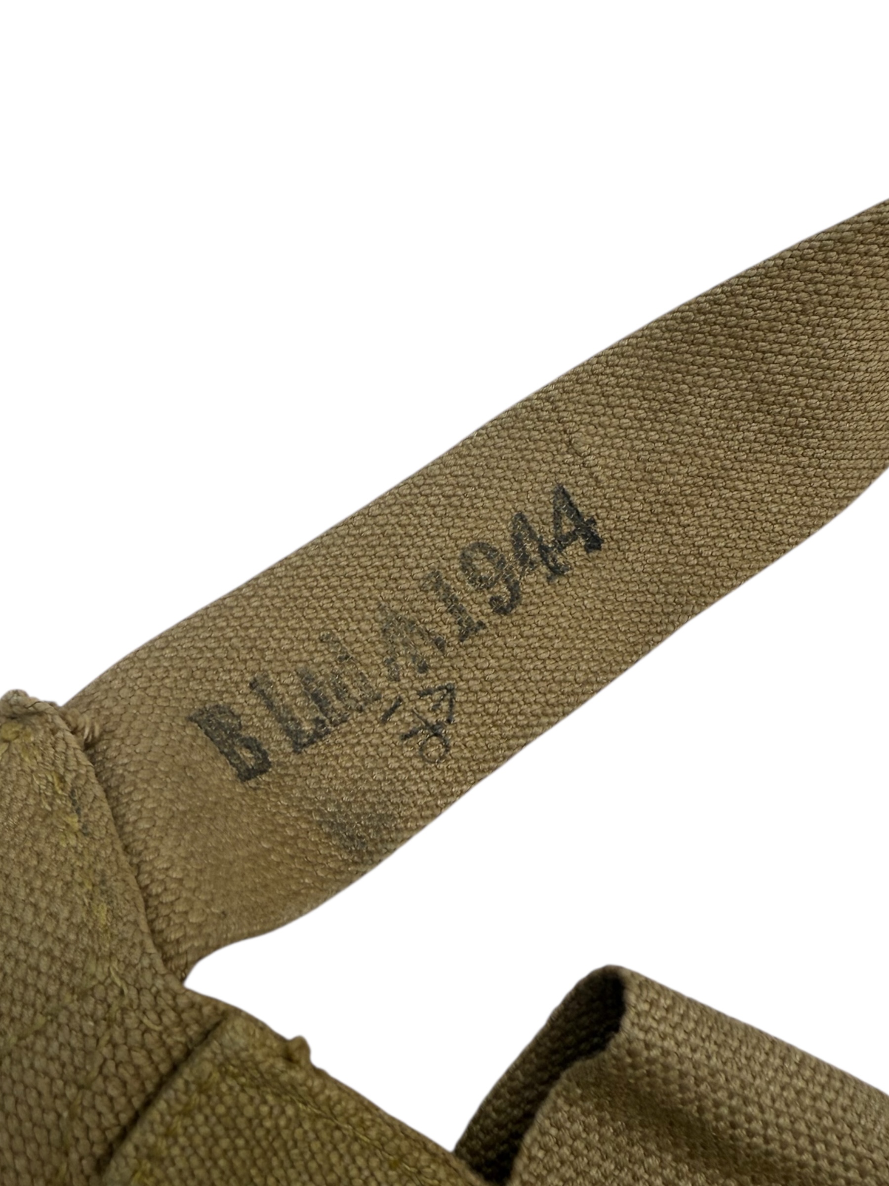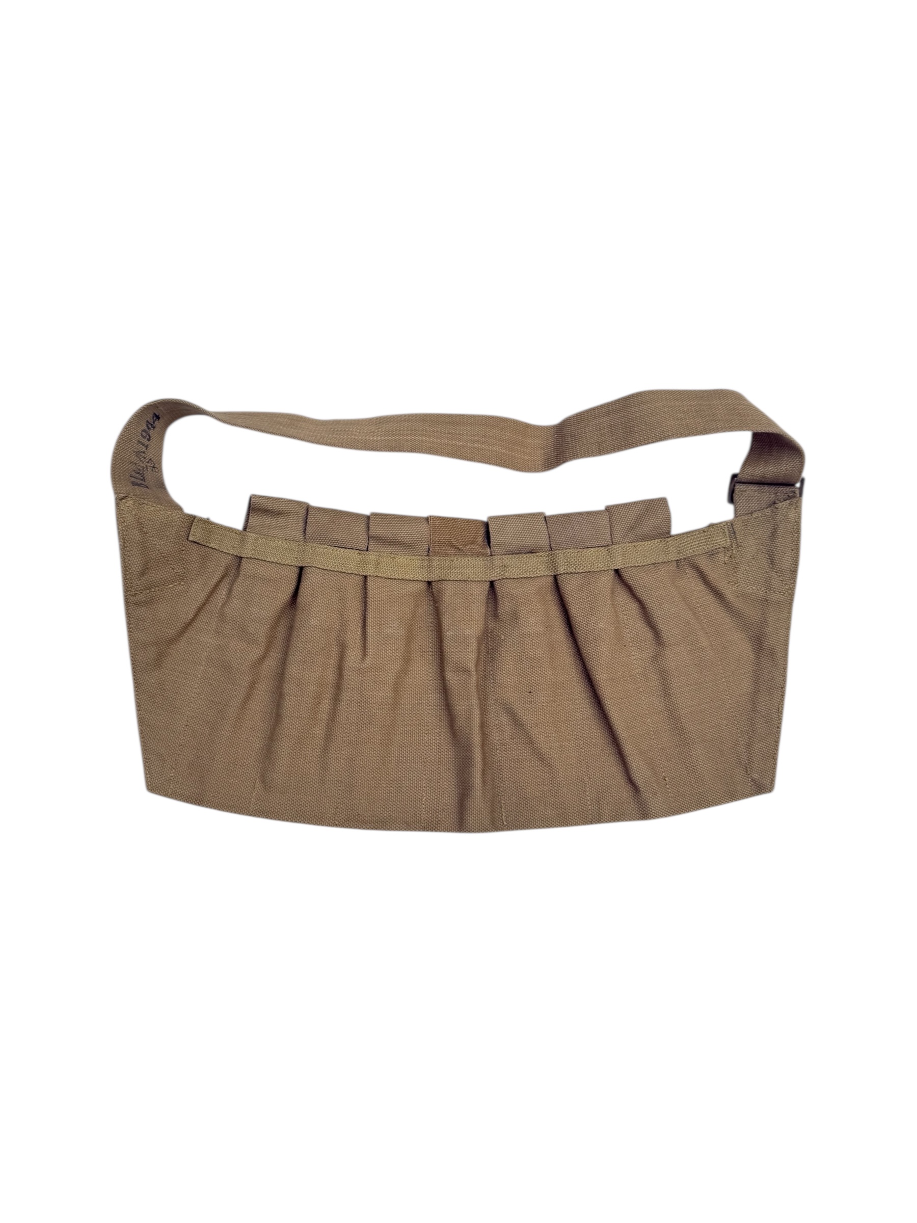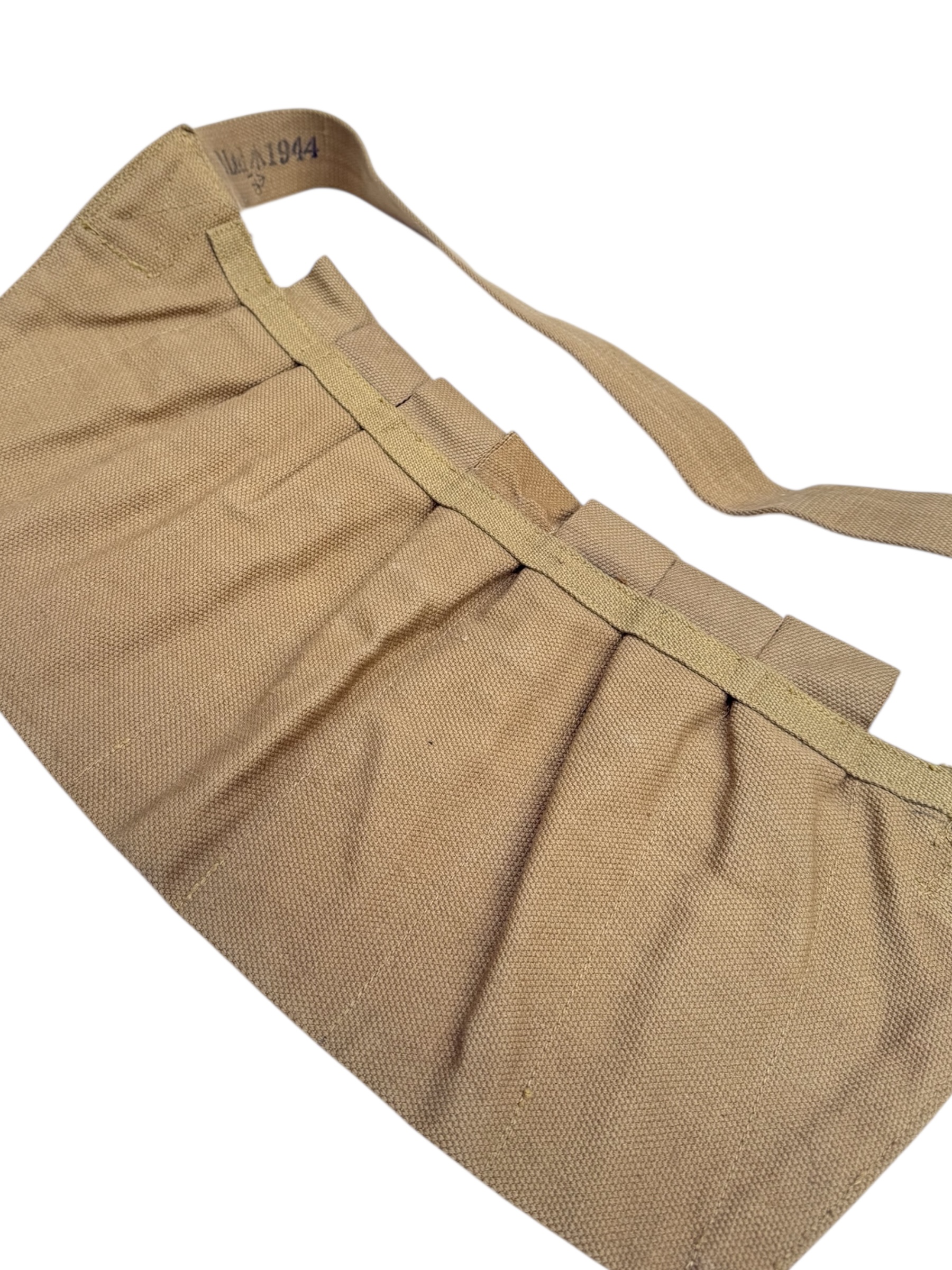 Engelse WO2 Airborne 7 Pocket Sten Gun bandelier. Dit exemplaar is geproduceerd in 1944 en verkeert in nette staat. Alle markeringen zijn nog duidelijk leesbaar.