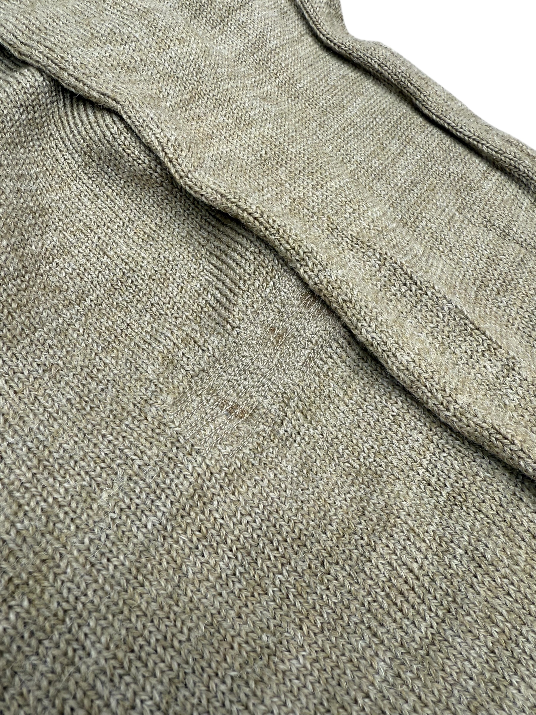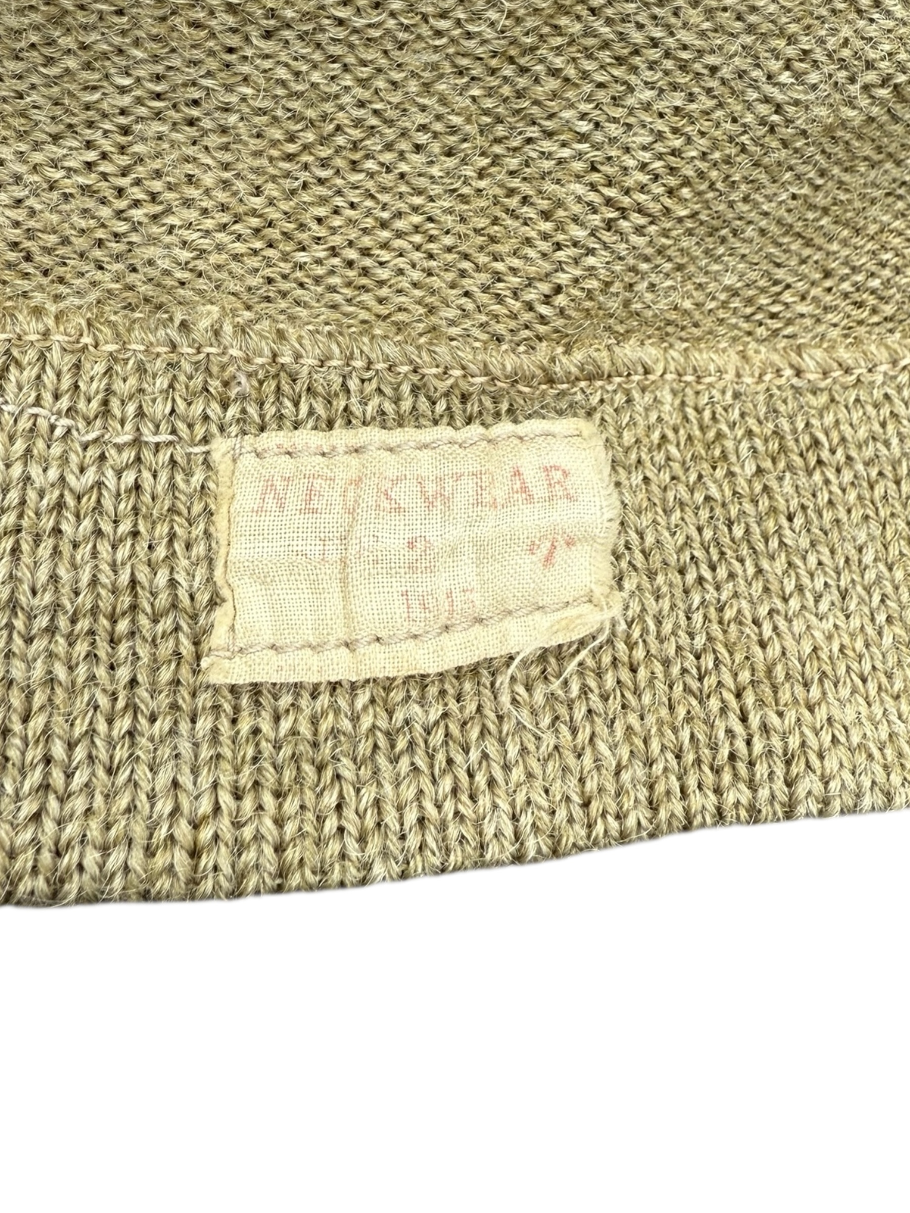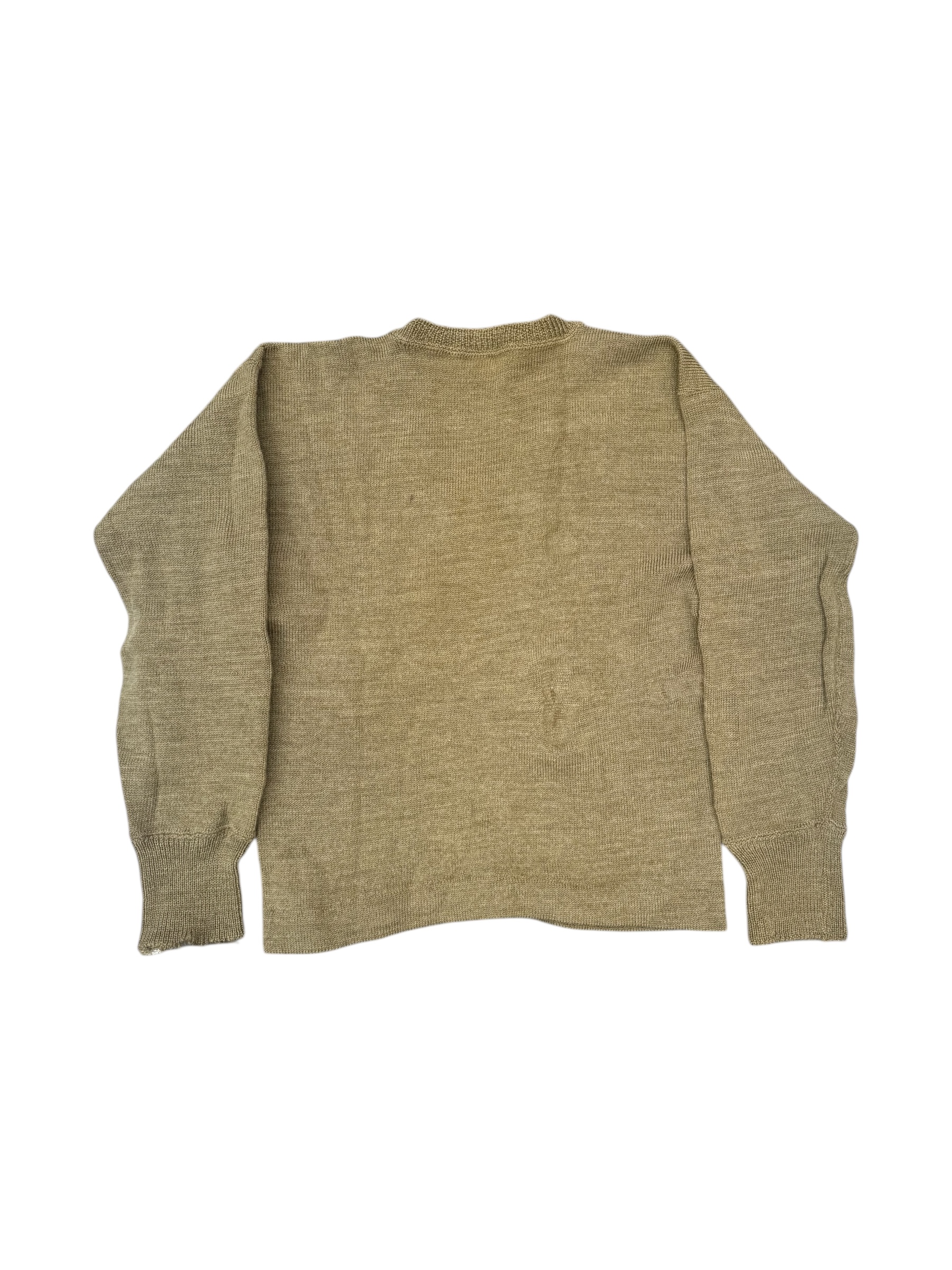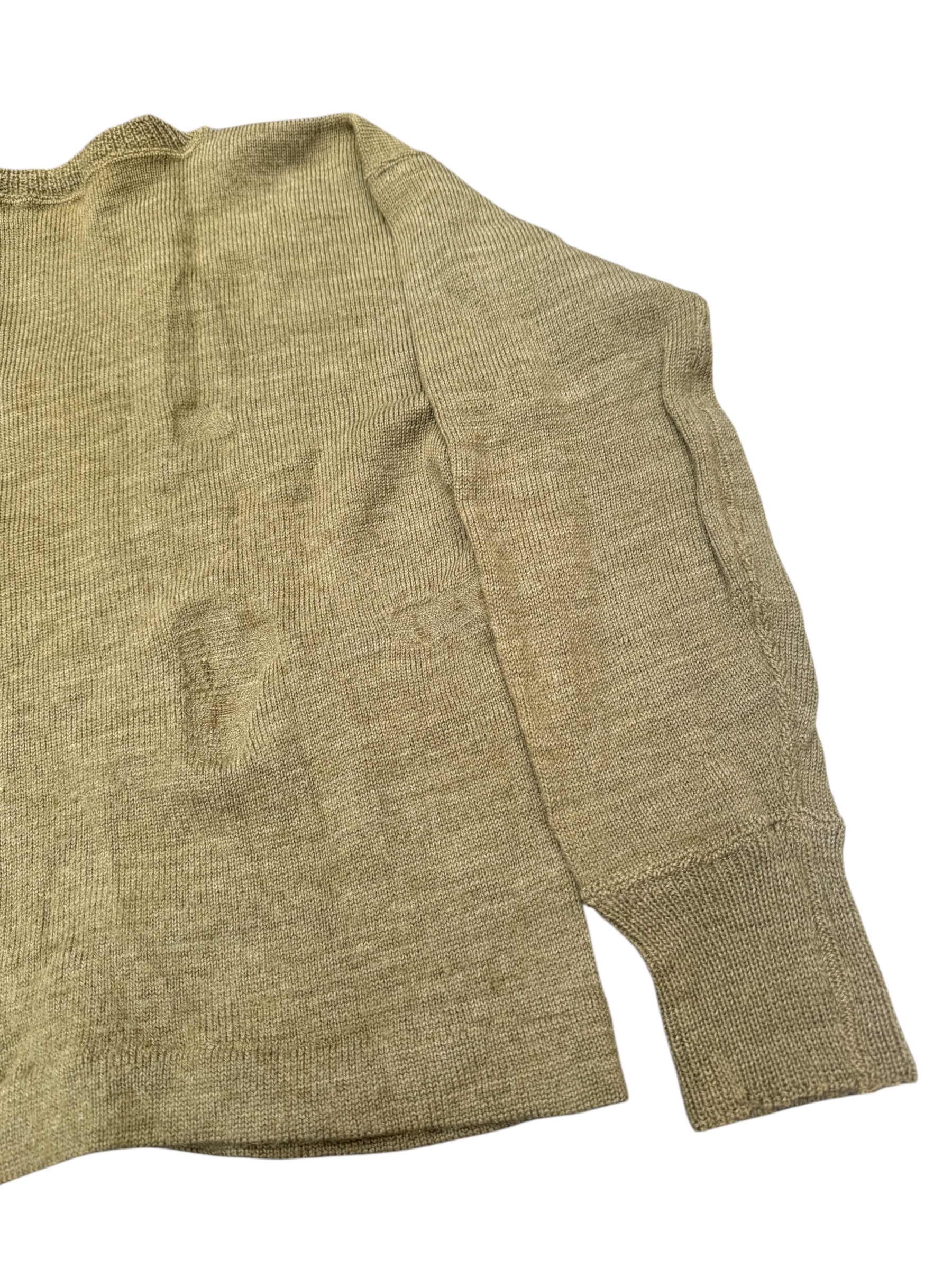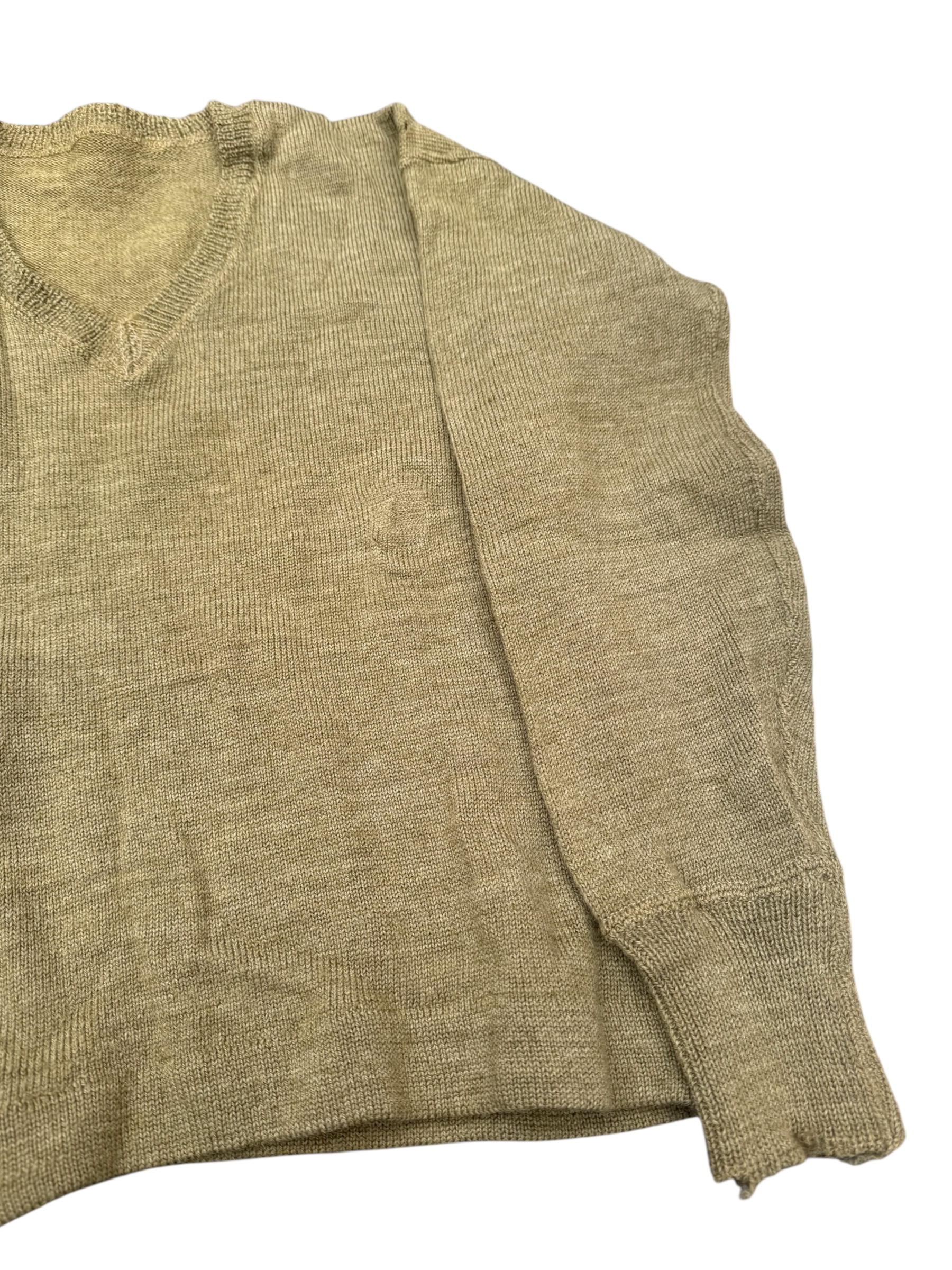 Engelse WO2 V-neck trui in gedragen staat. Het betreft een wat kleinere maat 2 met label uit 1945. Deze heeft hier en daar veldreparaties, dus bekijk de foto’s aandachtig.