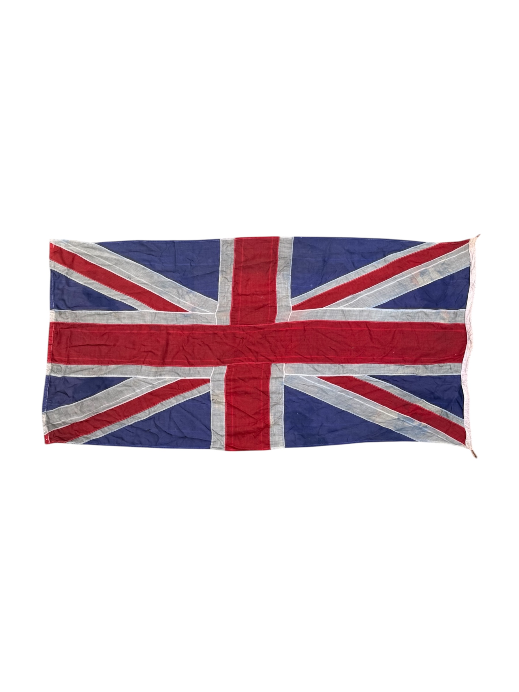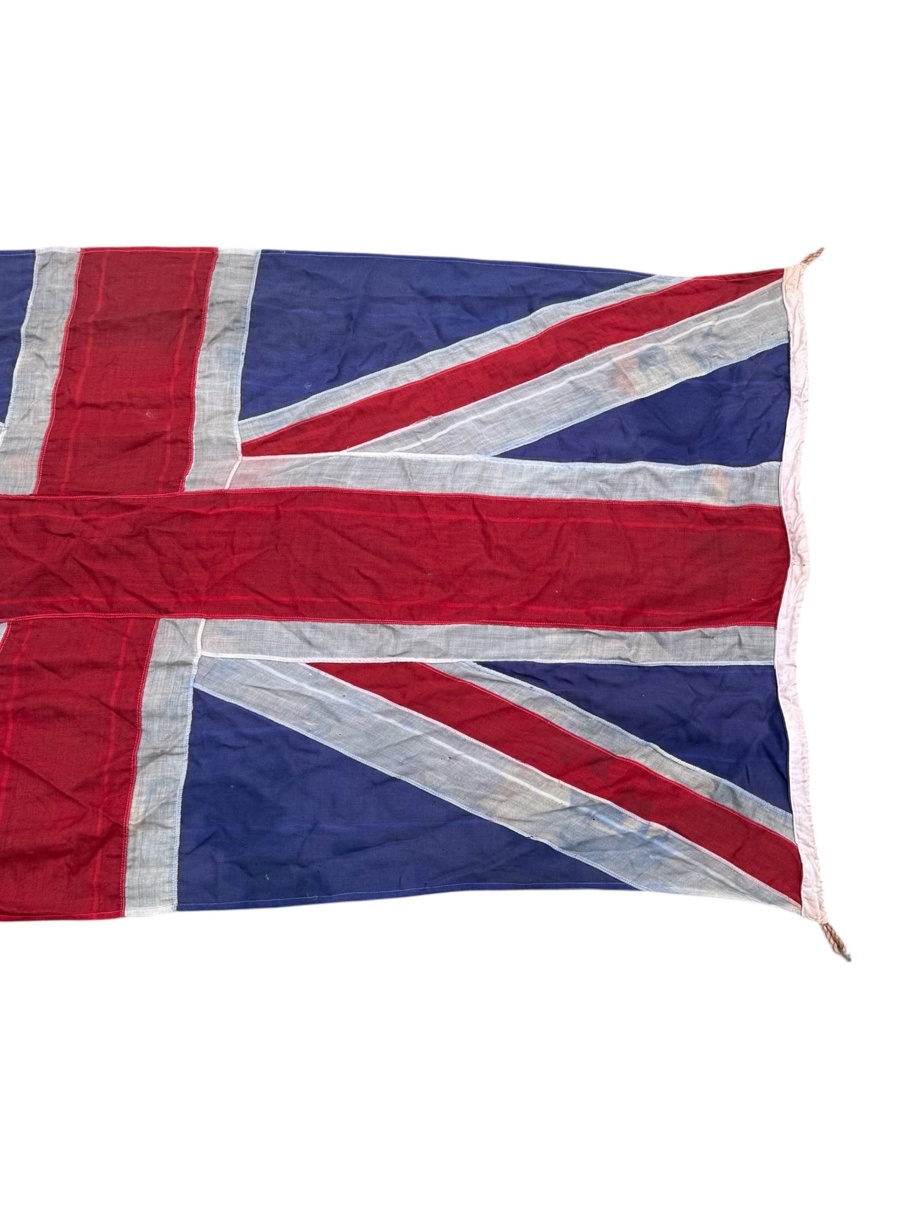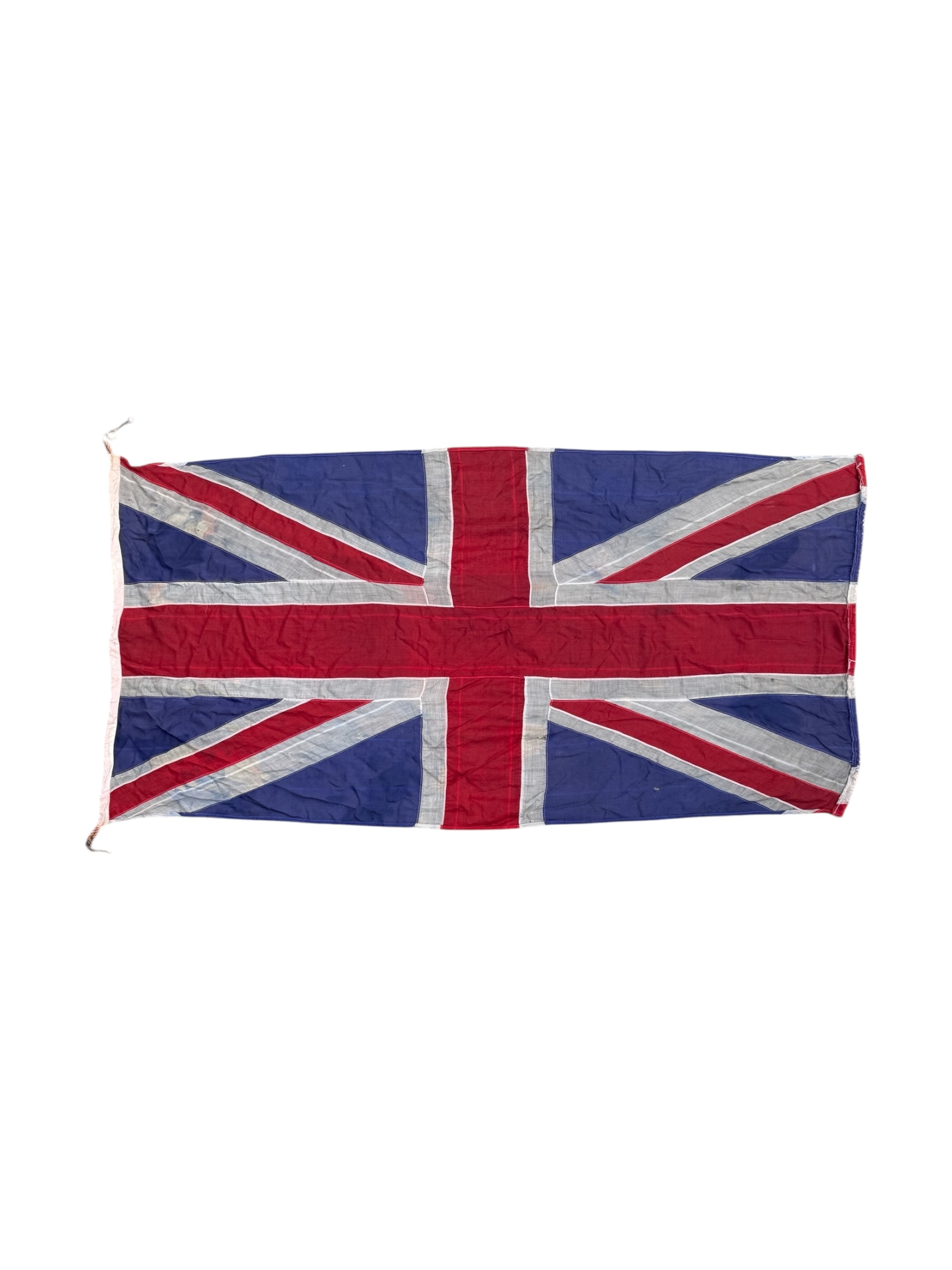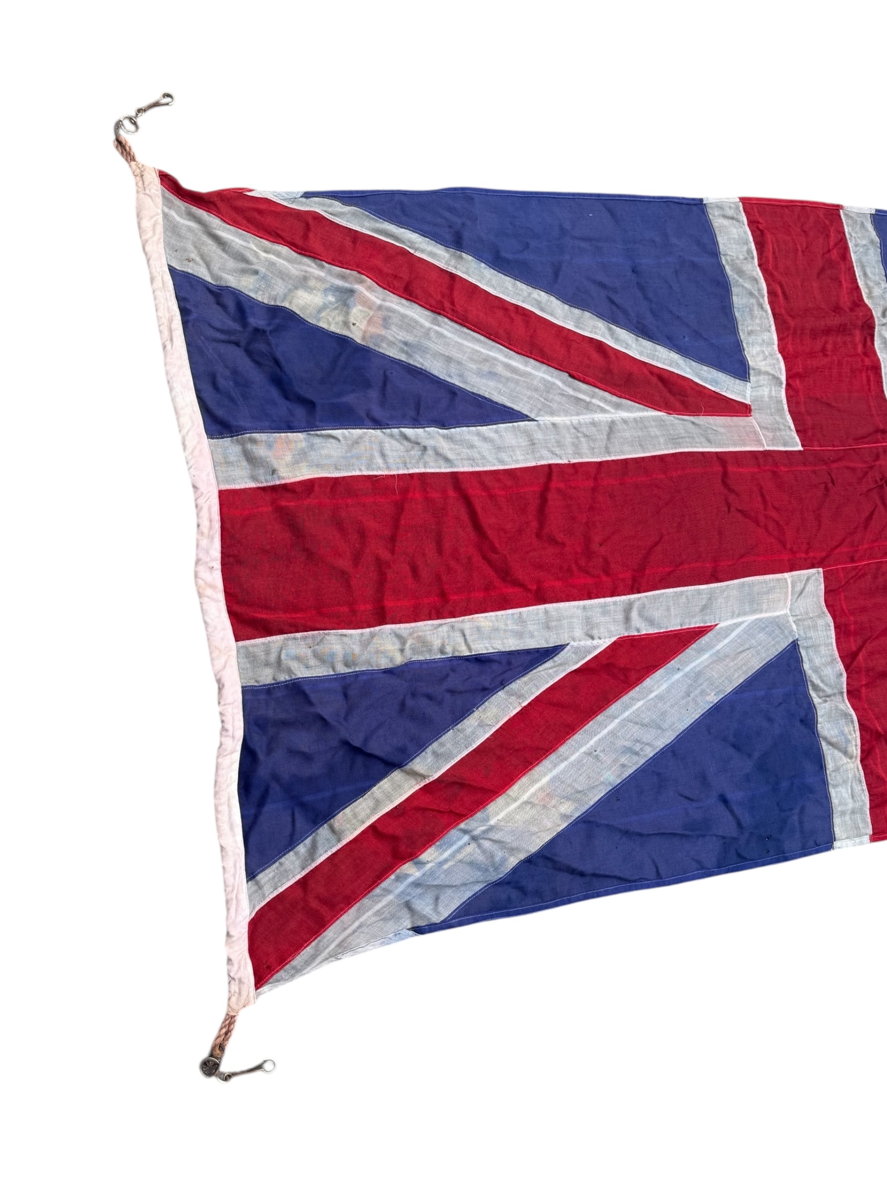 Engelse WO2 vlag, gestikt en in gebruikte staat. De afmetingen zijn circa 215 × 105 cm, en zowel de haken als het touw zijn nog aanwezig.