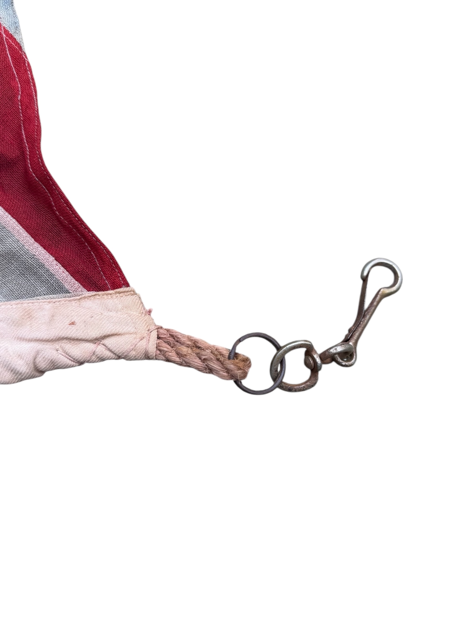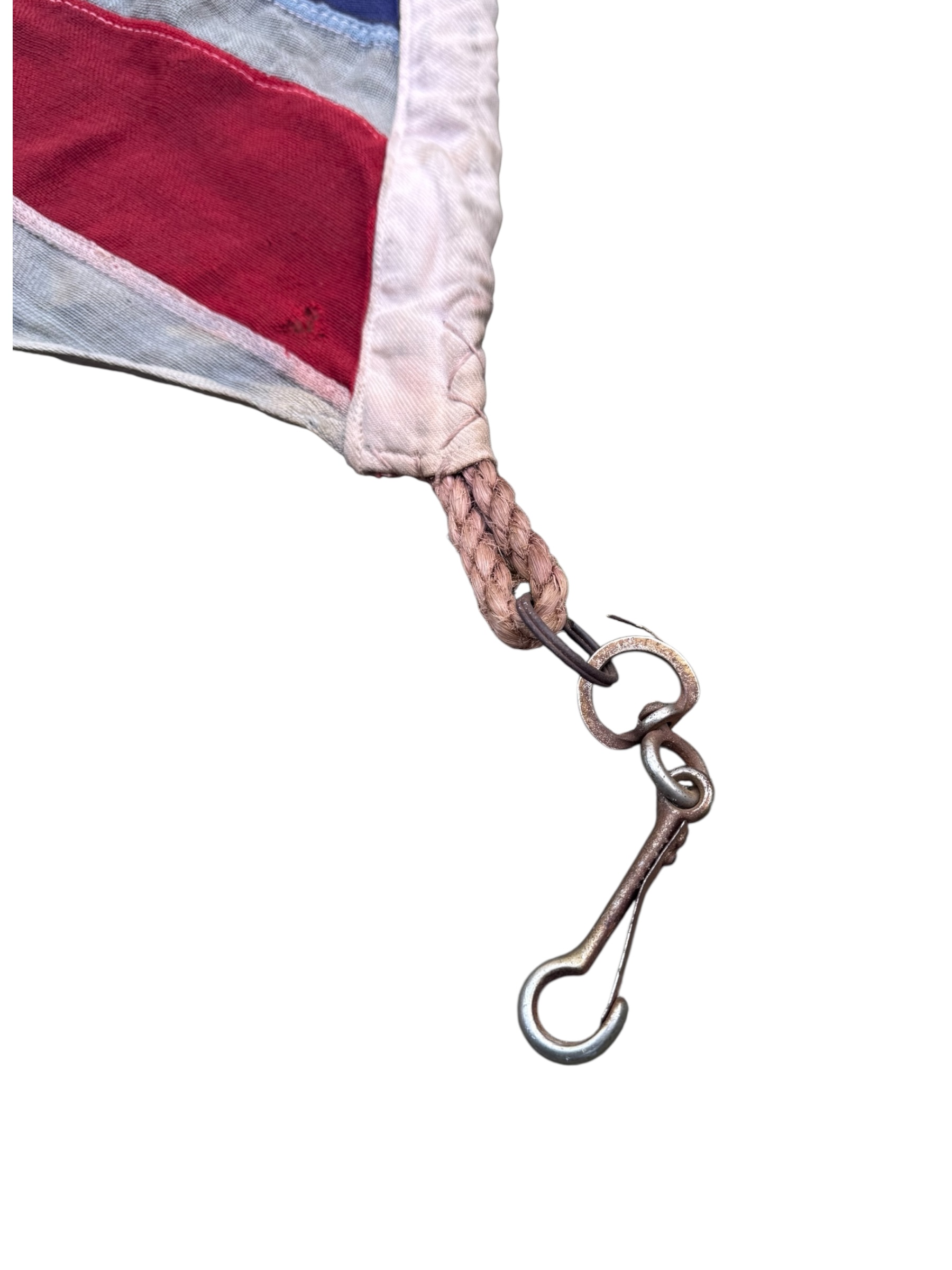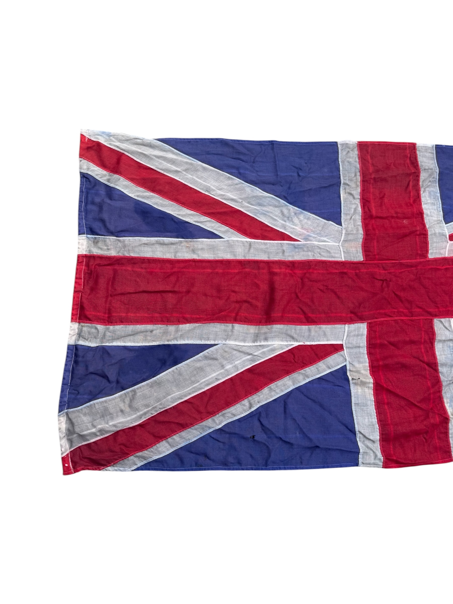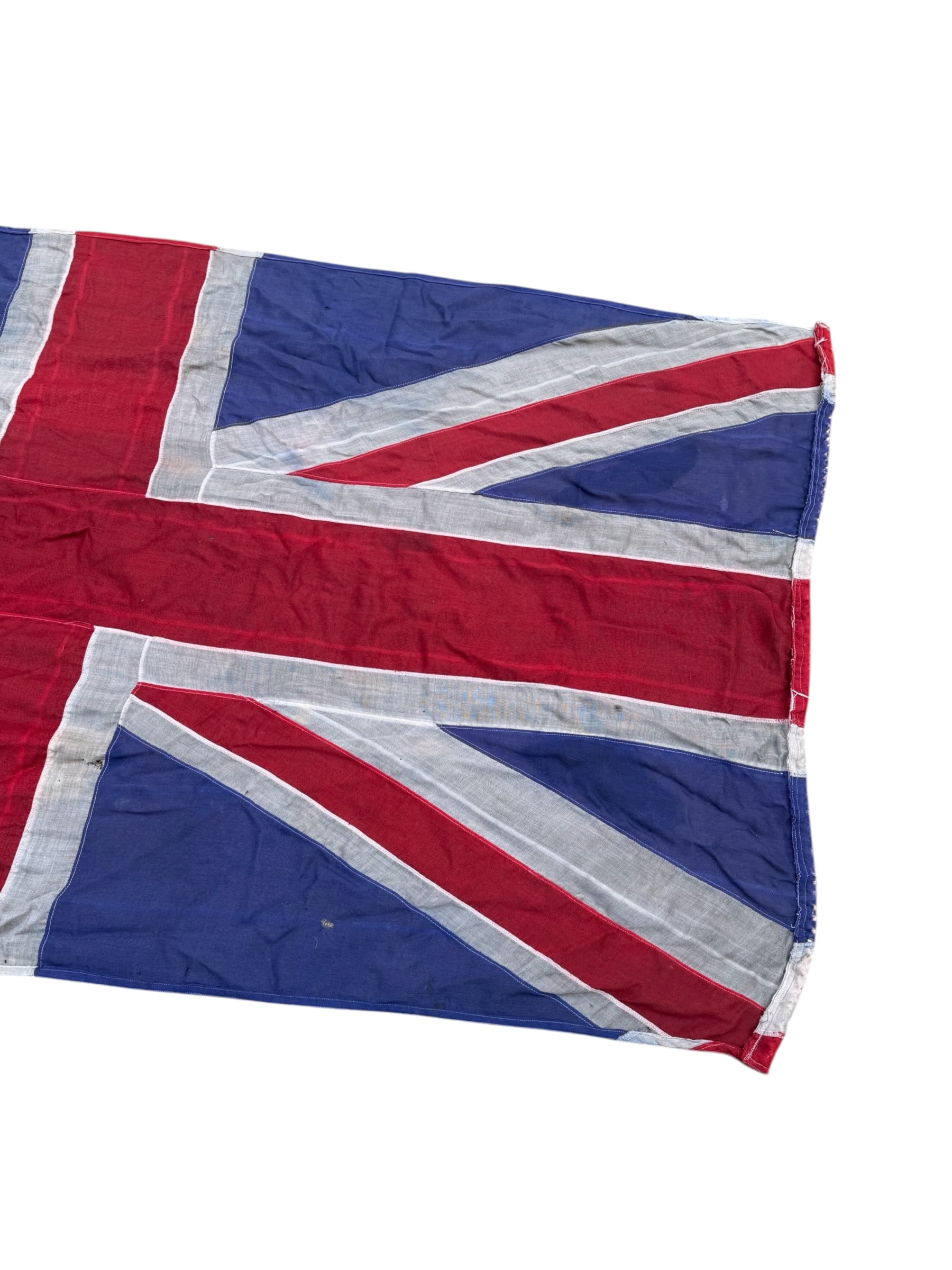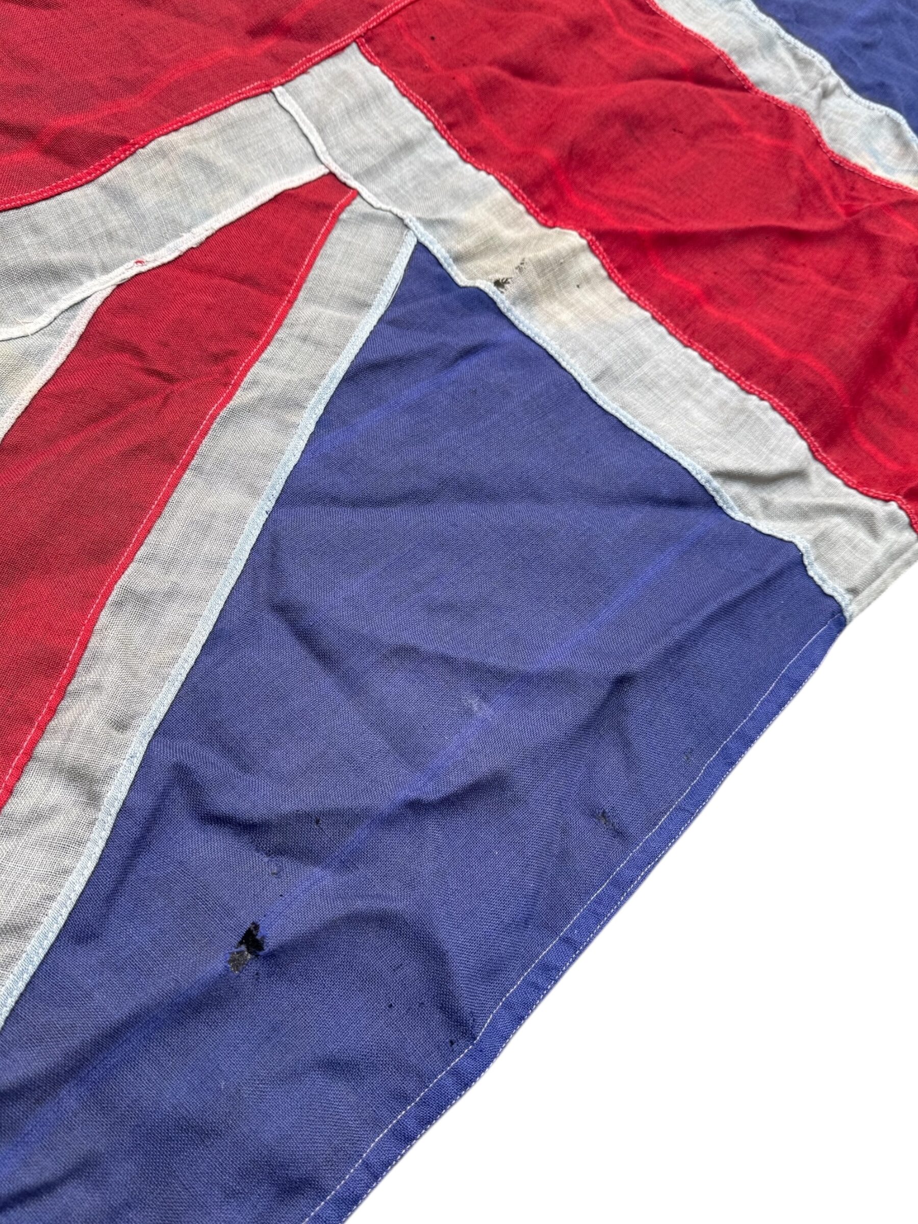 Engelse WO2 vlag, gestikt en in gebruikte staat. De afmetingen zijn circa 215 × 105 cm, en zowel de haken als het touw zijn nog aanwezig.
