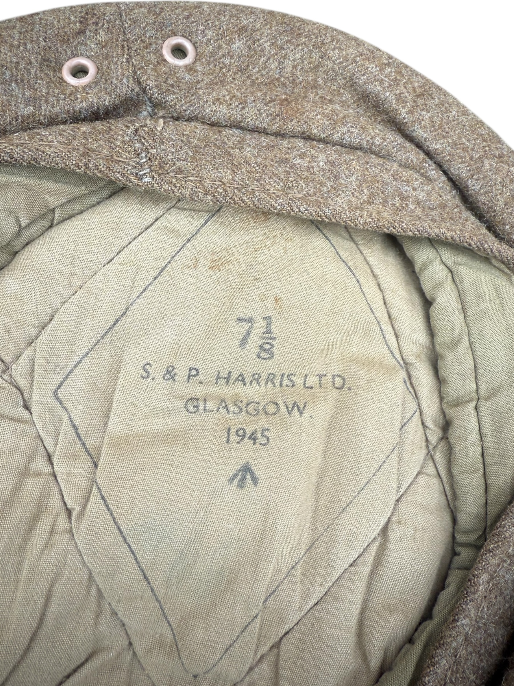 Deze Engelse WO2 General Service baret in maat 7 1/8 verkeert in nette staat. Het exemplaar is gedateerd 1945 en de markeringen zijn nog duidelijk zichtbaar.