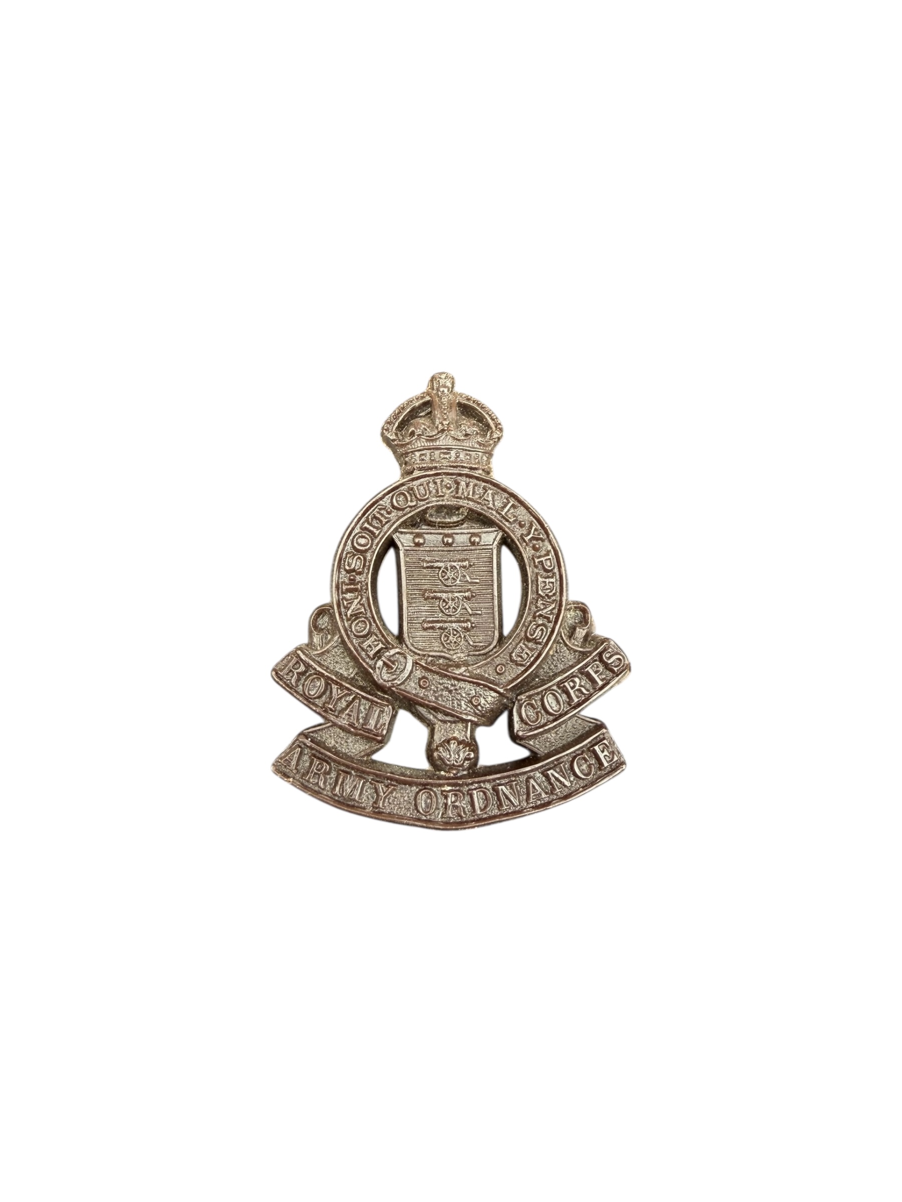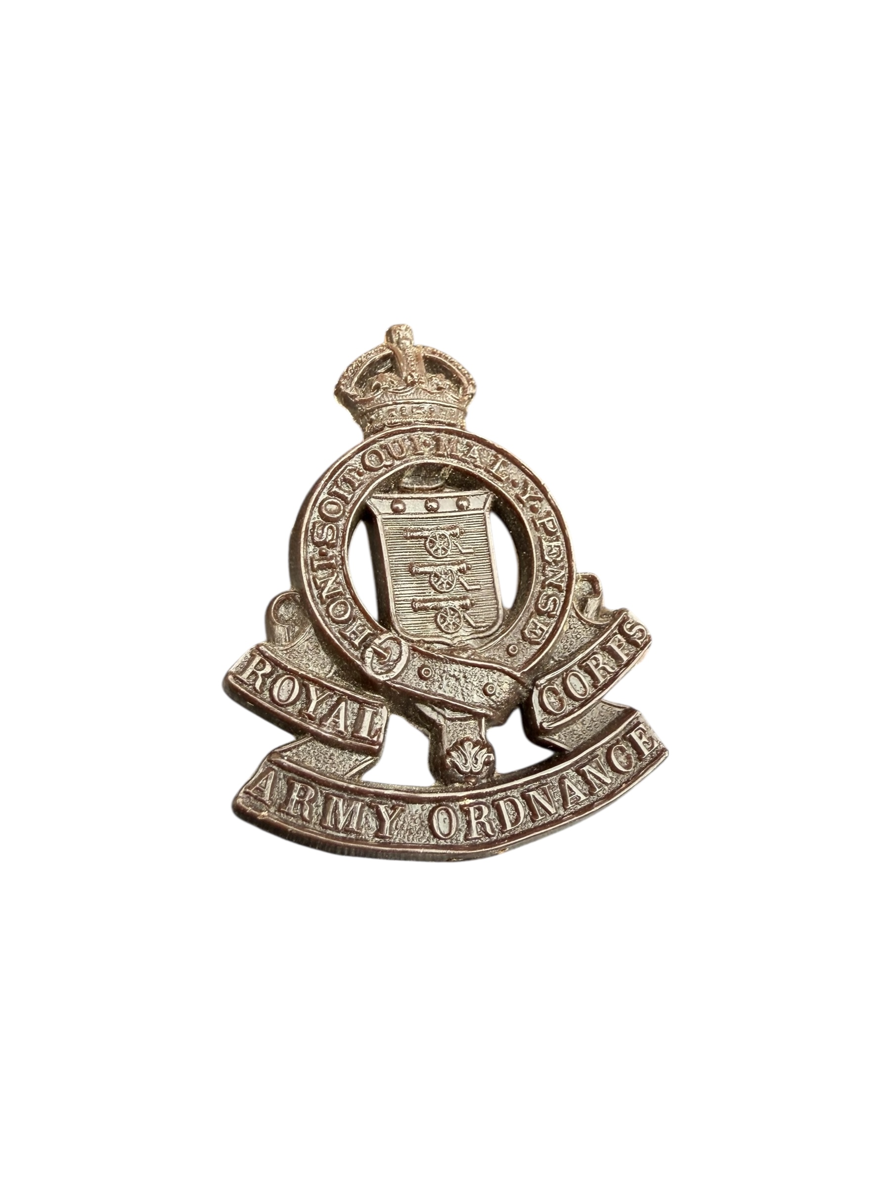 Engelse WO2 Royal Army Ordnance Corps cap badge in nette staat. Het betreft een plastic “Economy” uitgave met markering op de achterkant.