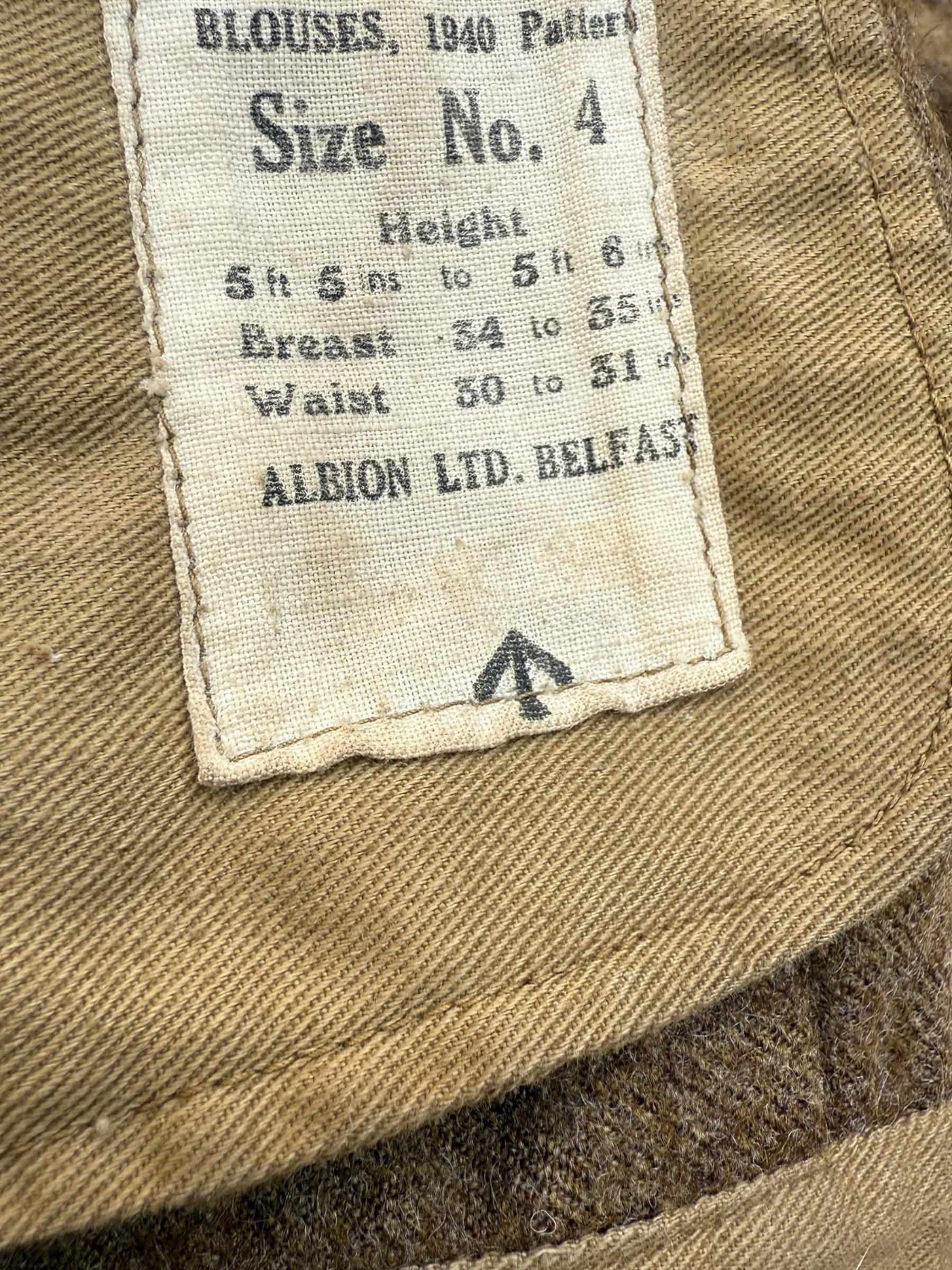Originele Engelse WO2 30th Corps R.E.M.E. P40 battledress. Het betreft een Size No. 4 in nette, gedragen staat. Aan de kenmerken is af te leiden dat deze hoogstwaarschijnlijk geproduceerd is in 1942/1943. Het label is nog aanwezig en de War Department-markering is nog duidelijk leesbaar. Er is geen sprake van motbeschadiging.